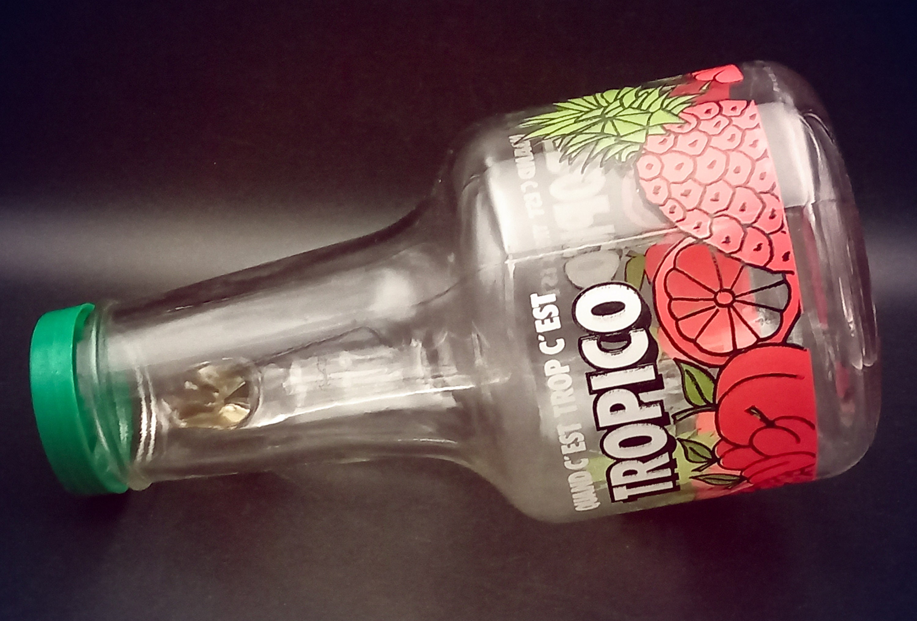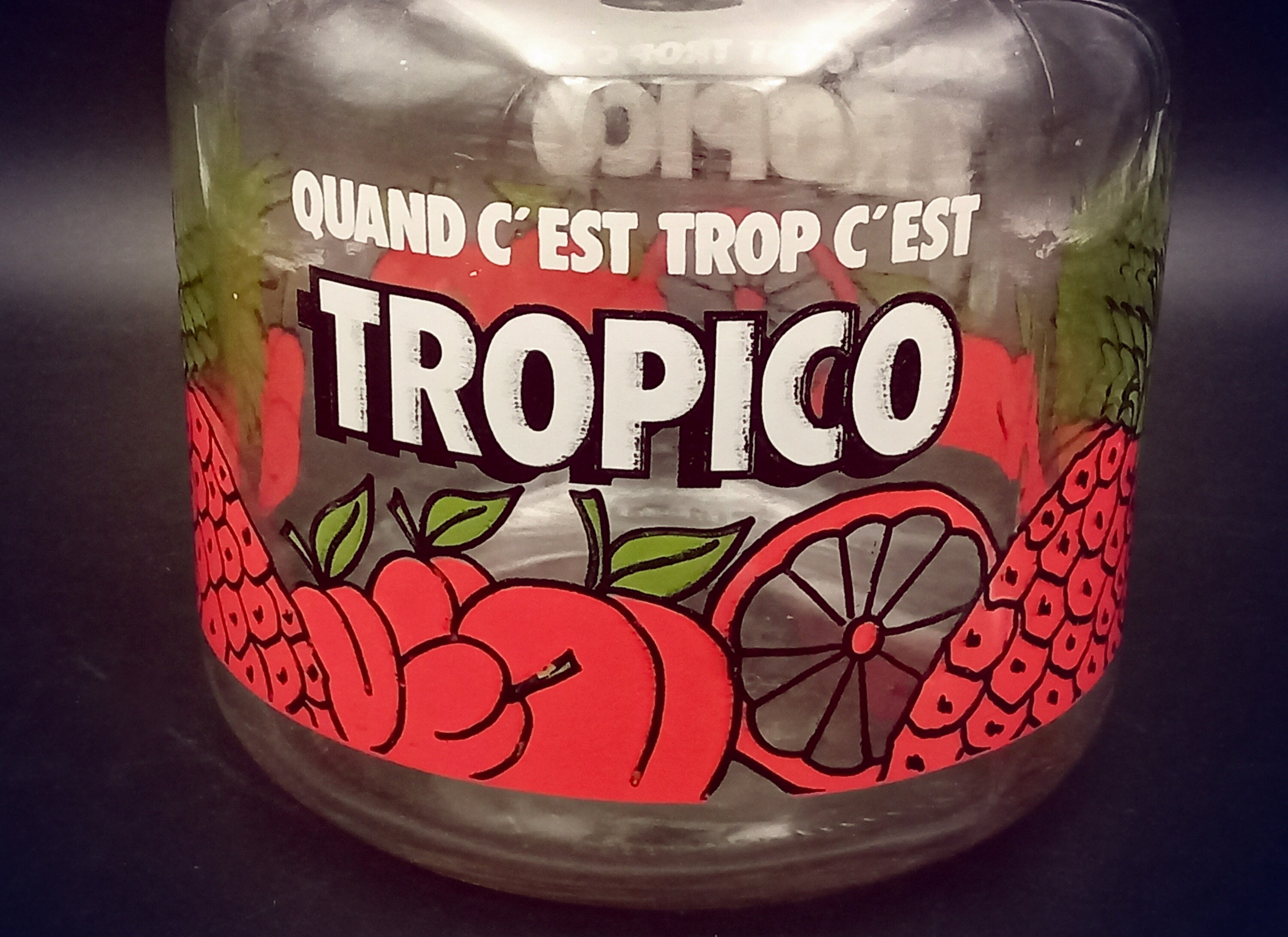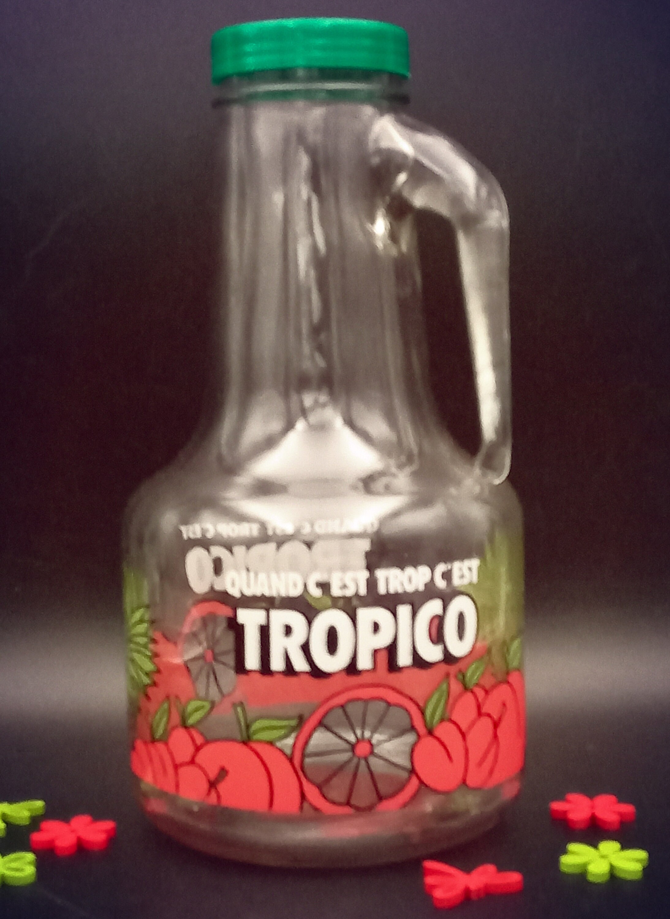 Grand pichet publicitaire TROPICO avec un couvercle vert. C'est un objet promotionnel, utilisé dans les bistrots dans les années 80 / 90. « Quand c’est trop c’est Tropico », la fameuse campagne orchestrée par l’agence de publicité « business » de Thierry Ardisson date de 1987.