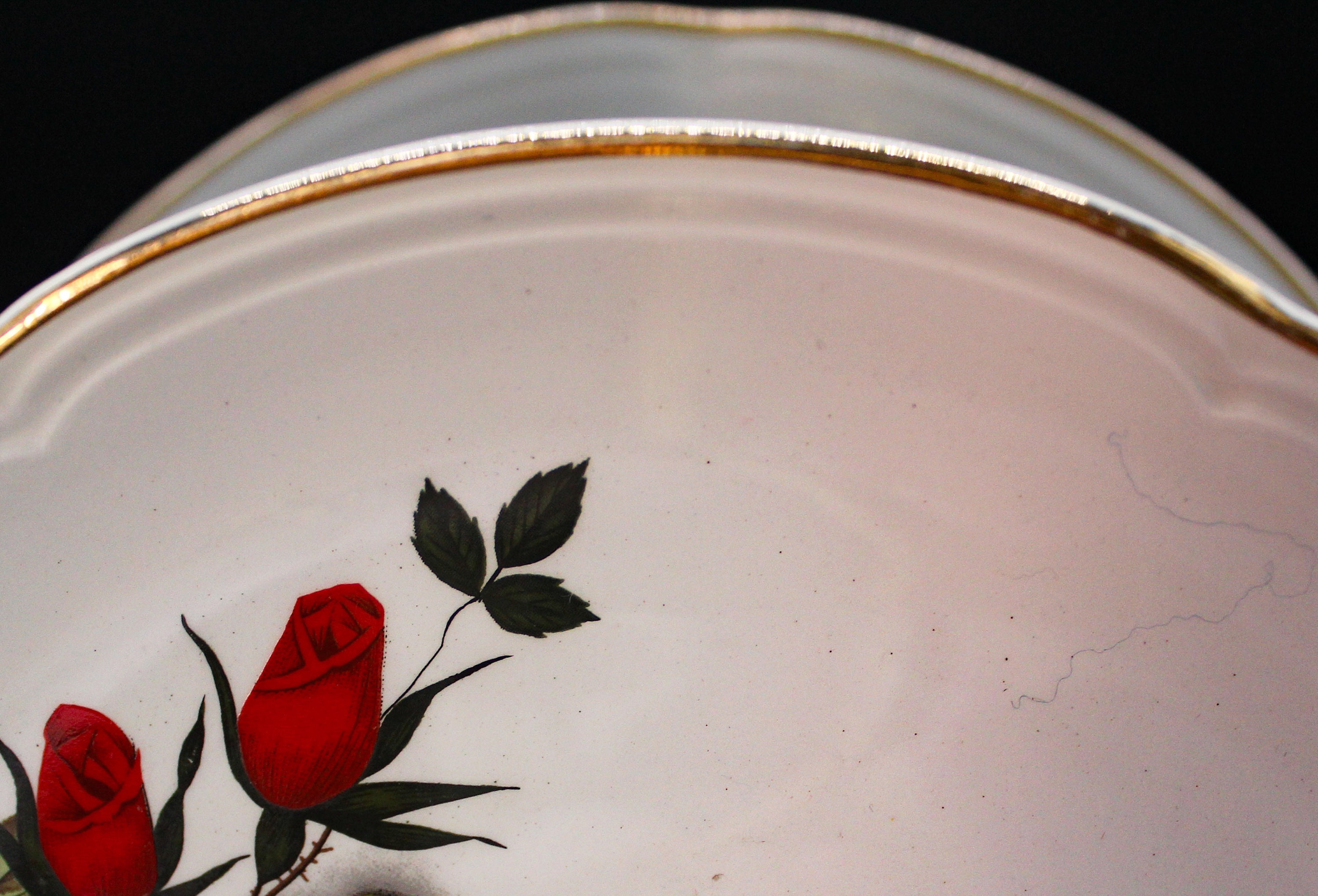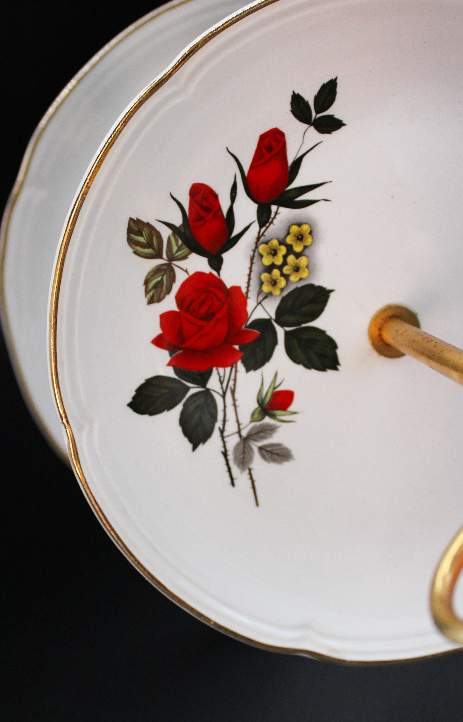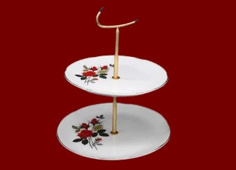 Two white porcelain plates with a red rose decoration held together by a gilt metal rod with an original shaped handle.