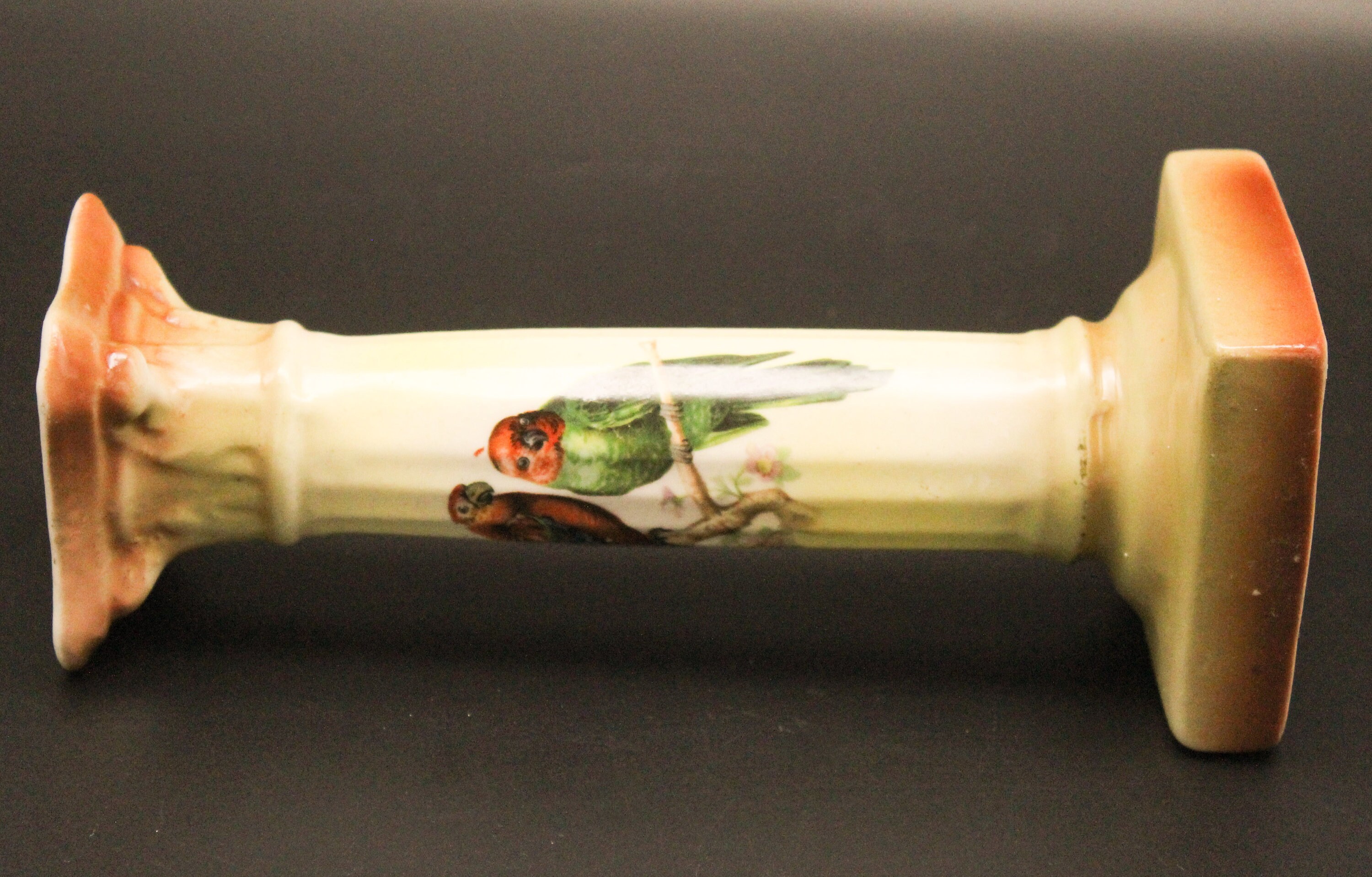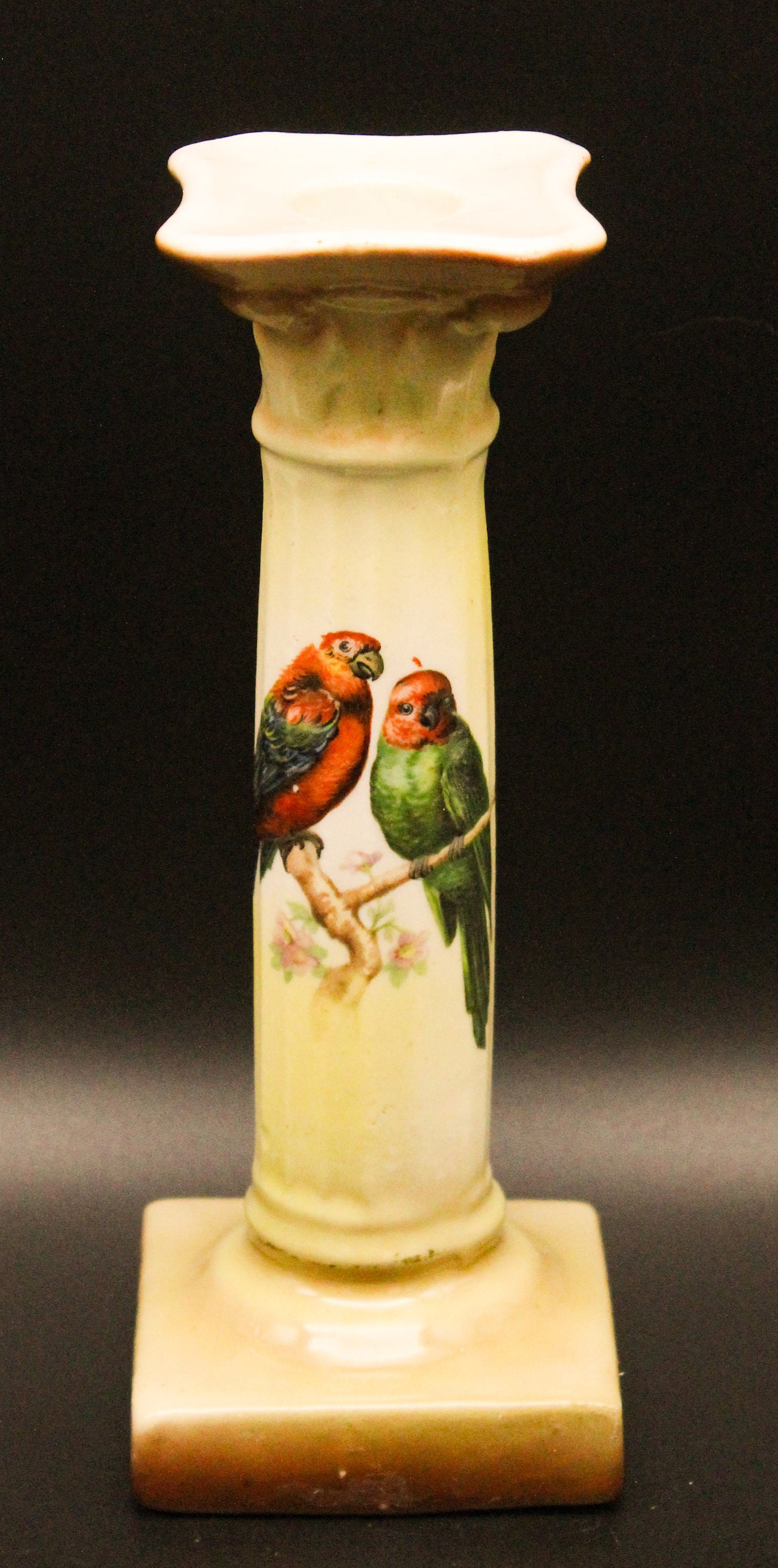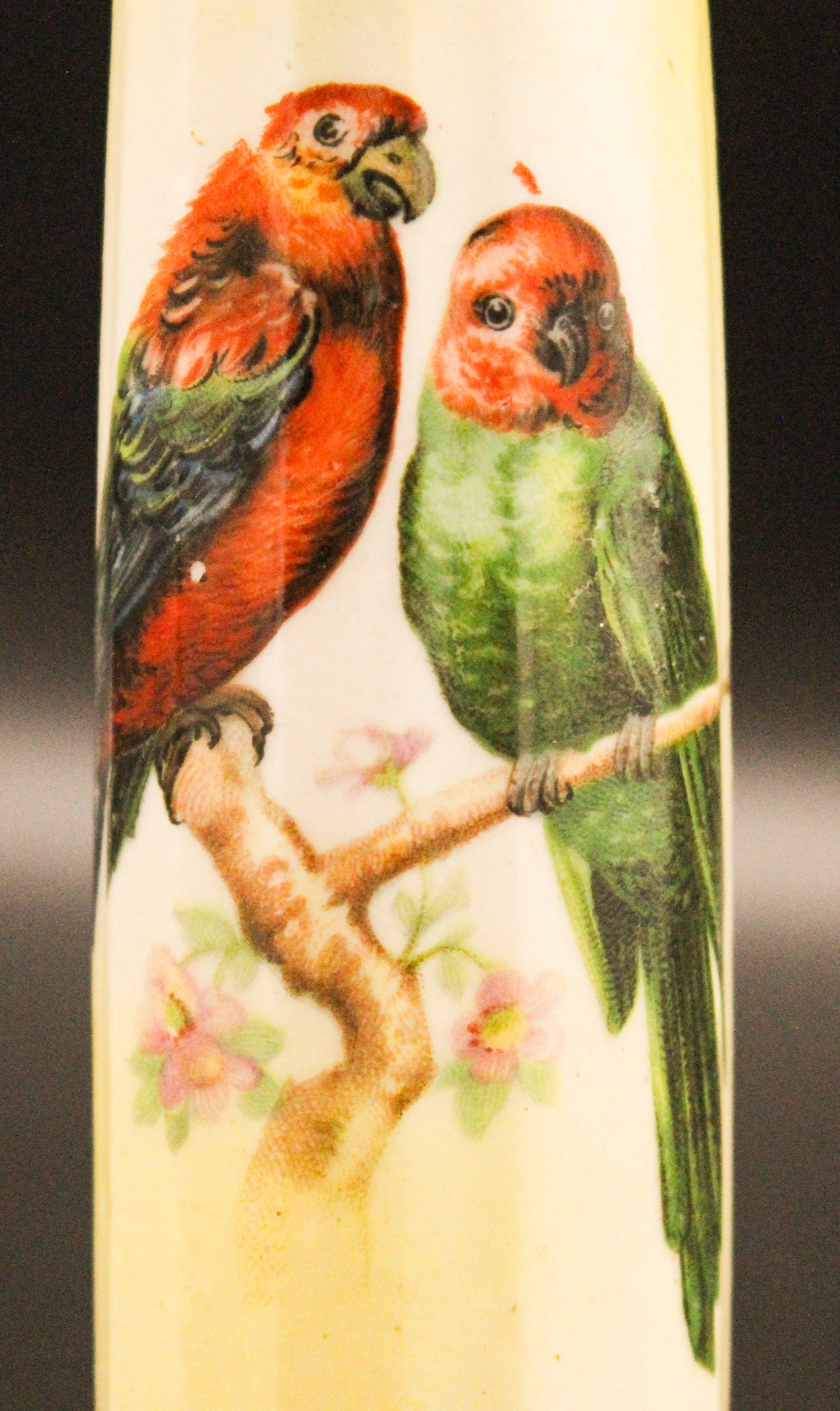 It has a pretty, colorful pattern depicting 2 parakeets.