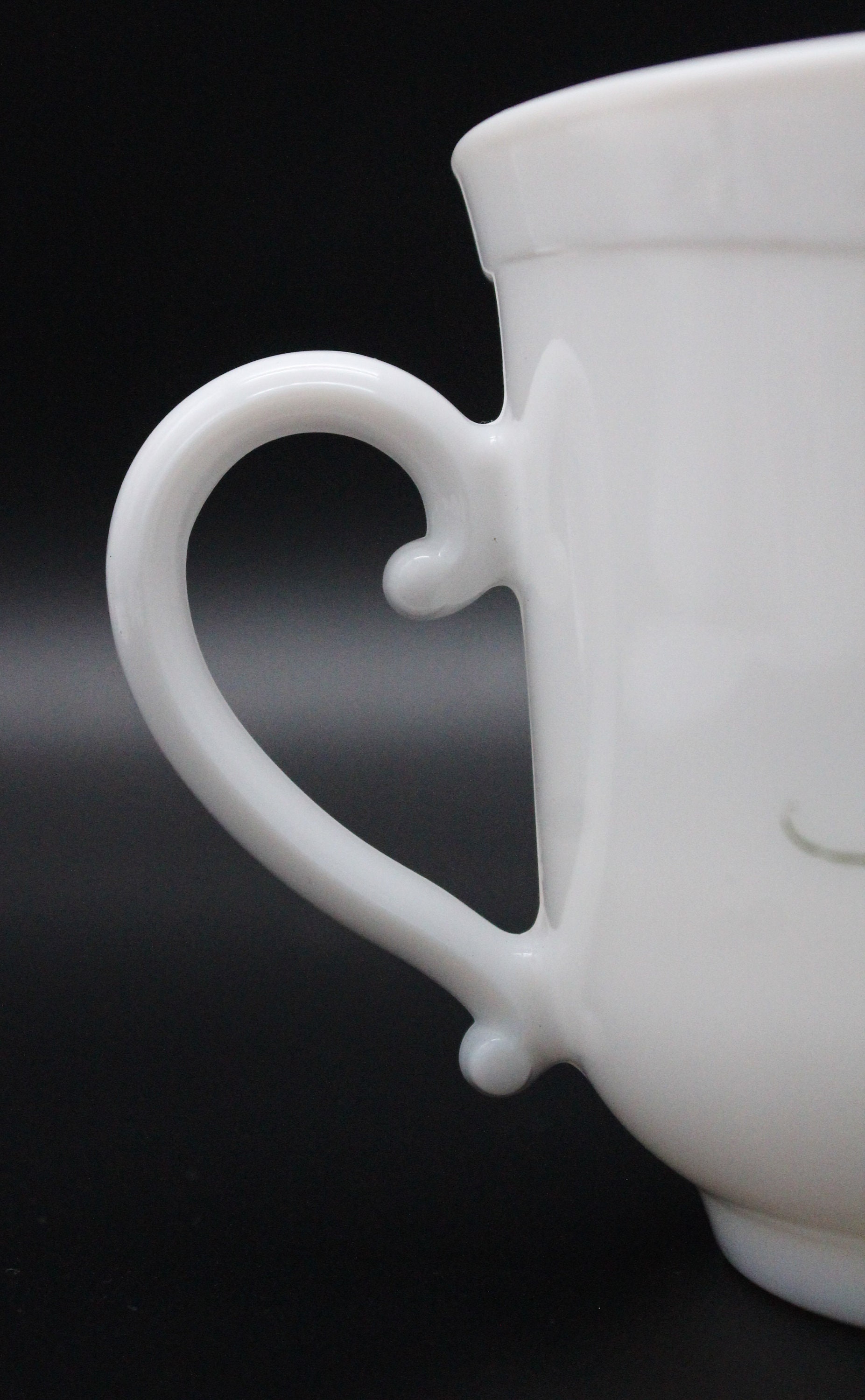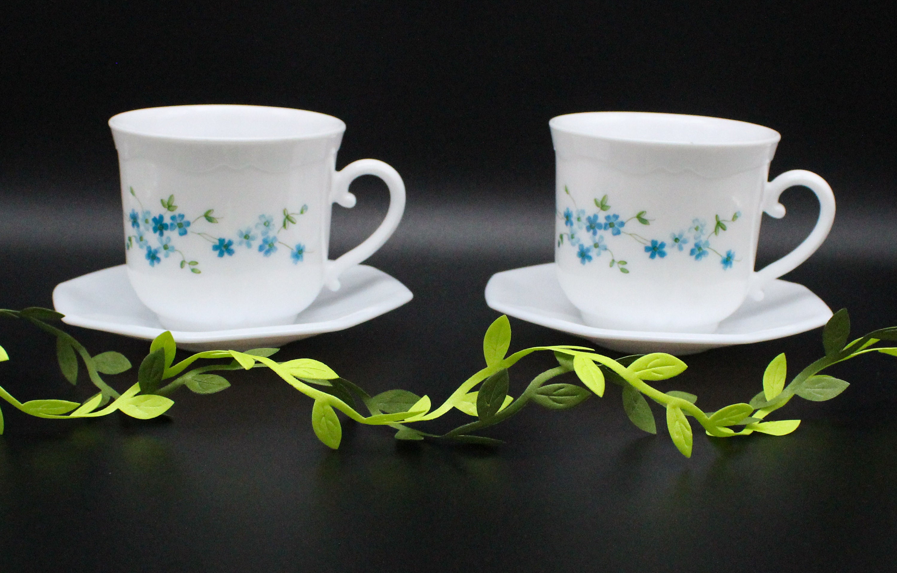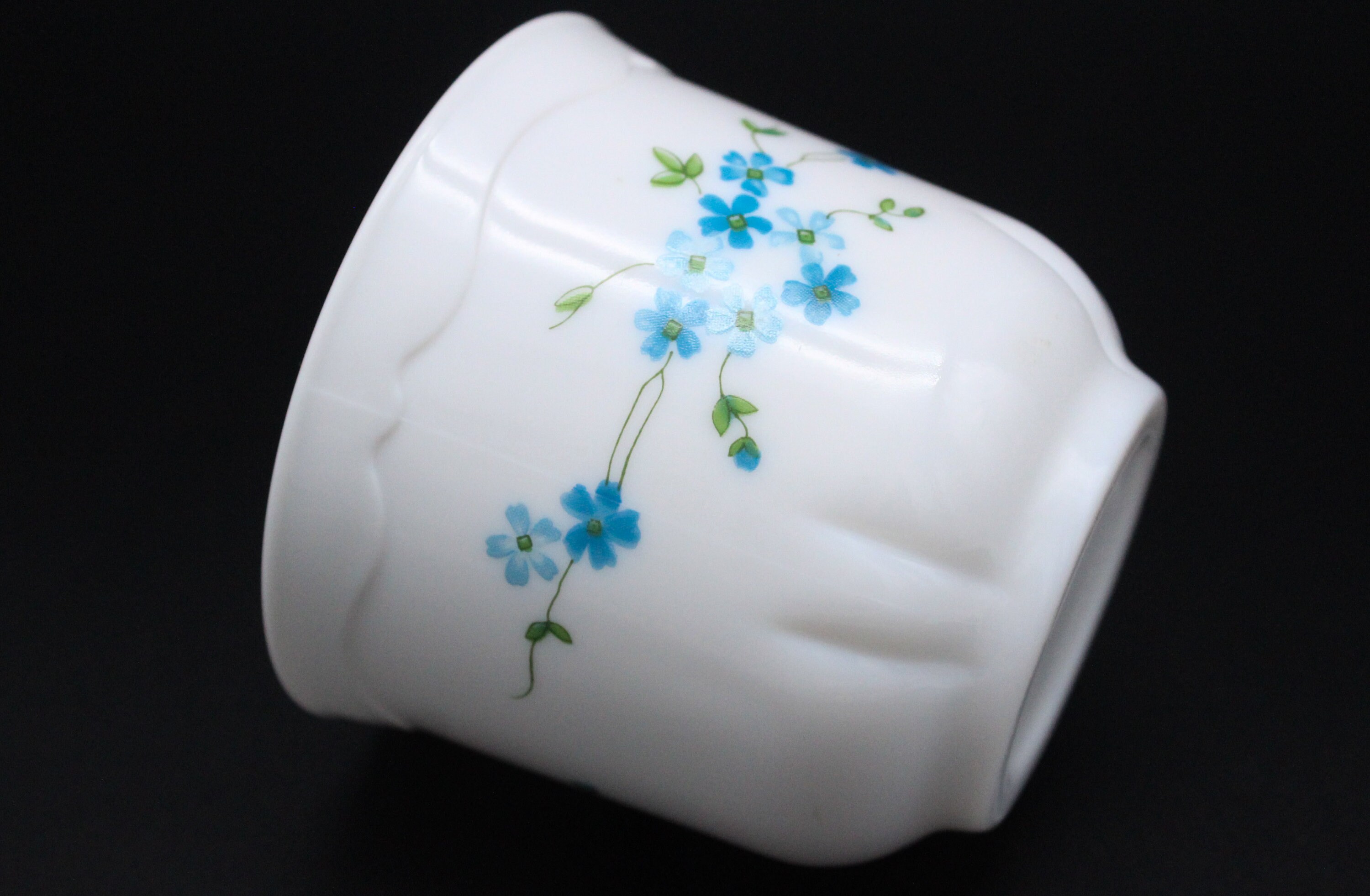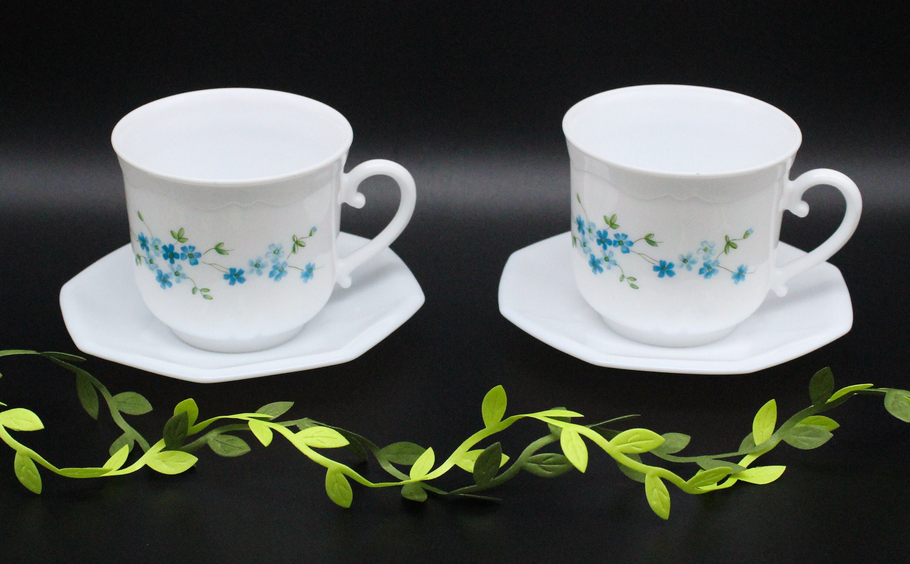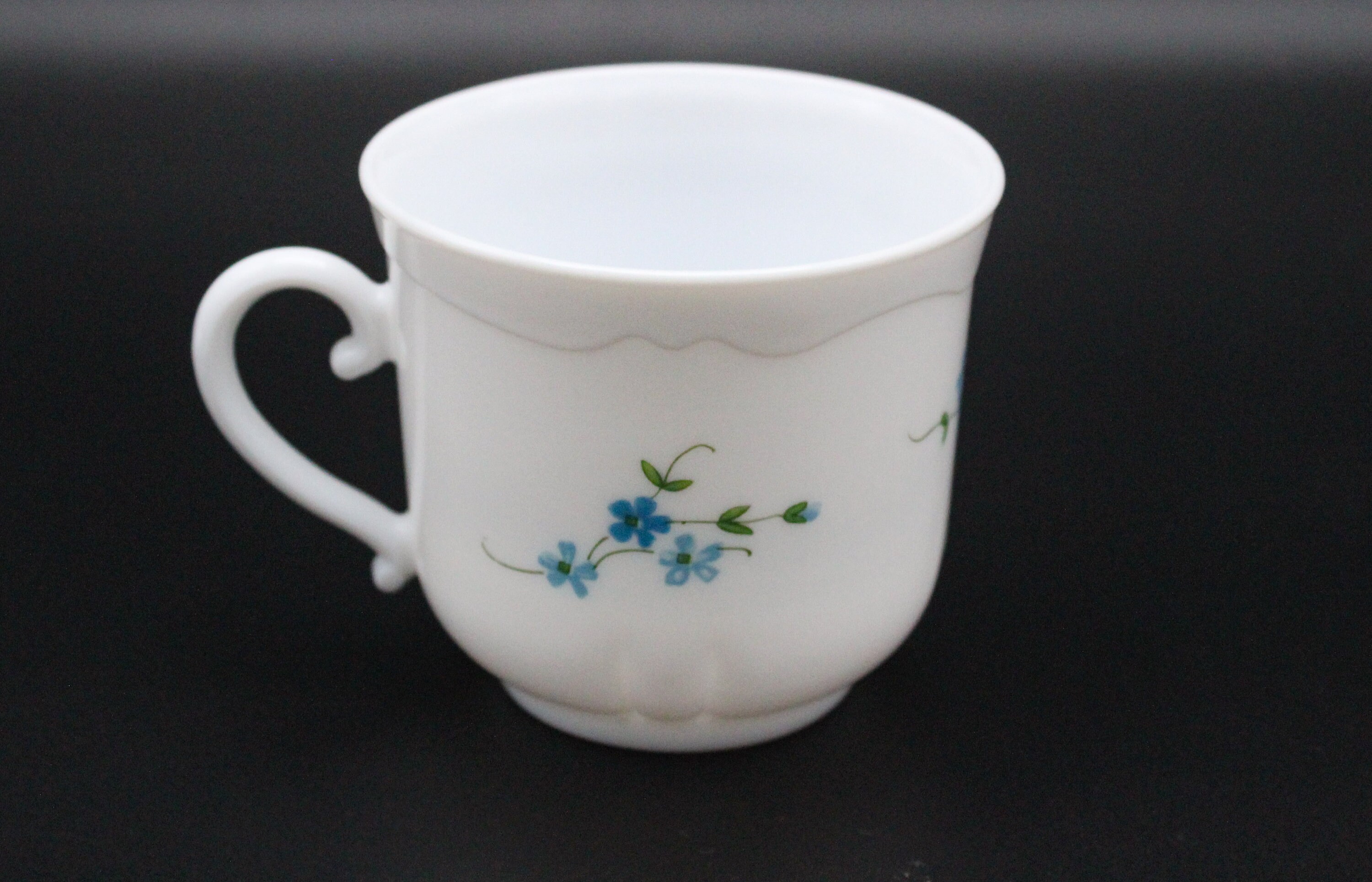 Large coffee cups in white soaked opal with small blue flowers dating back to the 80s.