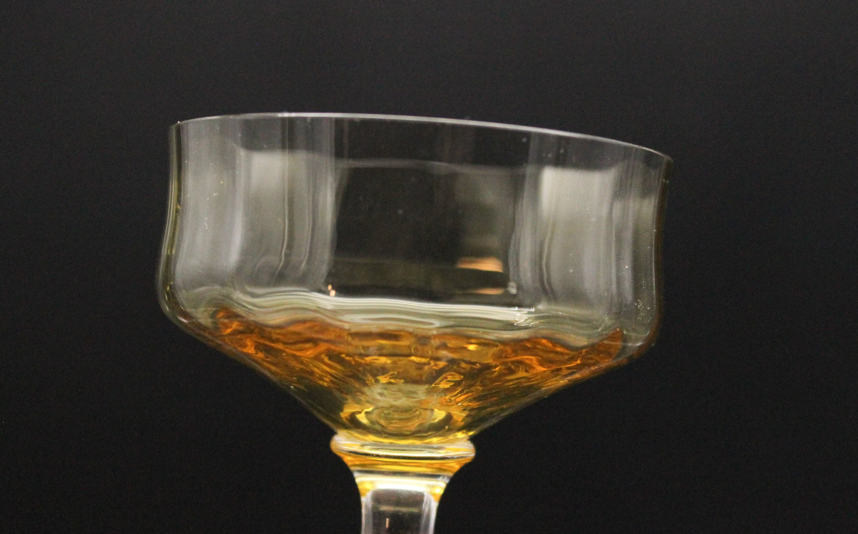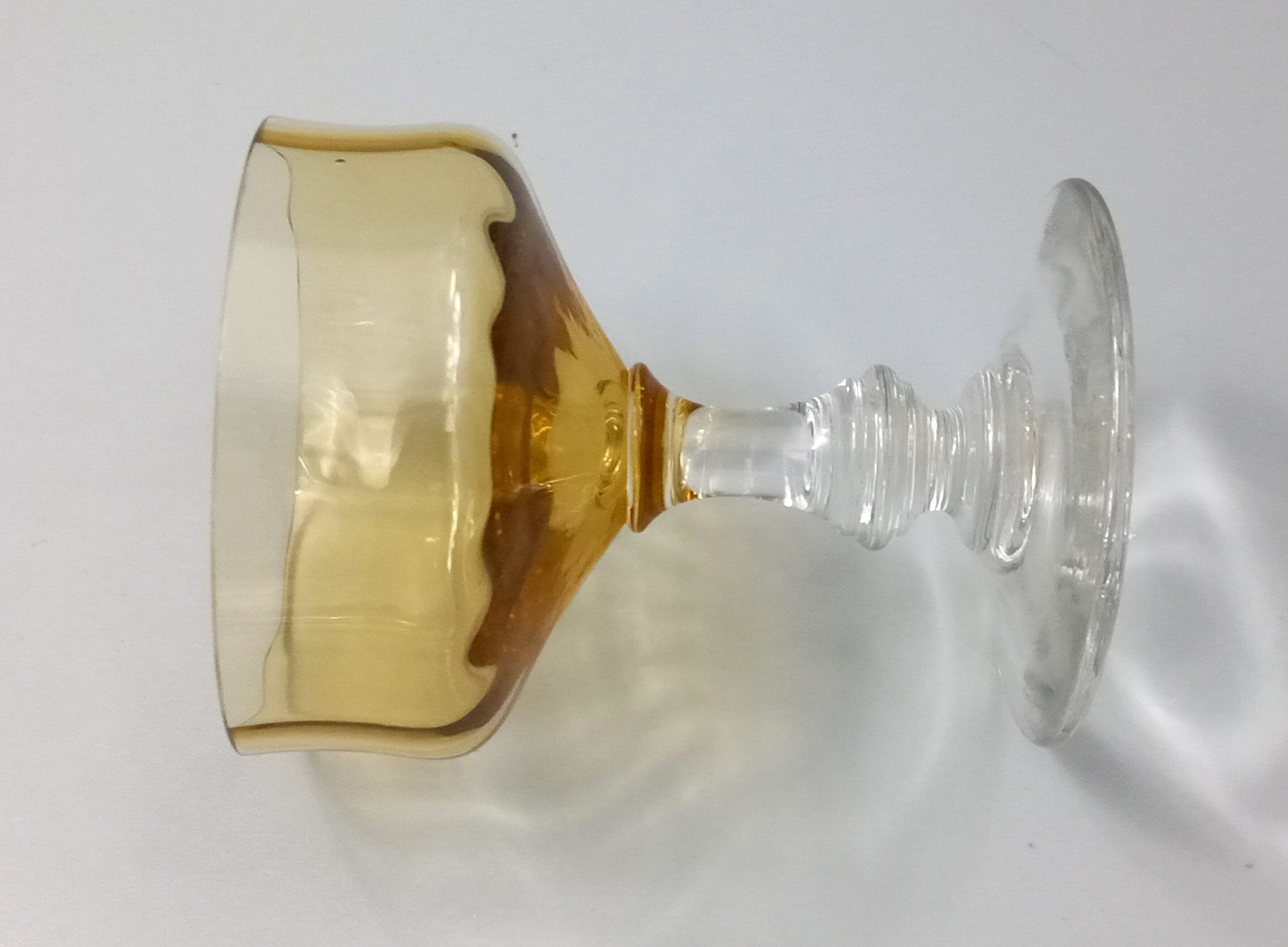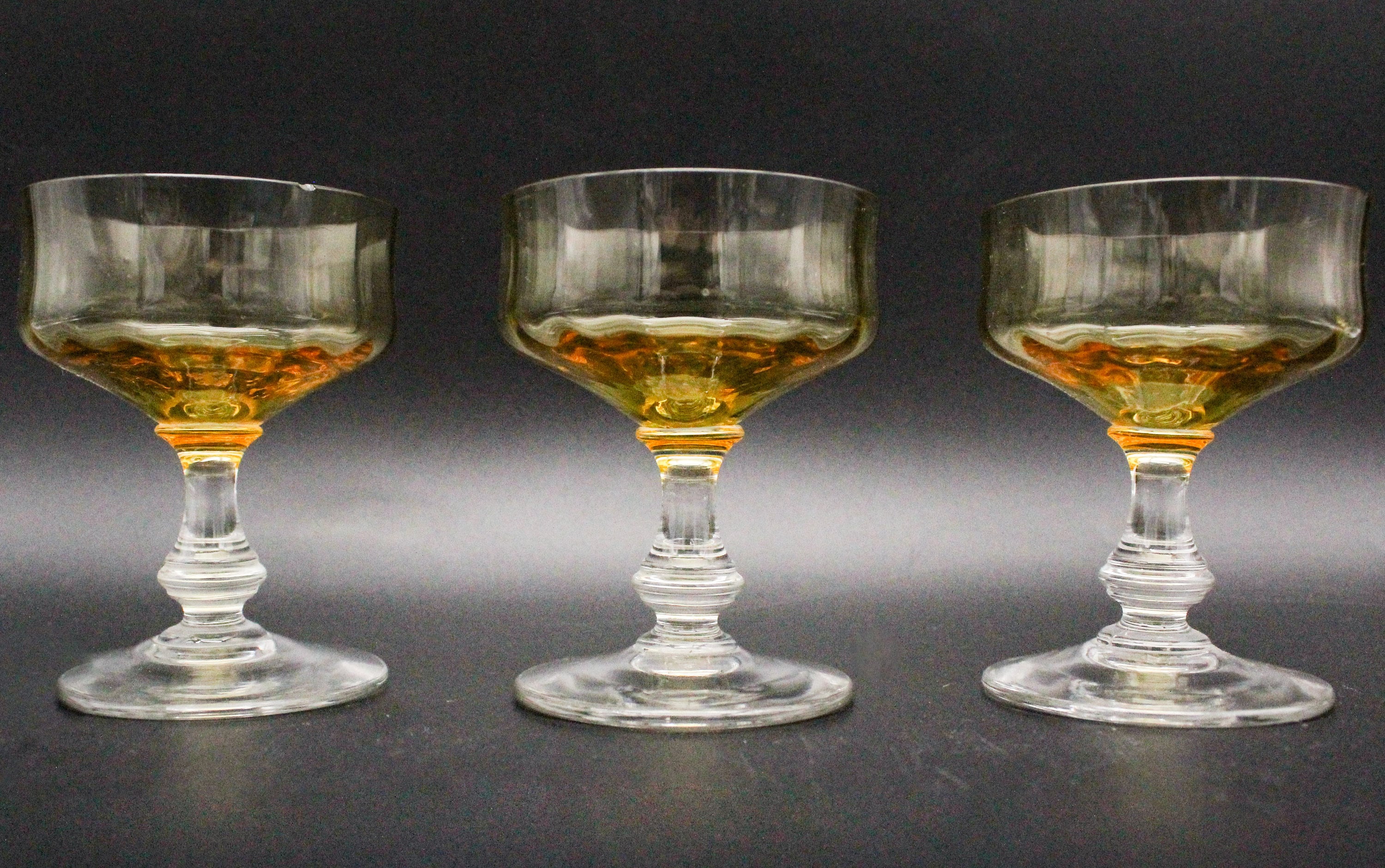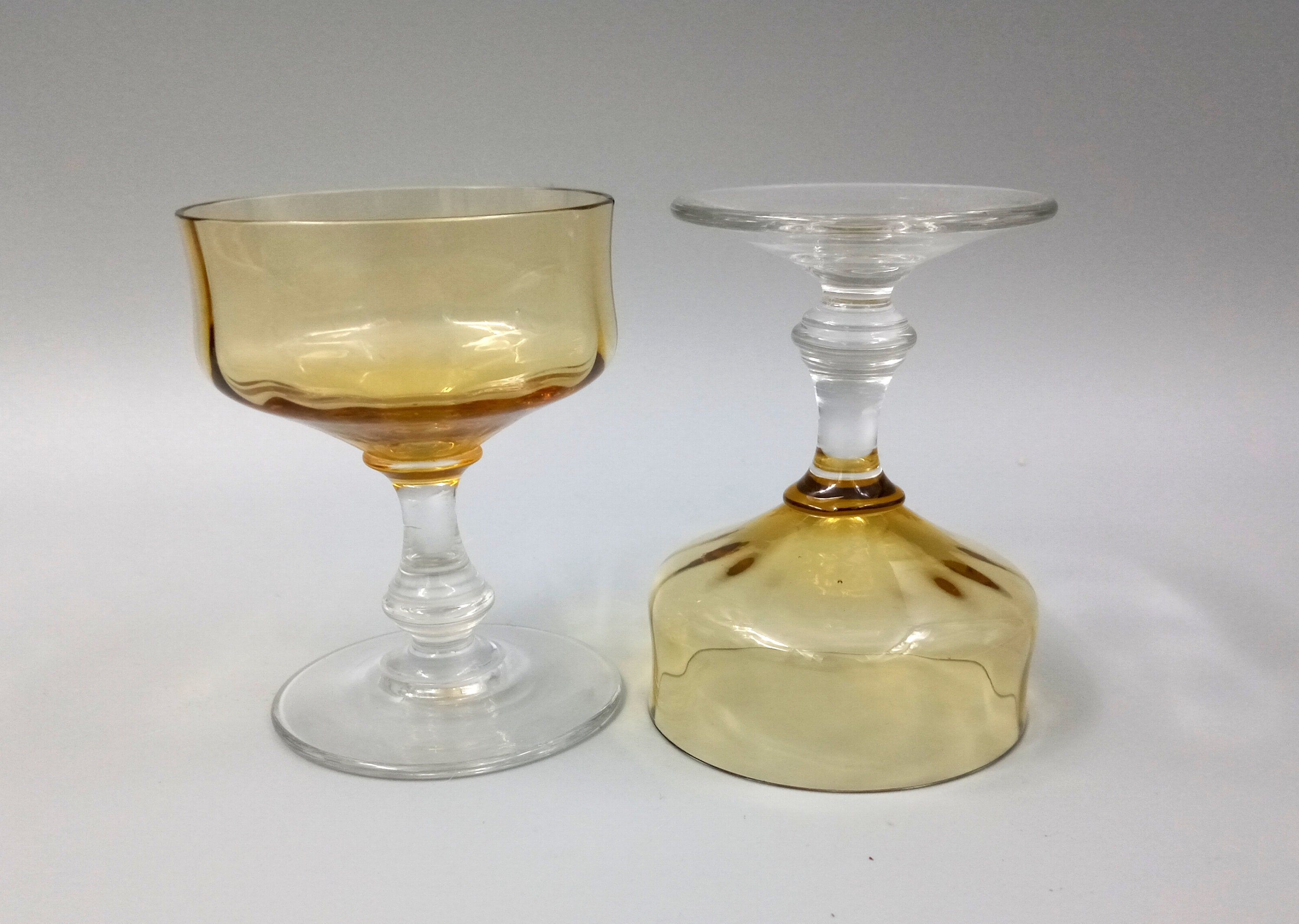 Their column-shaped base and stem are made of clear crystal. The chalice has an original shape and a lovely, slightly amber-yellow color.