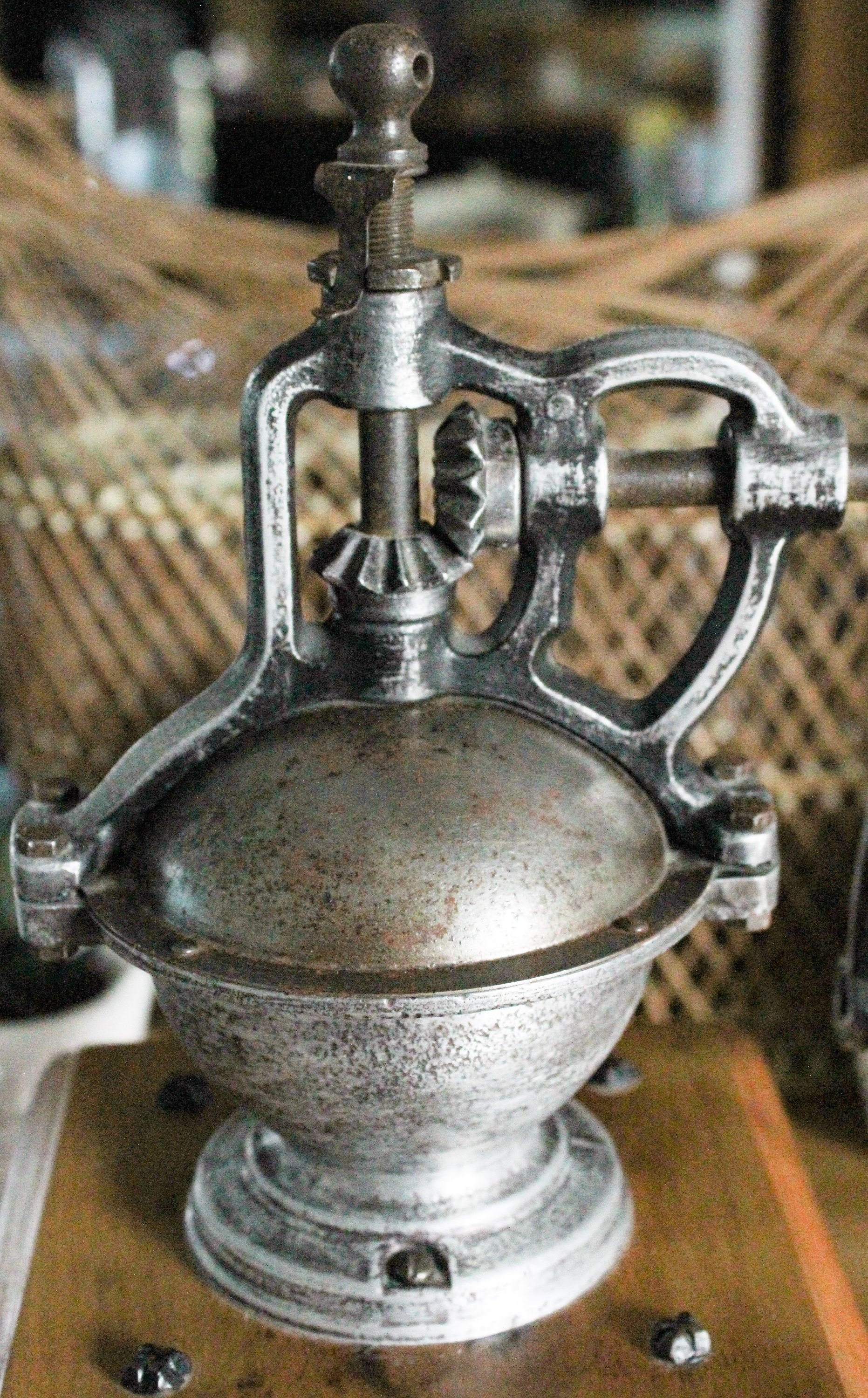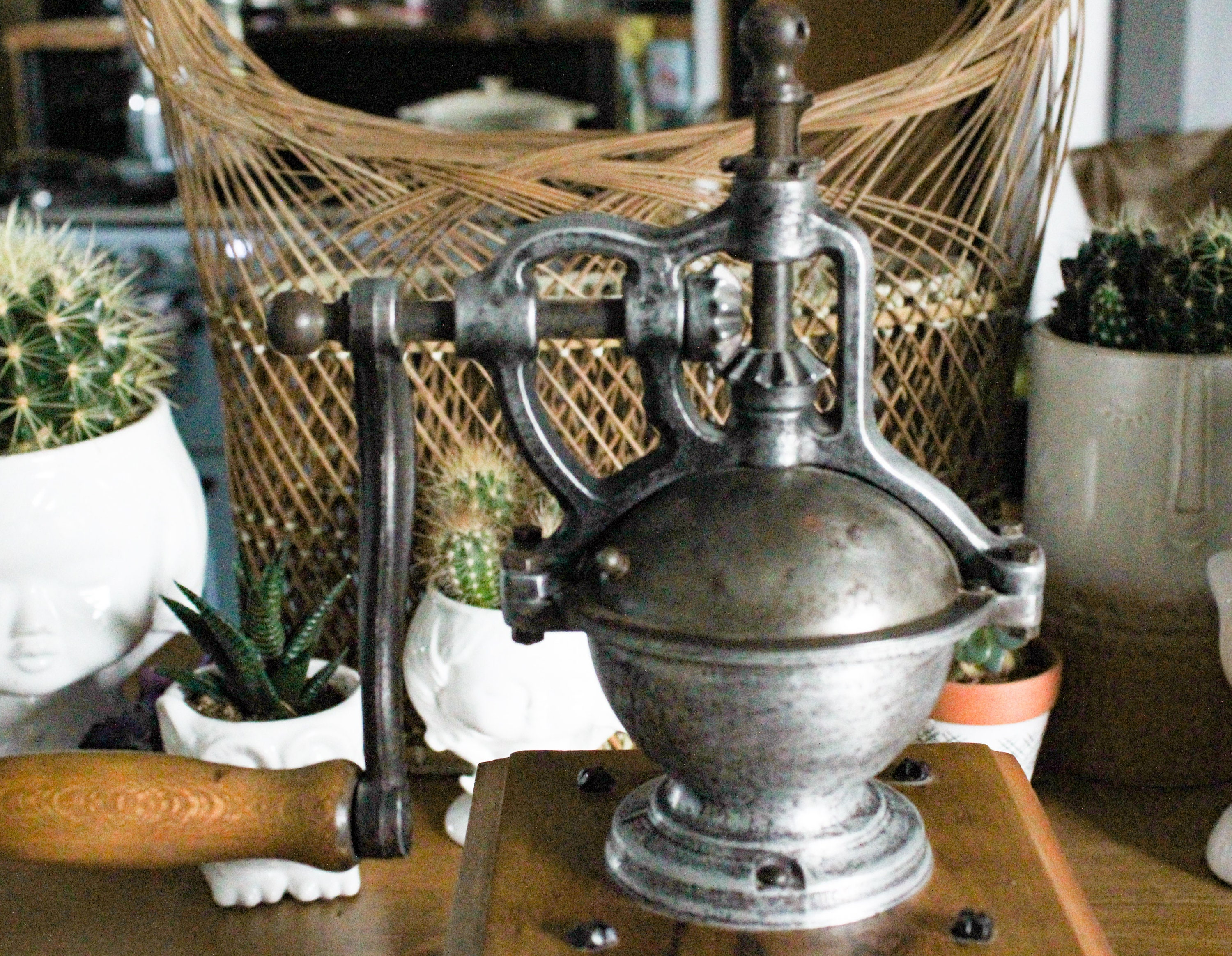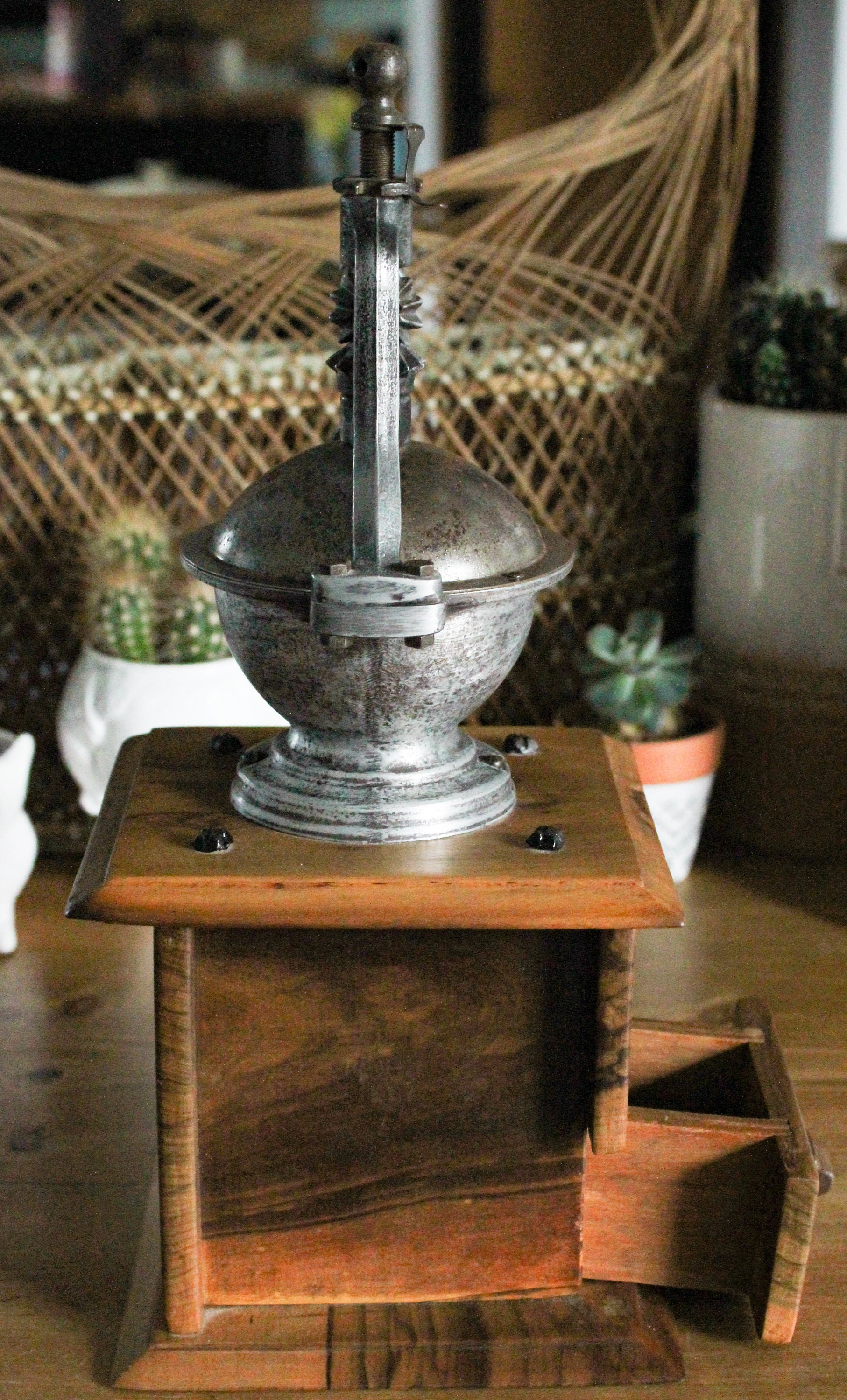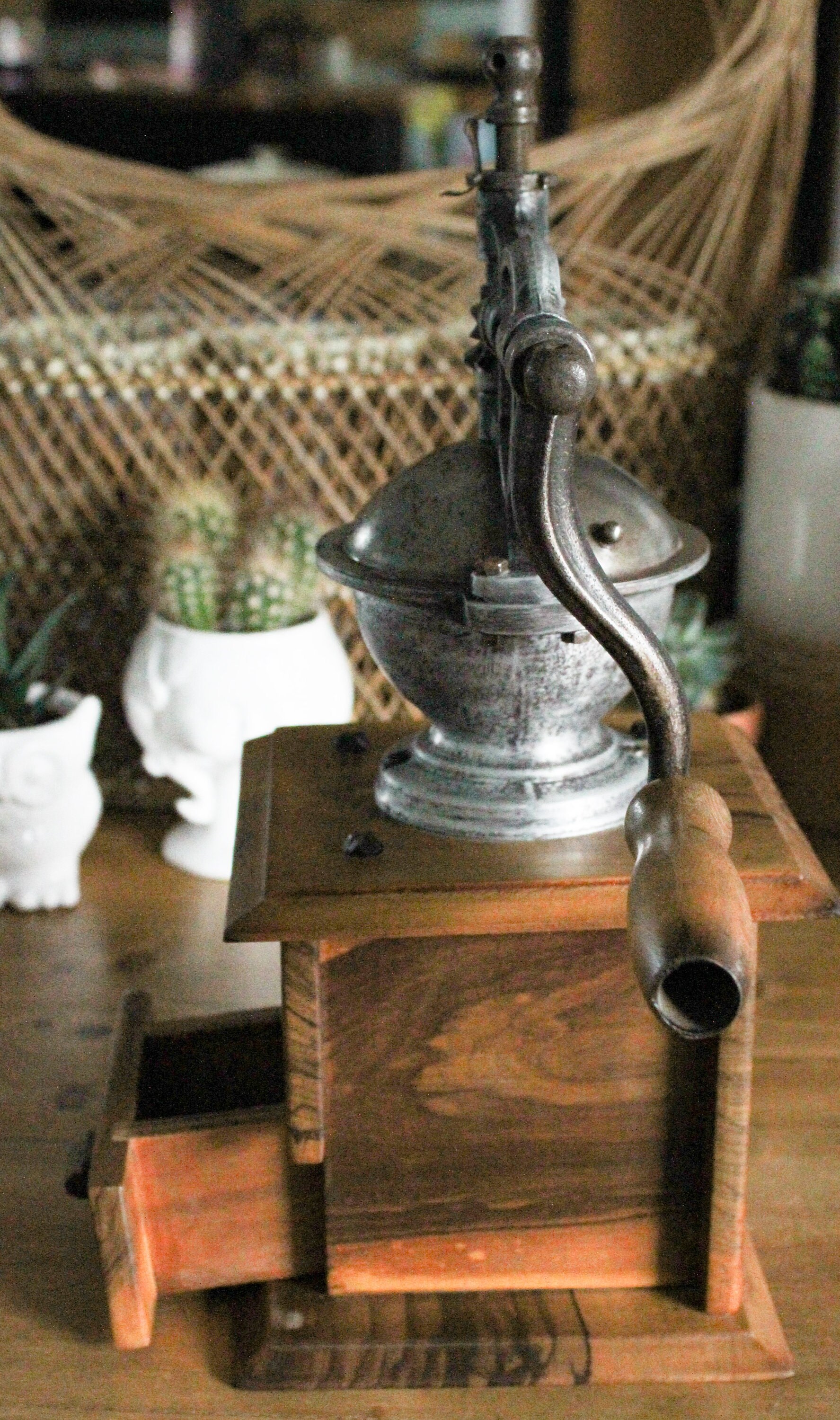 Nice vintage coffee grinder with a hand crank, made of wood and metal.