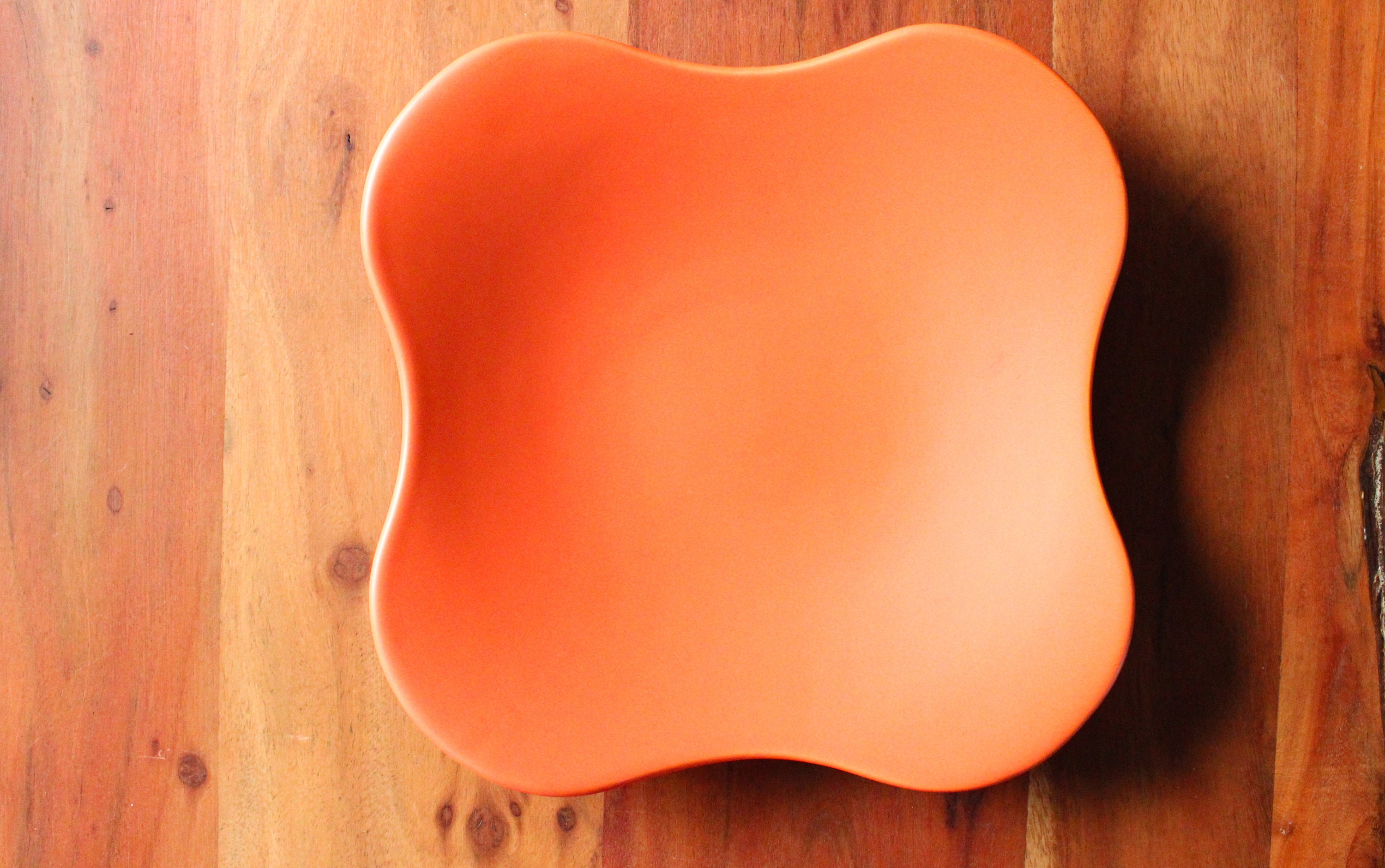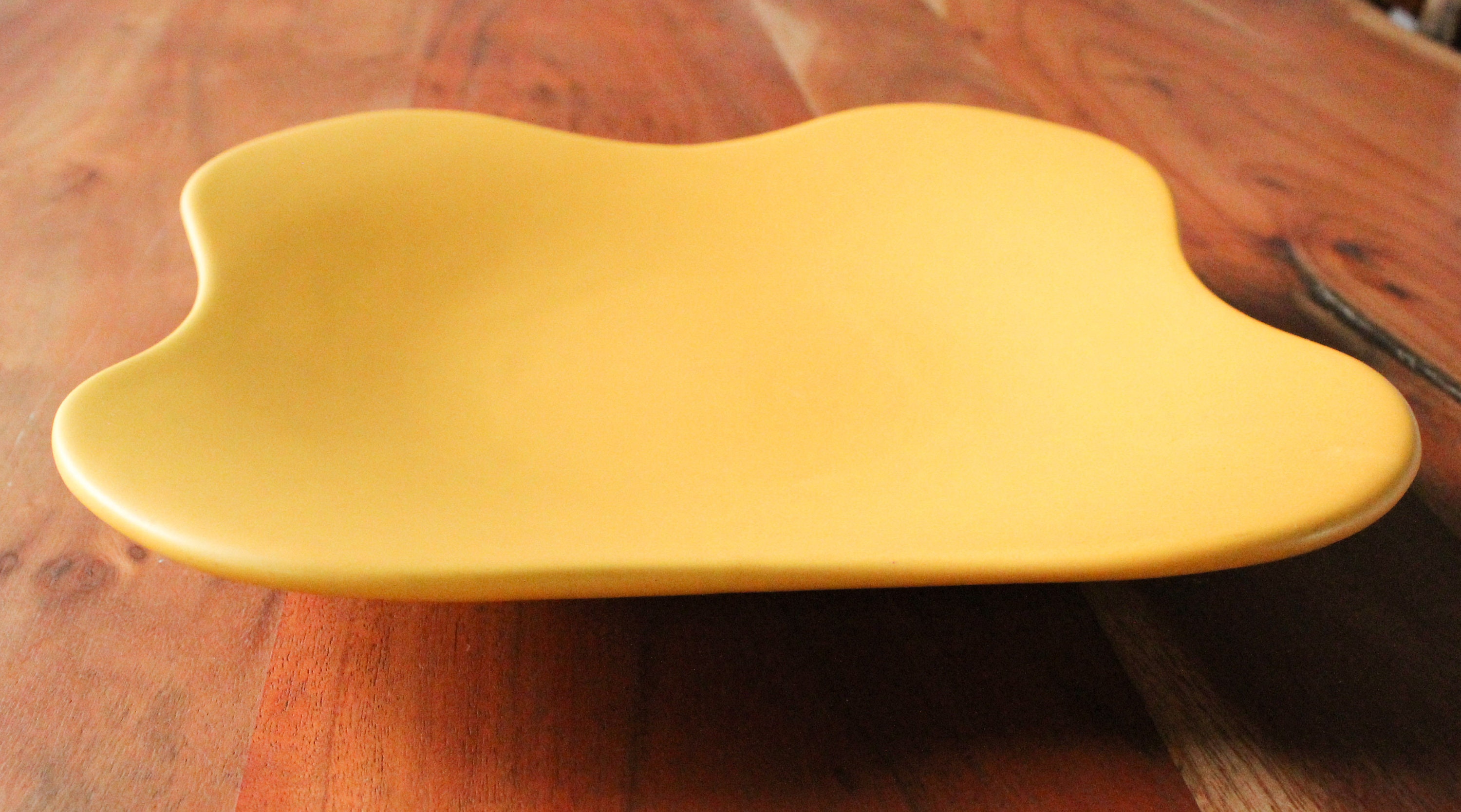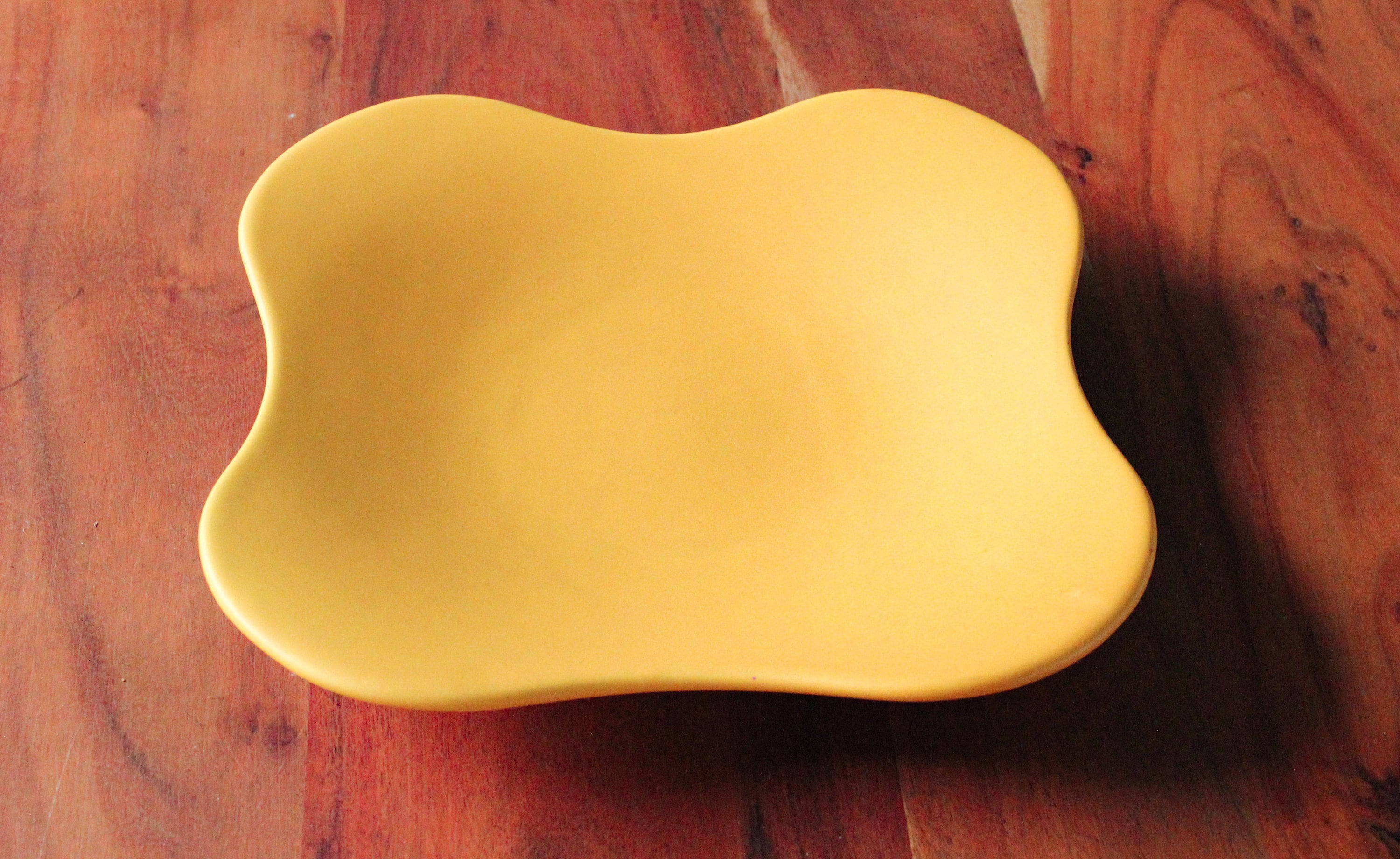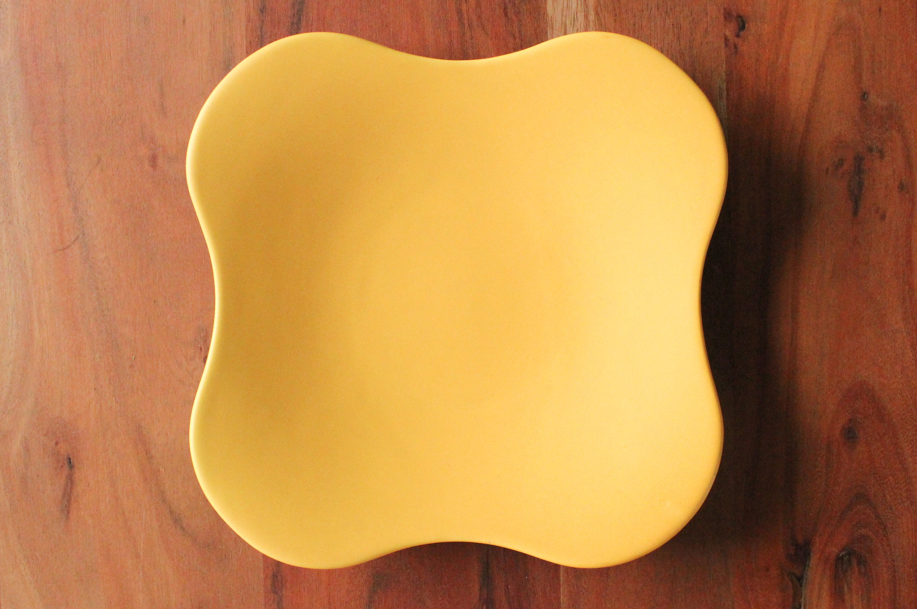The dish is covered with a pretty yellow or orange glaze with a satin finish. It will easily fit into a contemporary, Memphis, or Scandinavian decor.