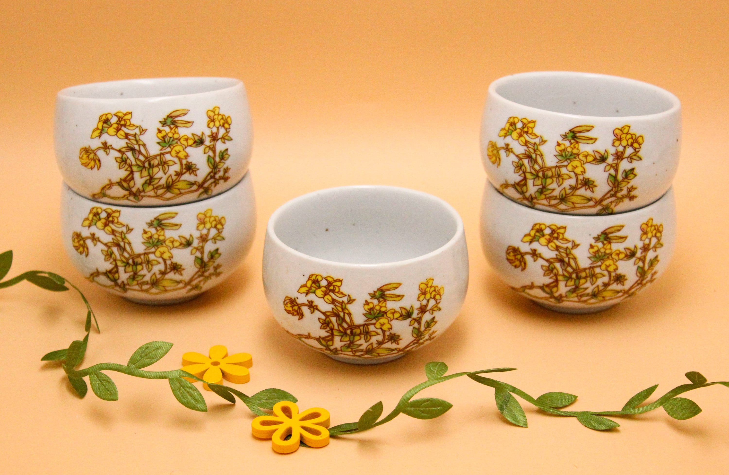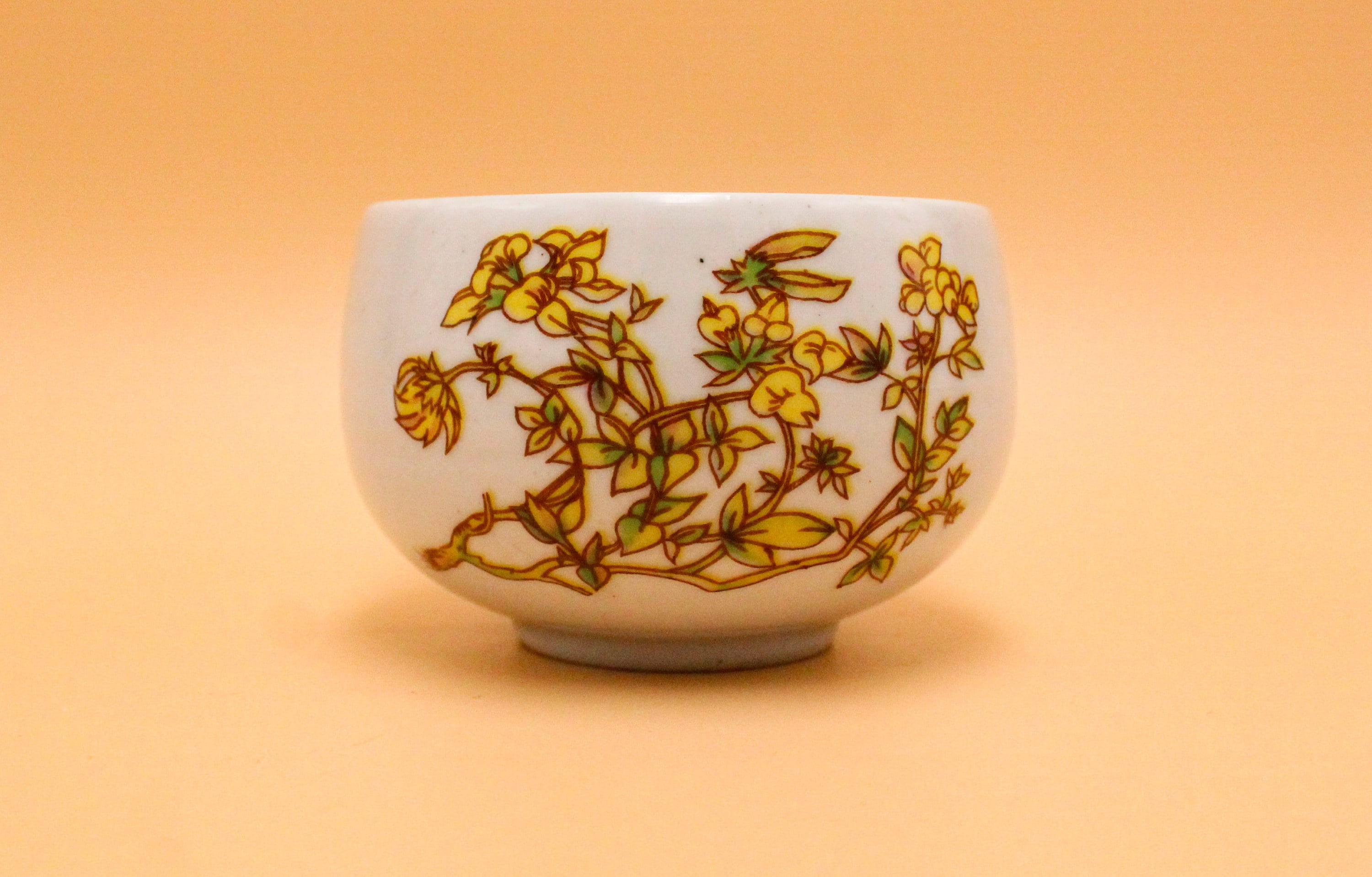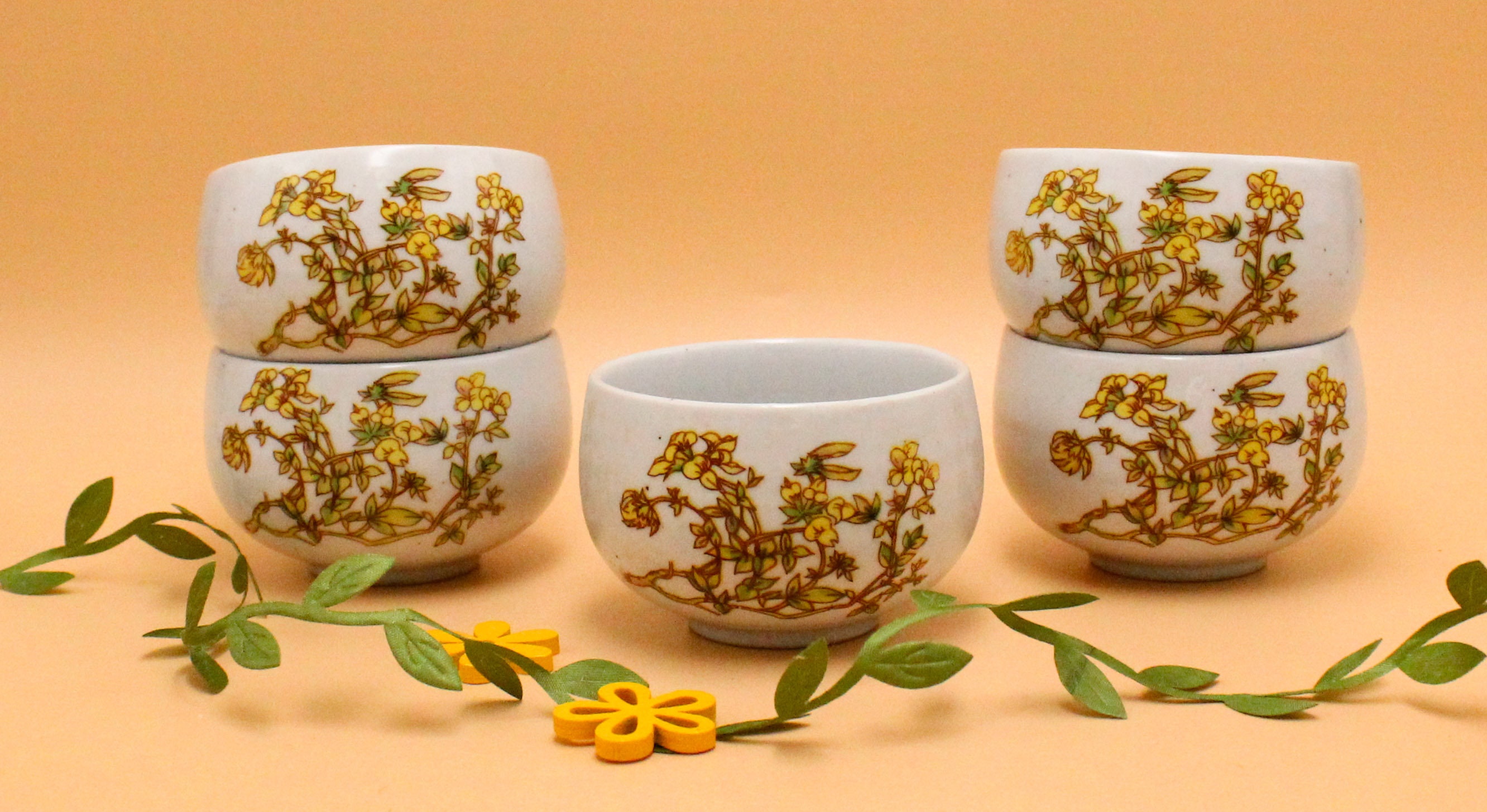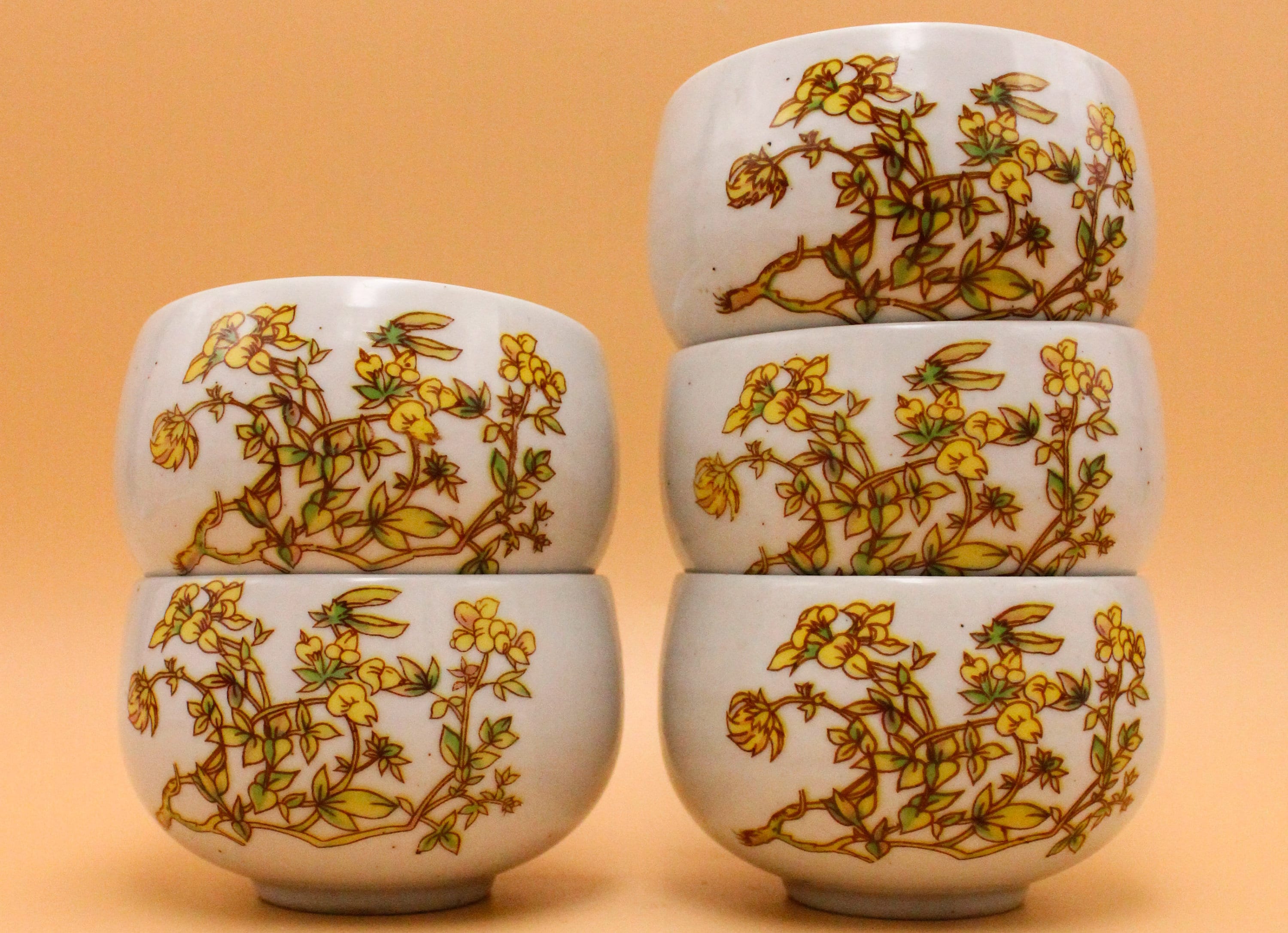 Pretty off-white teacups with a green and yellow floral pattern.