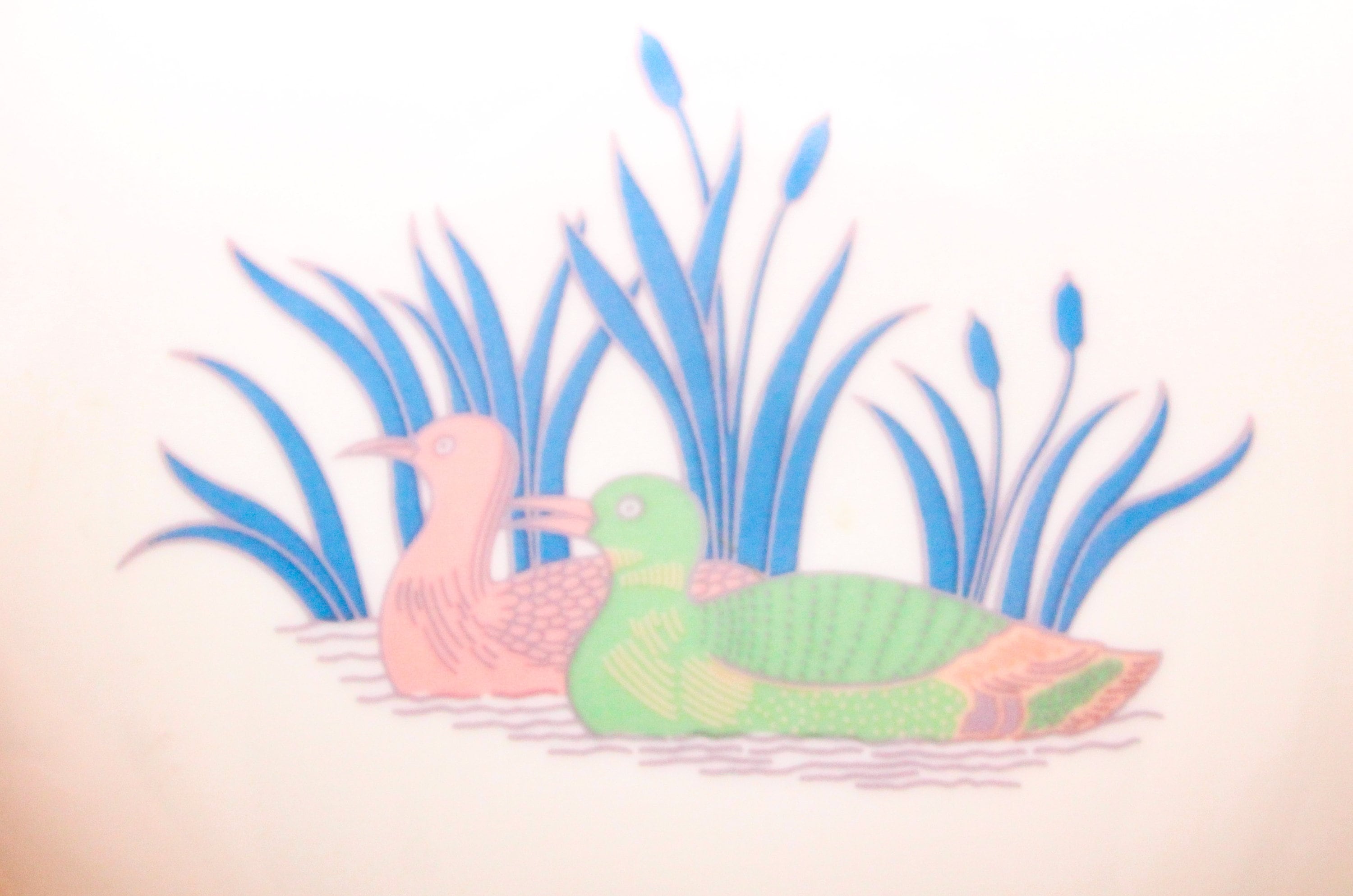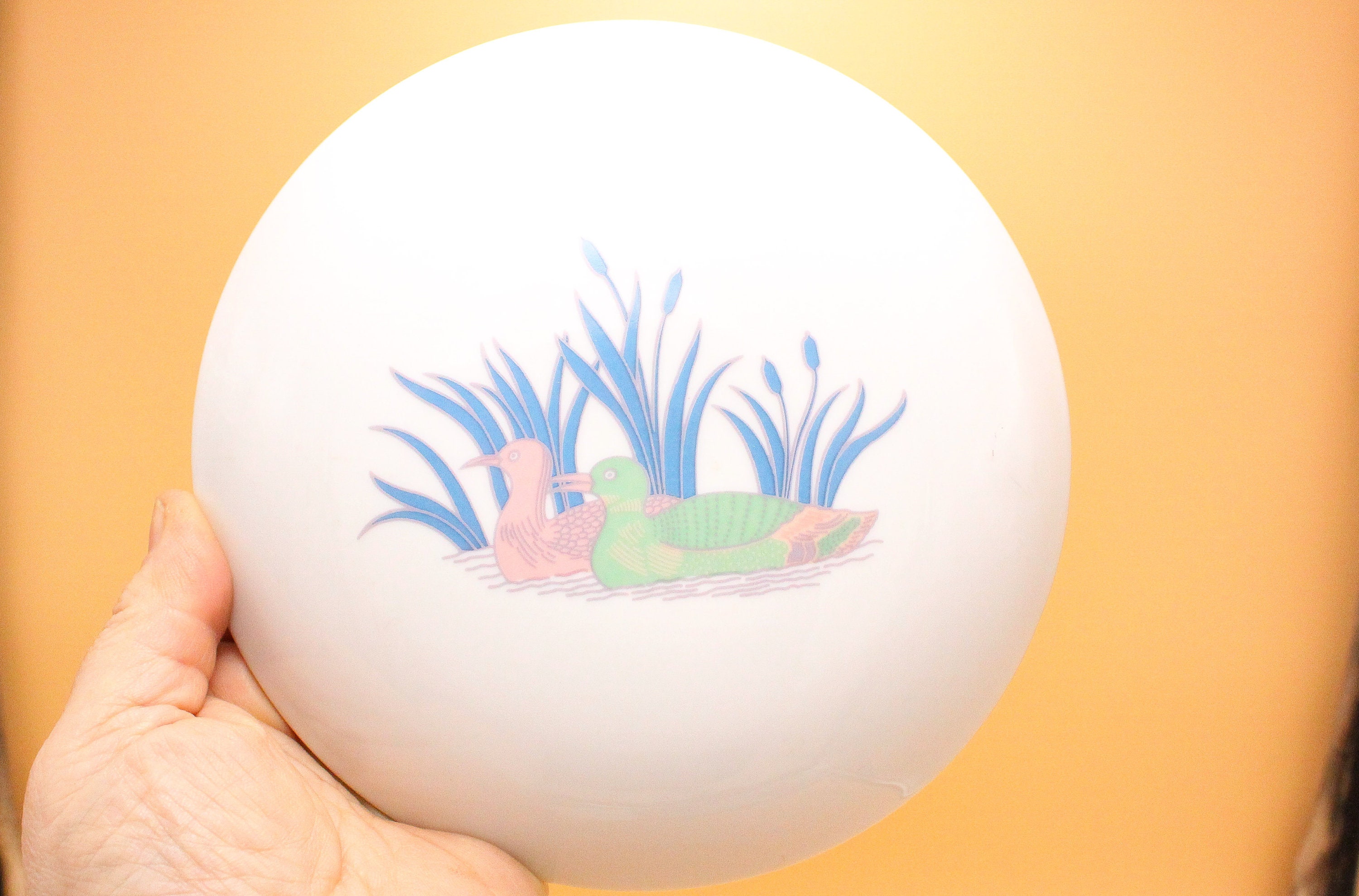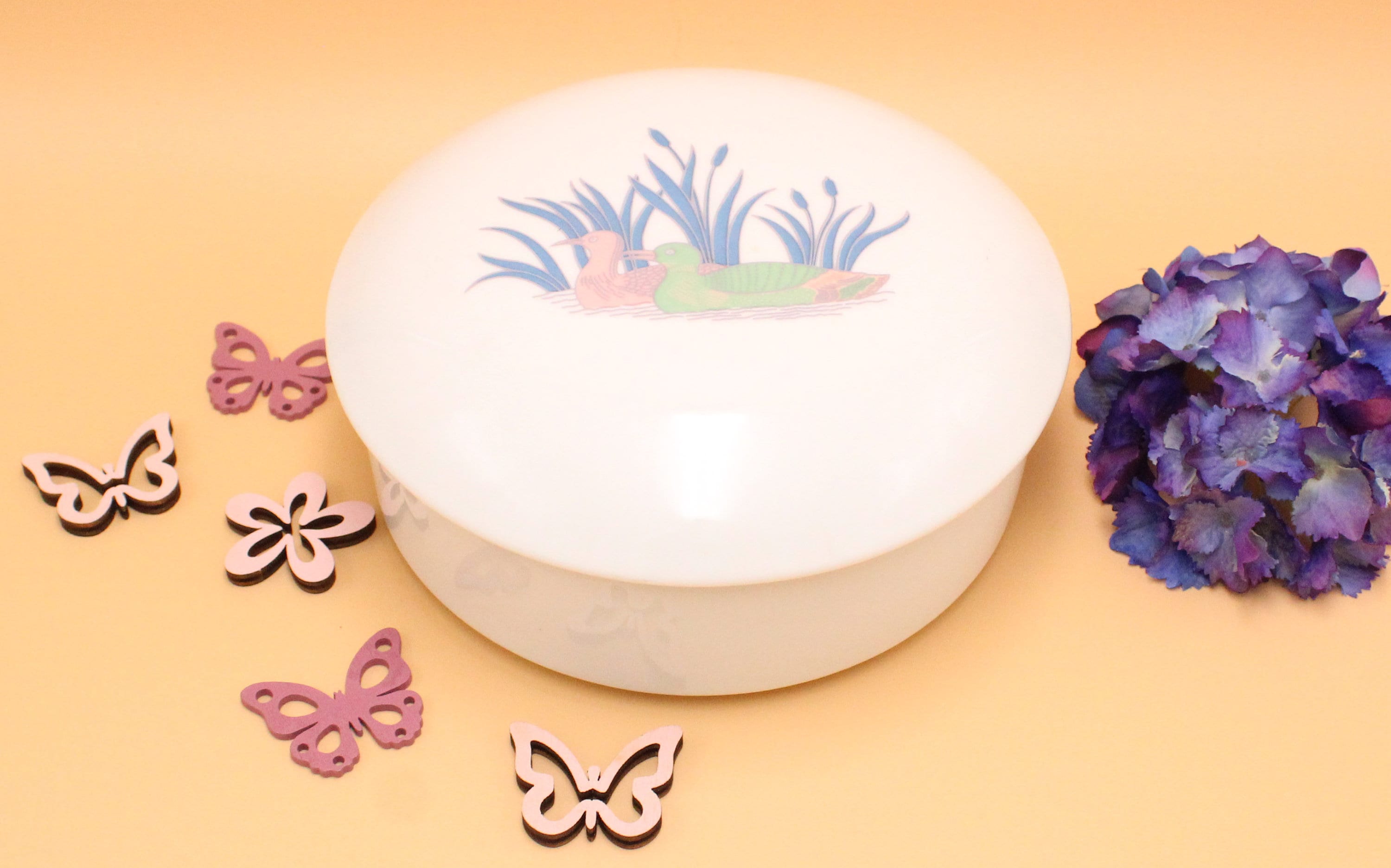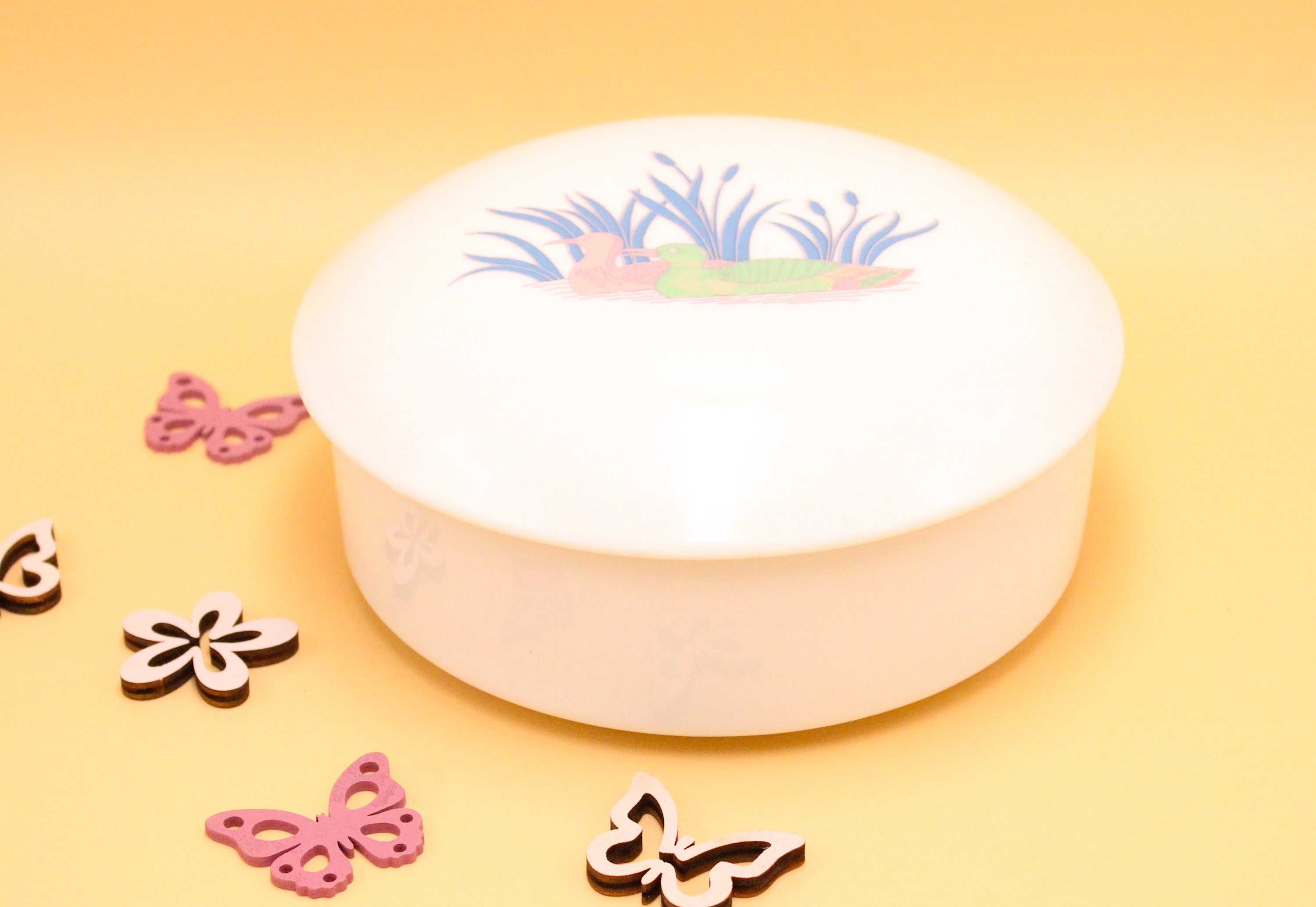 This pretty, large, round porcelain box features a lovely duck motif in very soft colors: powder pink, pale green, blue... It can be used as a keepsake box, a jewelry box...