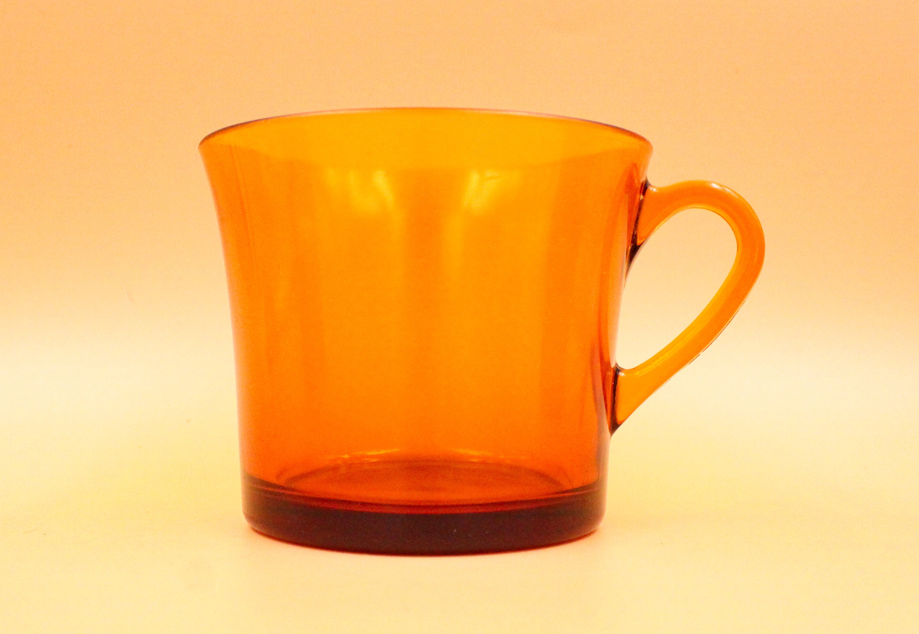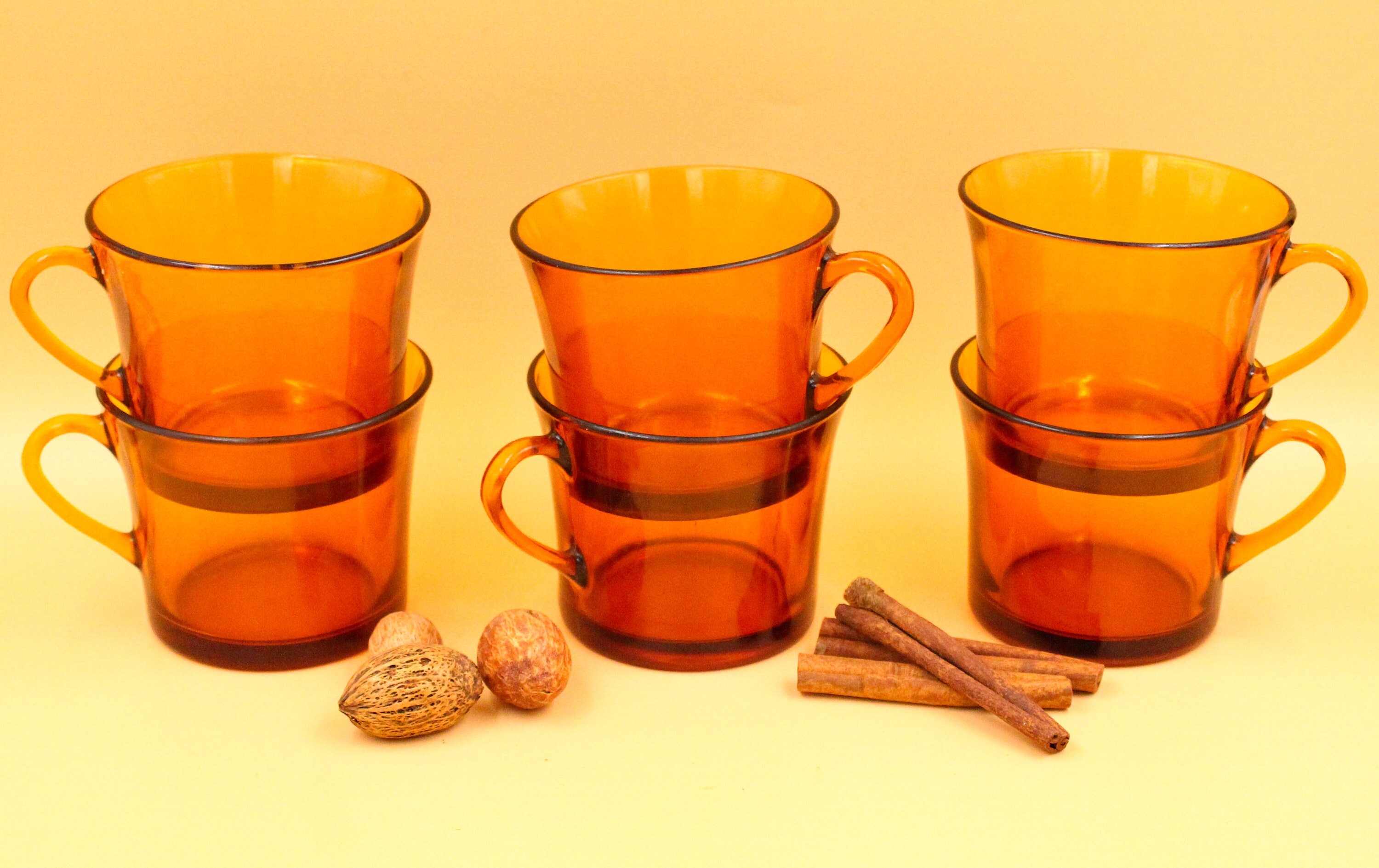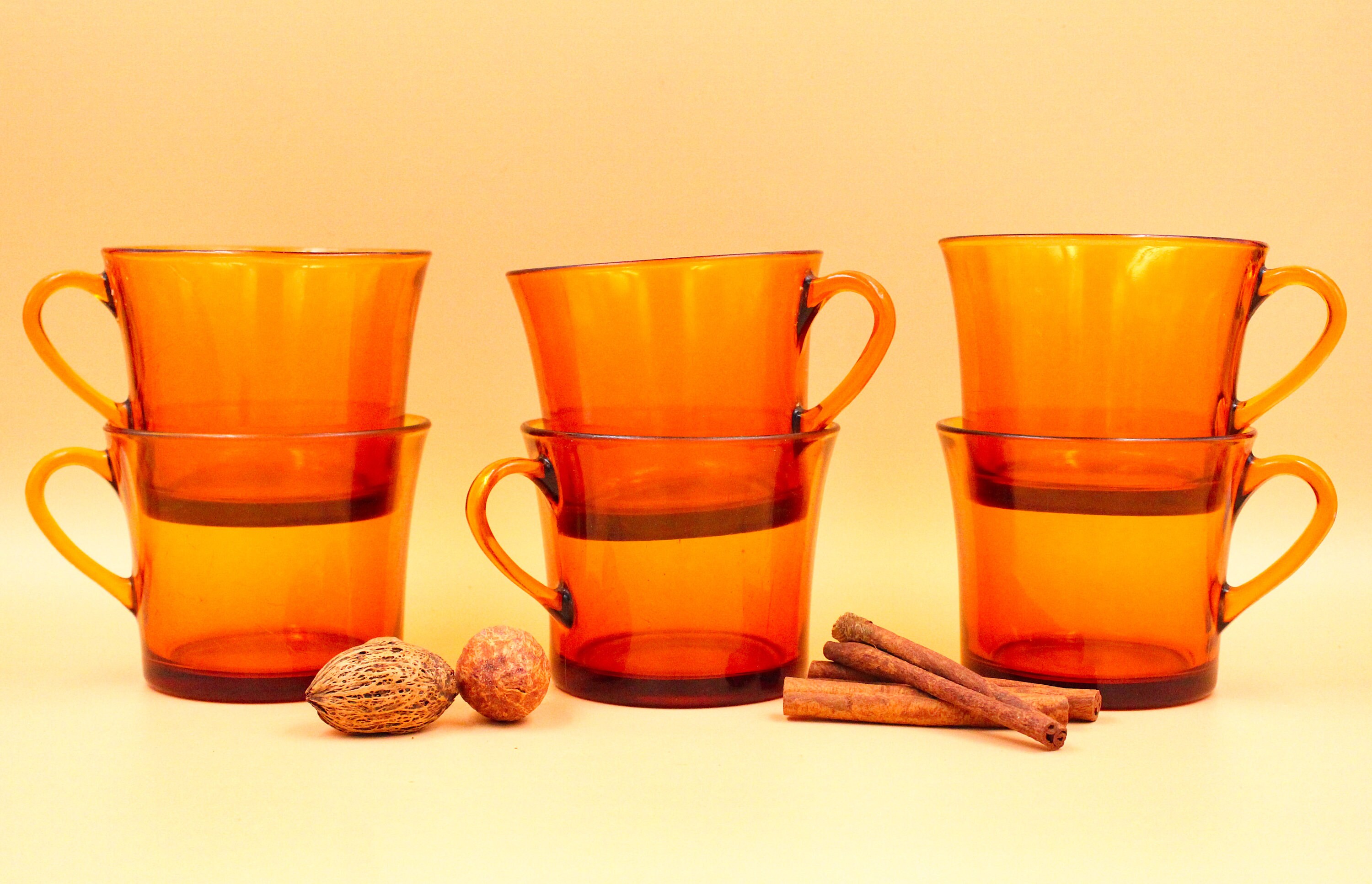 These 6 large coffee cups are made of tempered glass, orange-amber color, they date from the 70s and were manufactured by DURALEX France, CALI model.