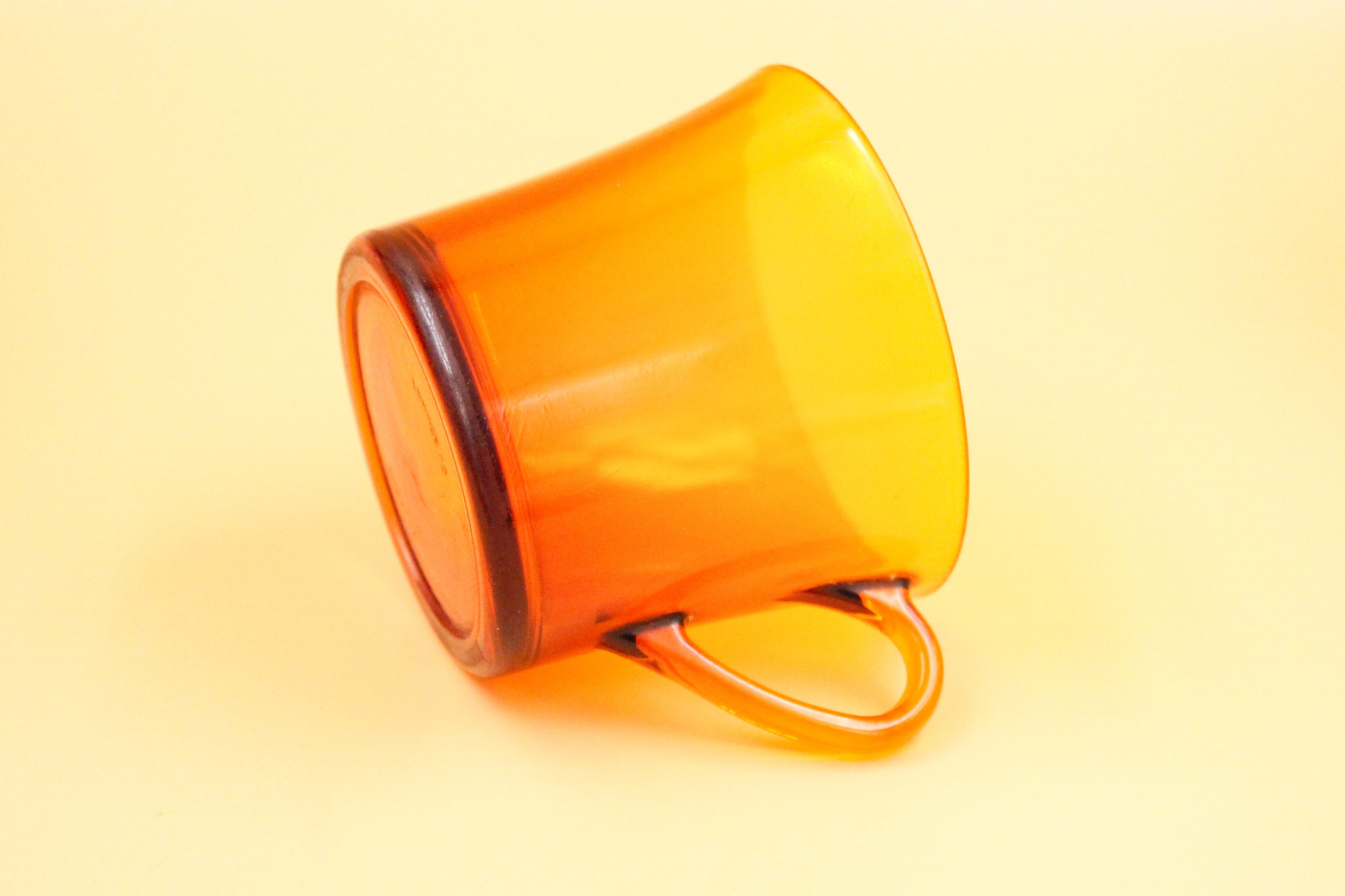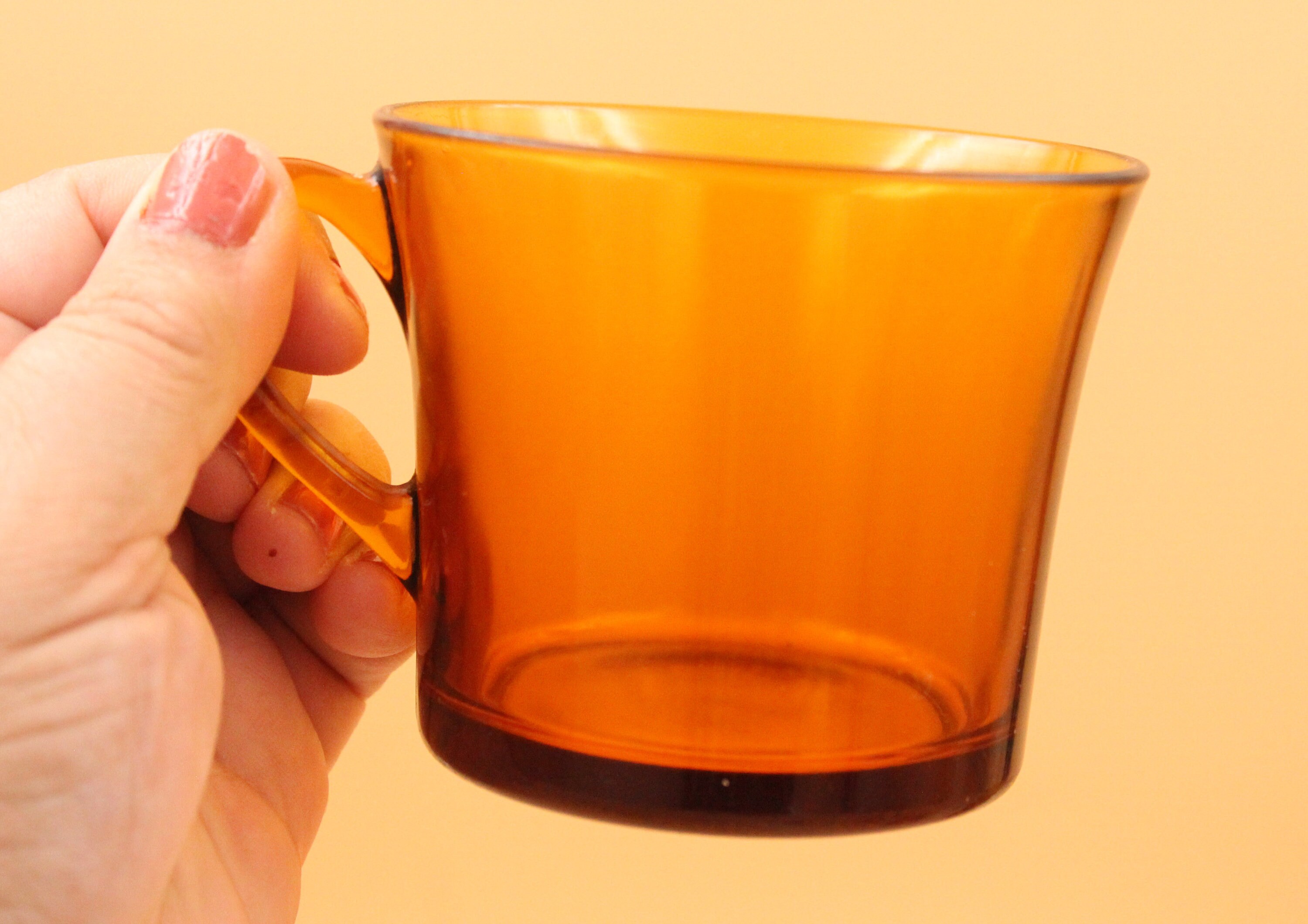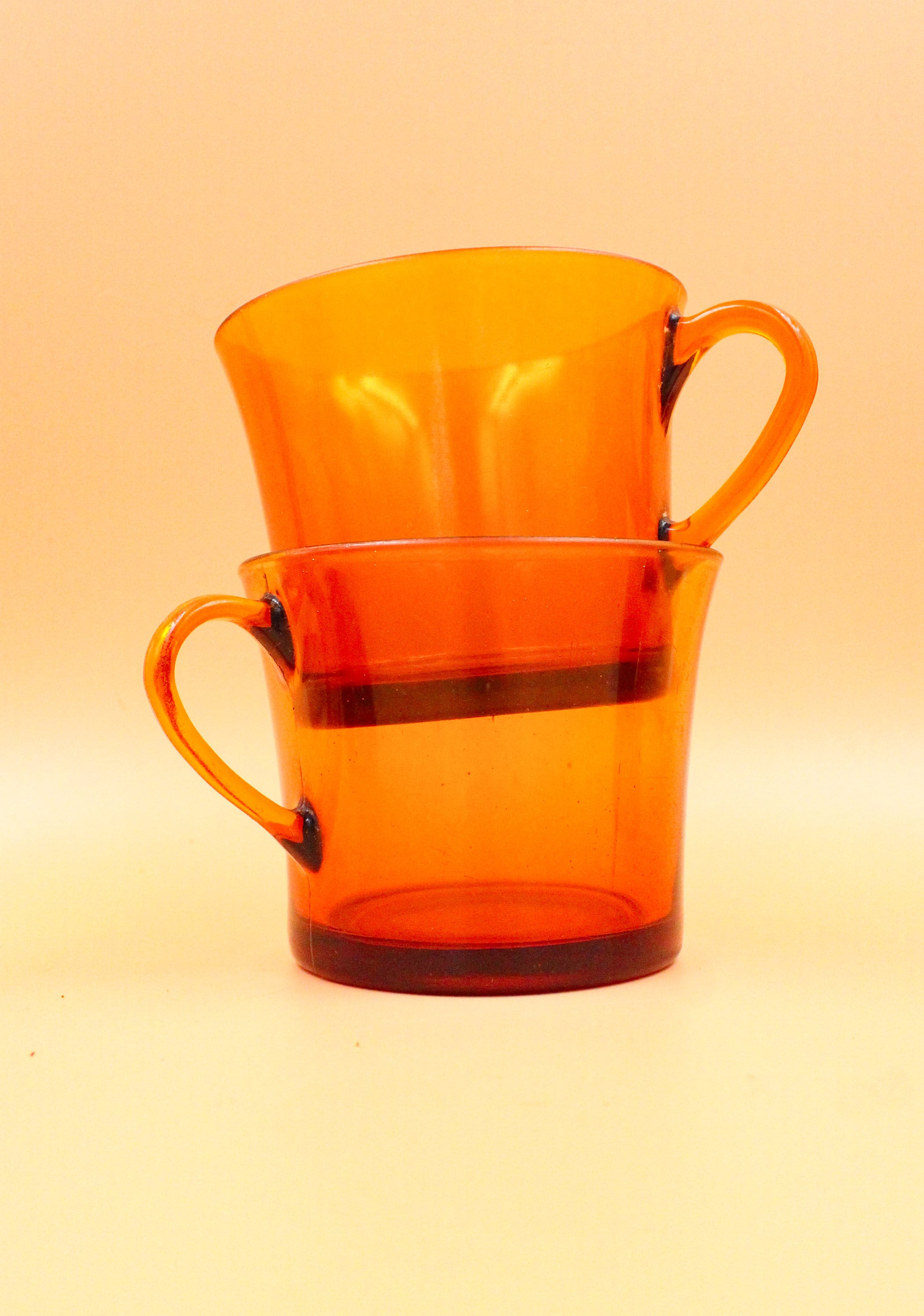 These 6 large coffee cups are made of tempered glass, orange-amber color, they date from the 70s and were manufactured by DURALEX France, CALI model.