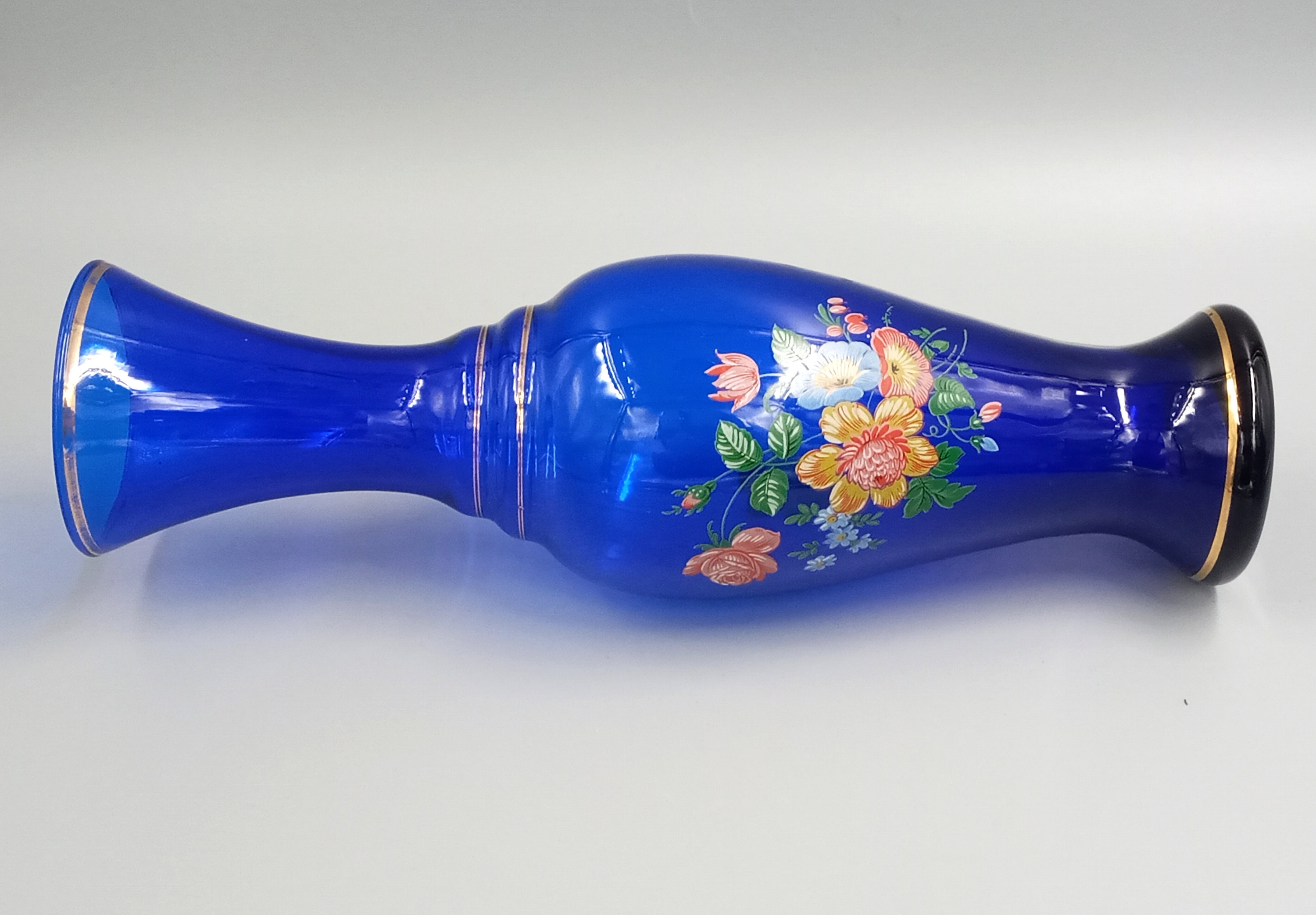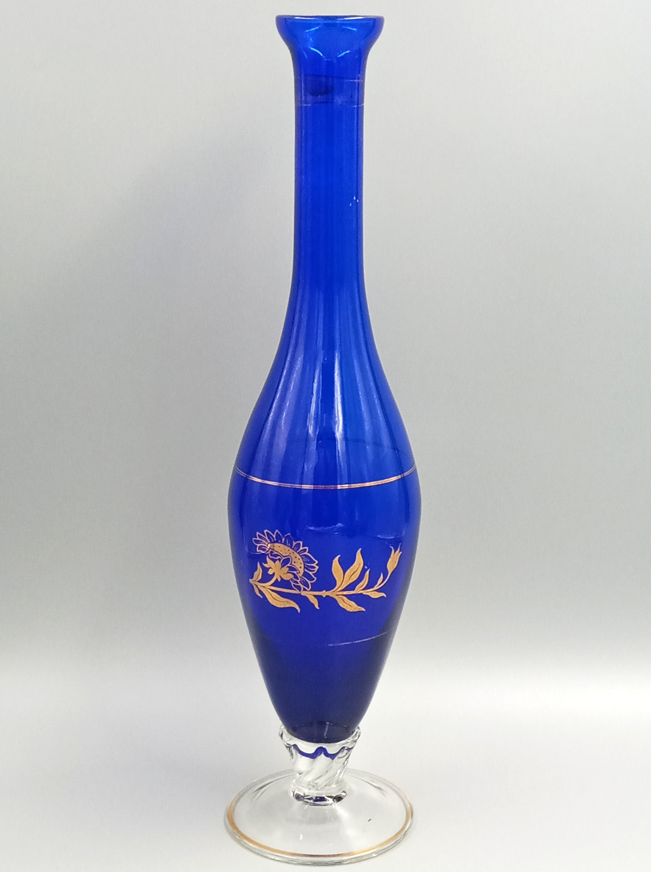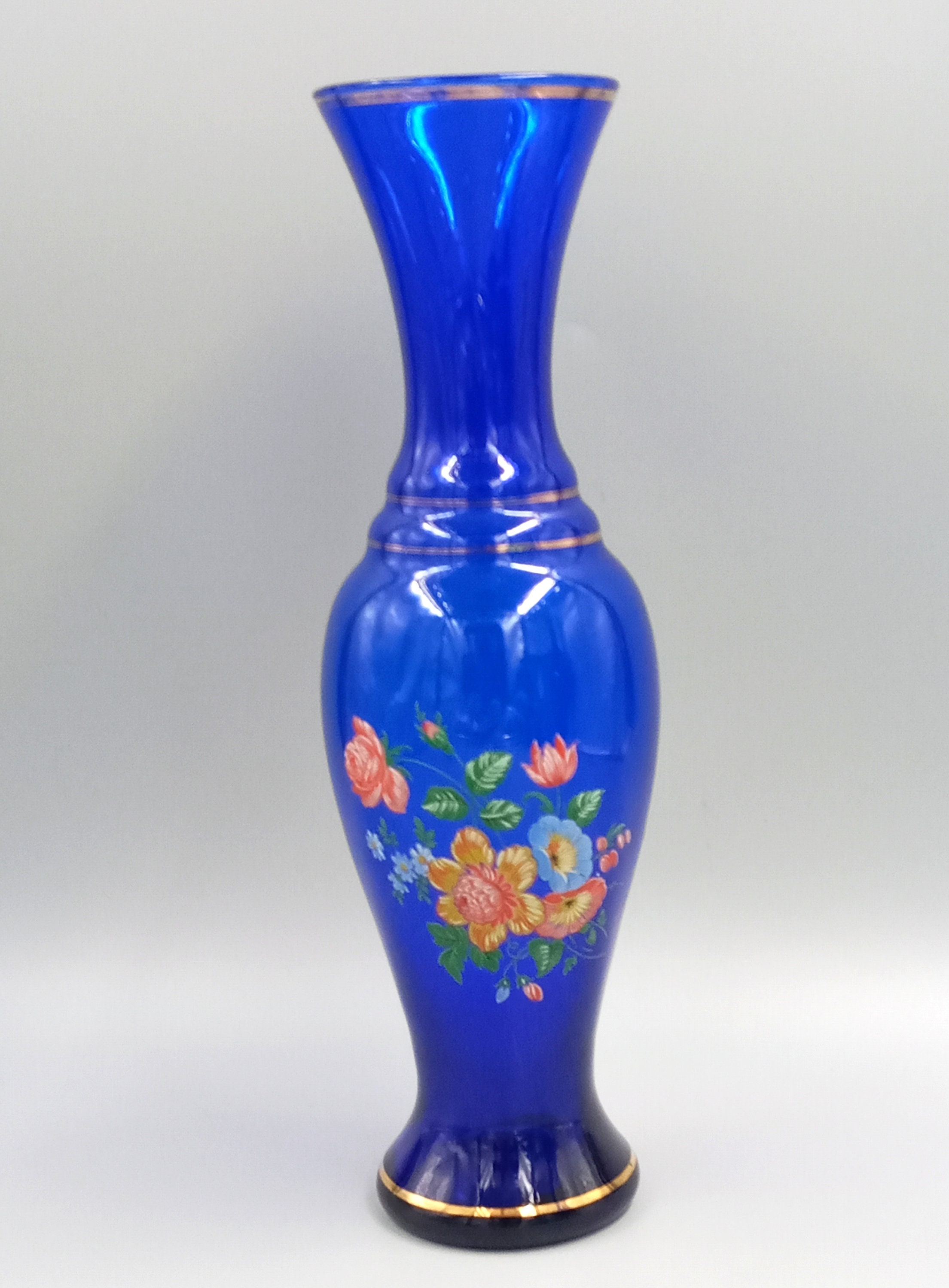 Two lovely matching vases in an intense cobalt blue color. The smaller one has a colorful floral pattern on the front, the larger one has a gold floral pattern.