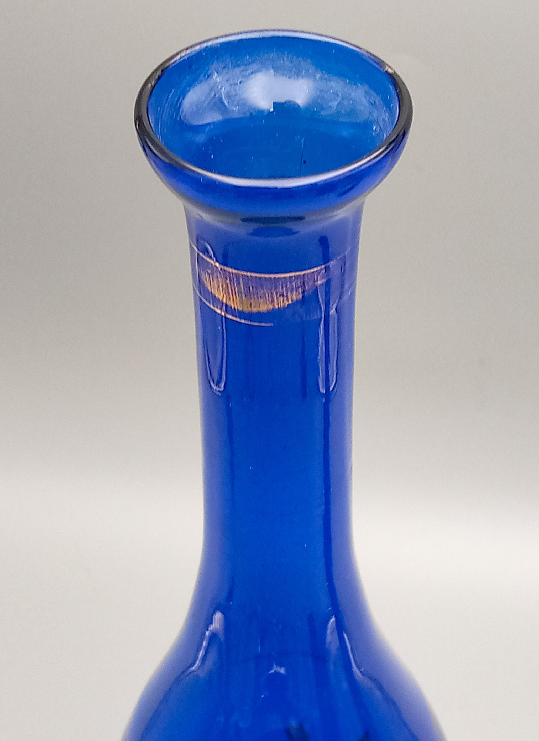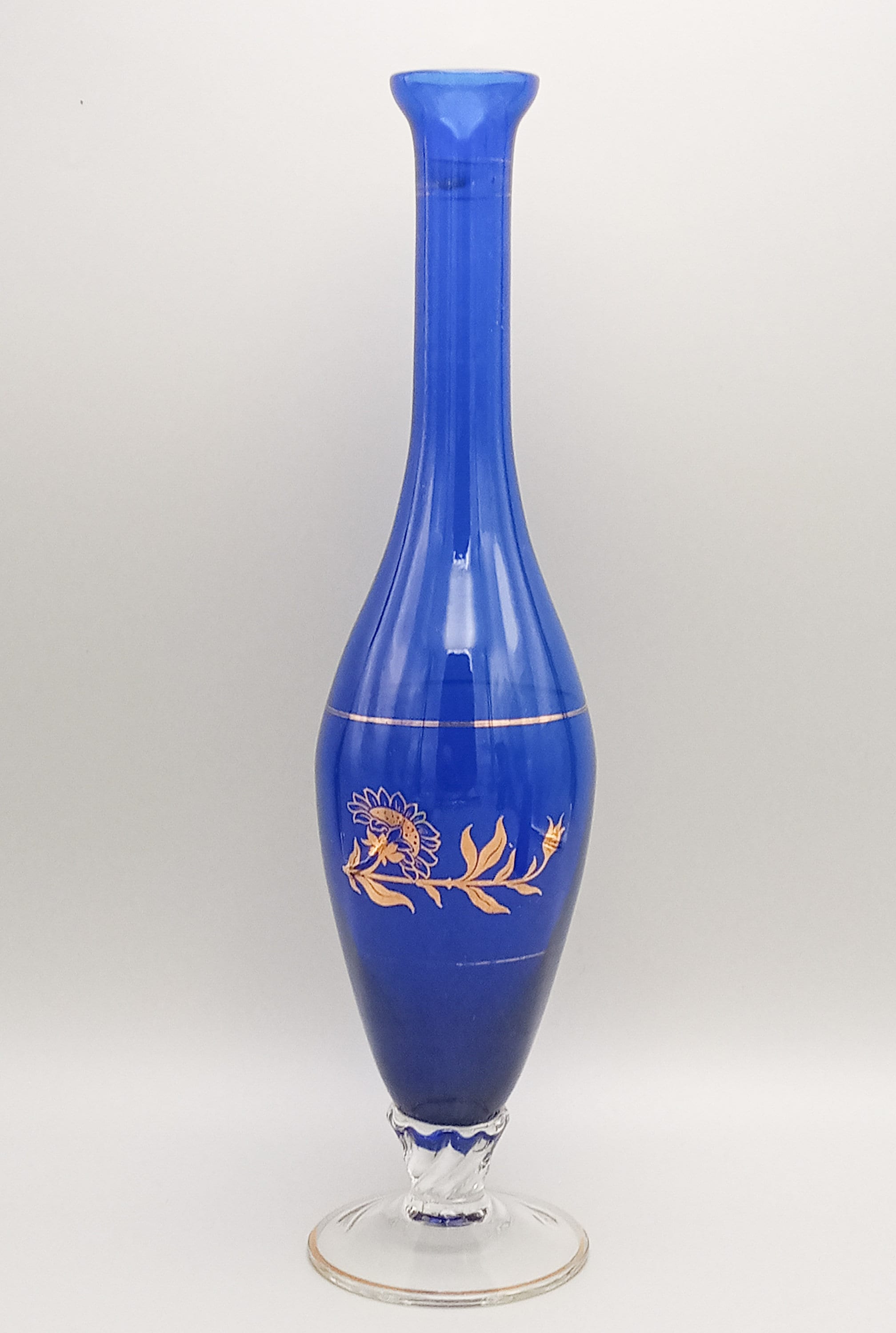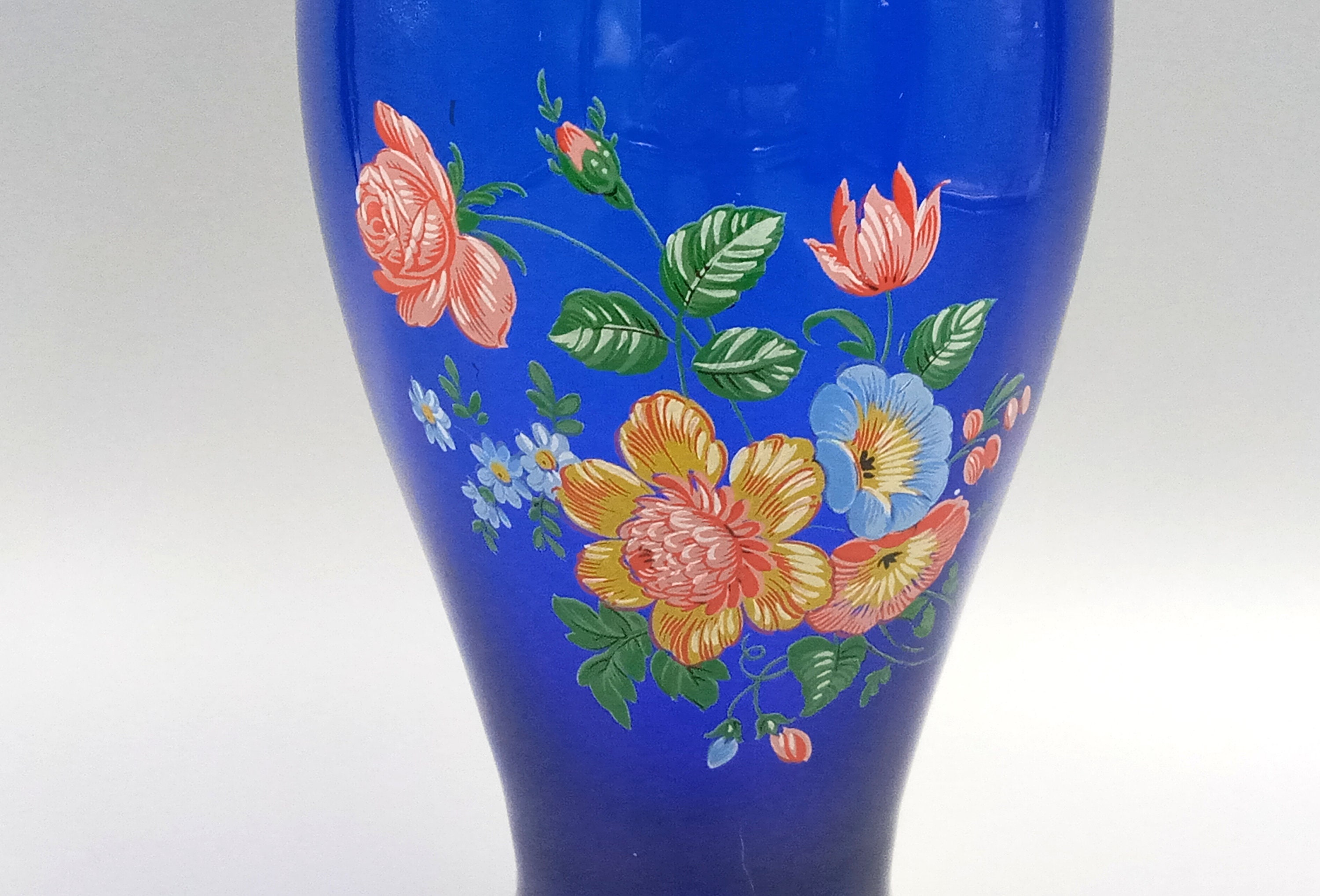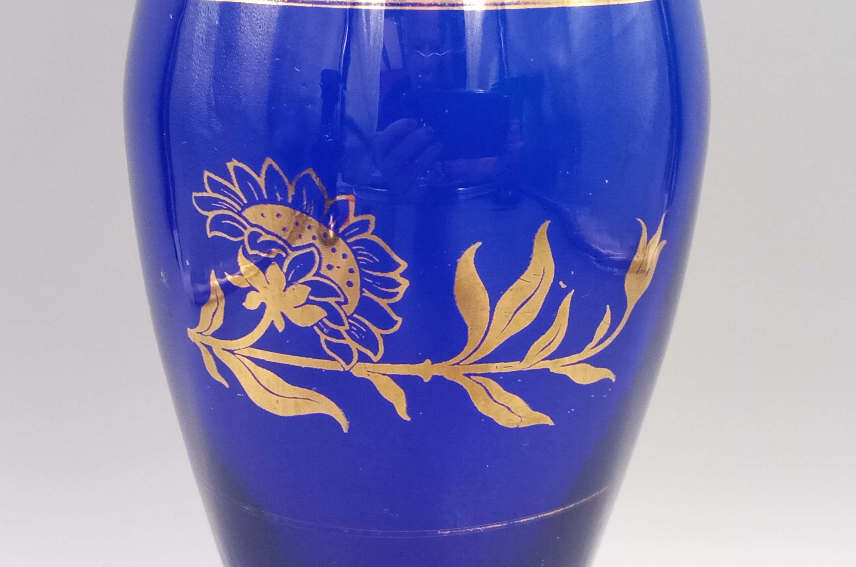 Two lovely matching vases in an intense cobalt blue color. The smaller one has a colorful floral pattern on the front, the larger one has a gold floral pattern.