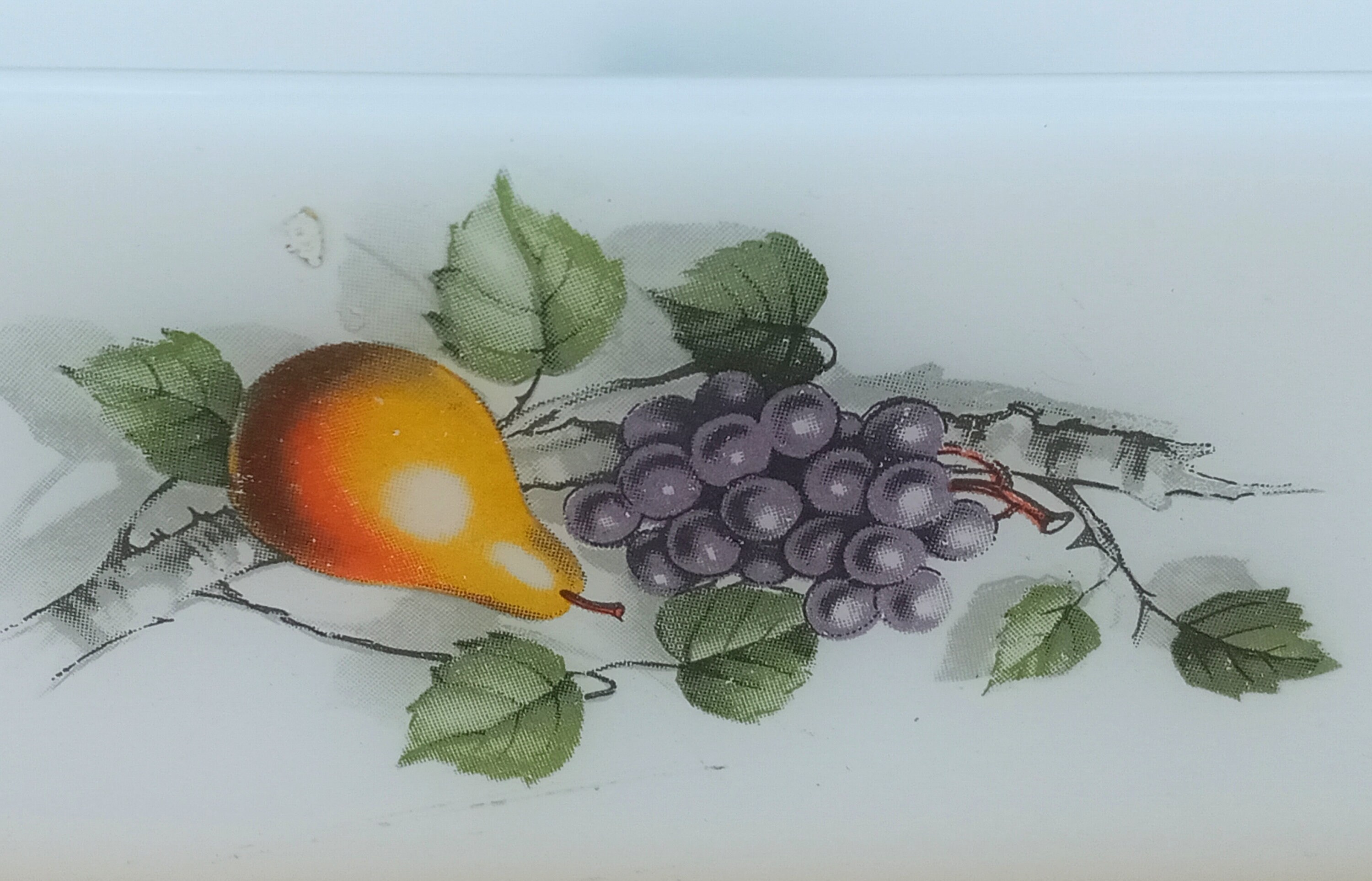 They are in good condition; the first one (Fruits of France) features a pear and grapes on a branch, while the second depicts a white flower on foliage. The same motif appears on both the front and back.