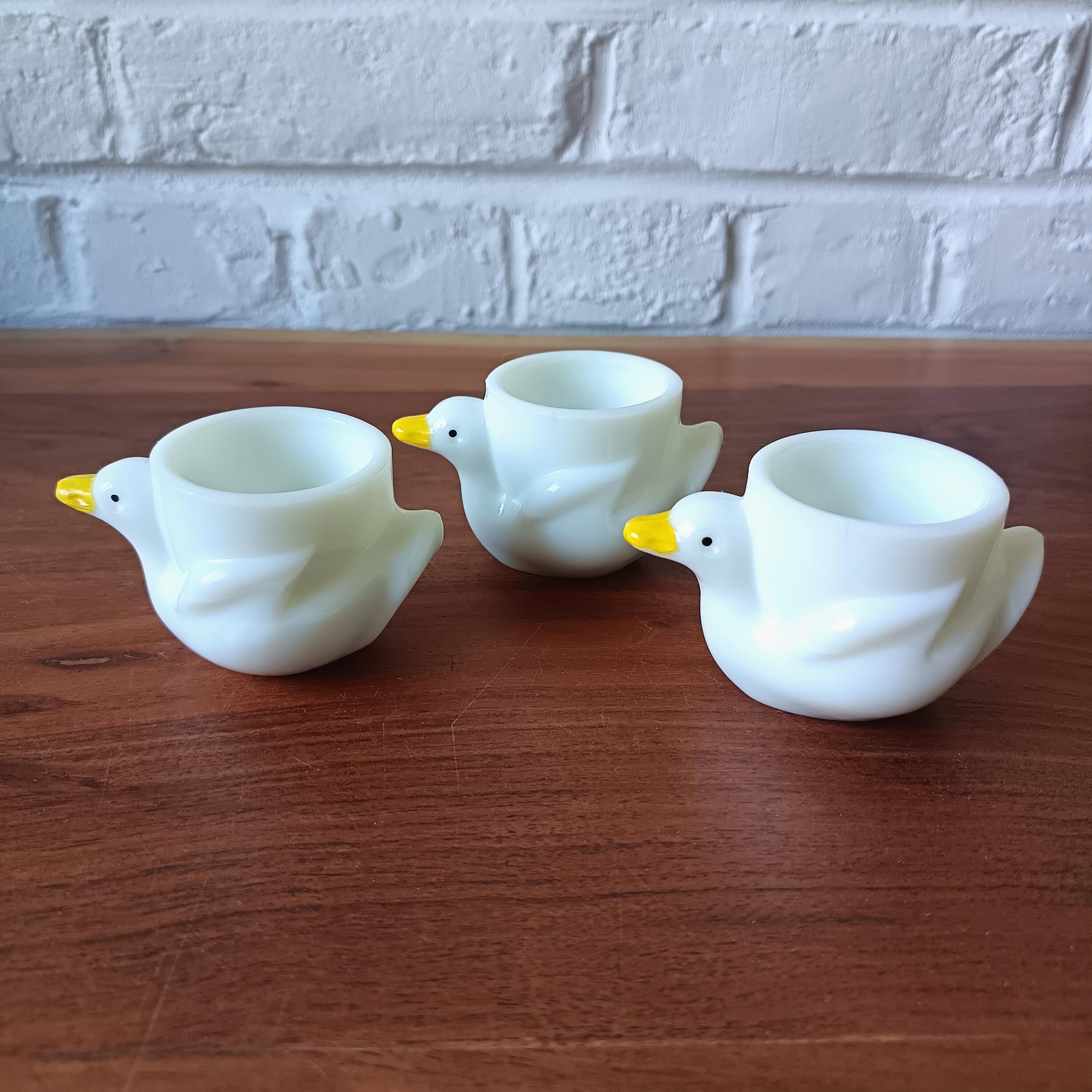 These 3 pretty white opaline egg cups are shaped like little ducks.