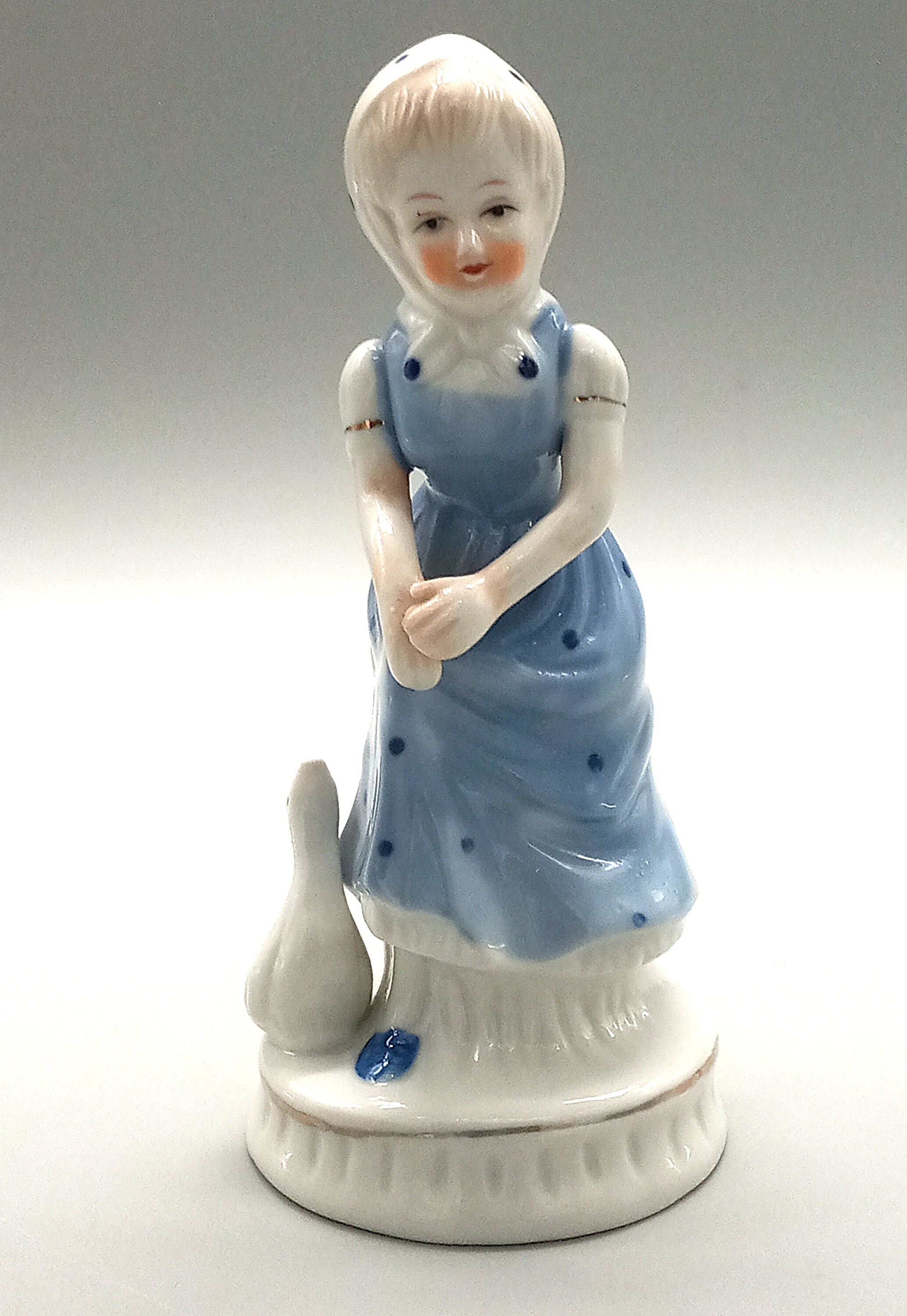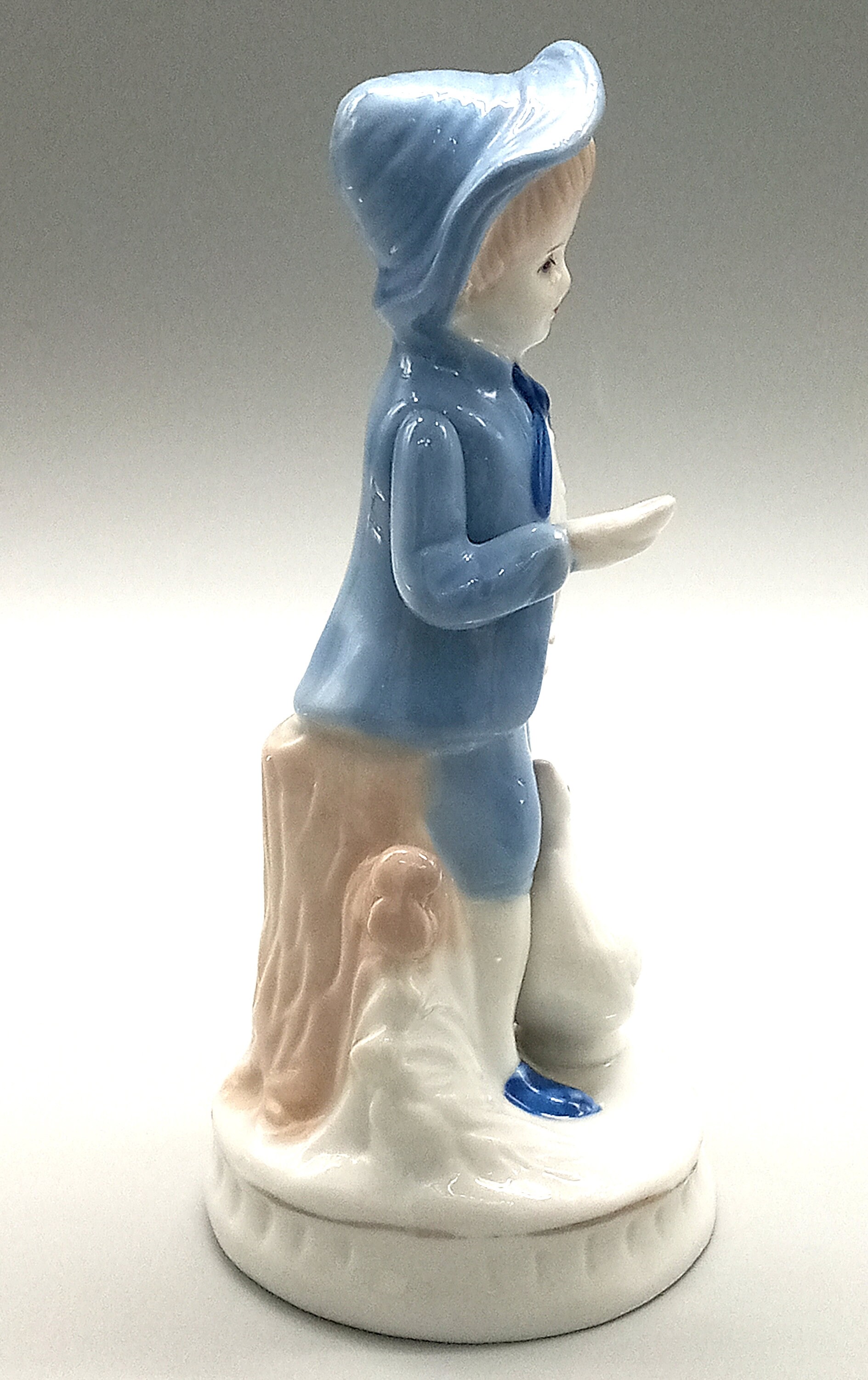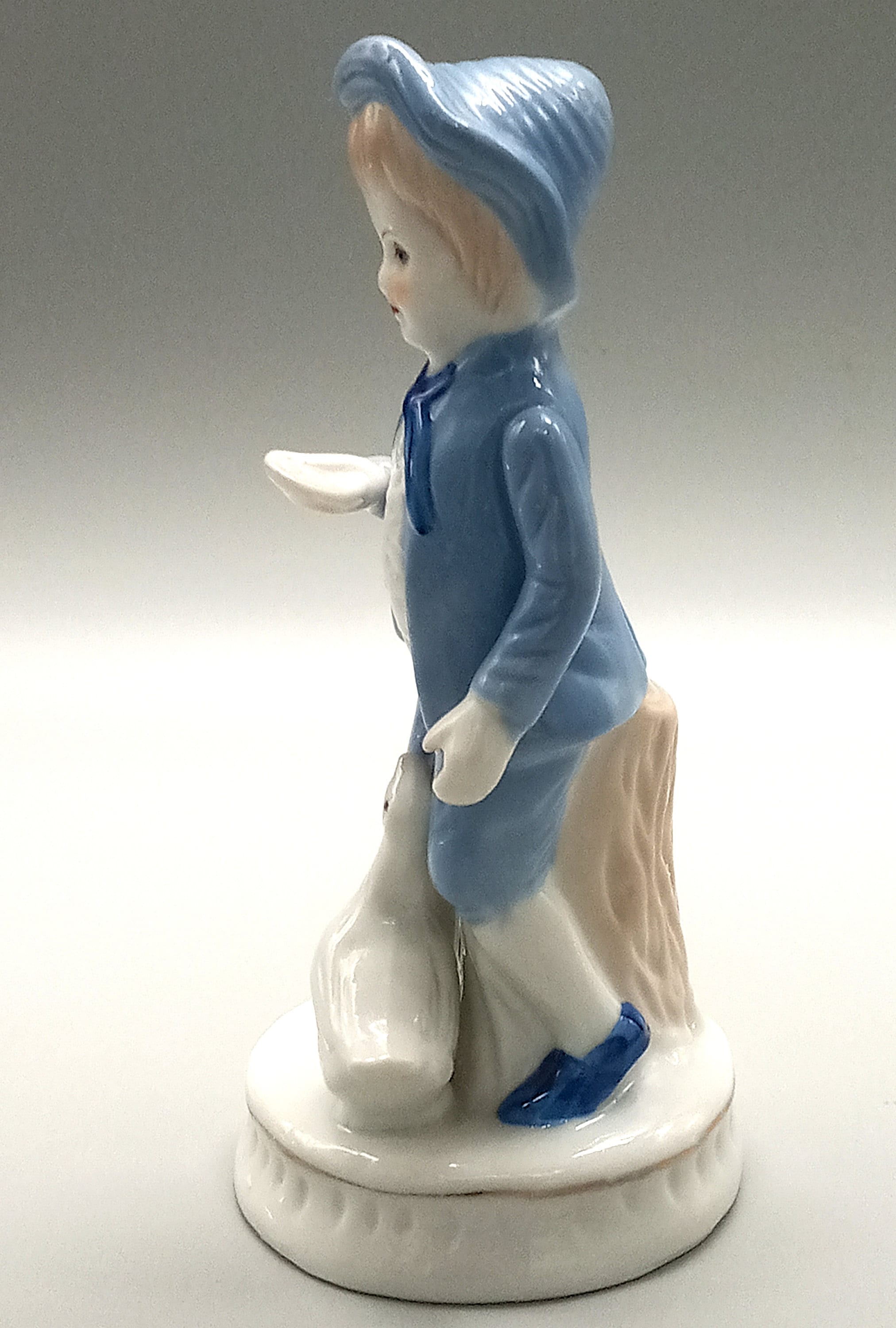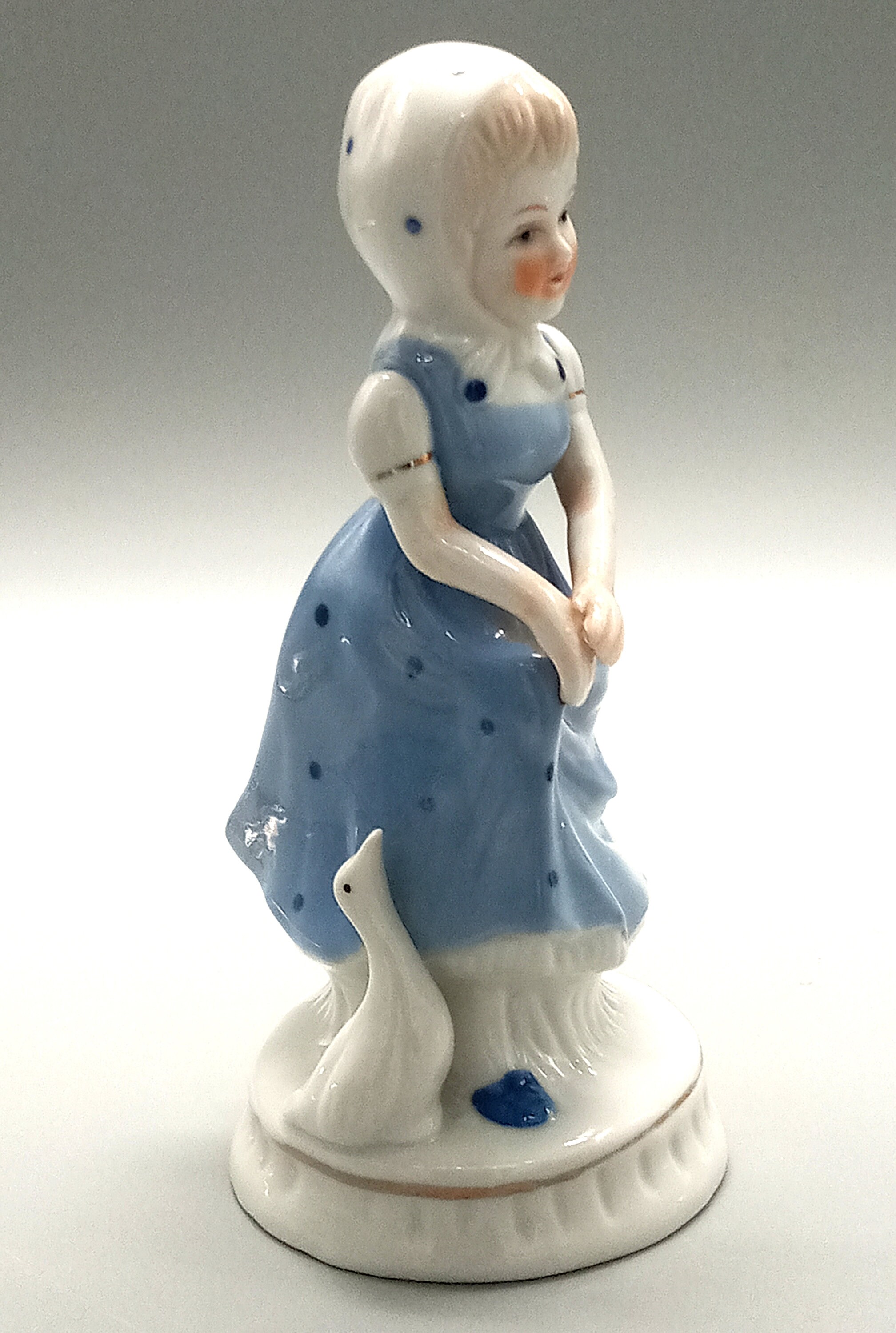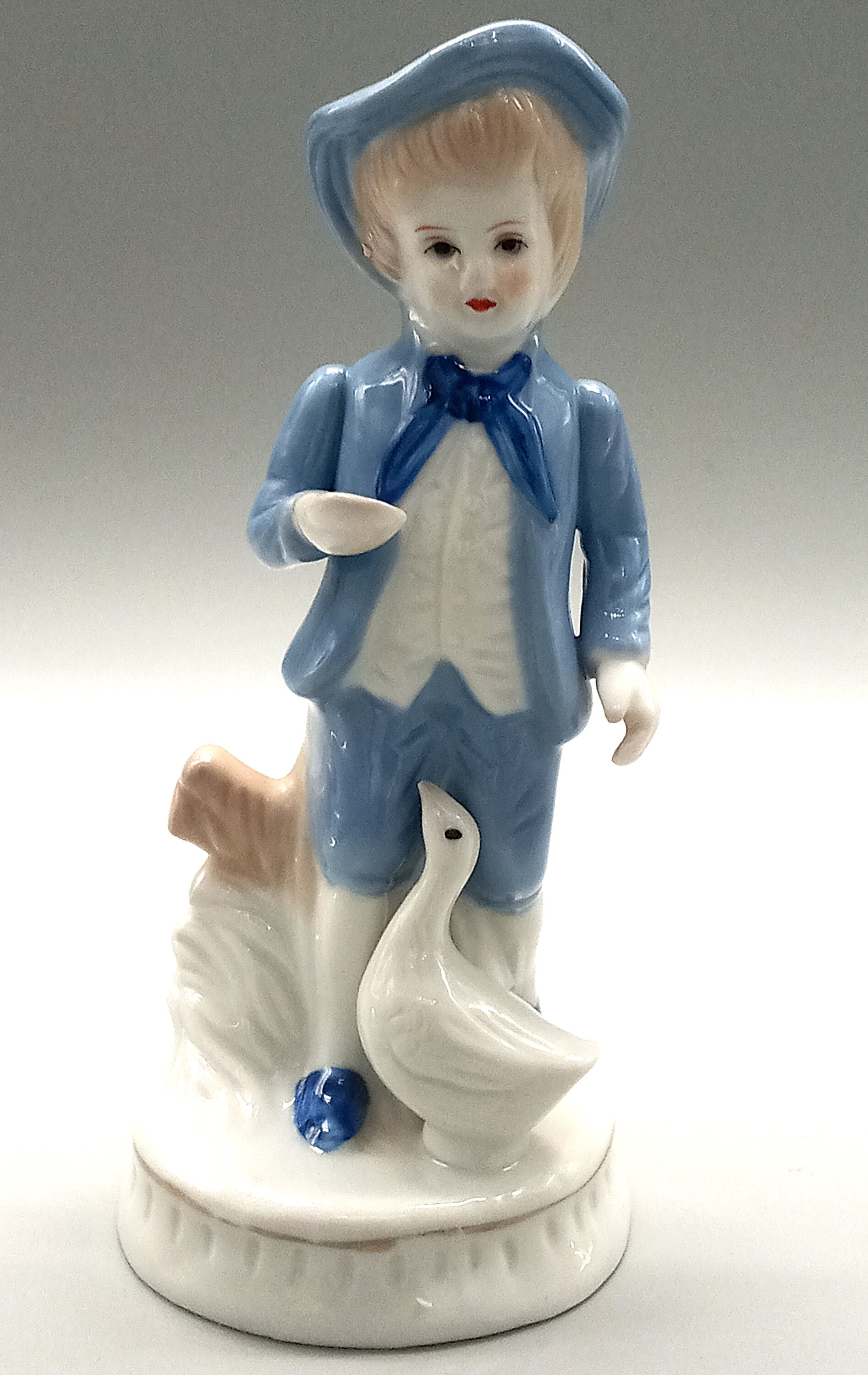 Young cute girl dressed in a pretty little blue dress with polka dots and wearing a white scarf with blue polka dots. The boy is wearing a little white and blue suit with short pants, he is holding a small cup in his hand. They are both accompanied by a goose.