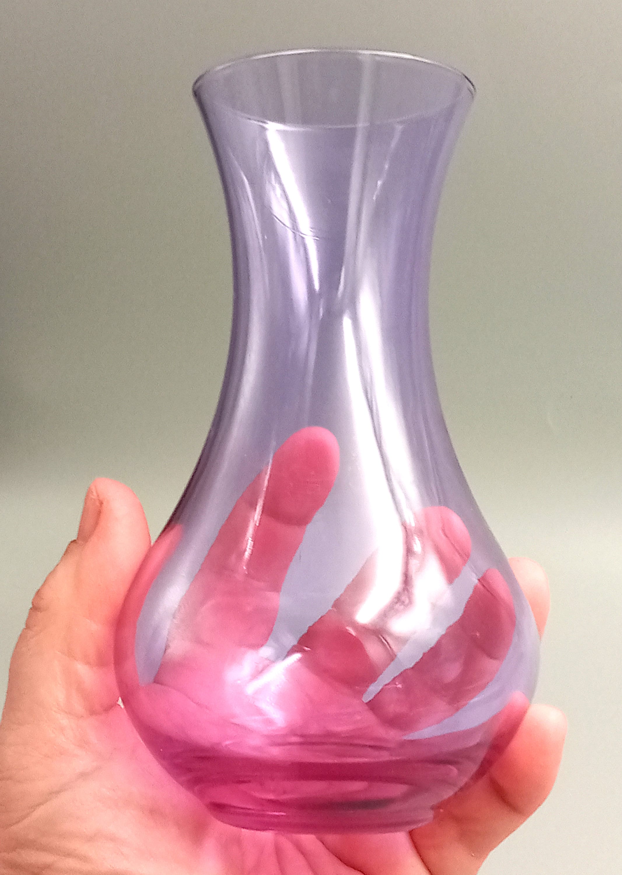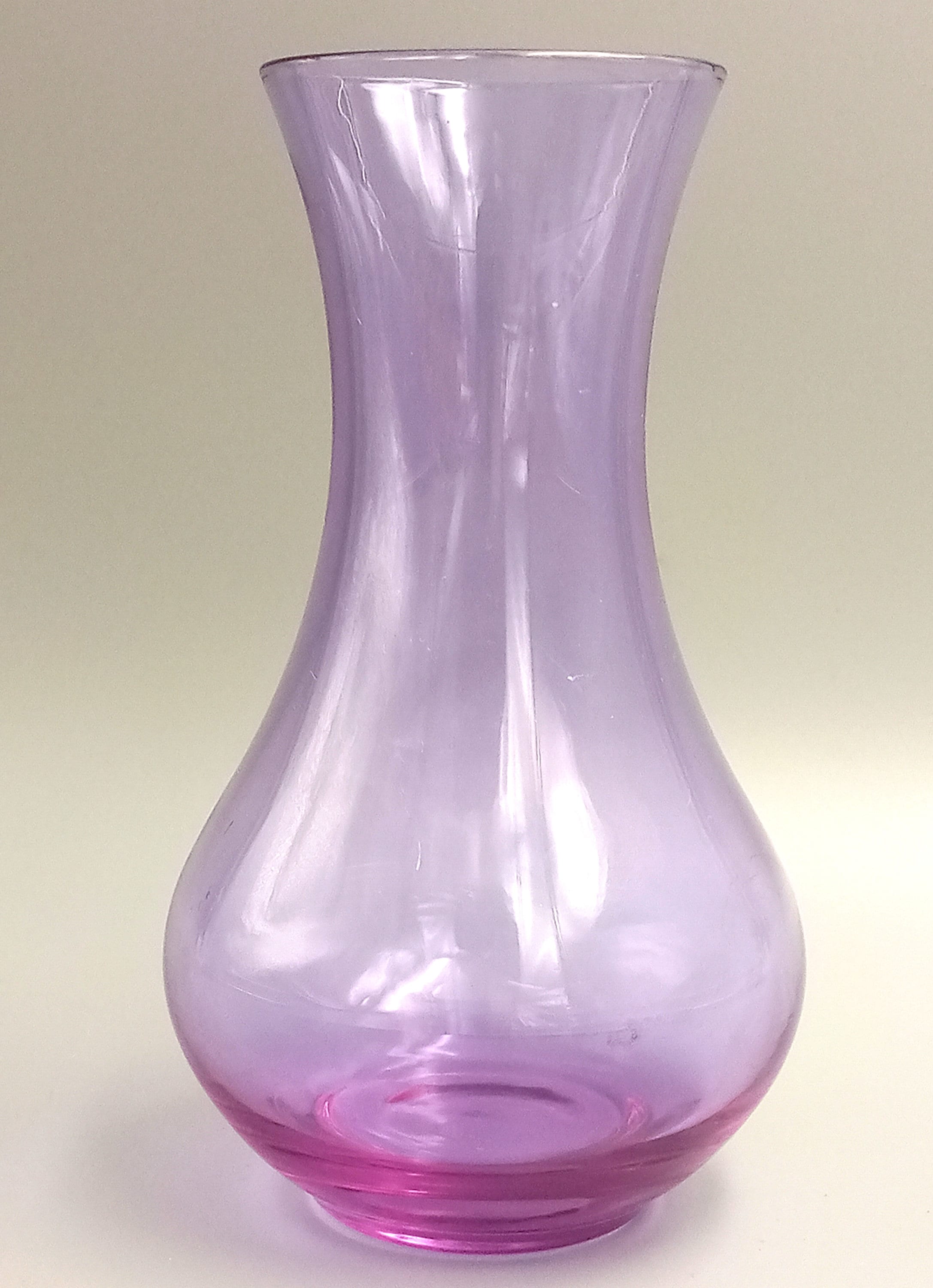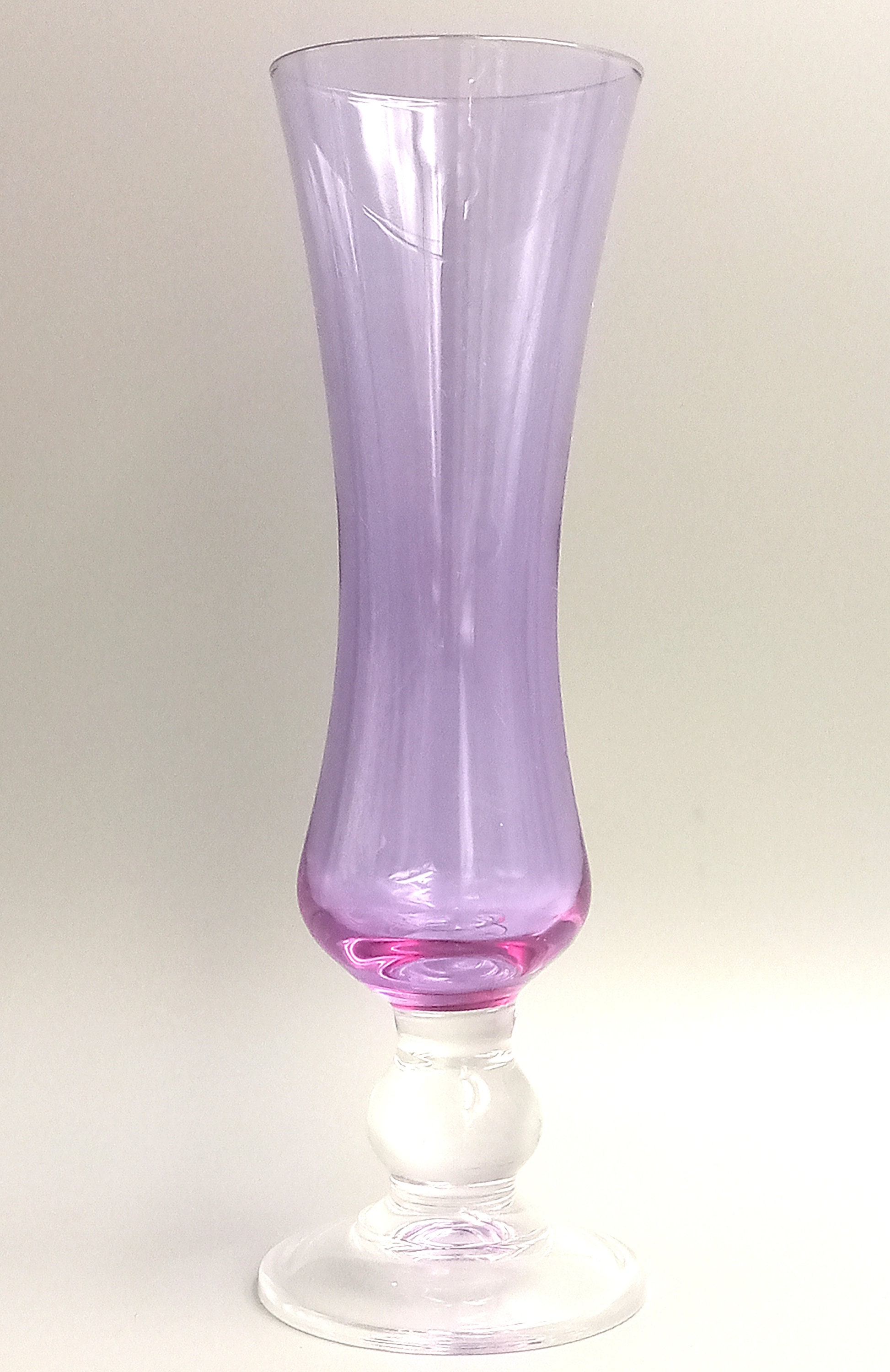 A pair of crystal vases from Arques, in a very pretty amethyst color. The first has a transparent base topped with a solid glass sphere, the second has a lower shape; they coordinate perfectly.