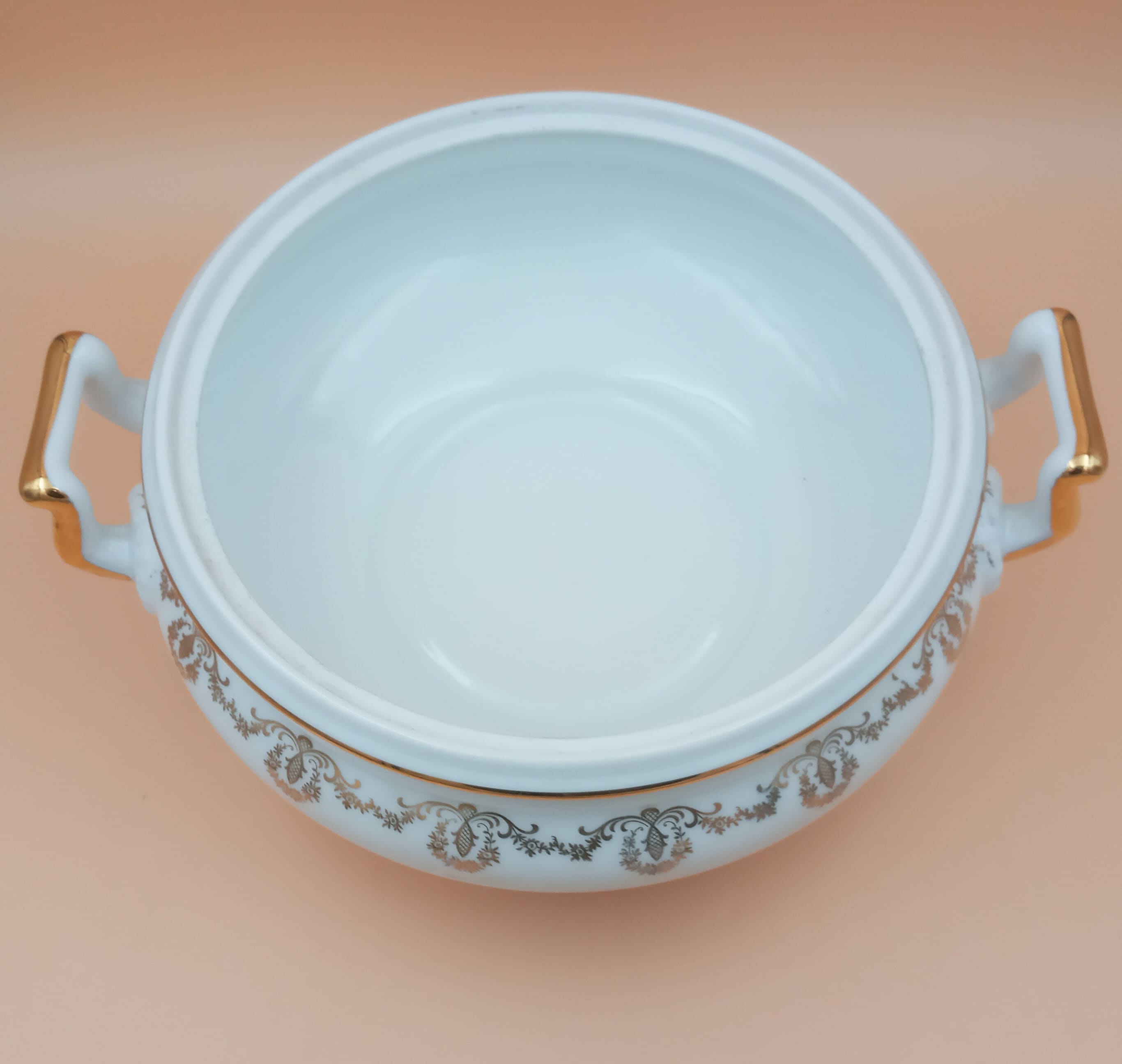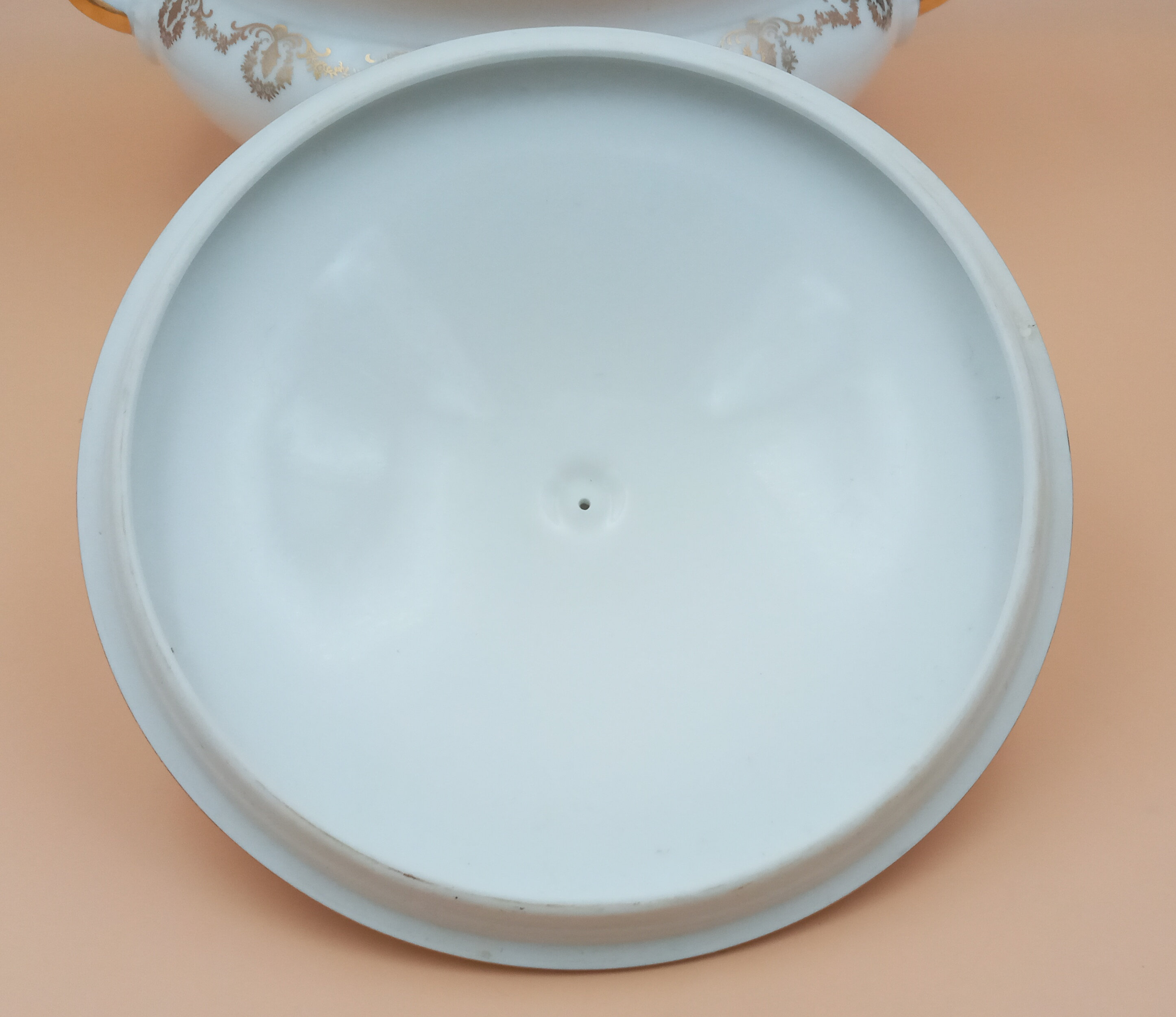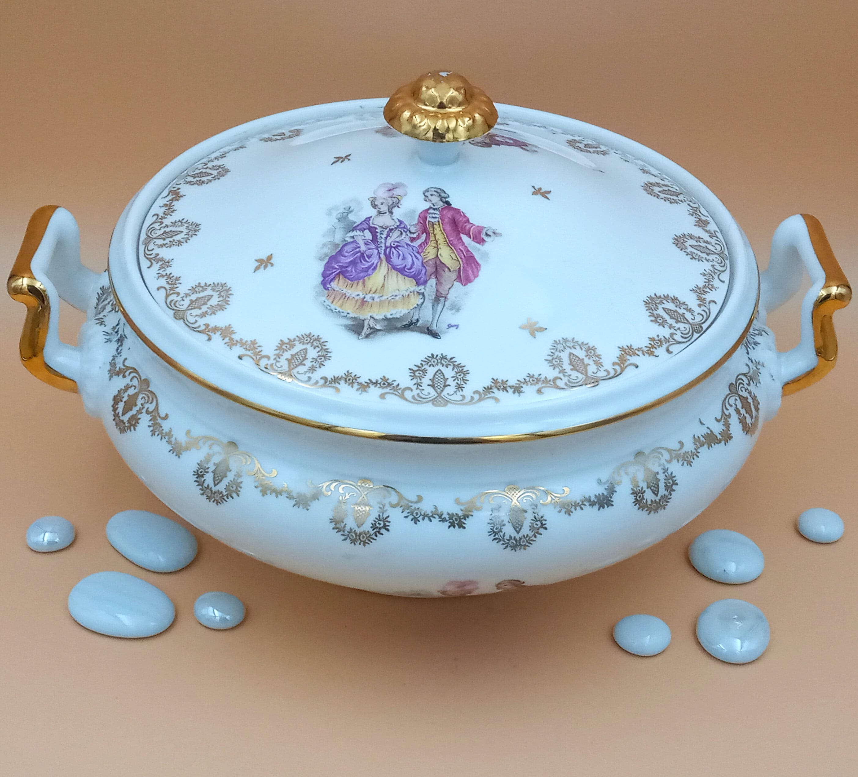 Very pretty soup tureen with a pretty golden frieze on the top of the body of the soup tureen and on the lid. 2 small gallant scenes decorate the lid and the bowl. It will do wonders on your table and will fit perfectly into a shabby chic or romantic country atmosphere.