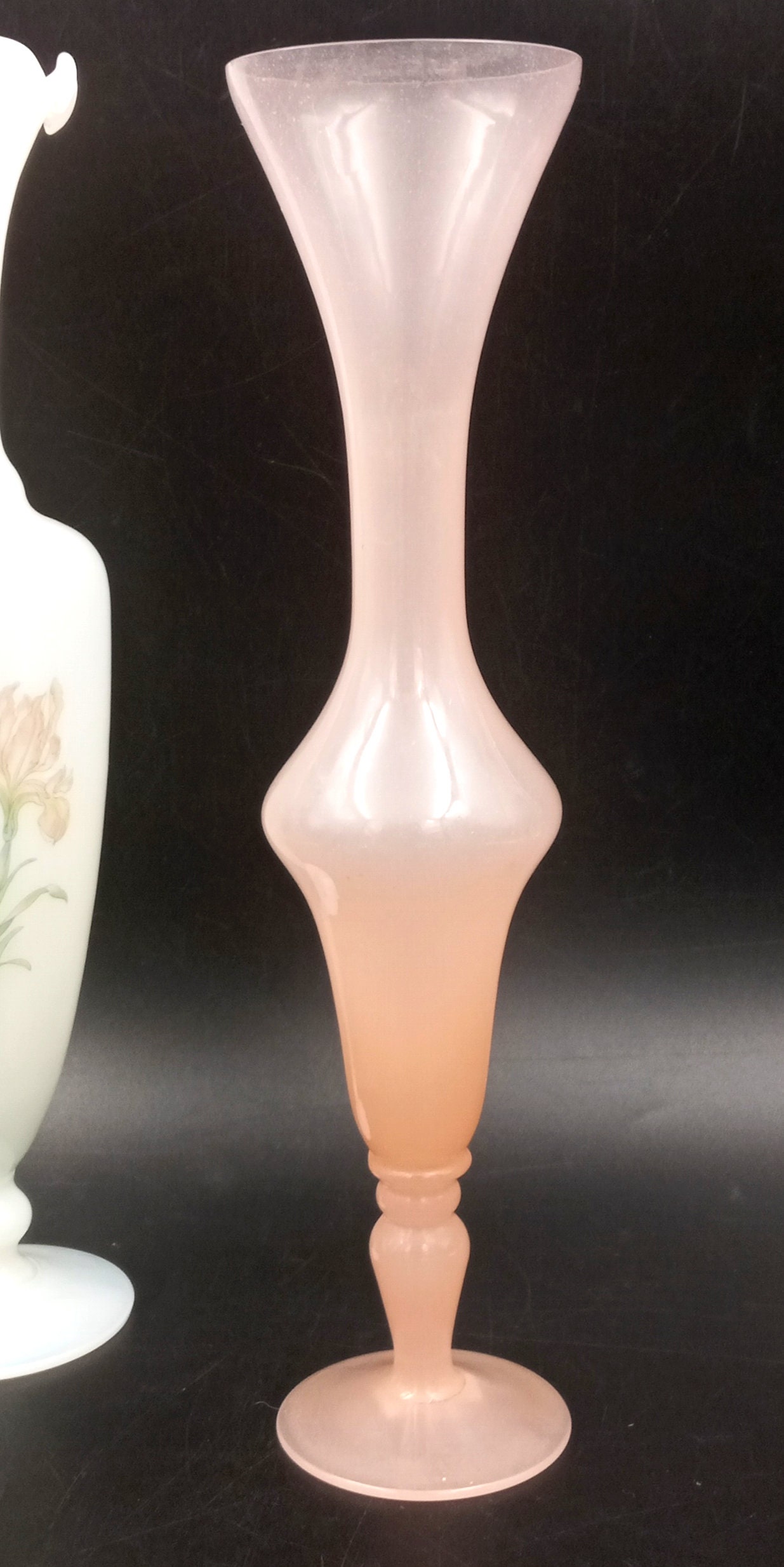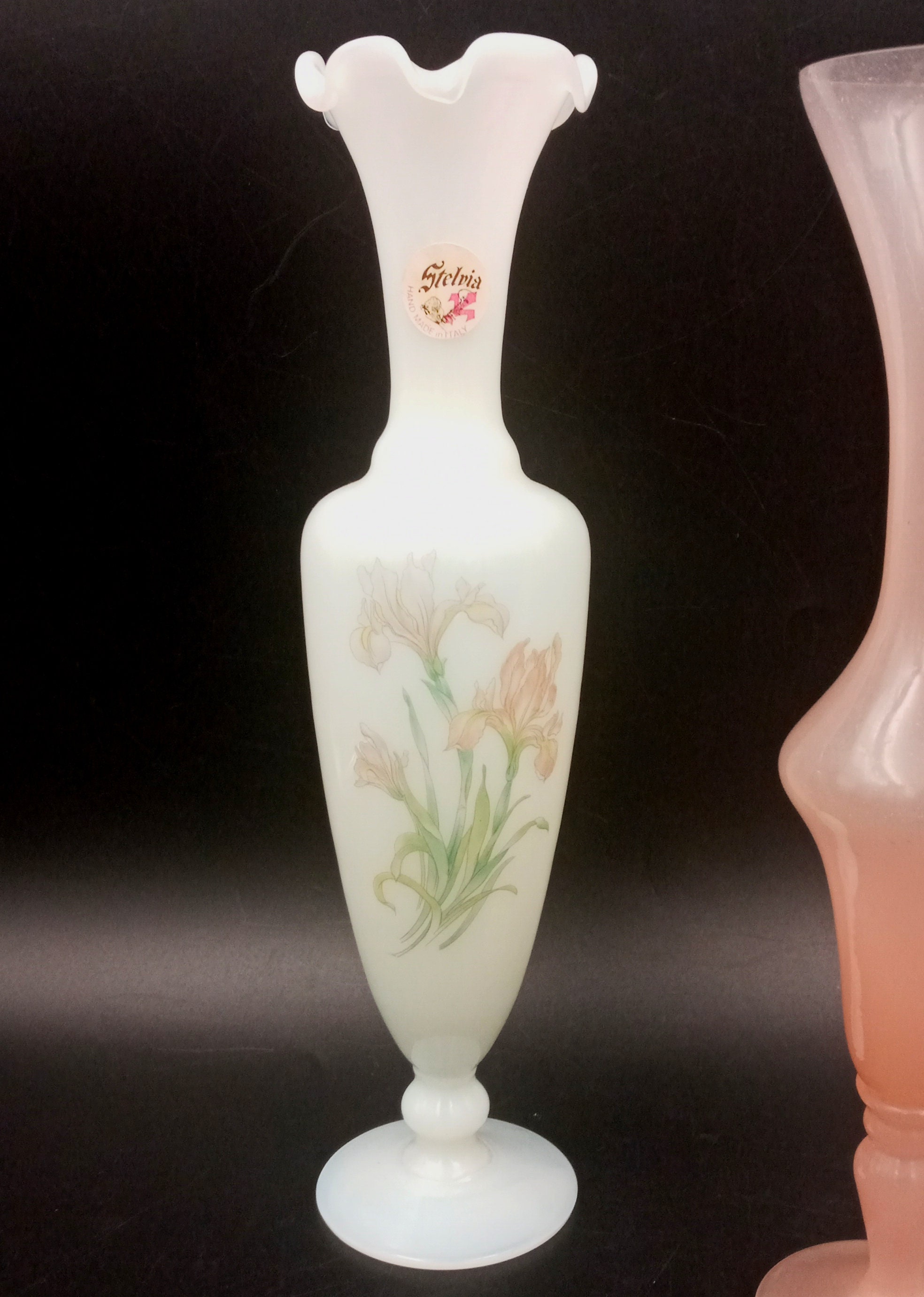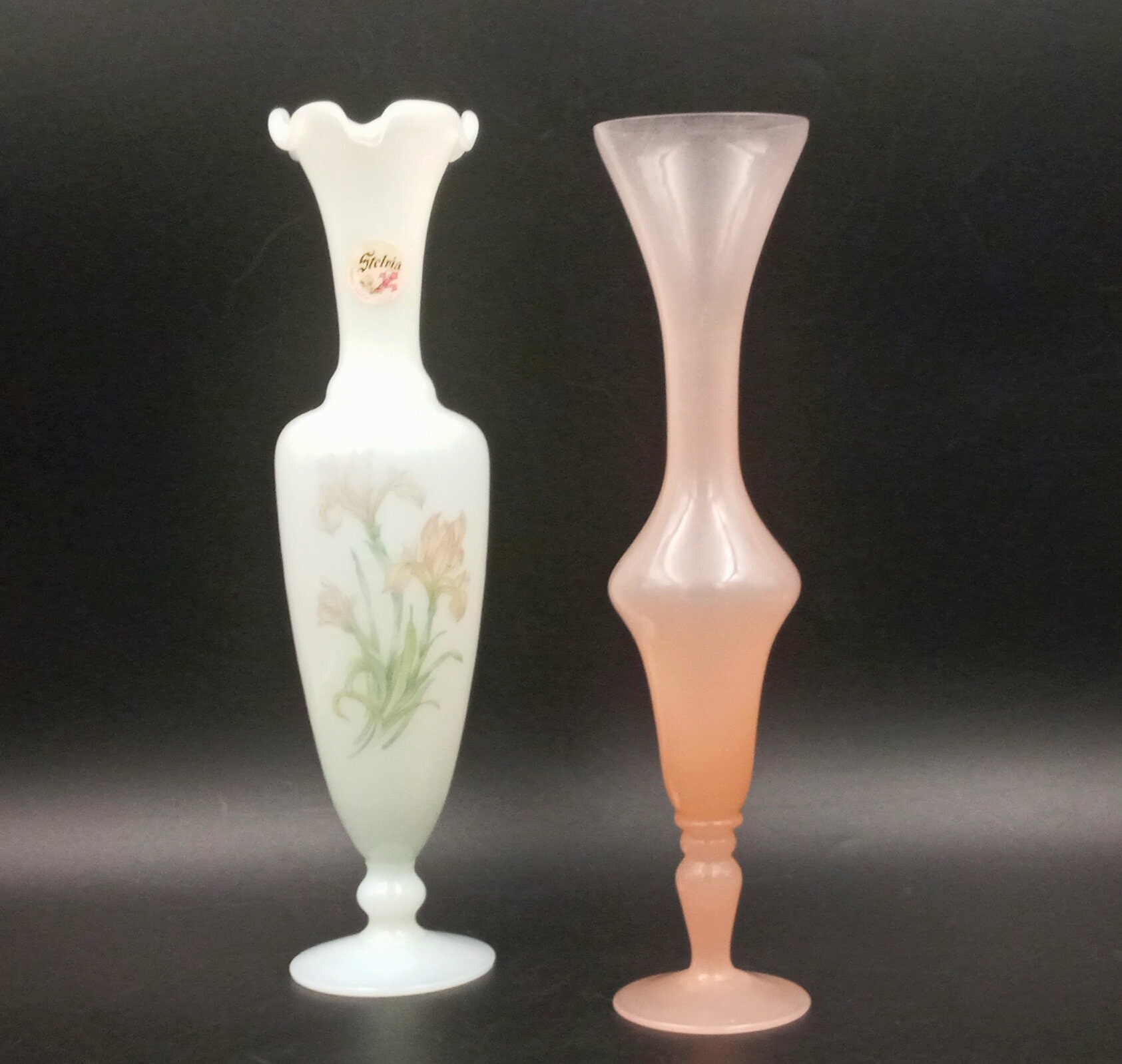 This pair of vases is a beautifully shaped vase made of opaque white glass with a lovely scalloped neck. Its floral motif in soft pink and green hues coordinates perfectly with the second vase, which, also made of opaque pink glass, has a very attractive, slender design.