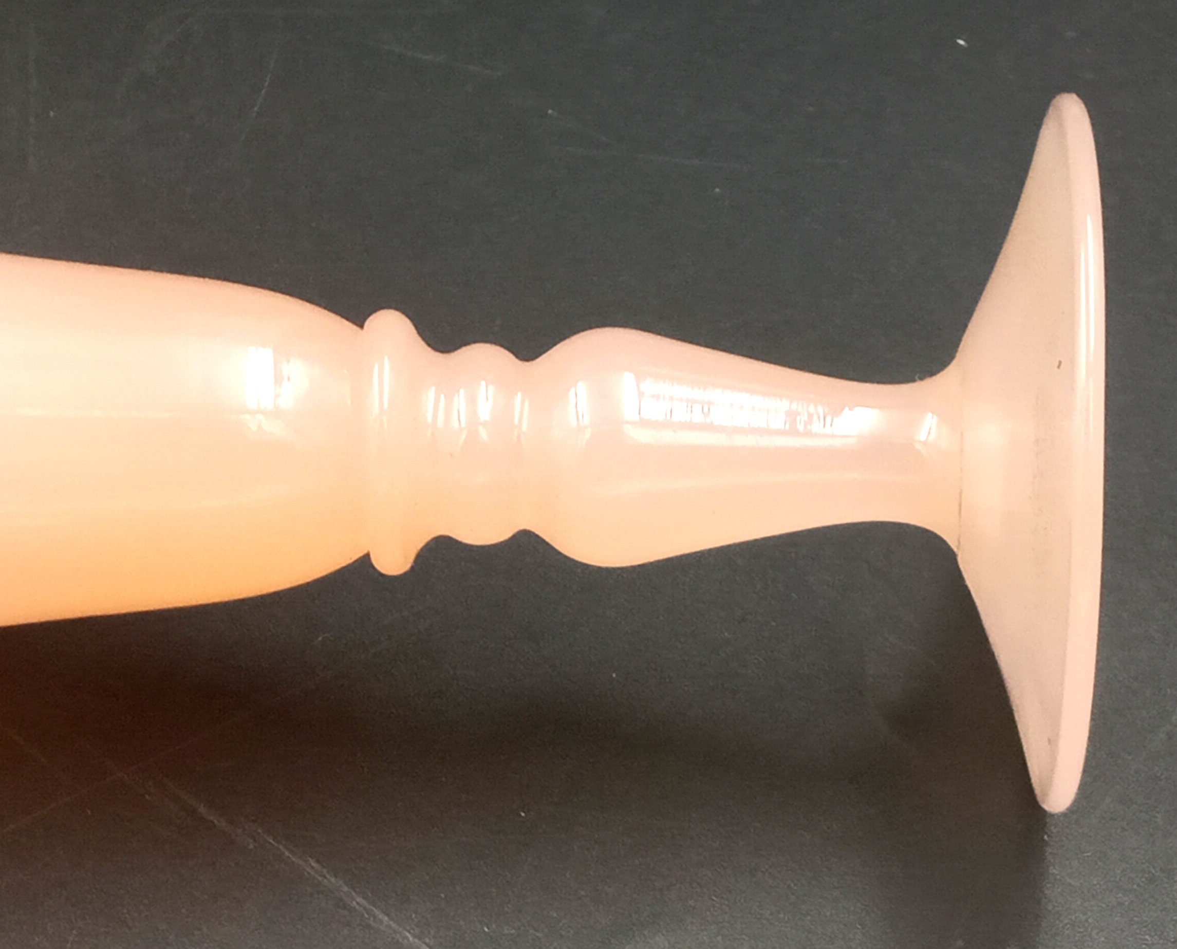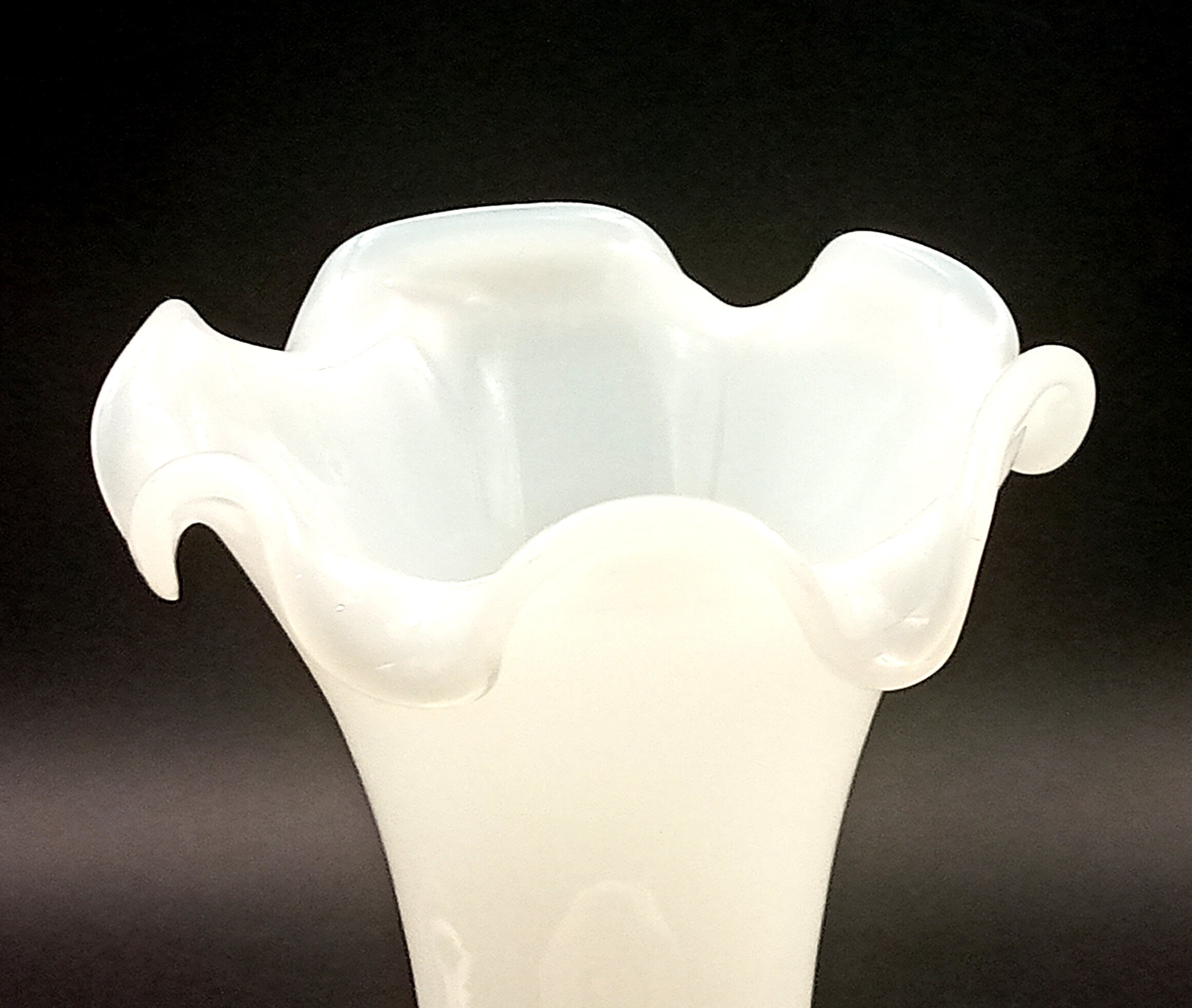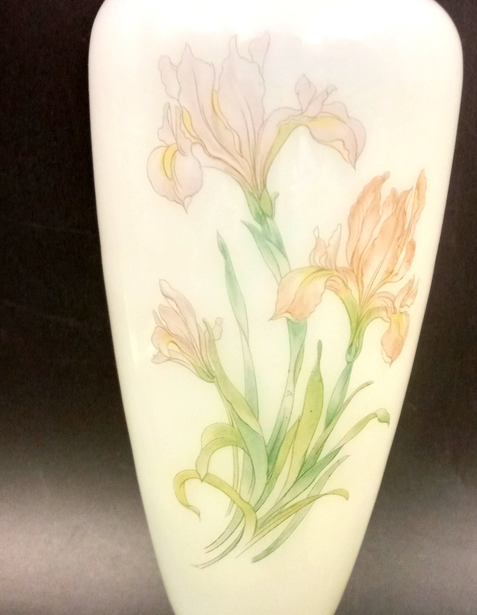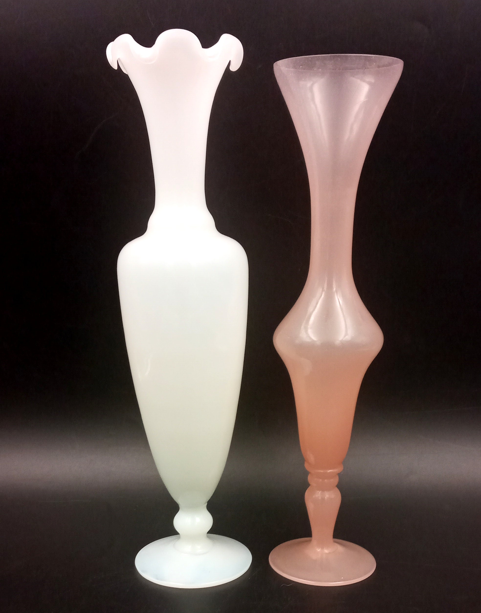 This pair of vases is a beautifully shaped vase made of opaque white glass with a lovely scalloped neck. Its floral motif in soft pink and green hues coordinates perfectly with the second vase, which, also made of opaque pink glass, has a very attractive, slender design.