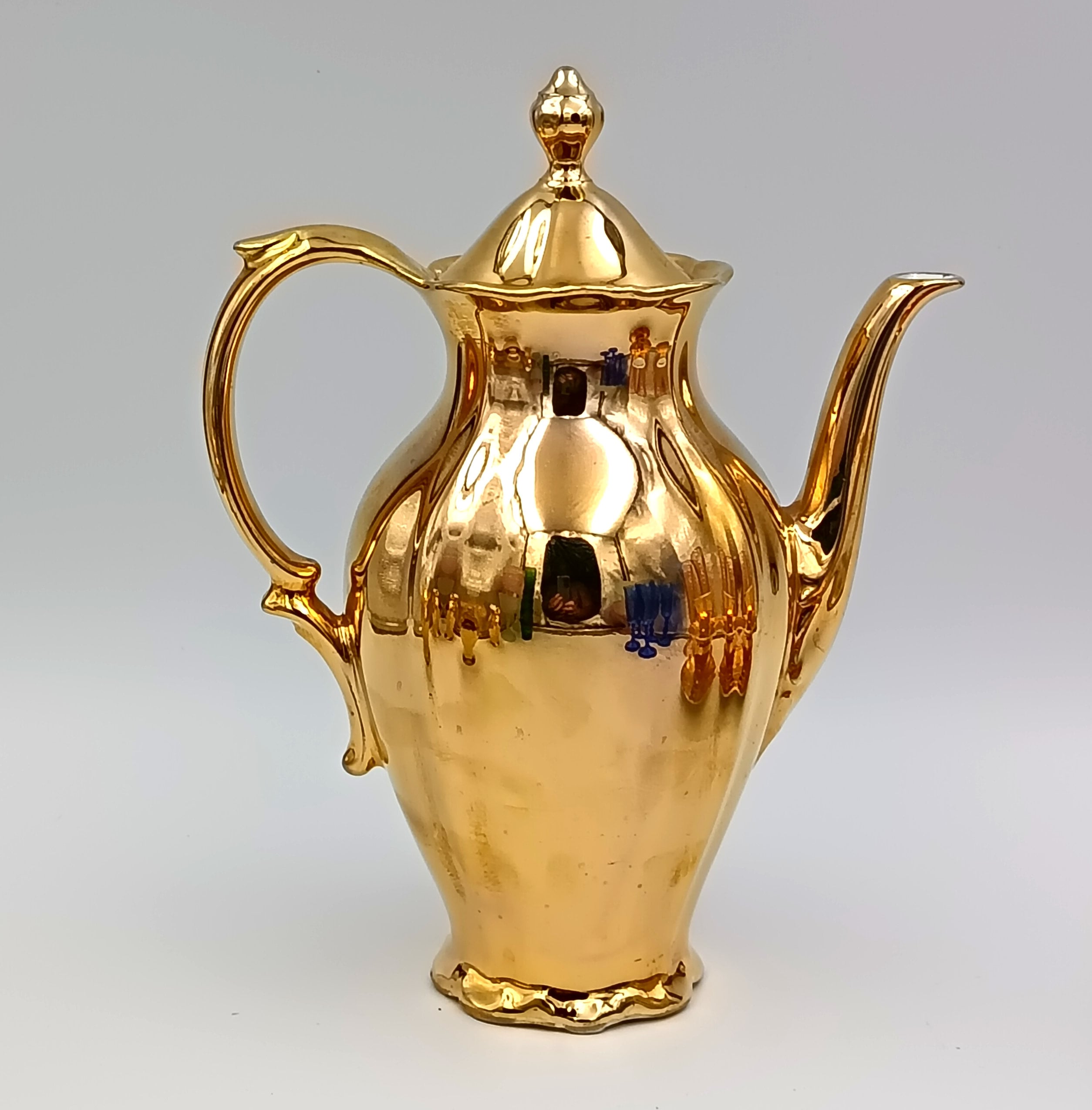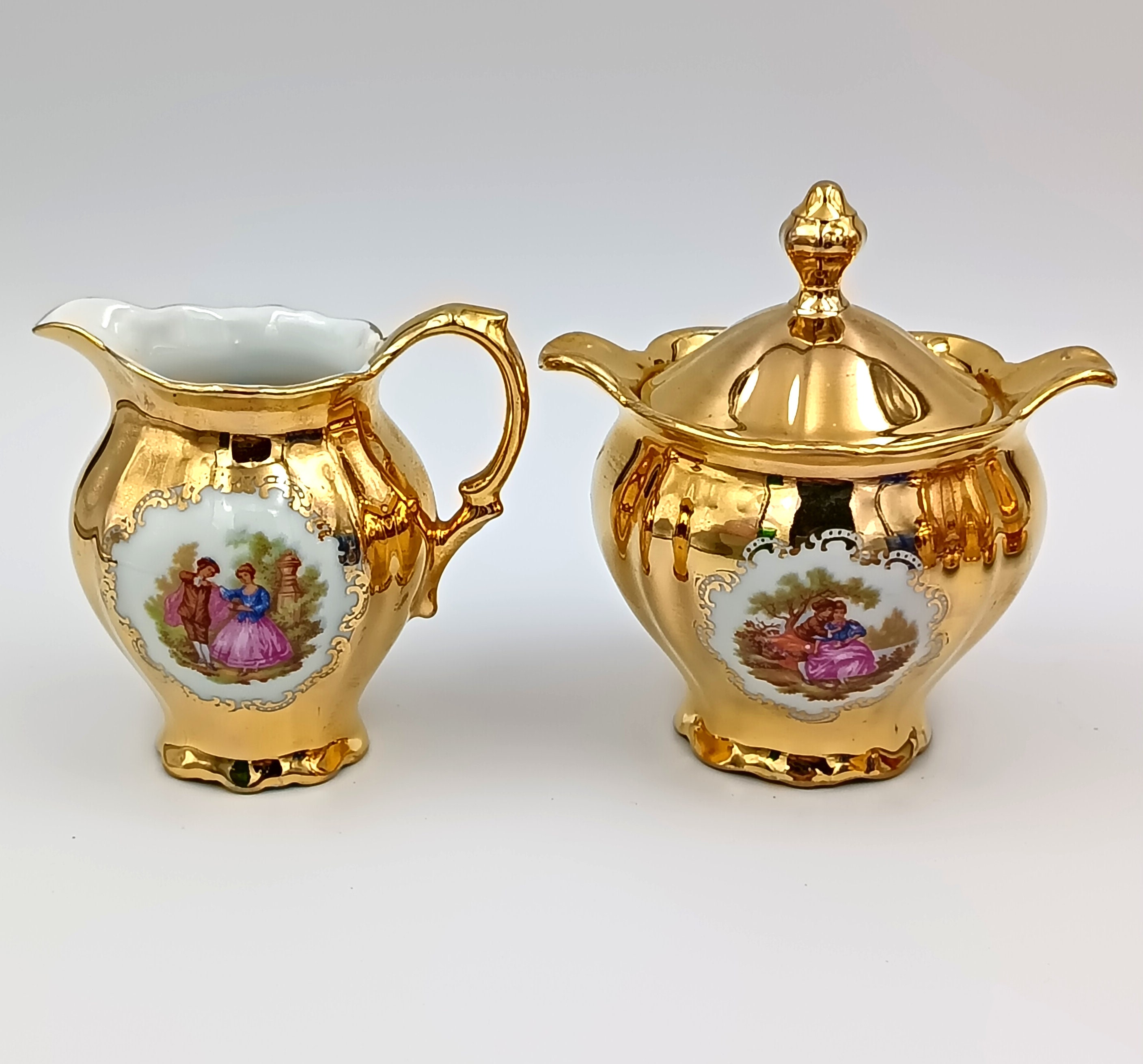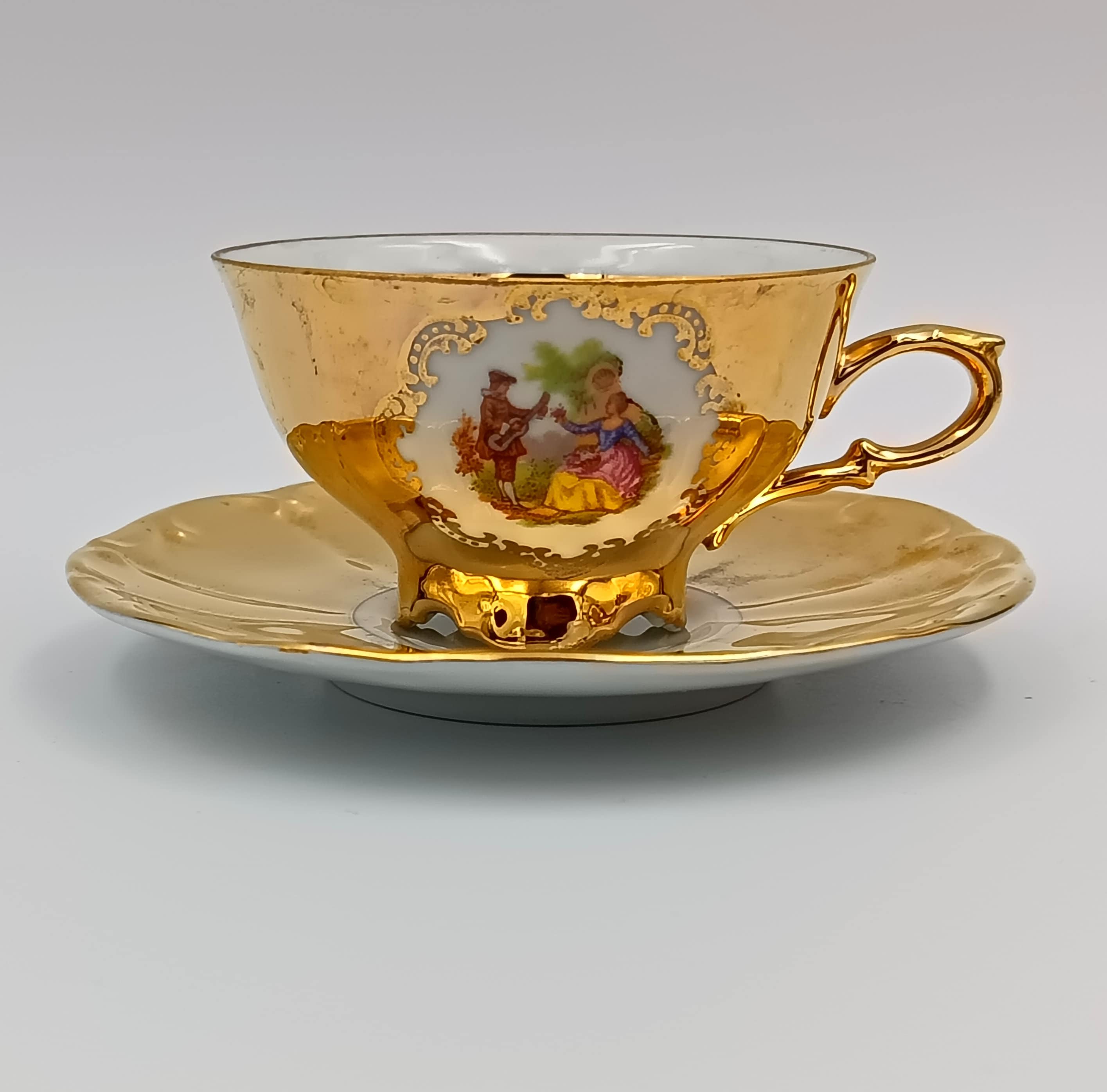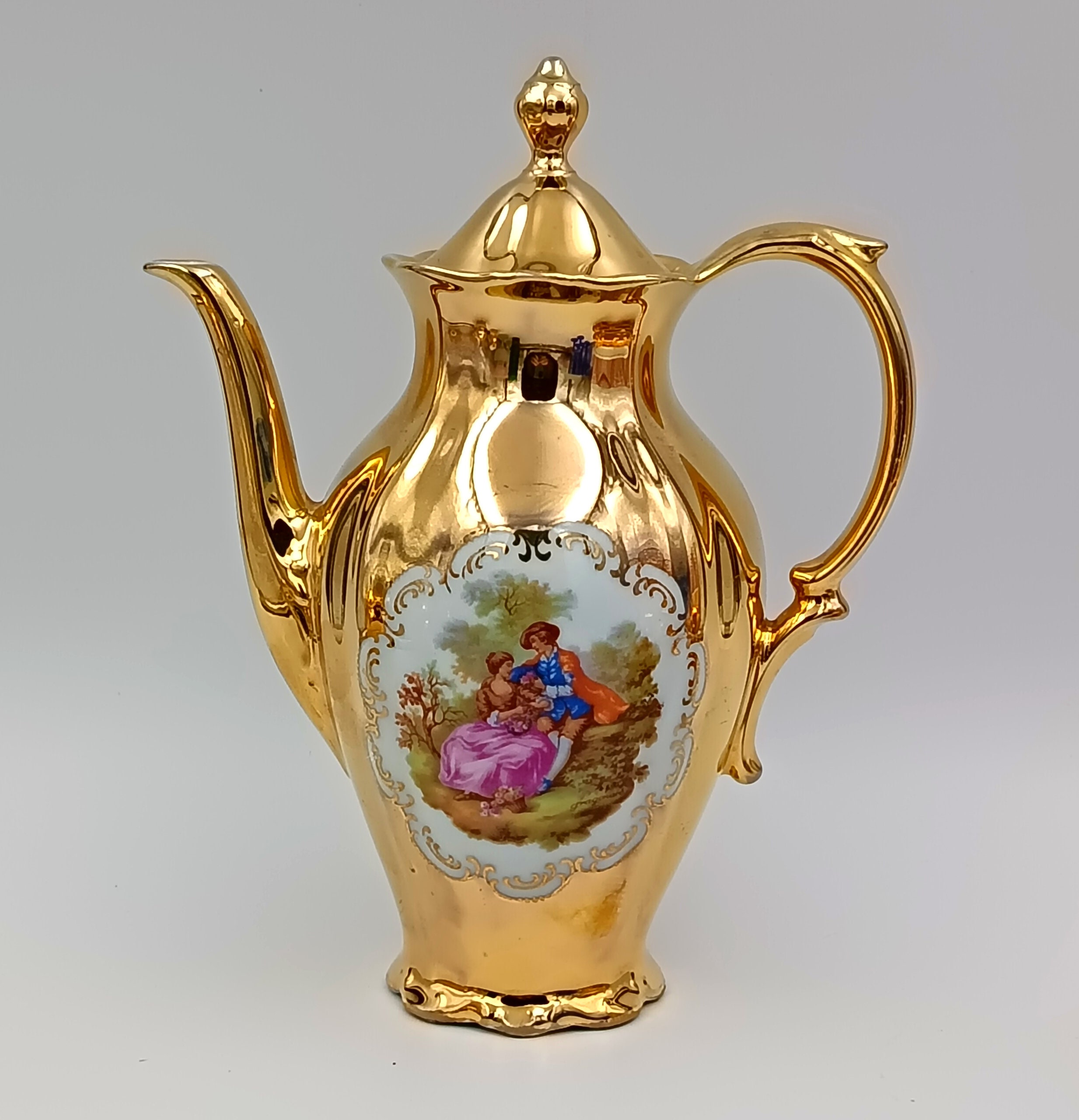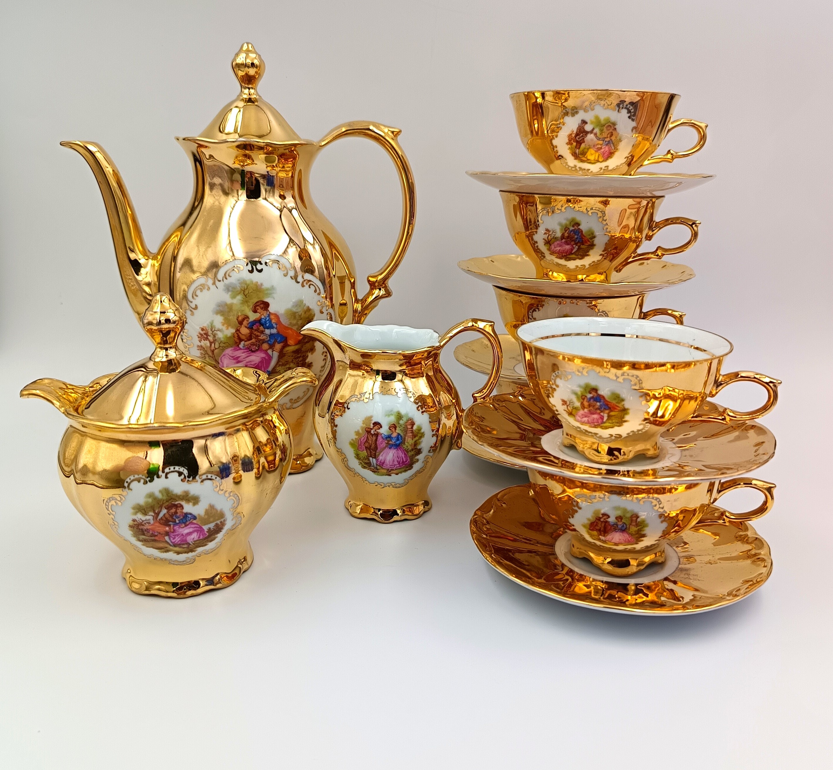Pretty coffee service in gilded Bavarian porcelain, Bareuther, for 6 people, it is decorated with a medallion representing gallant scenes (Fragonard).