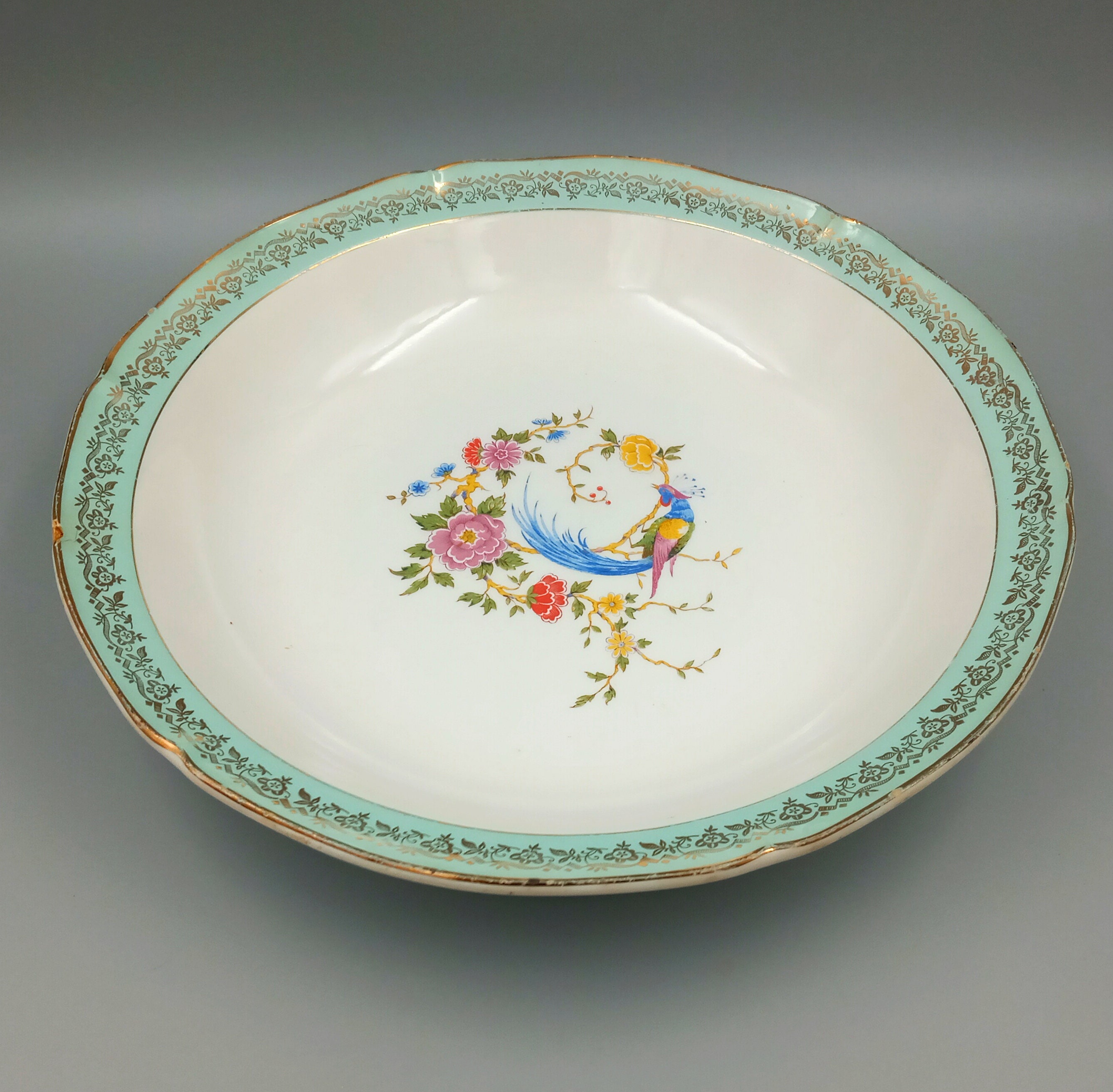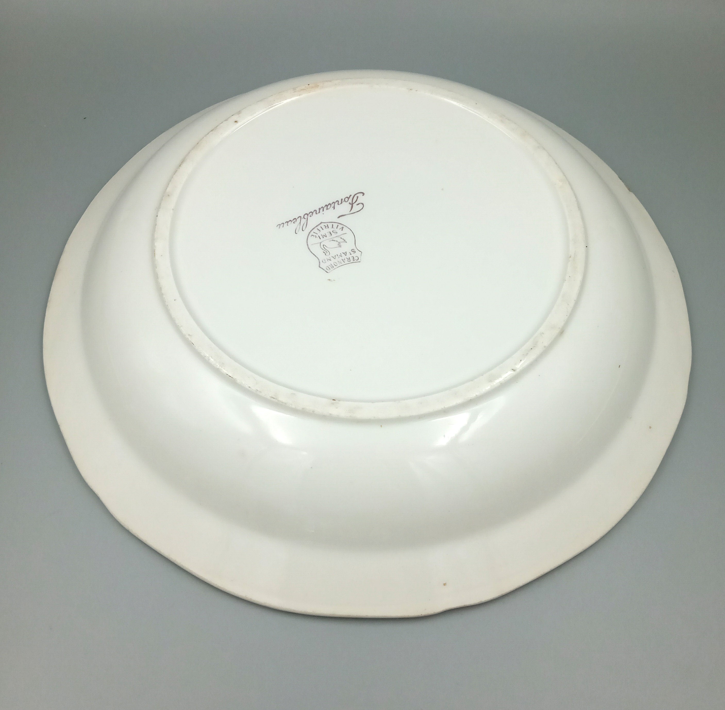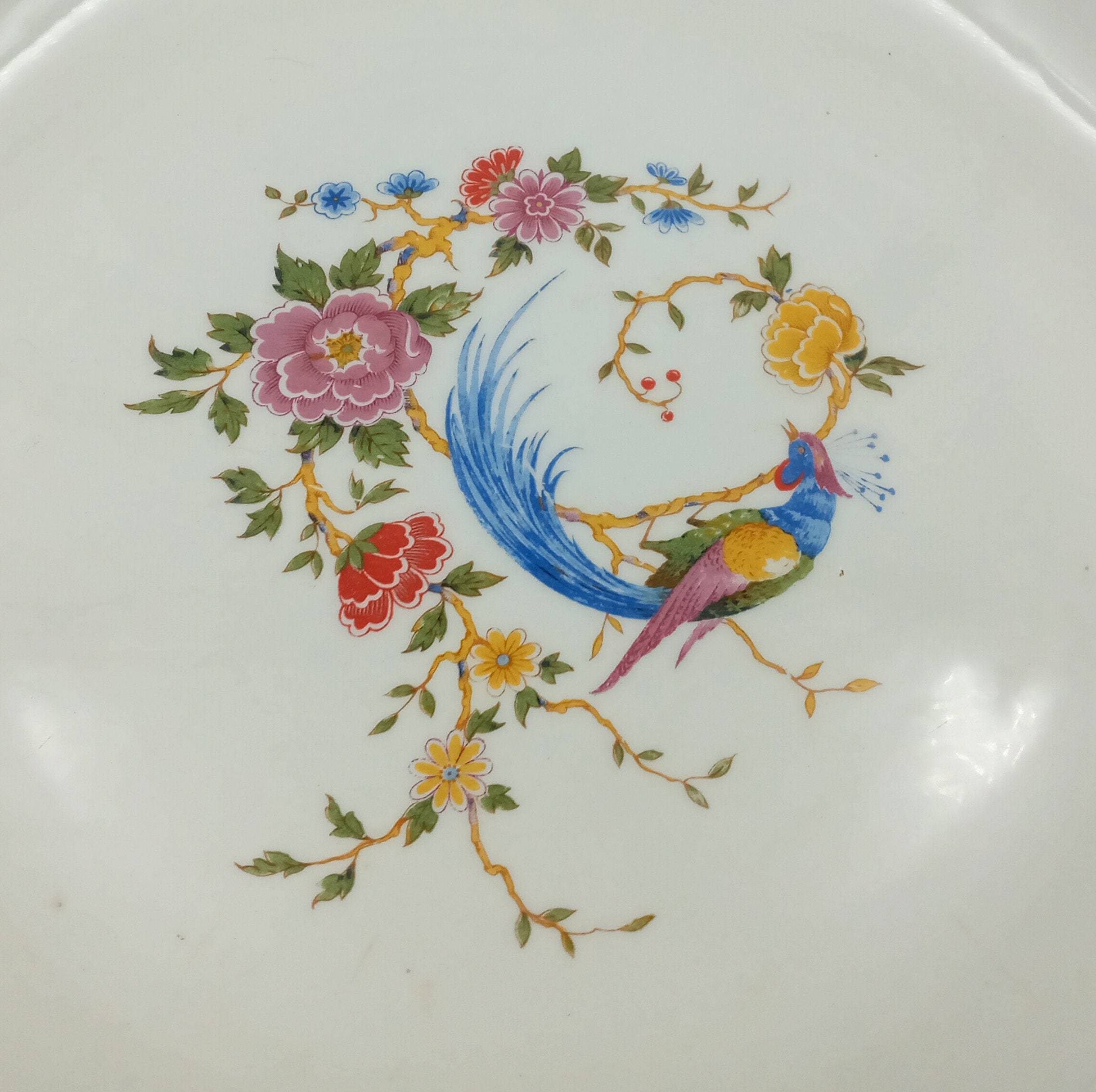 A lovely pair of vintage, round, semi-vitreous porcelain serving dishes from the Céranord Saint Amand factory in France, Chambord pattern. They feature a charming central motif of a phoenix on a flowering branch. Perfect for a romantic, shabby chic table setting.
