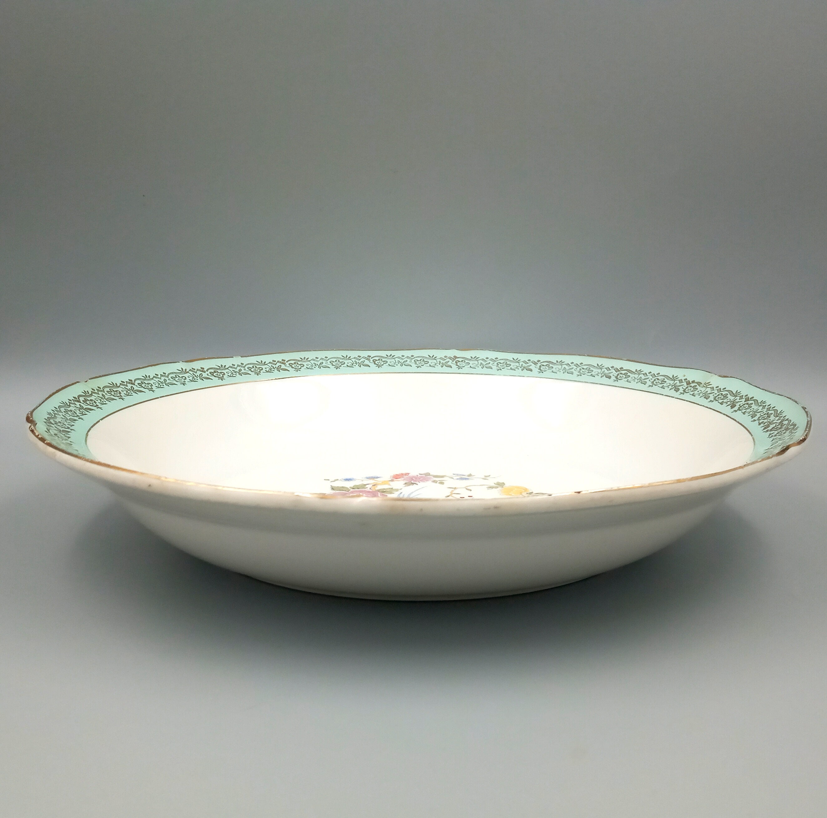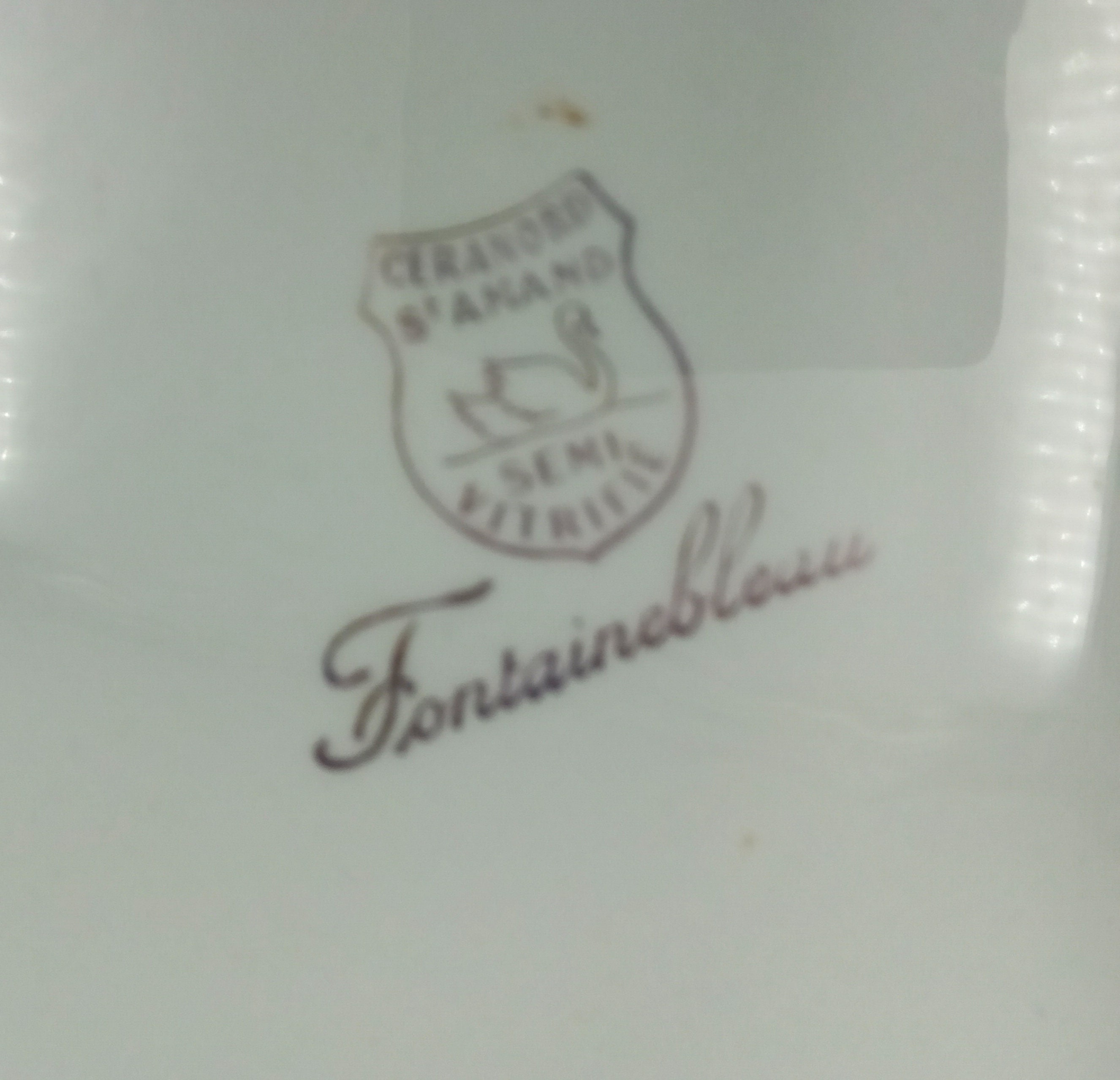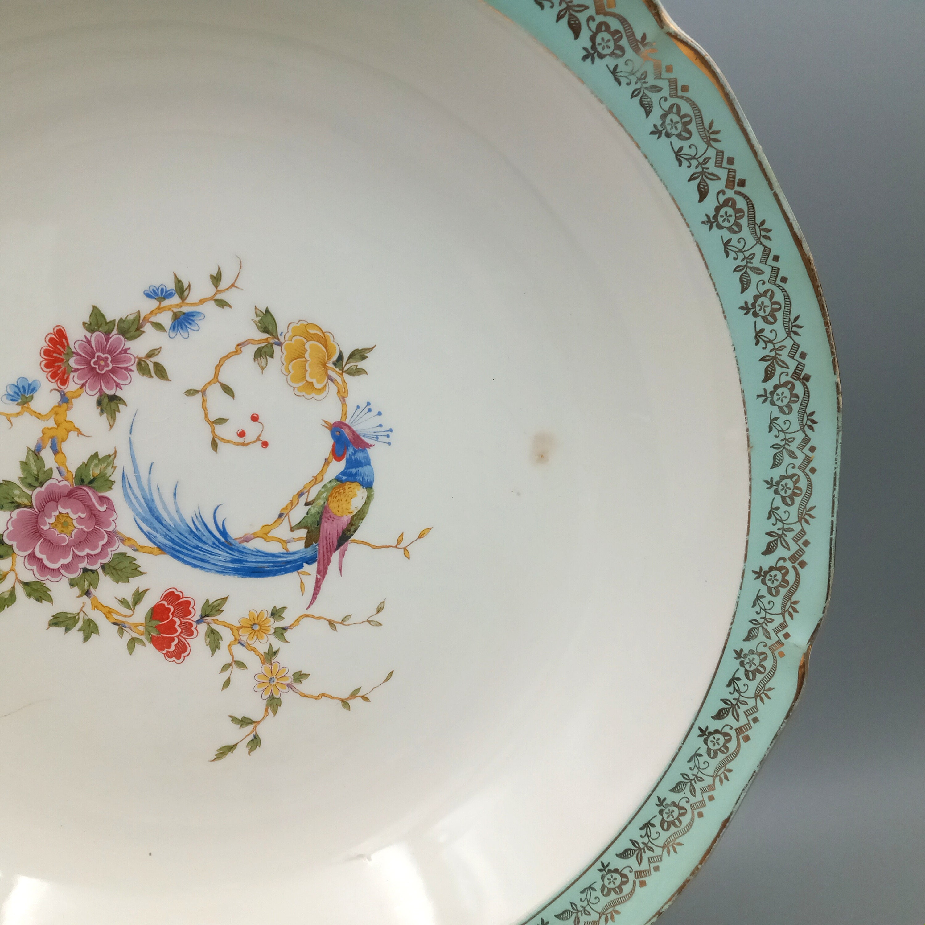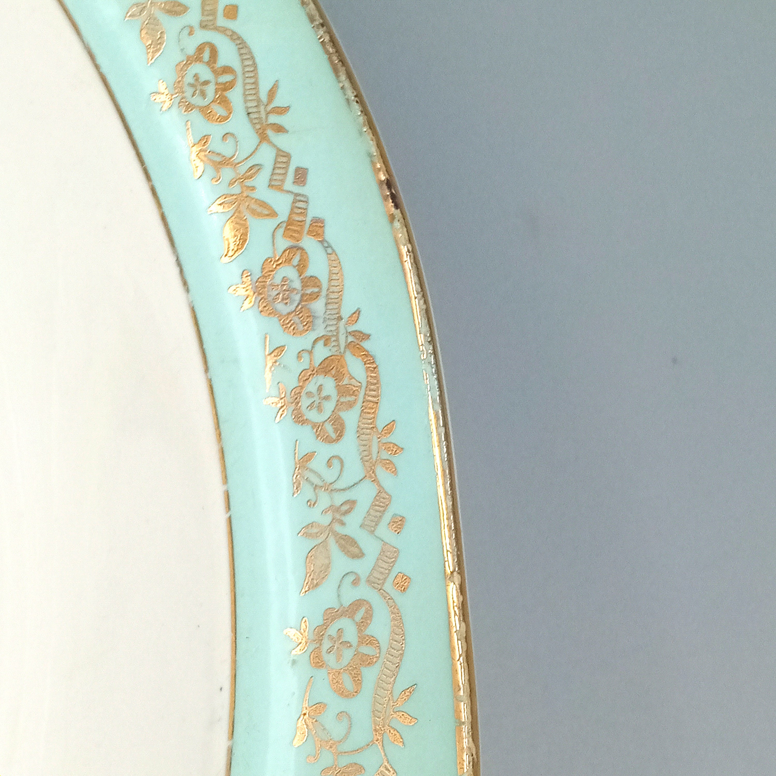 Very good condition, no cracks, one small chip and two very small ones on the first plate, one very small chip on the second and a small stain due to age (see photos), minor wear on the gold trim.