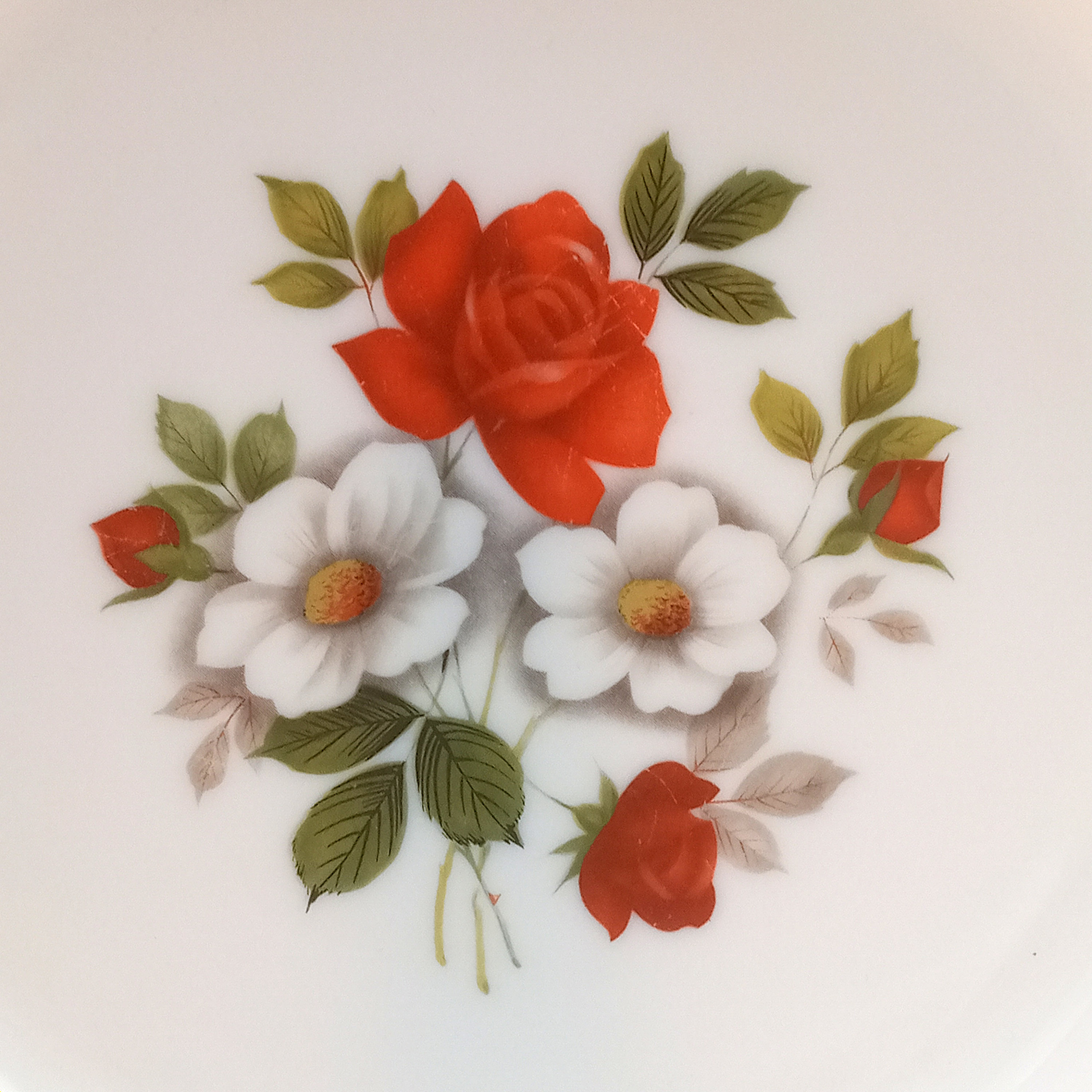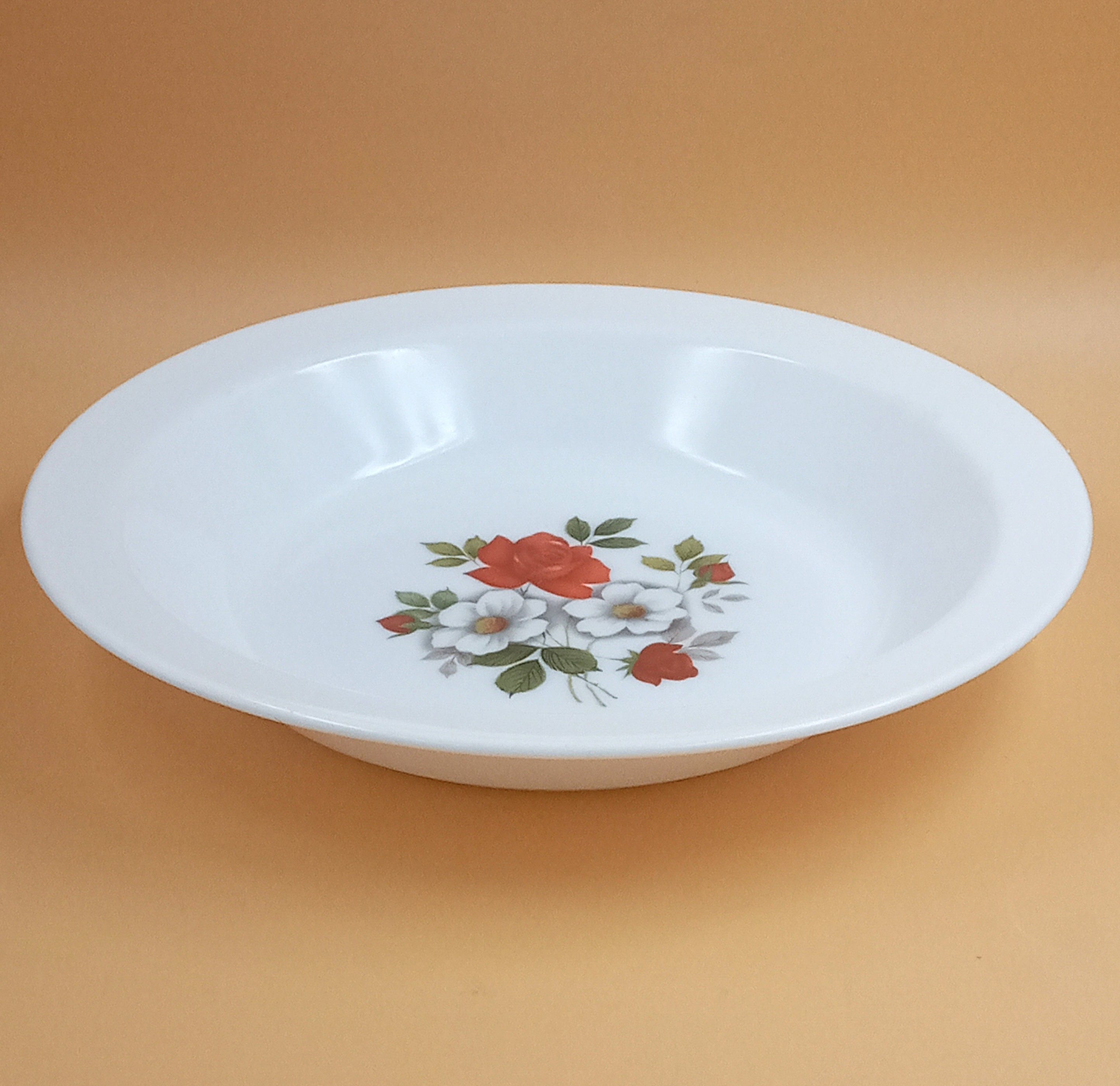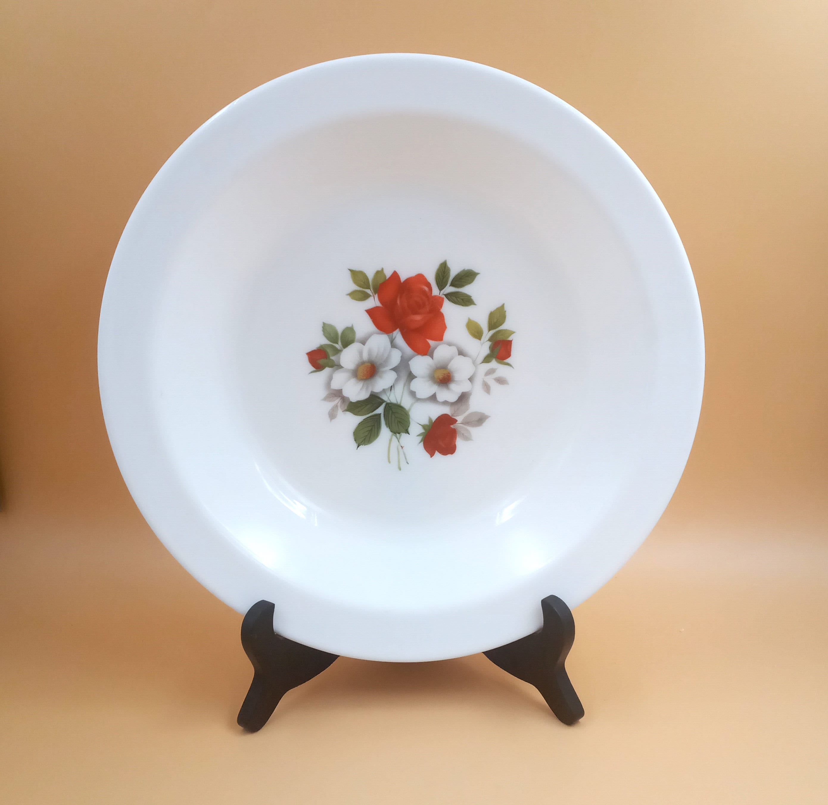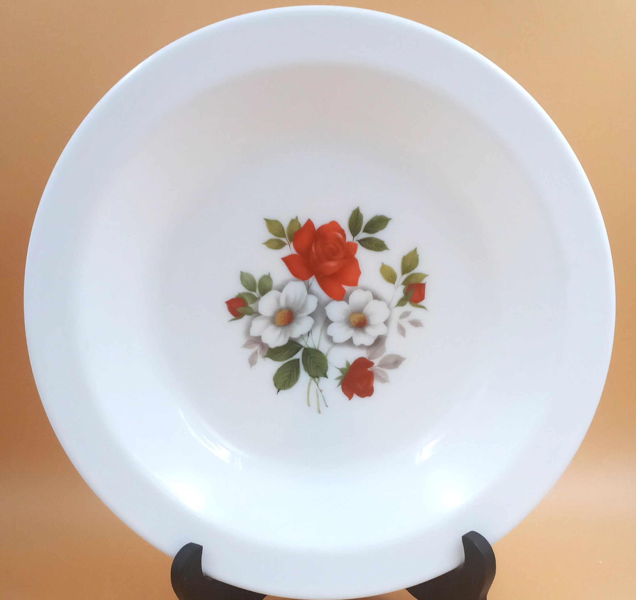 In the center, a very pretty motif, representing a bouquet of red roses and white anemones, decorates this vintage 80s glass milk bowl.
