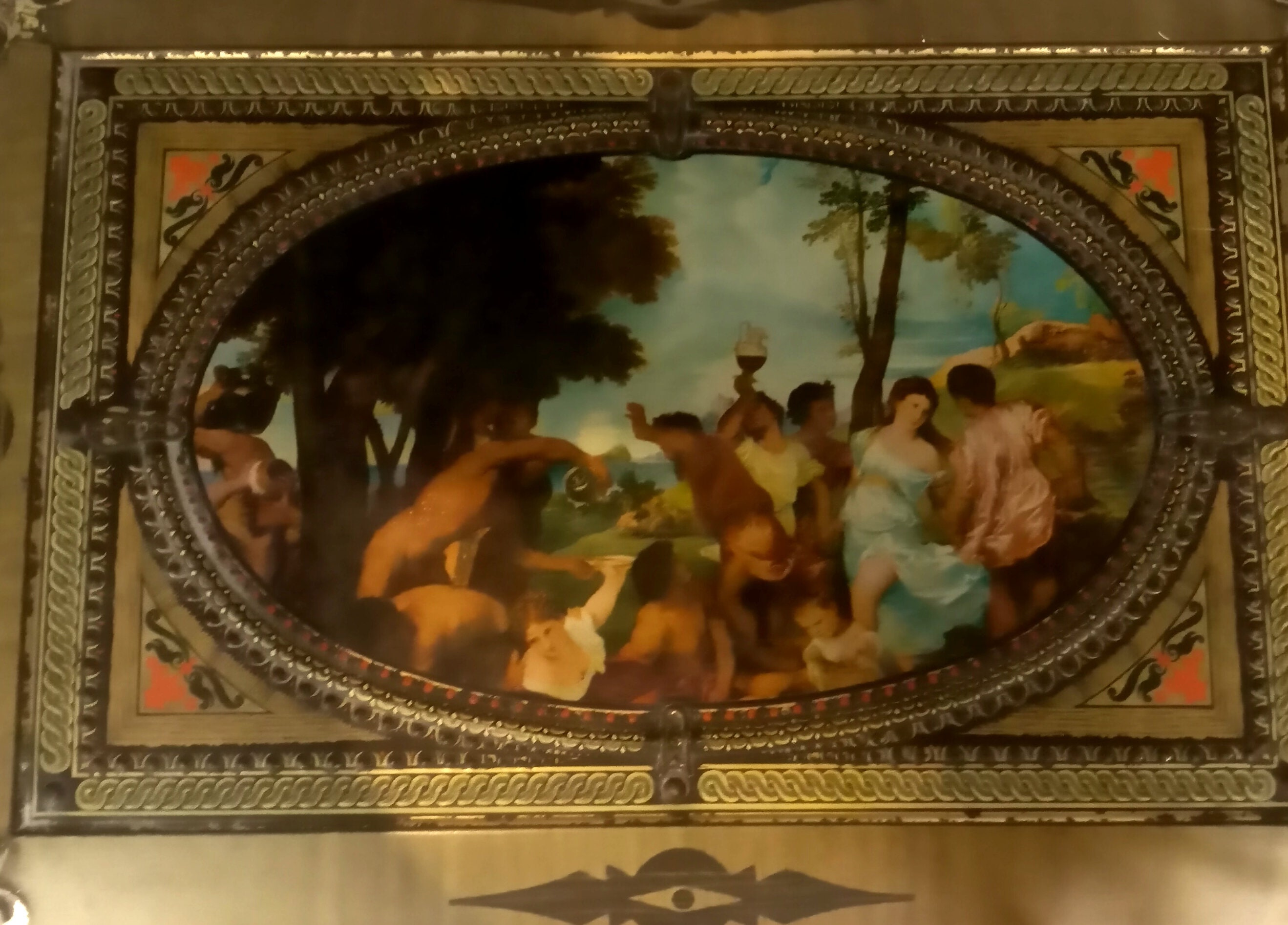 Large vintage tin box richly decorated with raised framed panels showing classical art scenes. Adorned with decorative corner pieces and a tie on the front. This box is 60 years old, but for its age it is very well preserved.