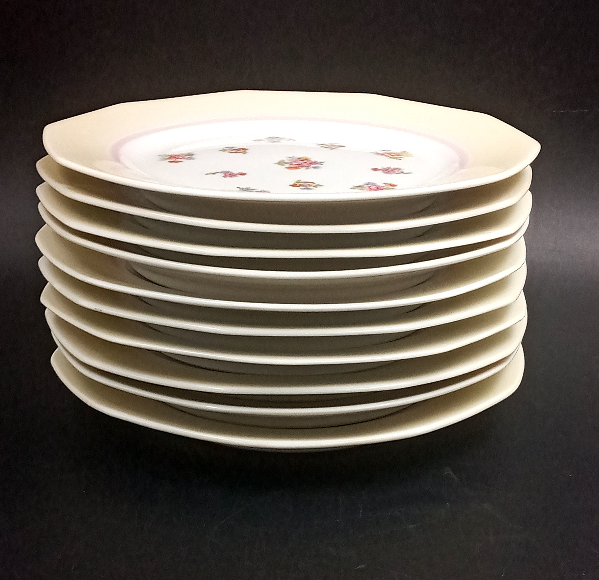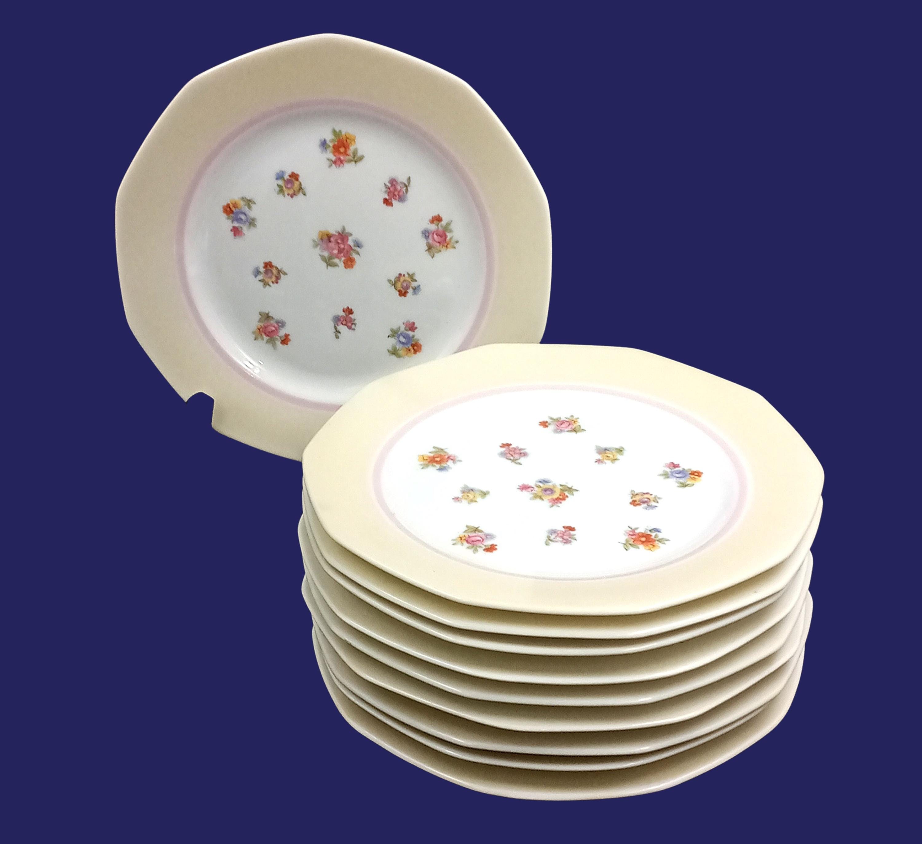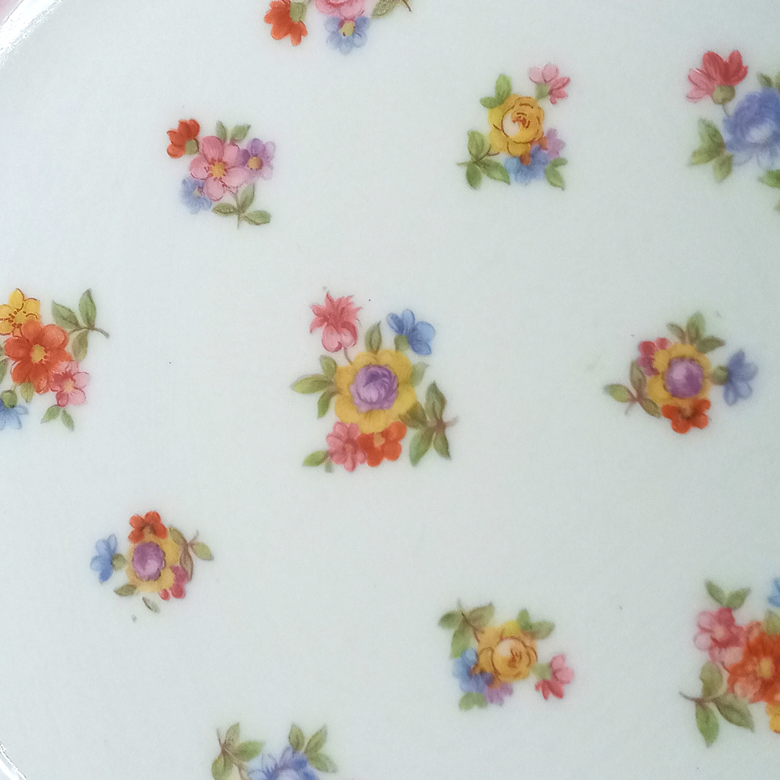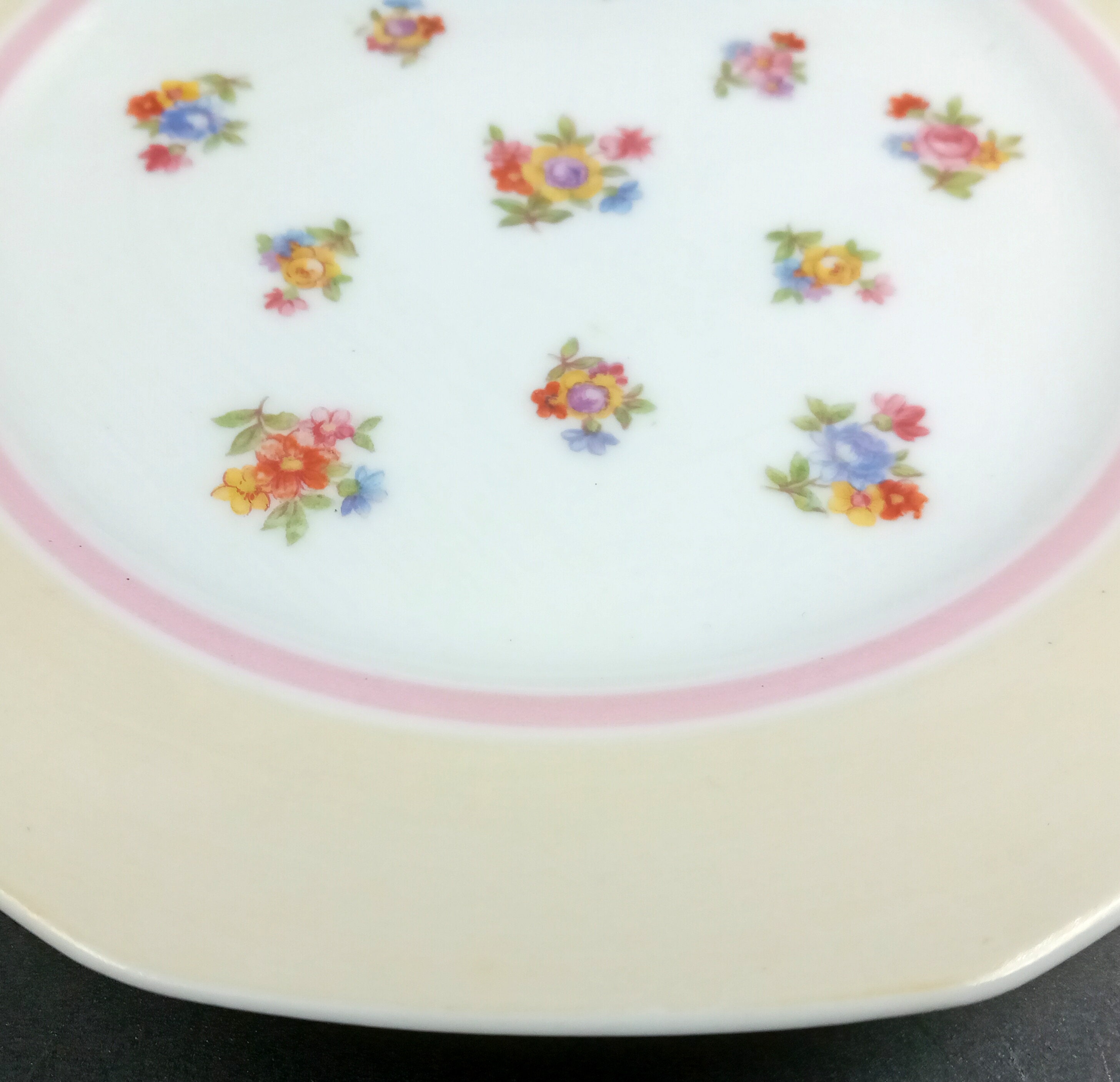 Pretty little vintage porcelain dessert plates. They have a multicolored design, adorned with a multitude of small floral bouquets, and the rim is a lovely light yellow color.