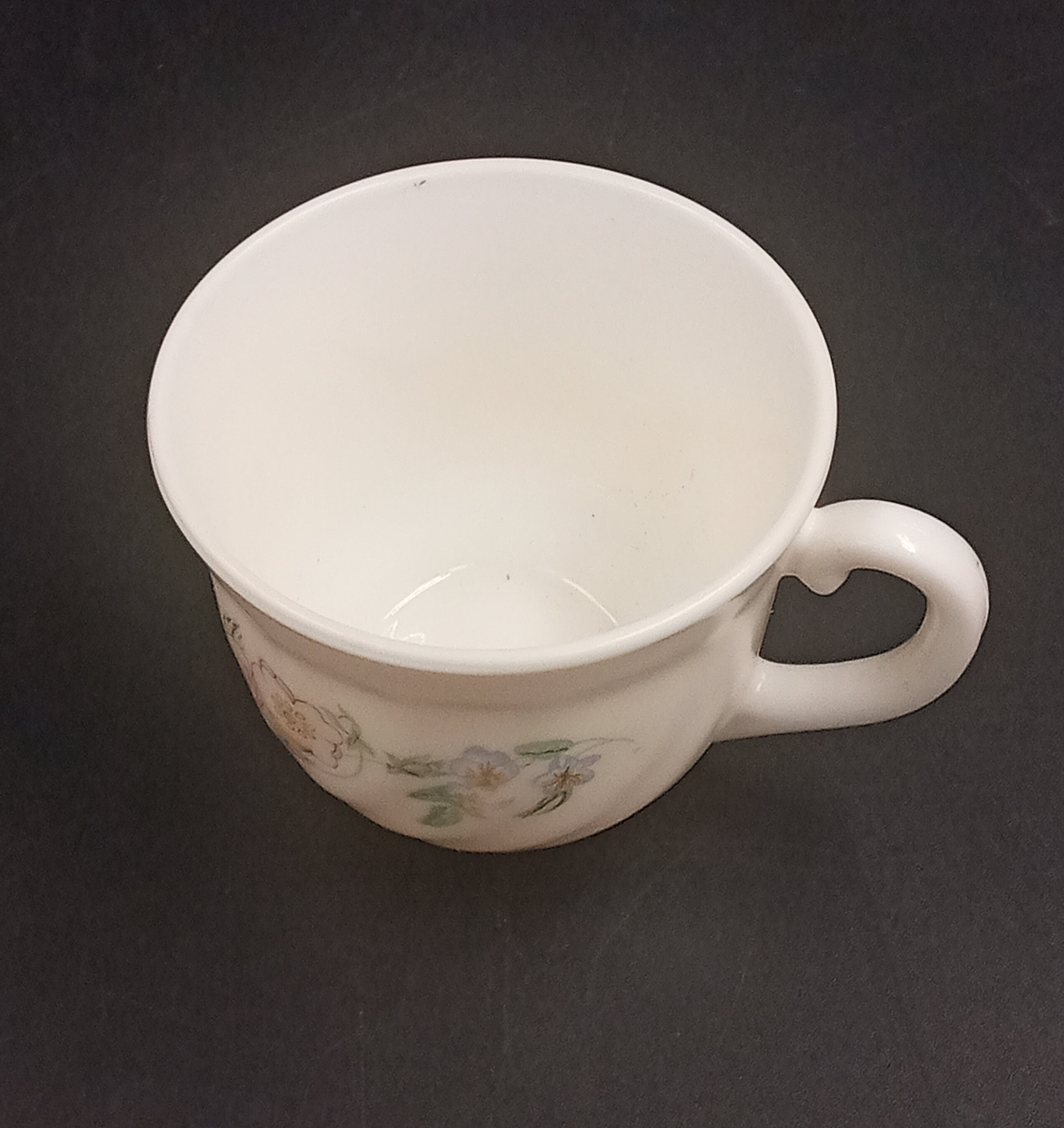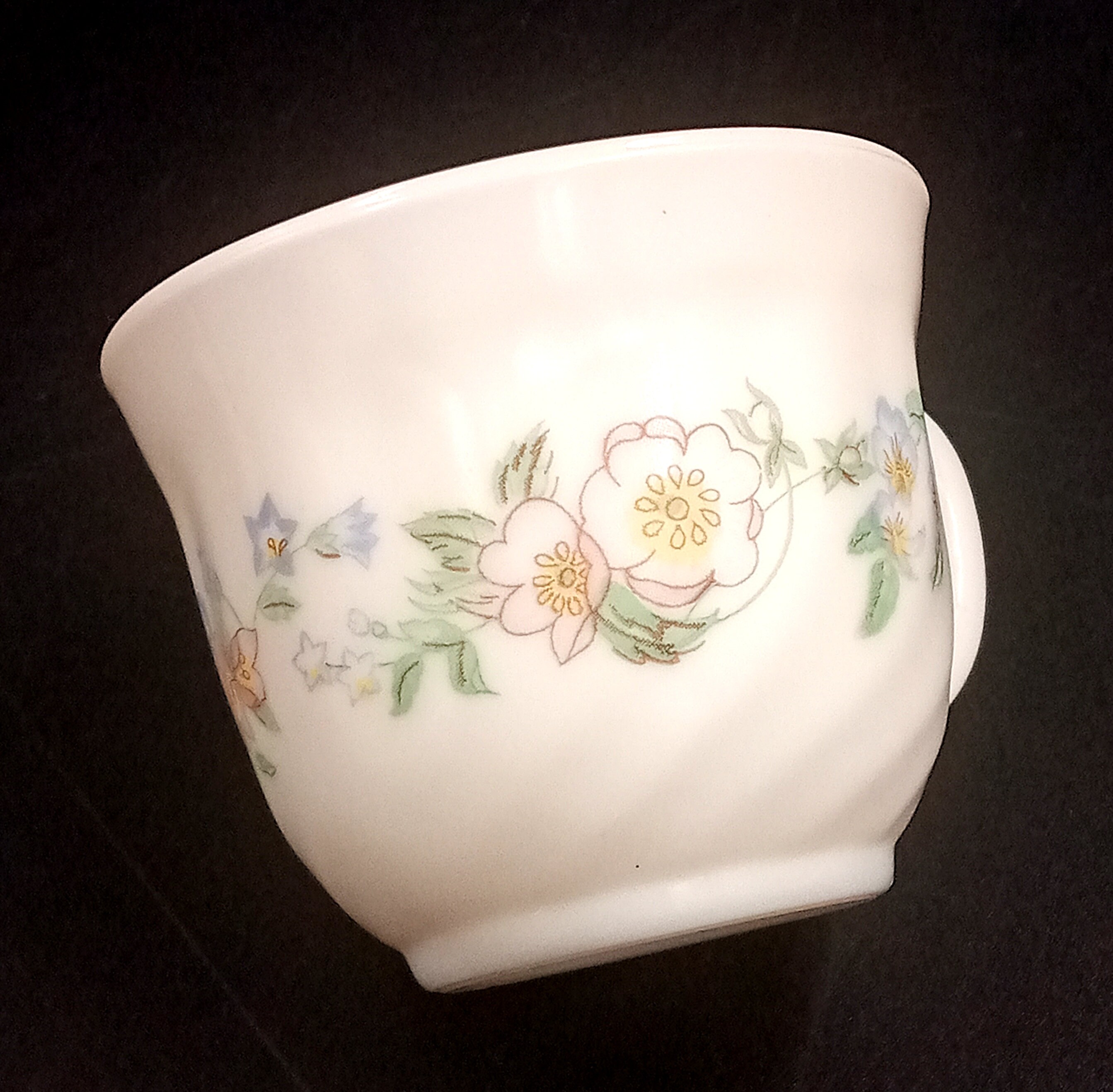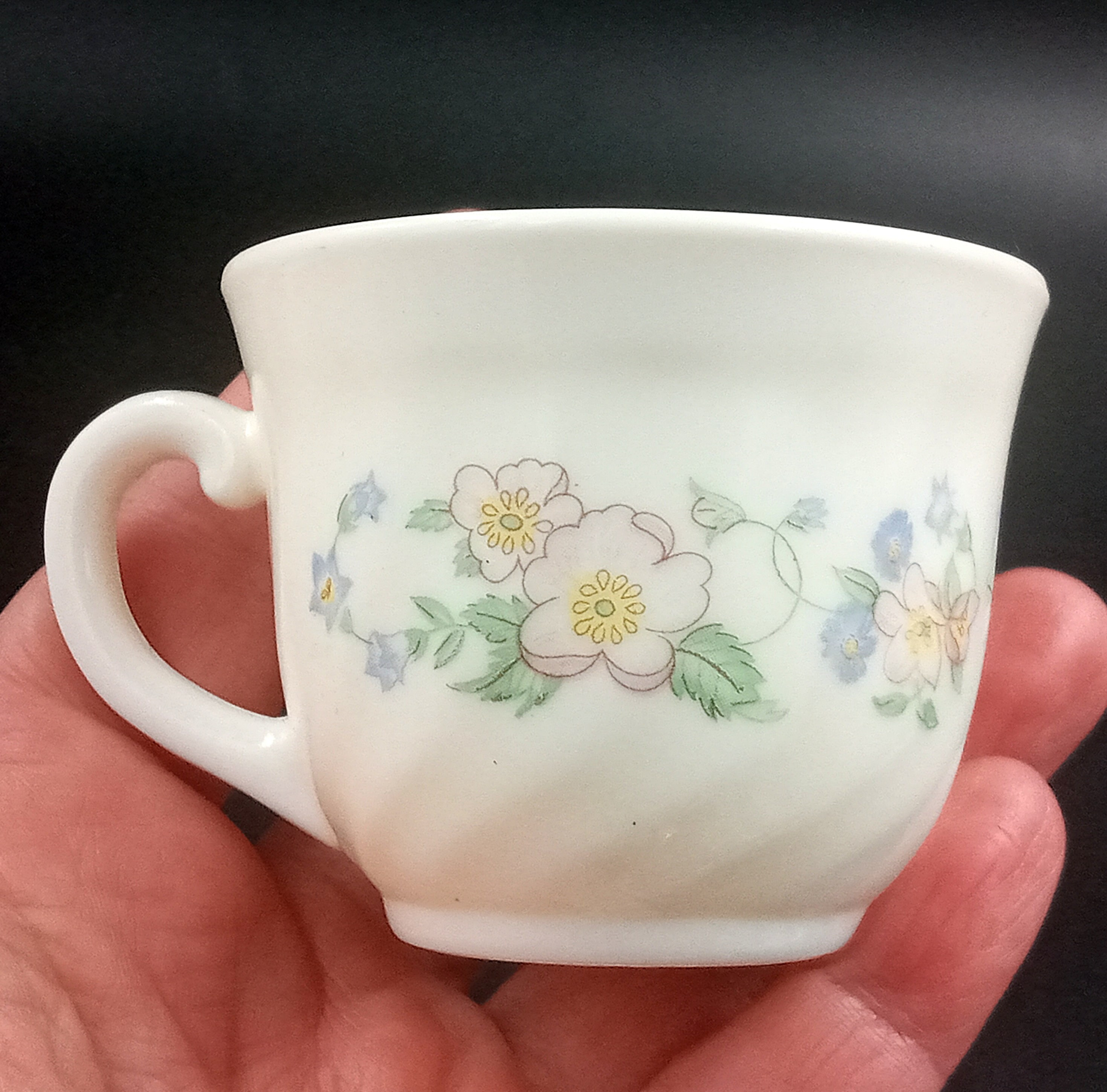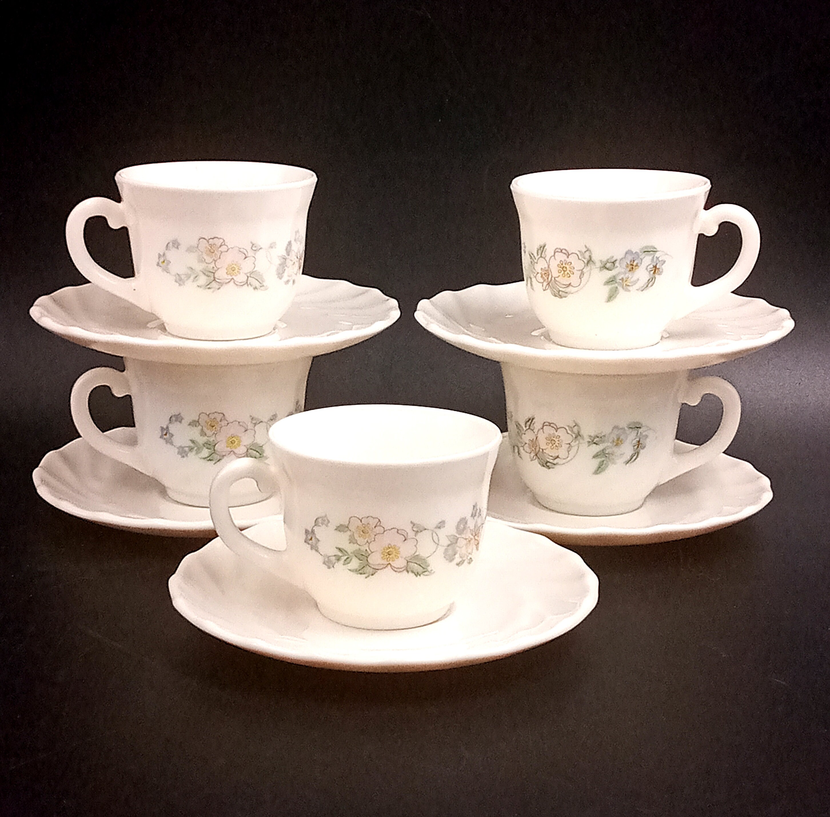 Set of 5 vintage coffee cups and saucers in creamy white milk glass with a pretty floral design in soft colors, from the brand Arcopal France.