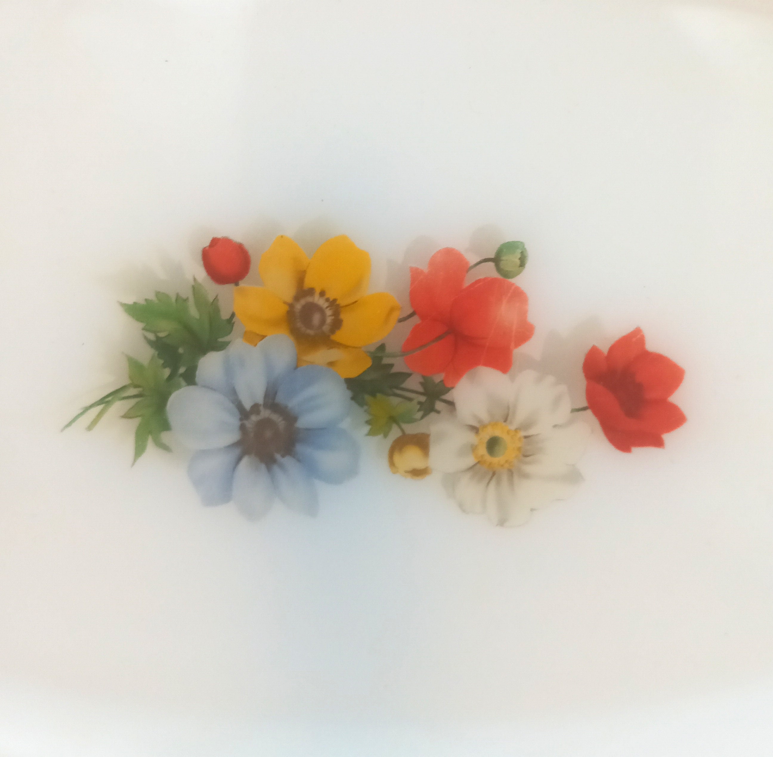 This serving dish dates from the 1960s and was made in France by the Arques crystal factory. The design features anemones in various colors; it was part of a collection released in 1965/66.