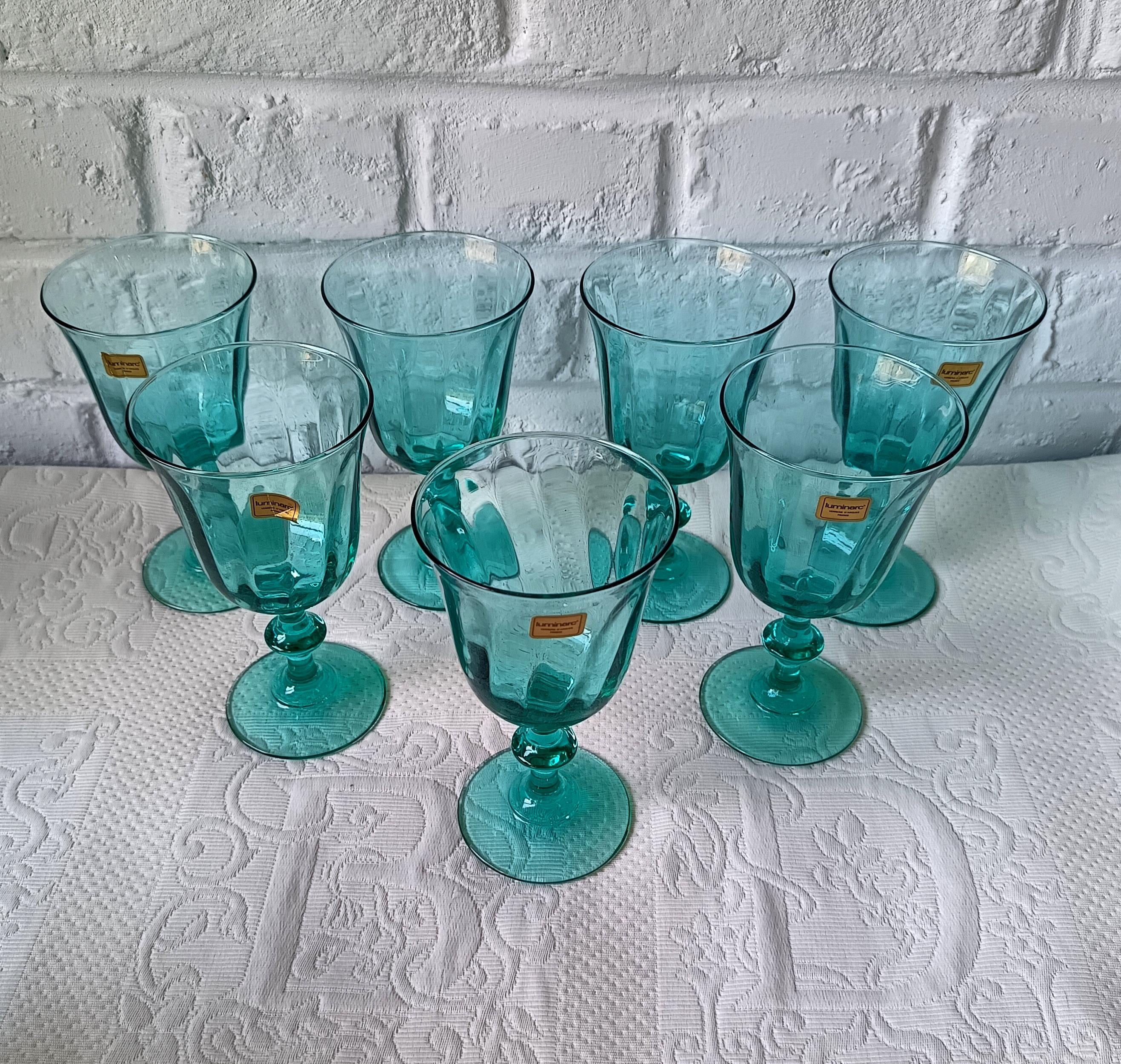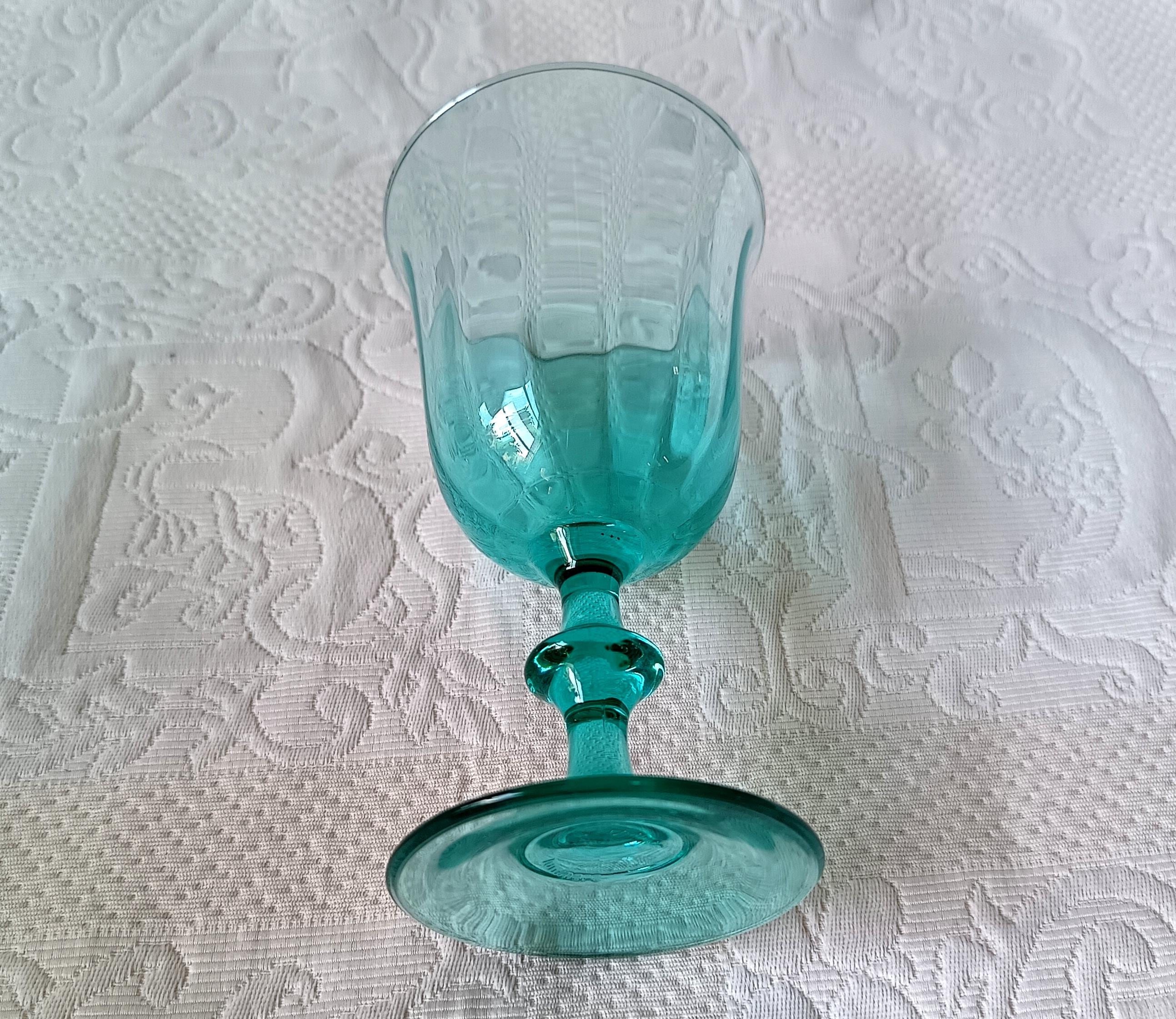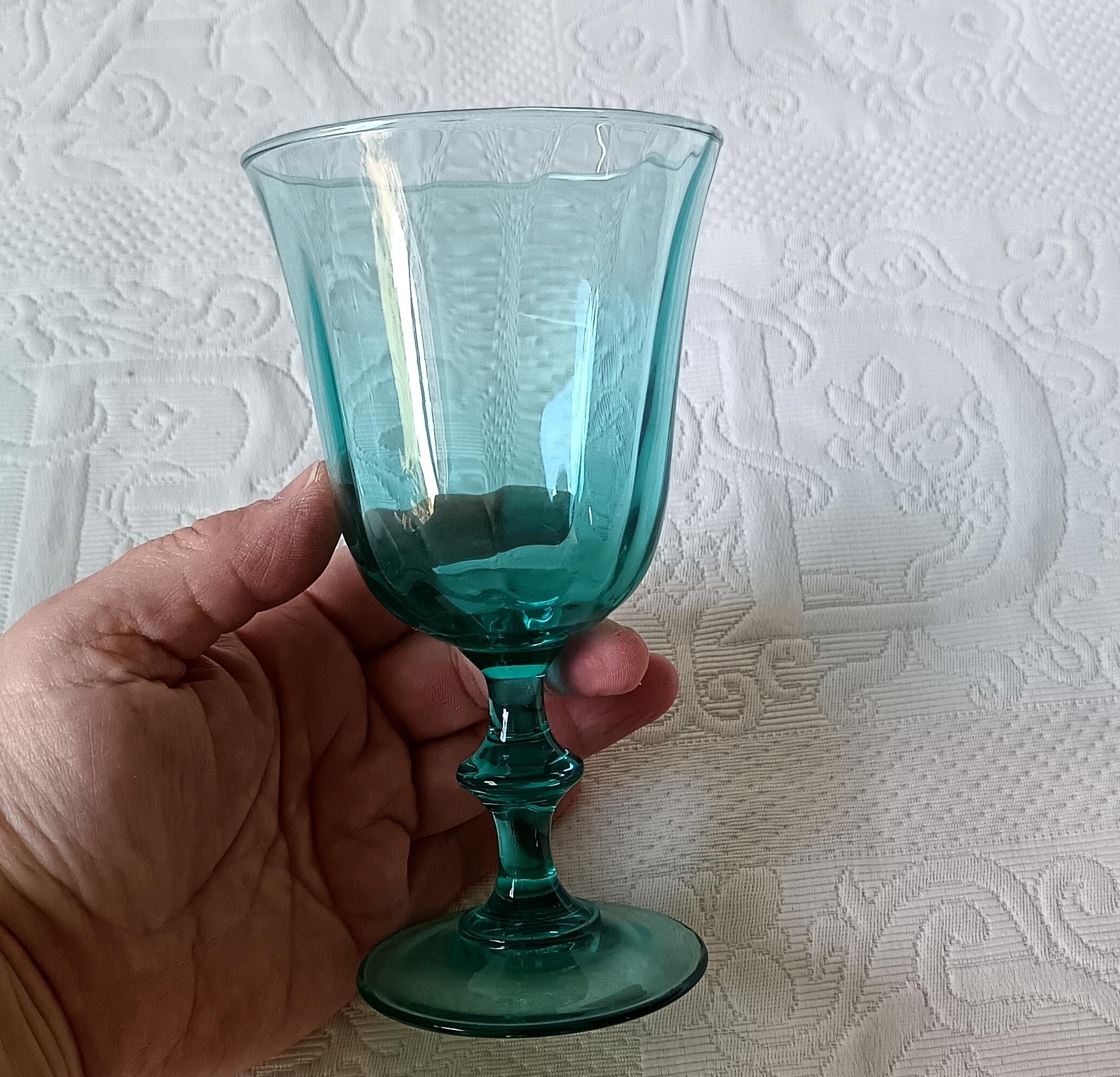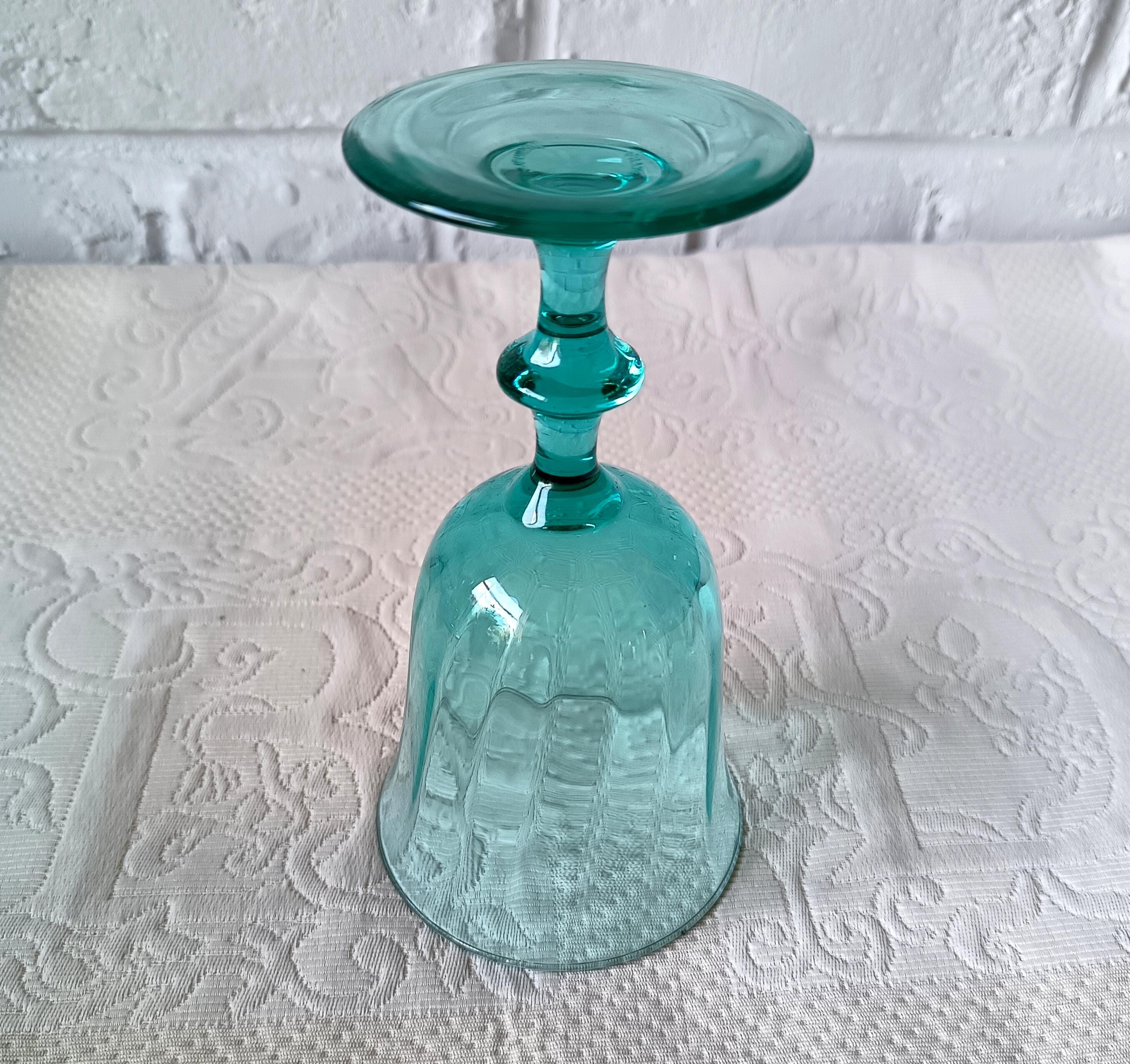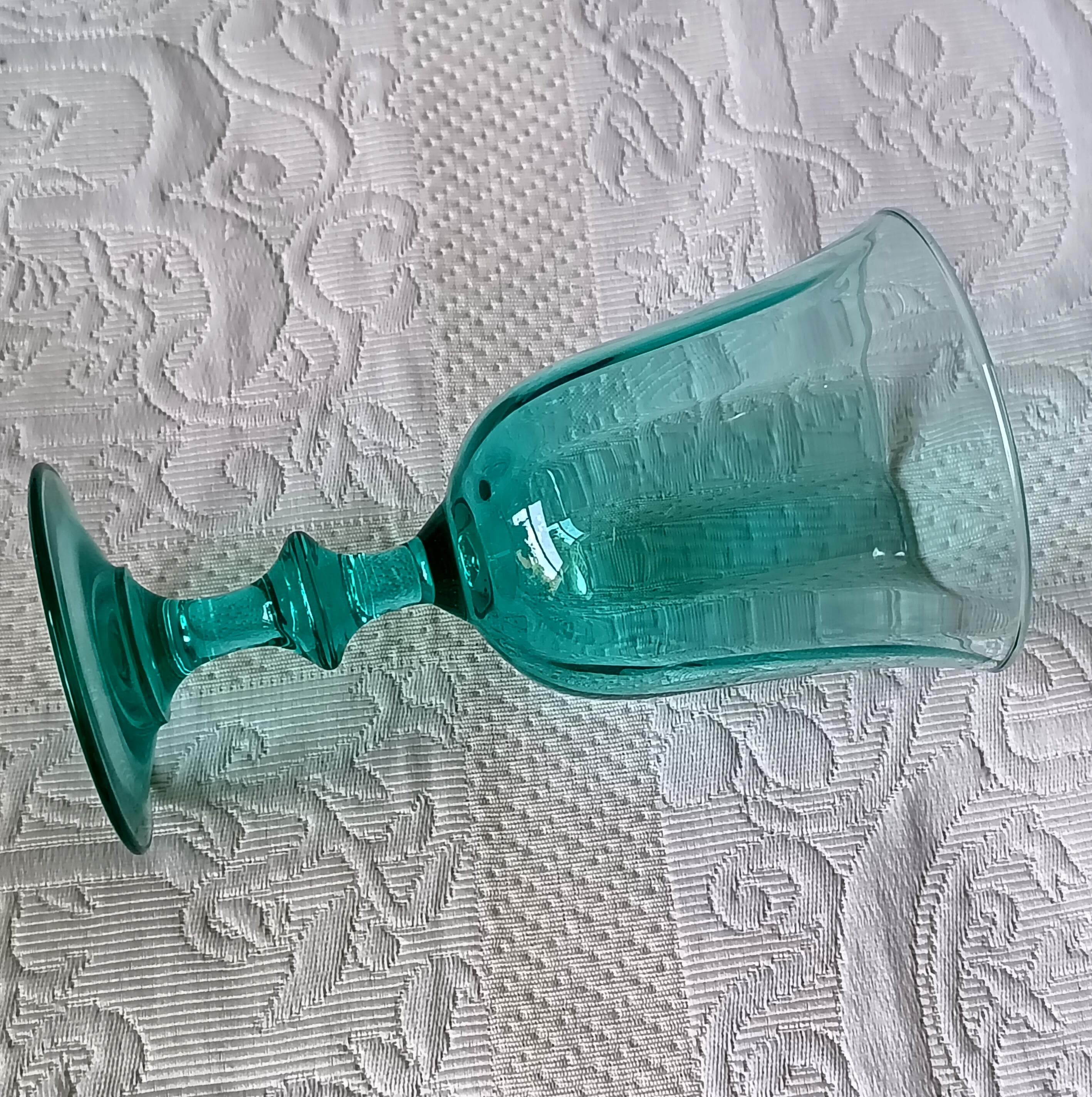 They are made of turquoise glass, with a pretty baluster stem and a chalice with a raised pattern on the inside.