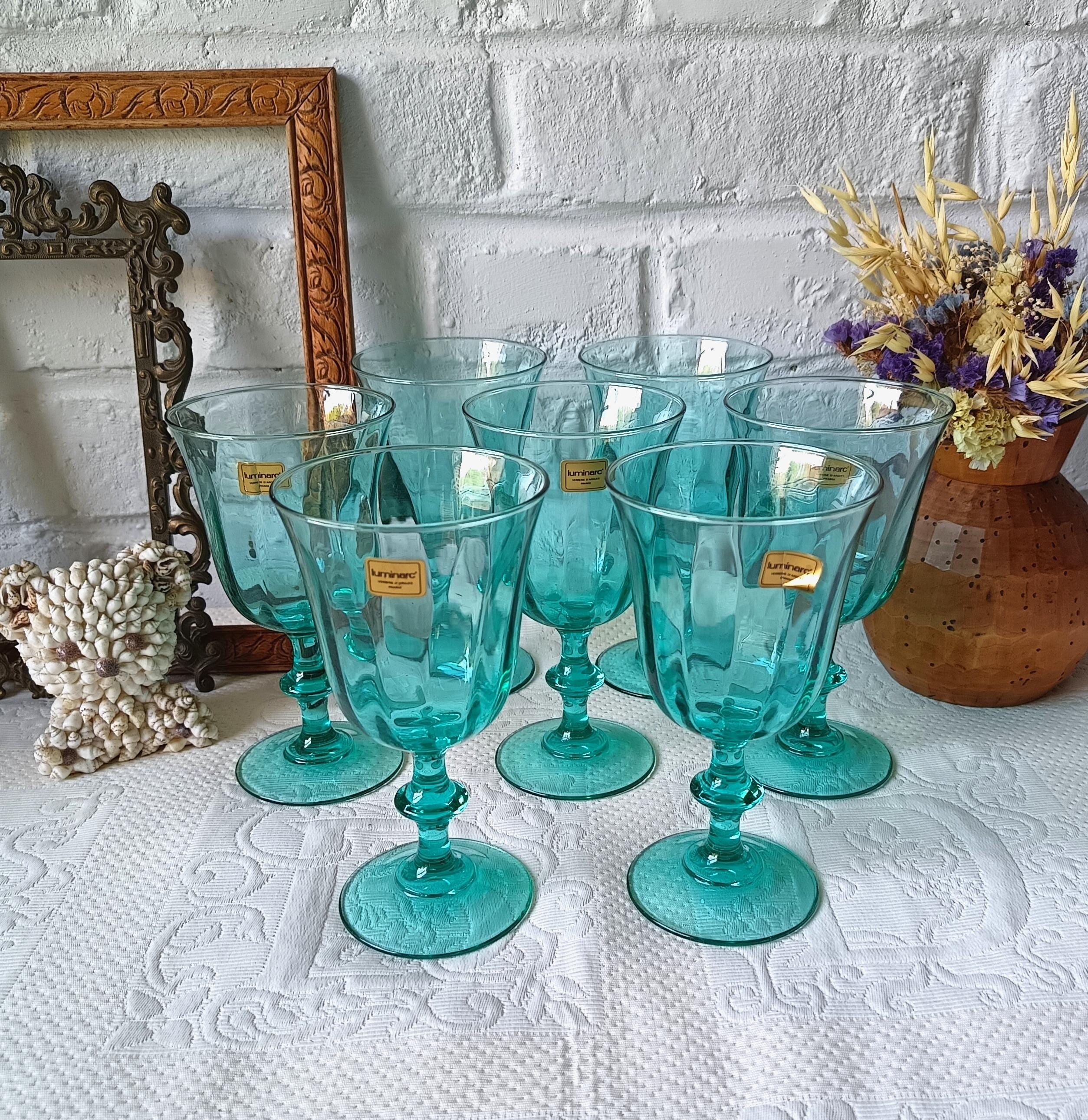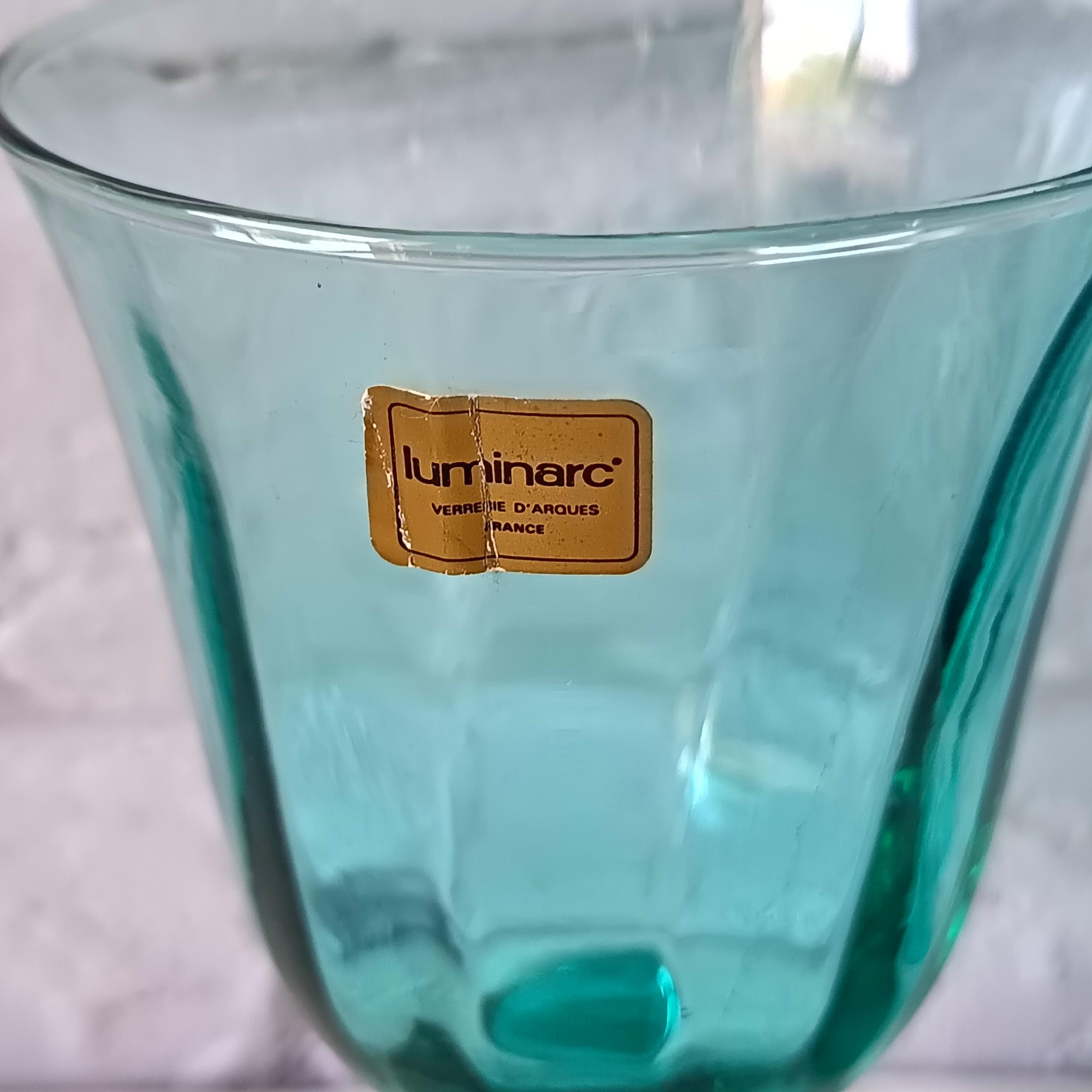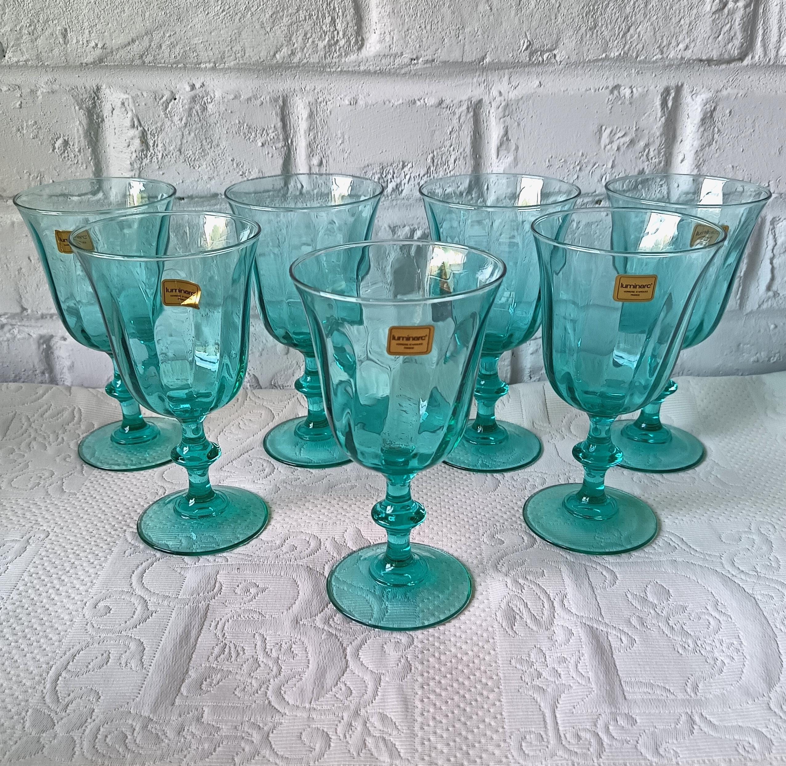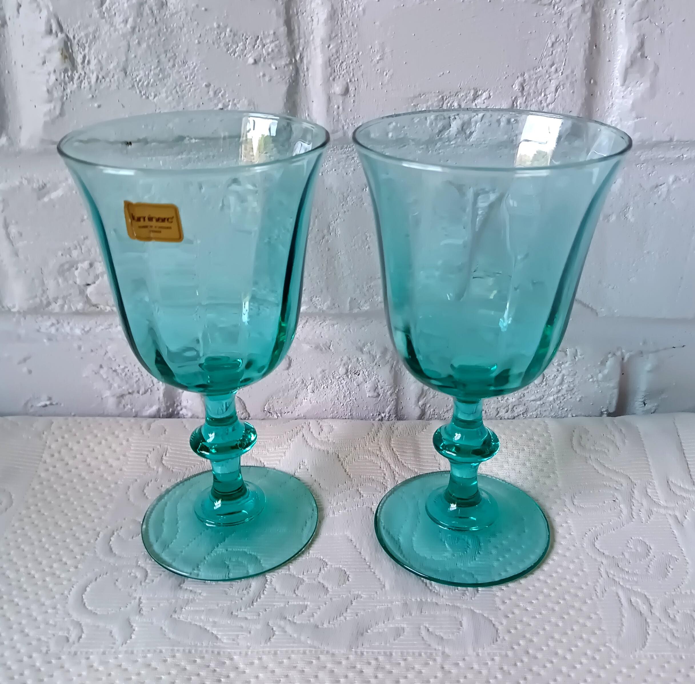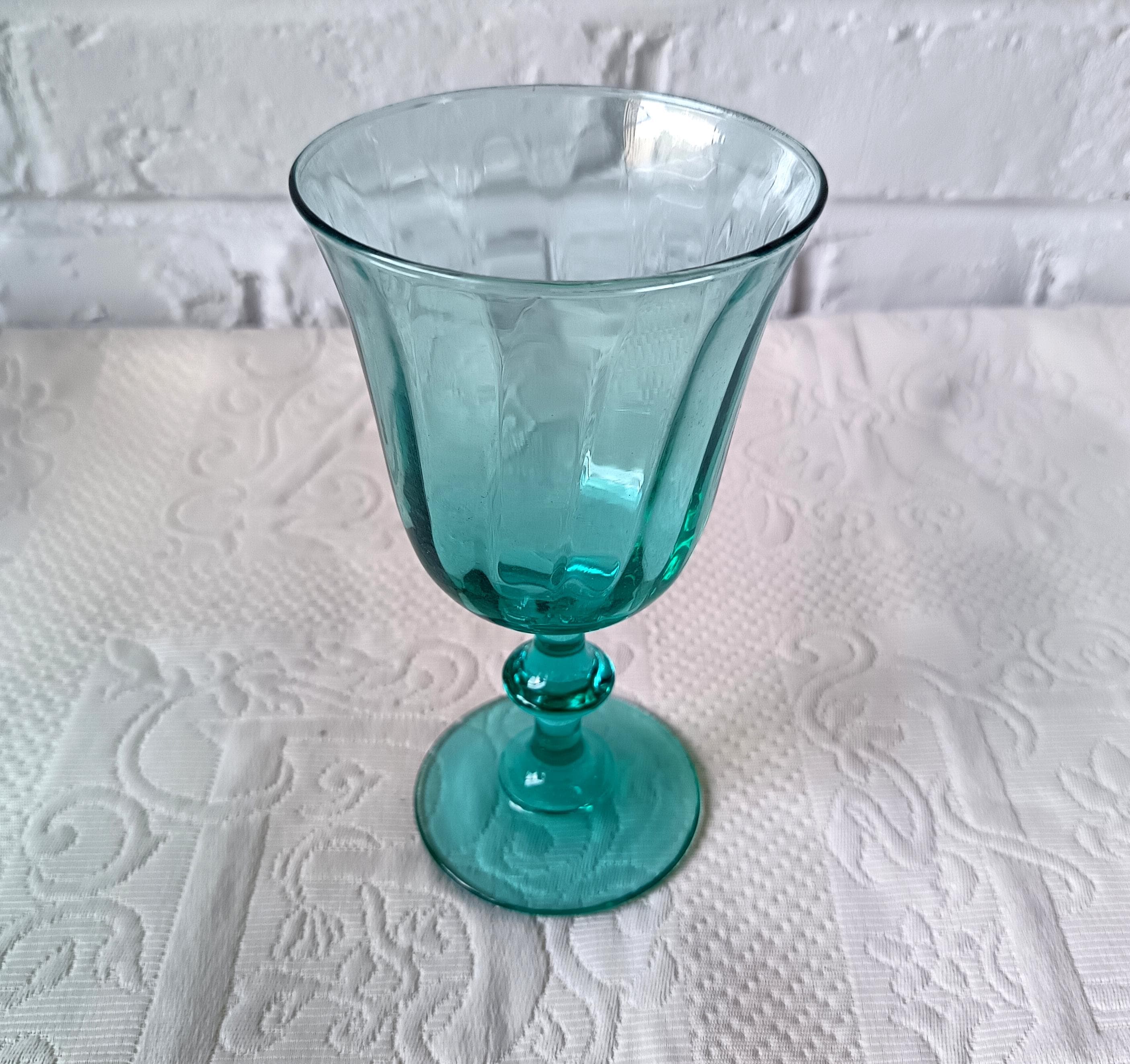 They are made of turquoise glass, with a pretty baluster stem and a chalice with a raised pattern on the inside.