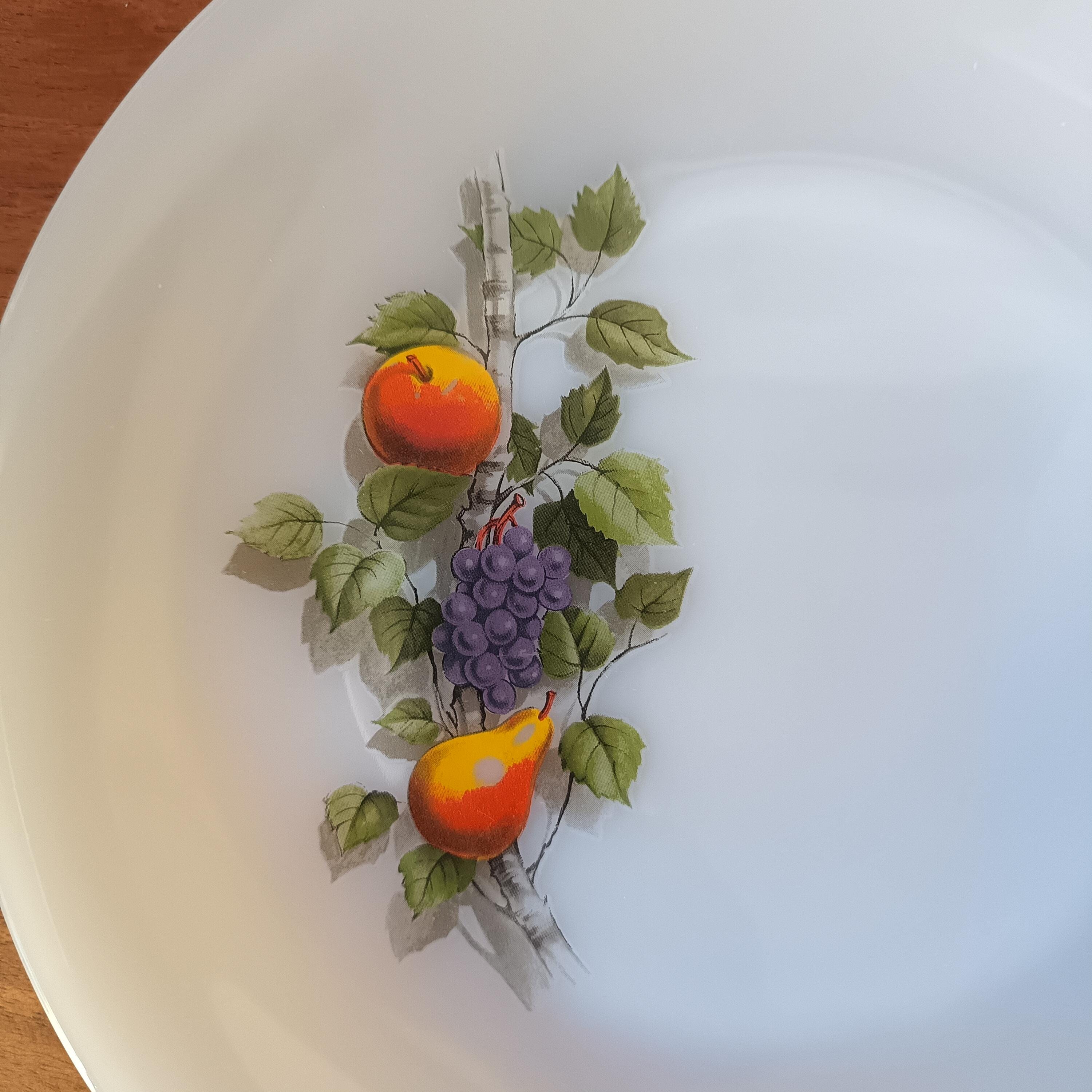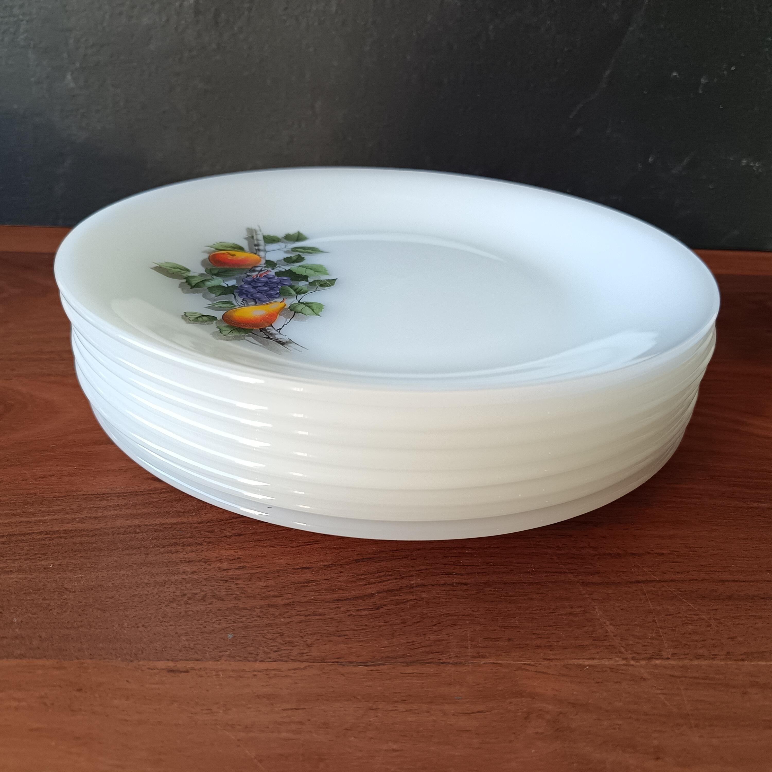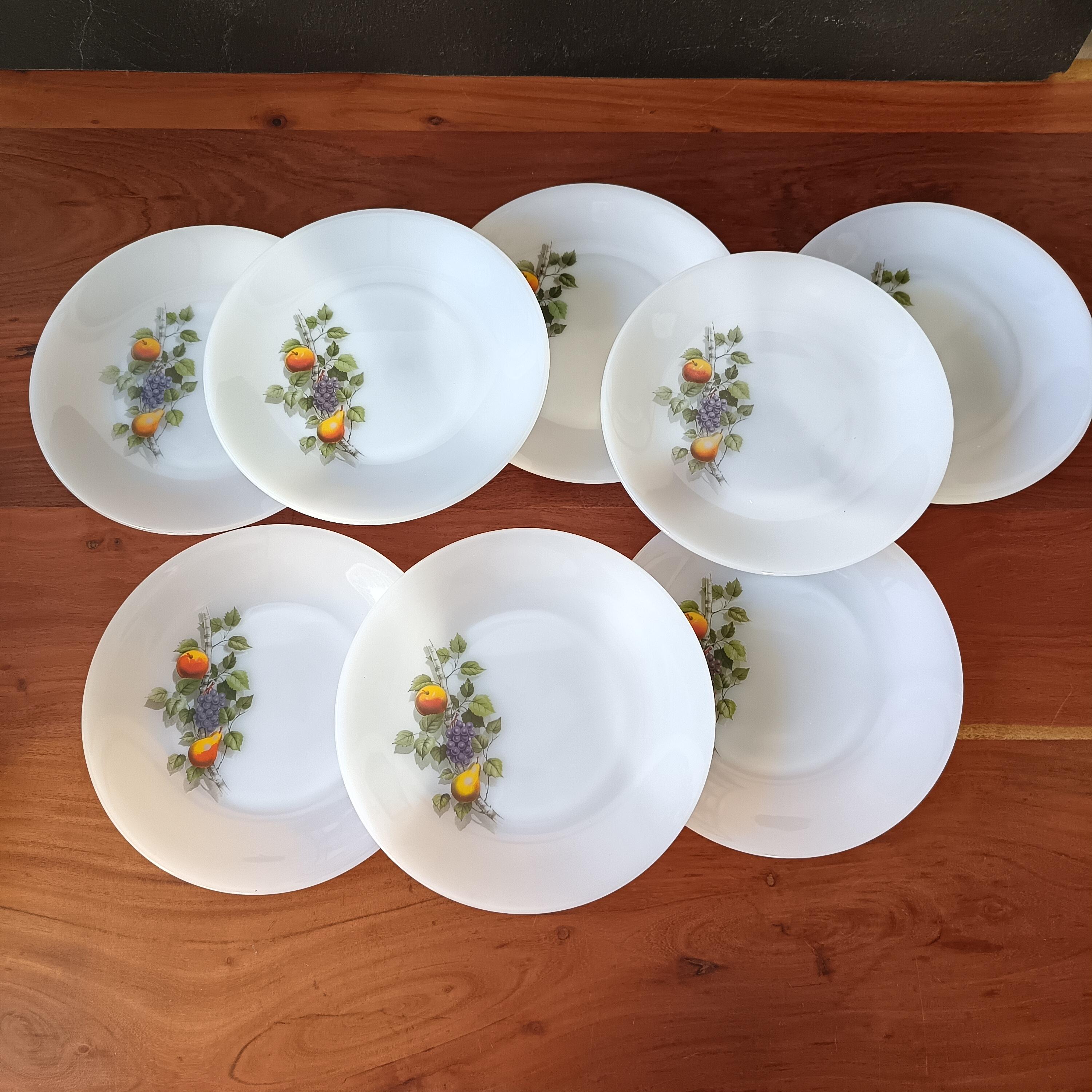 8 vintage ARCOPAL brand milk glass plates from the Arques glassworks, "Fruits of France" pattern, dating from the 1960s.