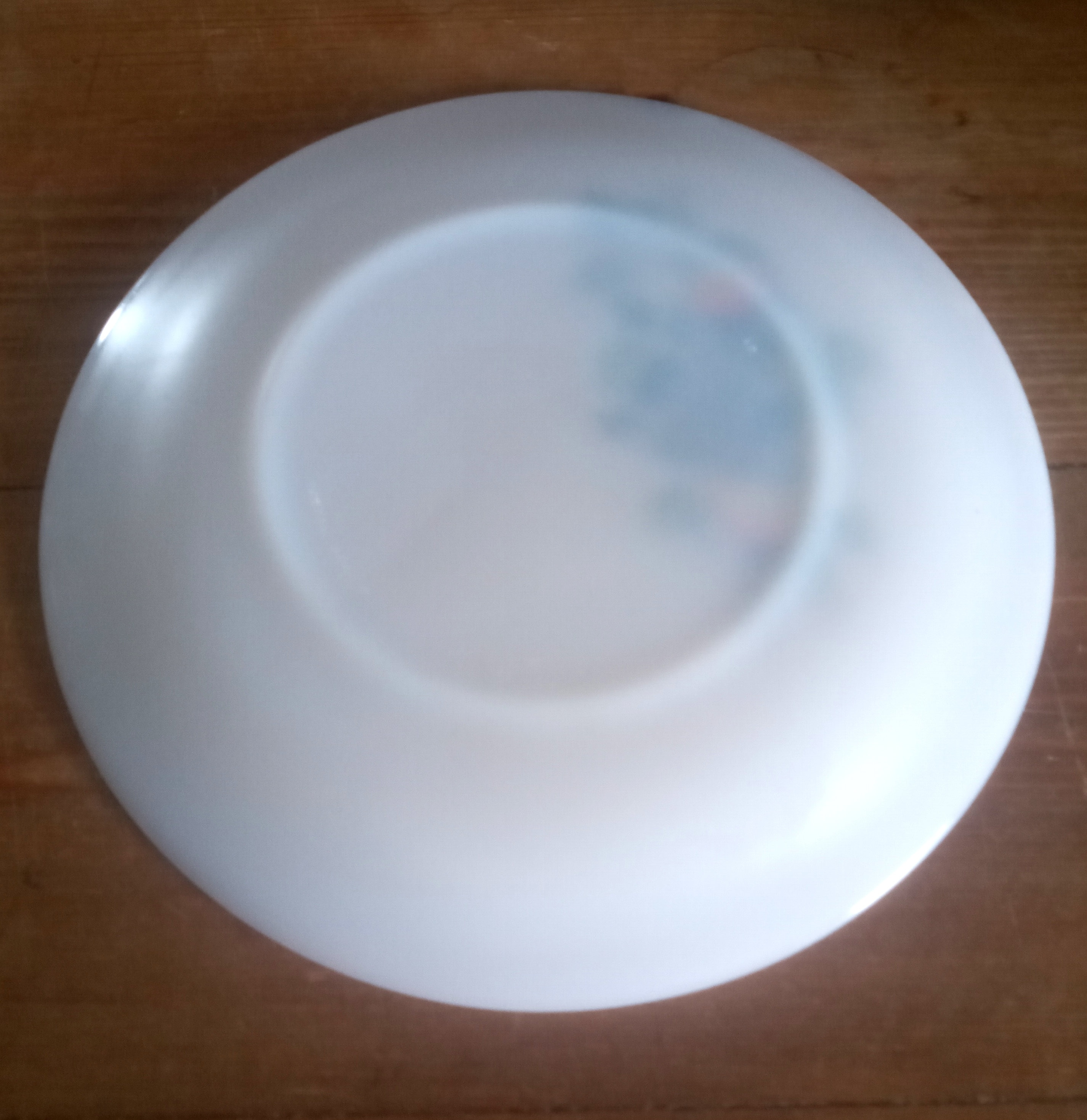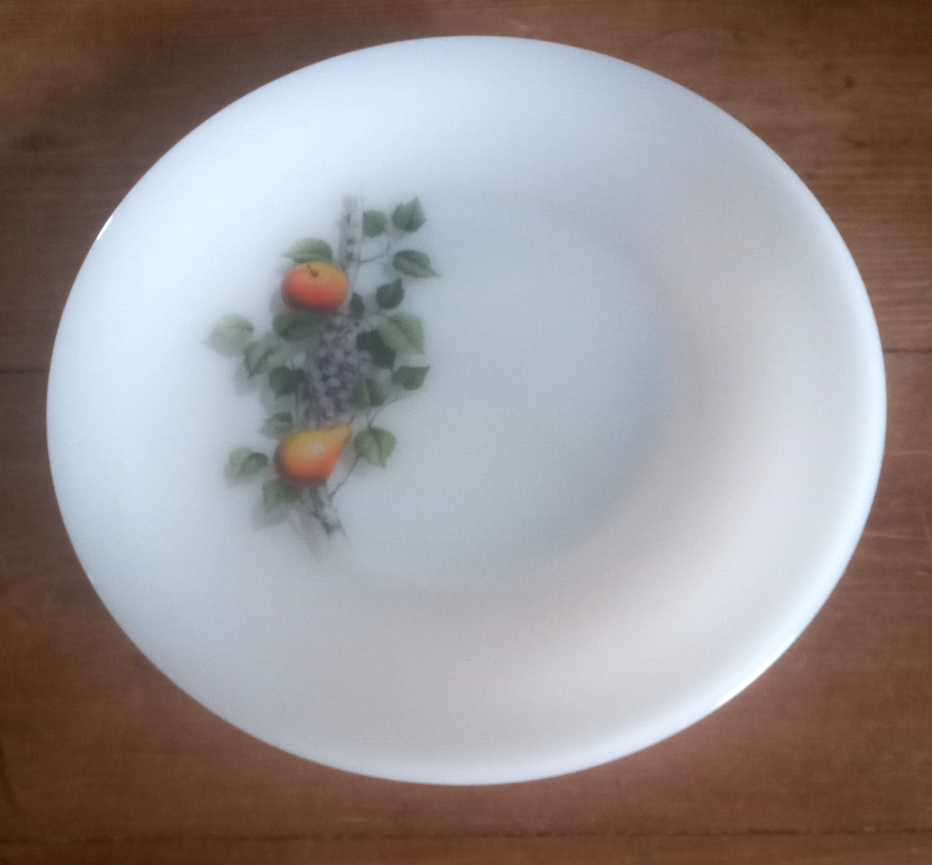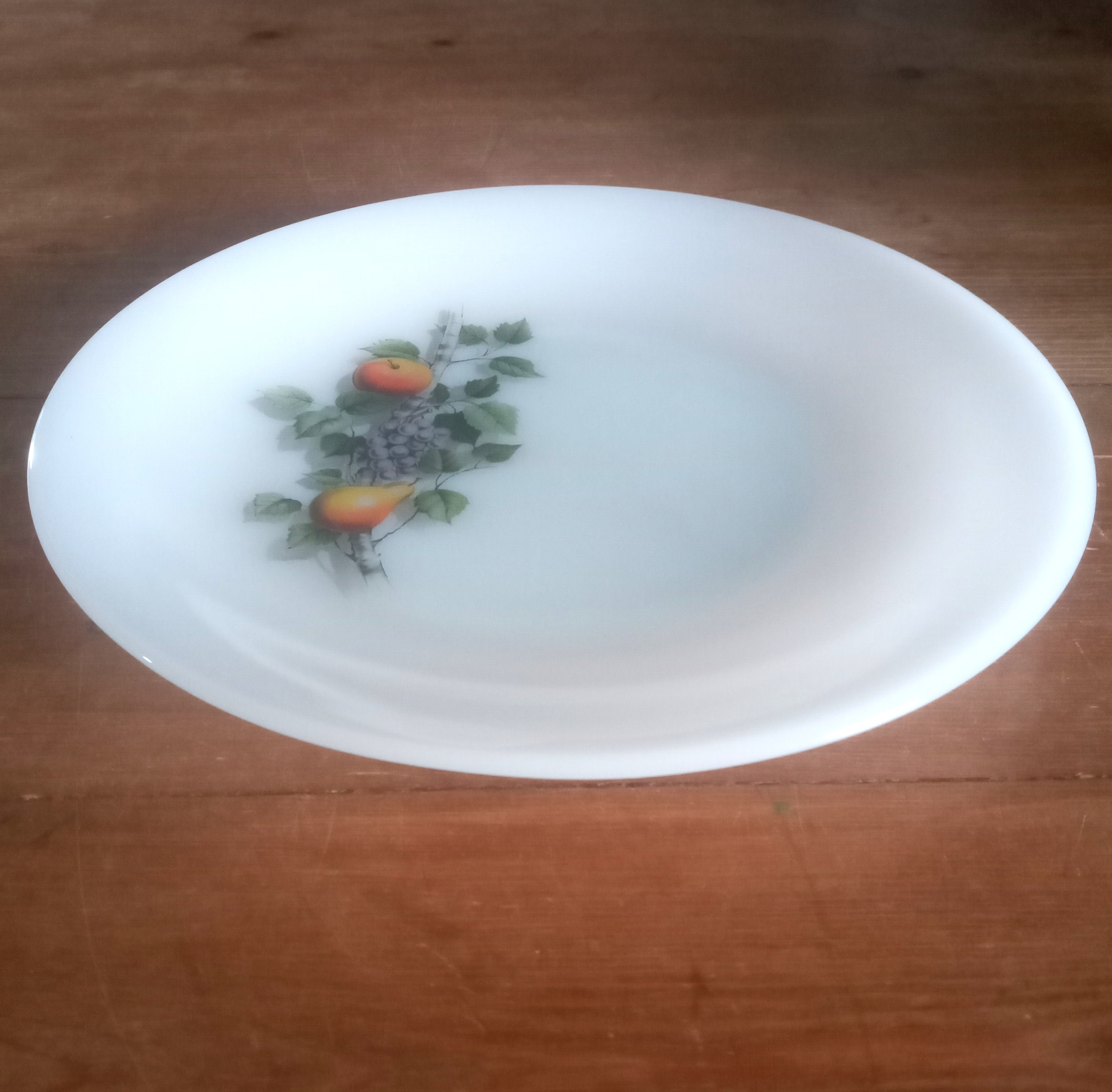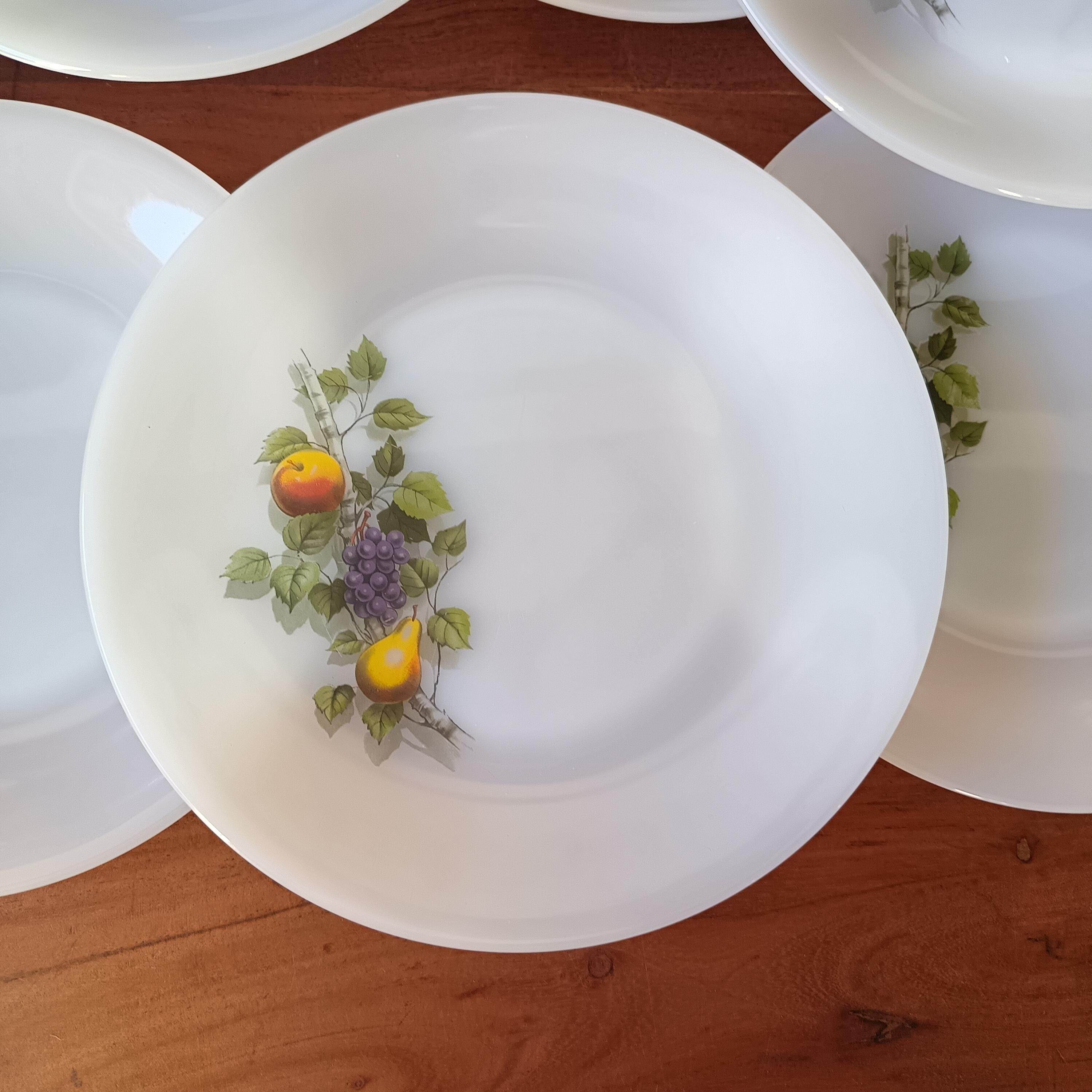 8 vintage ARCOPAL brand milk glass plates from the Arques glassworks, "Fruits of France" pattern, dating from the 1960s.