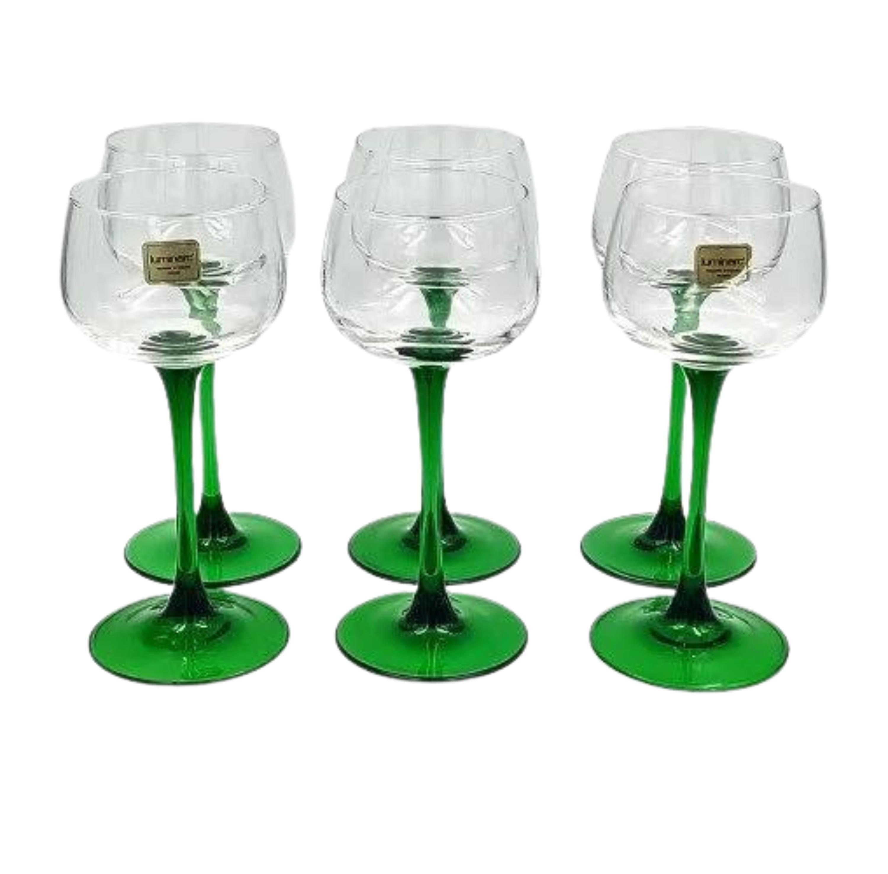 6 pretty stemmed glasses in a very beautiful emerald green. Made in France in the 1980s by Luminarc.