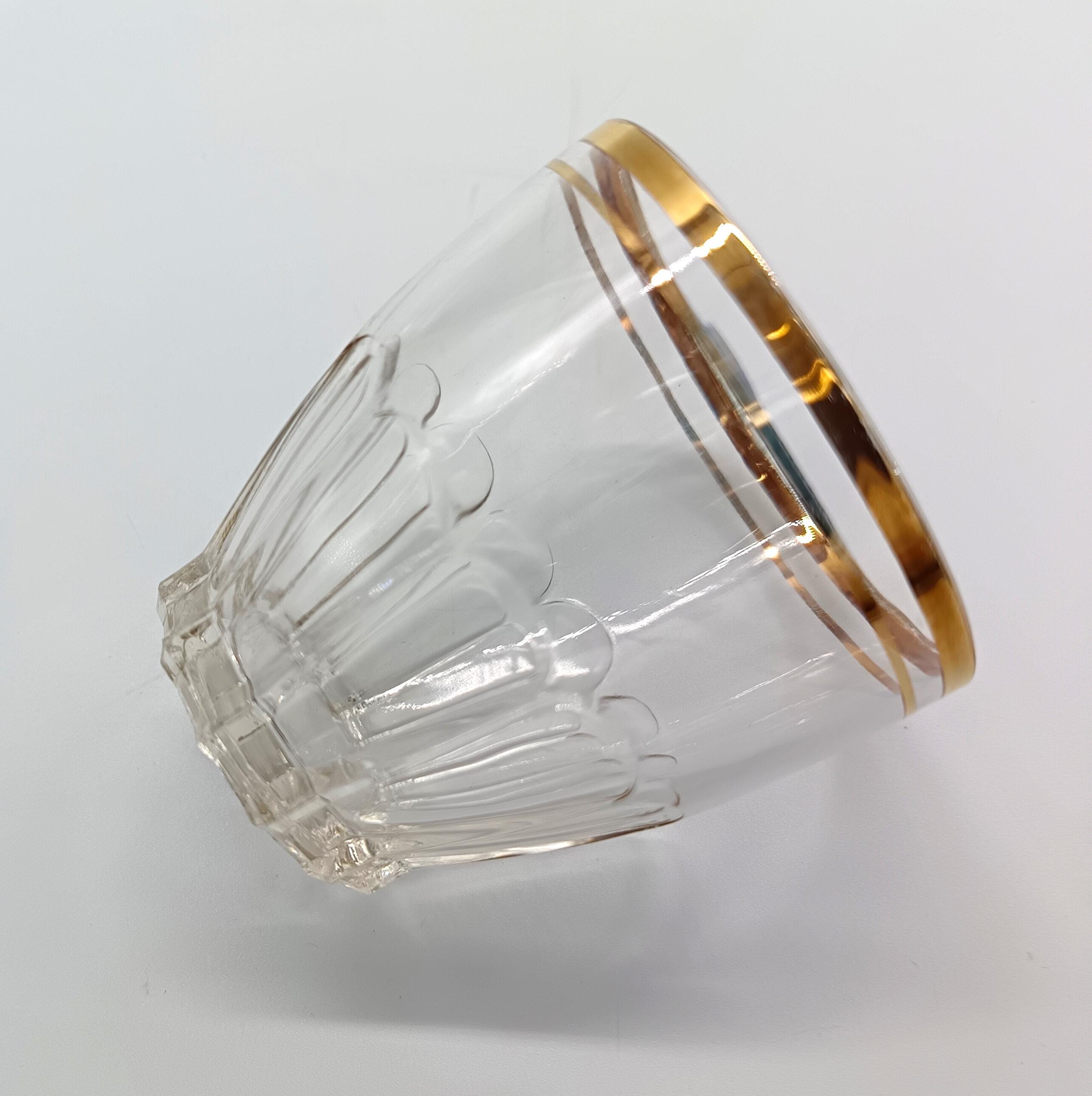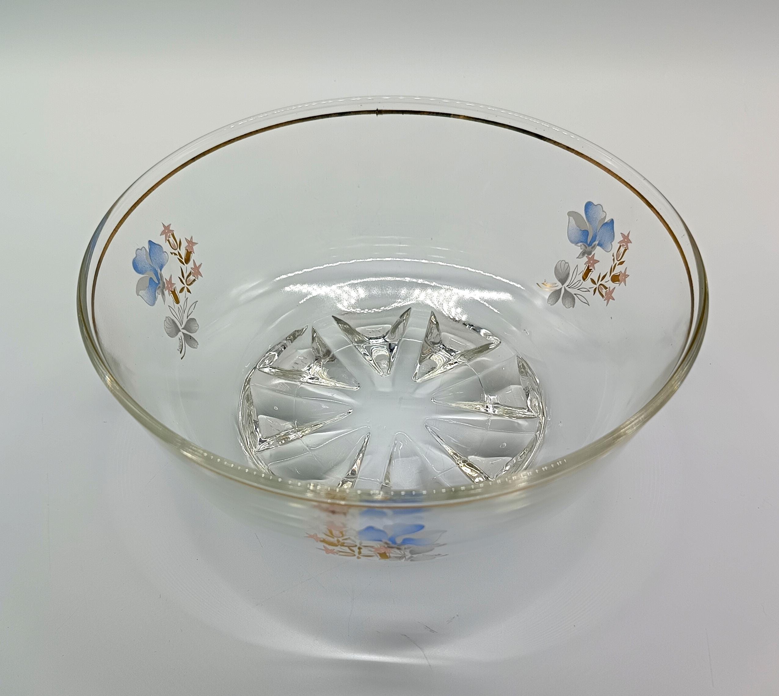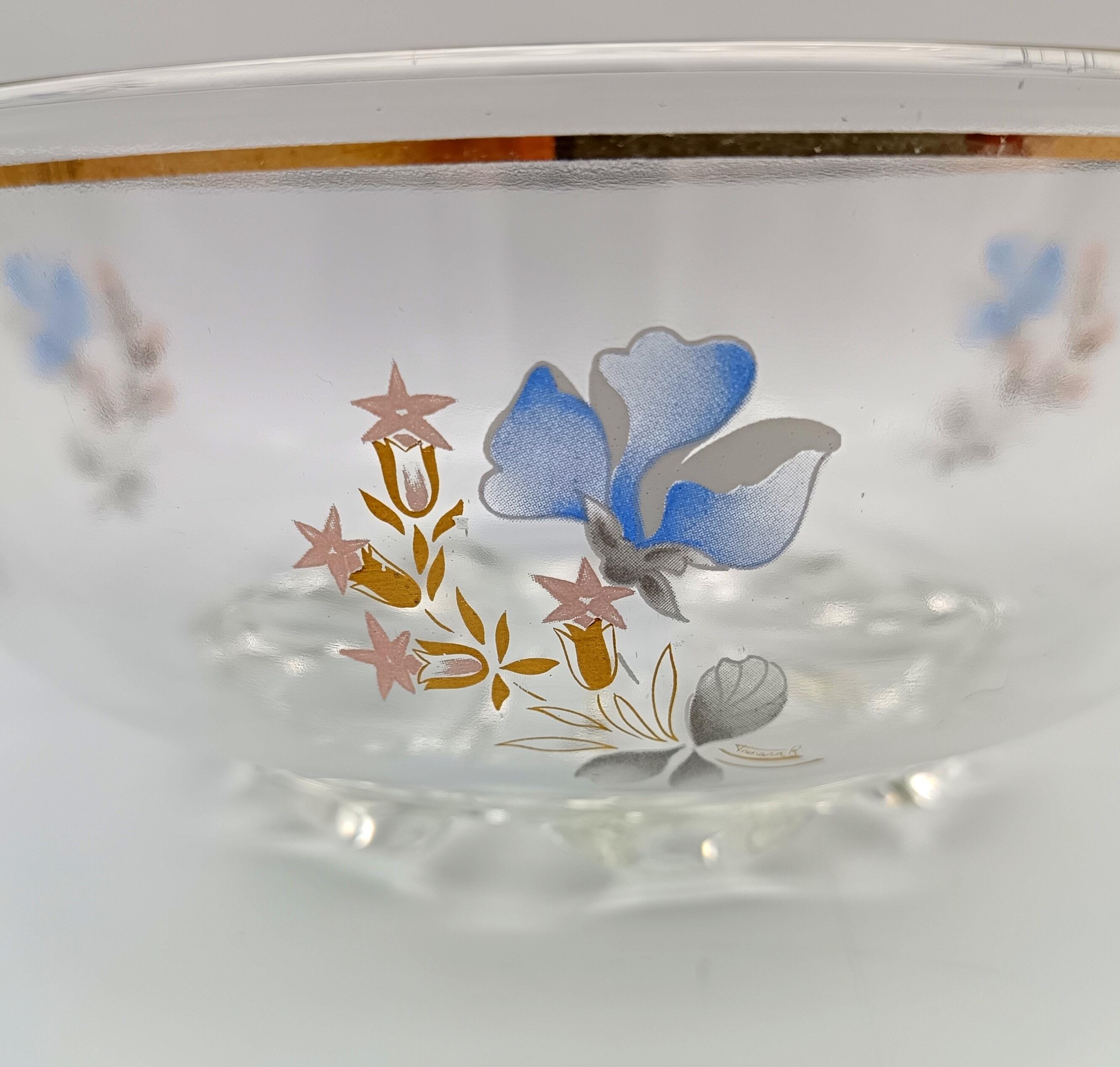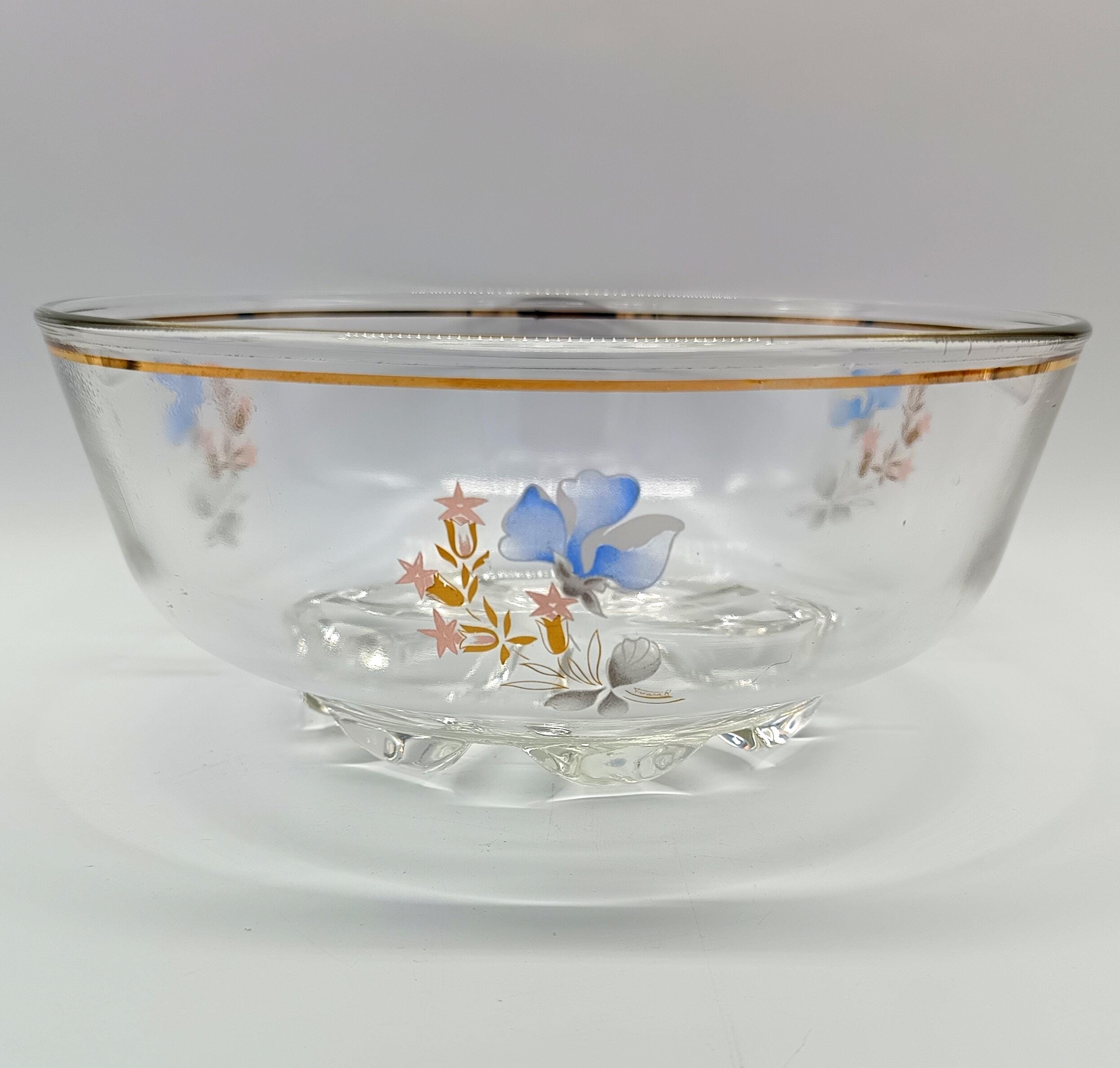 A set comprising a salad bowl and five glass bowls. The salad bowl, made in Italy in the 1960s, features a pretty floral design around the rim and a gold border. It is accompanied by five vintage glasses from the 1950s with a lovely design.
