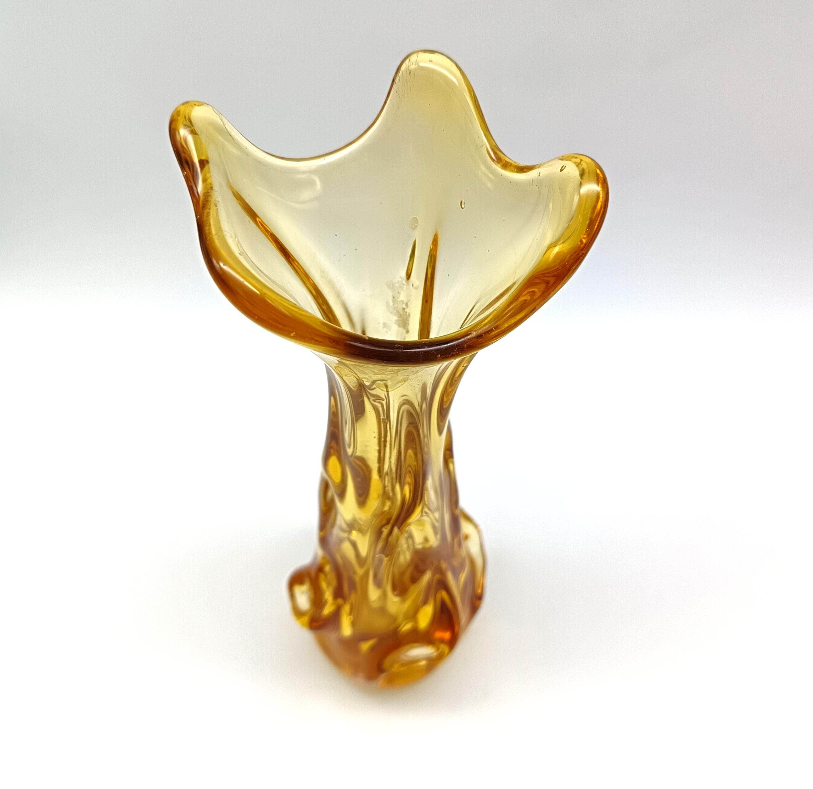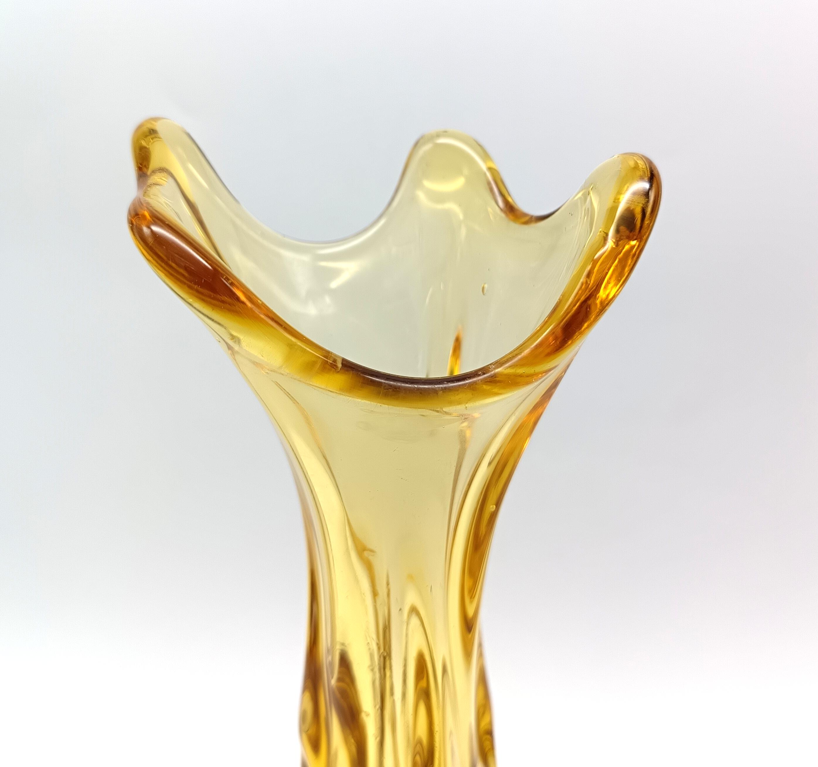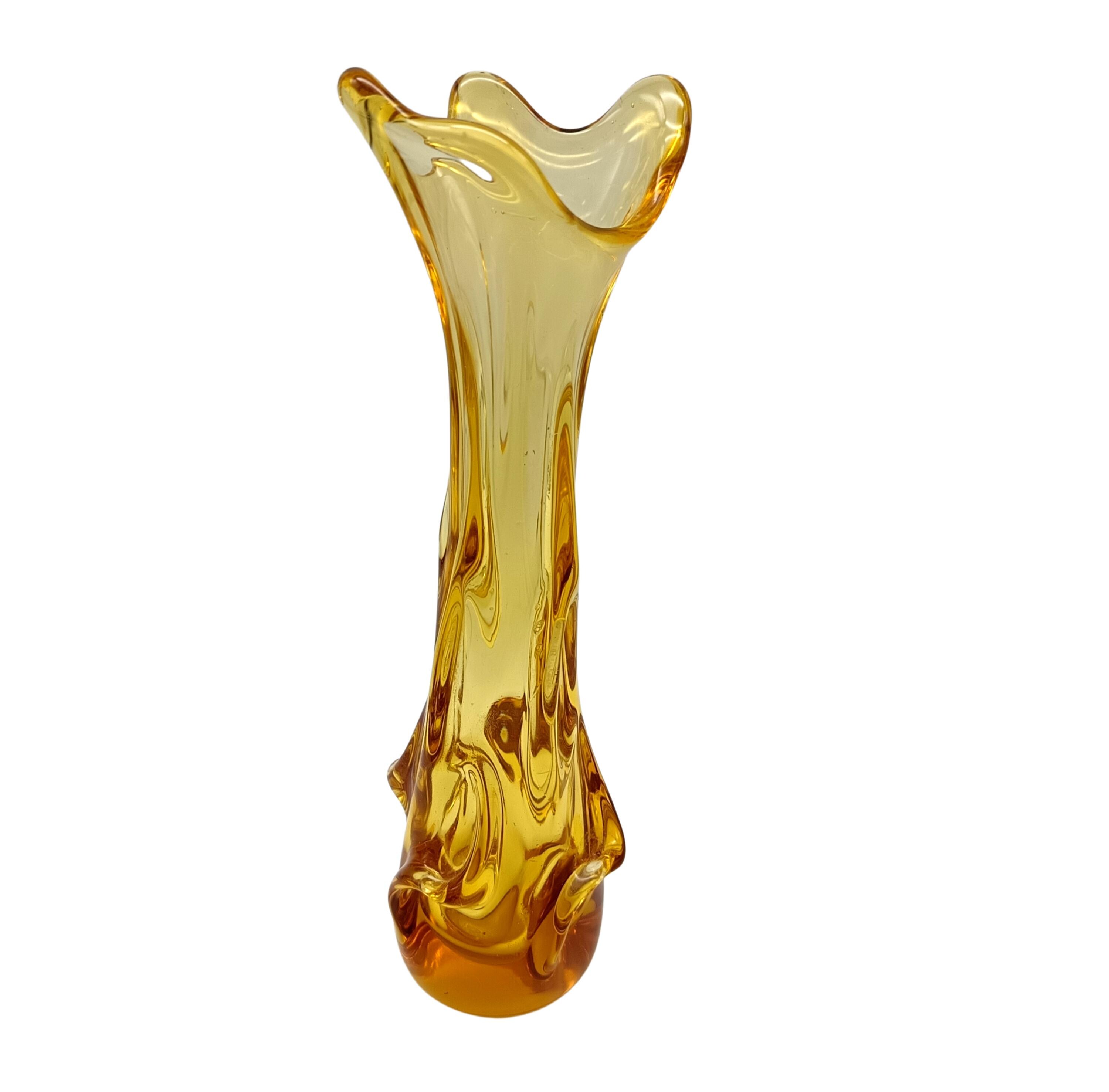 A magnificent vase made of thick yellow crystal that elongates upwards with a four-fingered open mouth. The color is absolutely stunning and will be beautifully displayed near a light source. The vase is heavy and stable, and the glasswork on the base is exquisite.