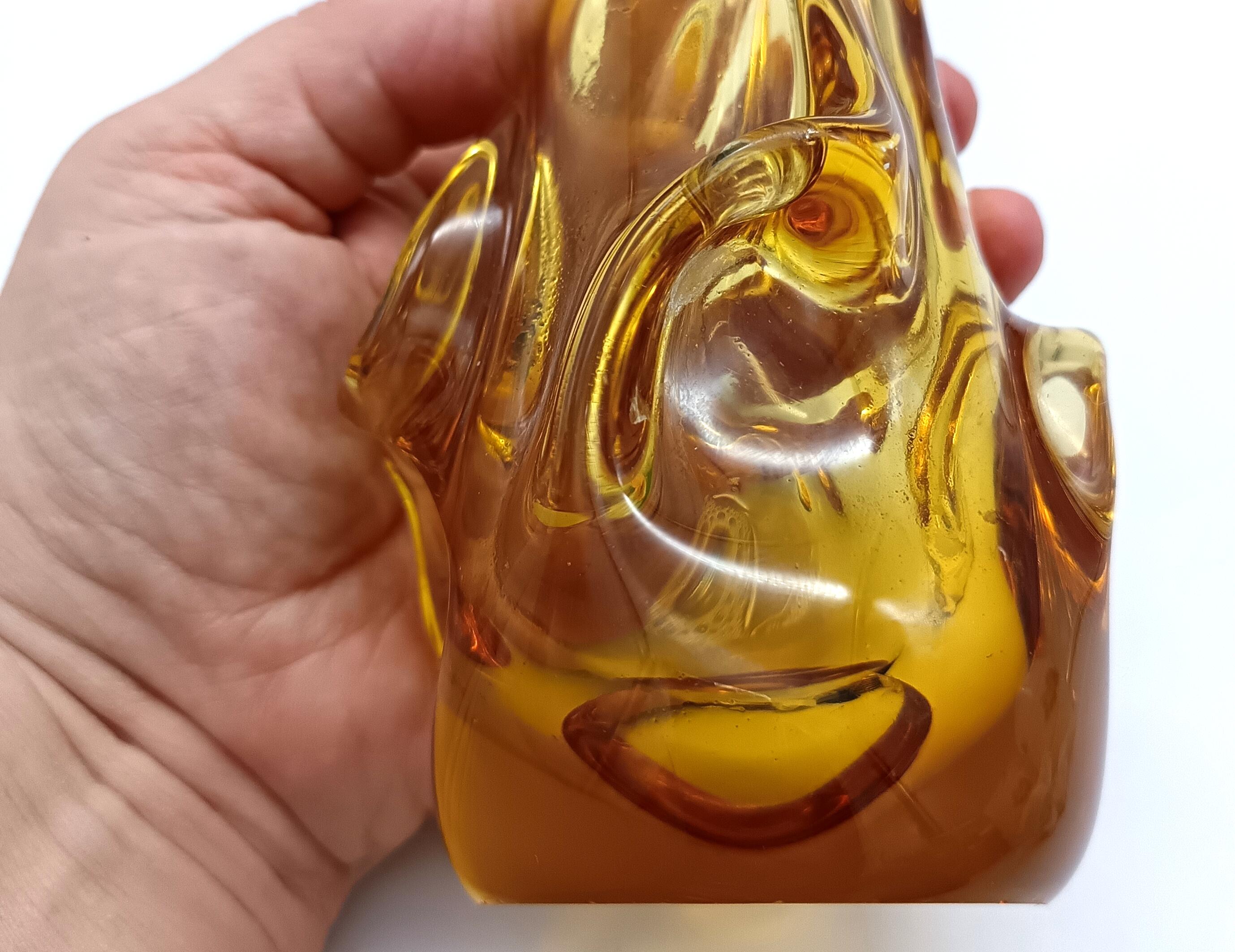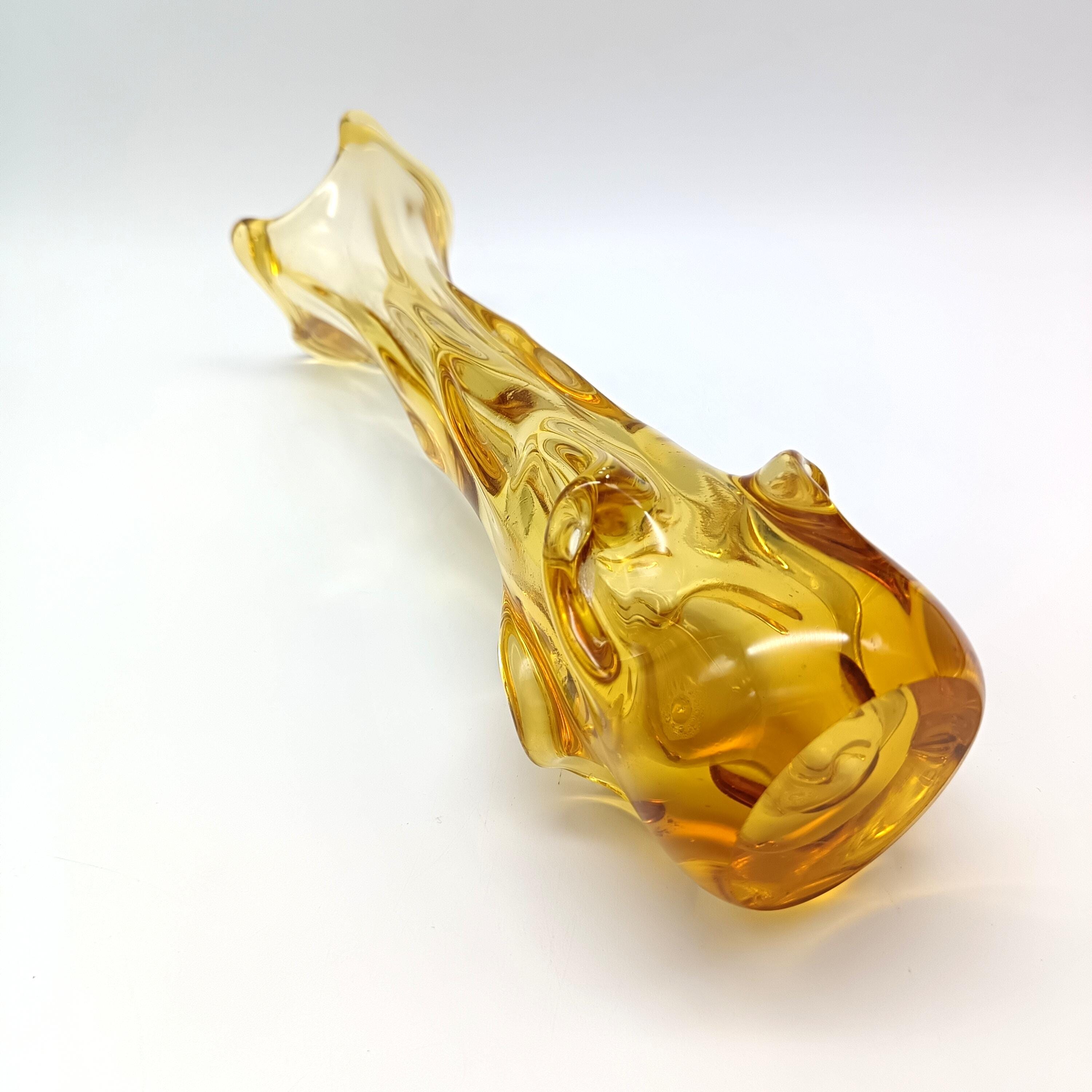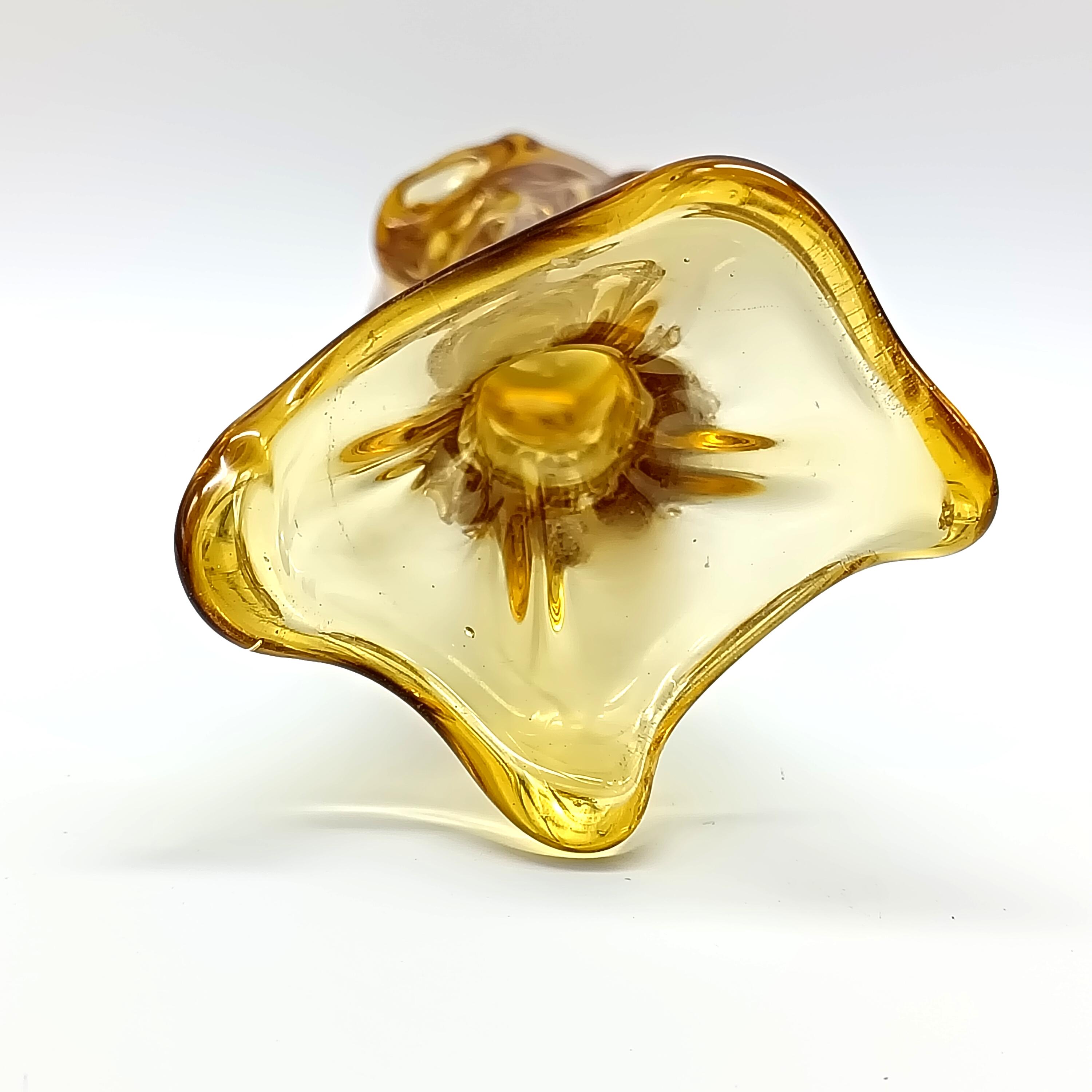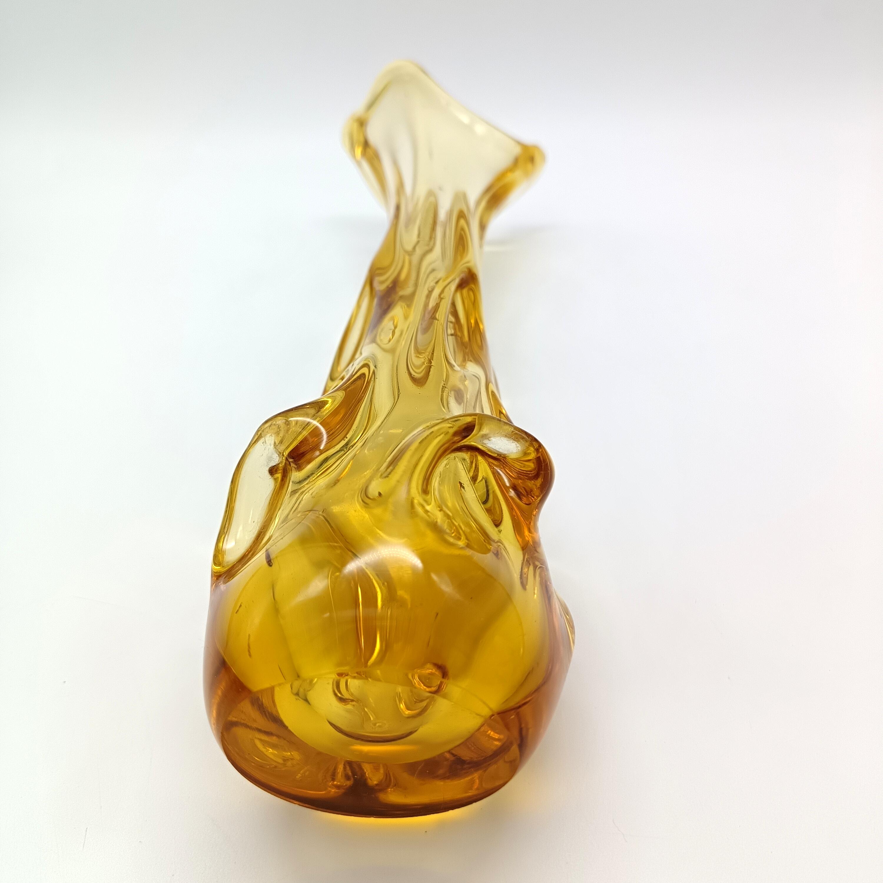 A magnificent vase made of thick yellow crystal that elongates upwards with a four-fingered open mouth. The color is absolutely stunning and will be beautifully displayed near a light source. The vase is heavy and stable, and the glasswork on the base is exquisite.