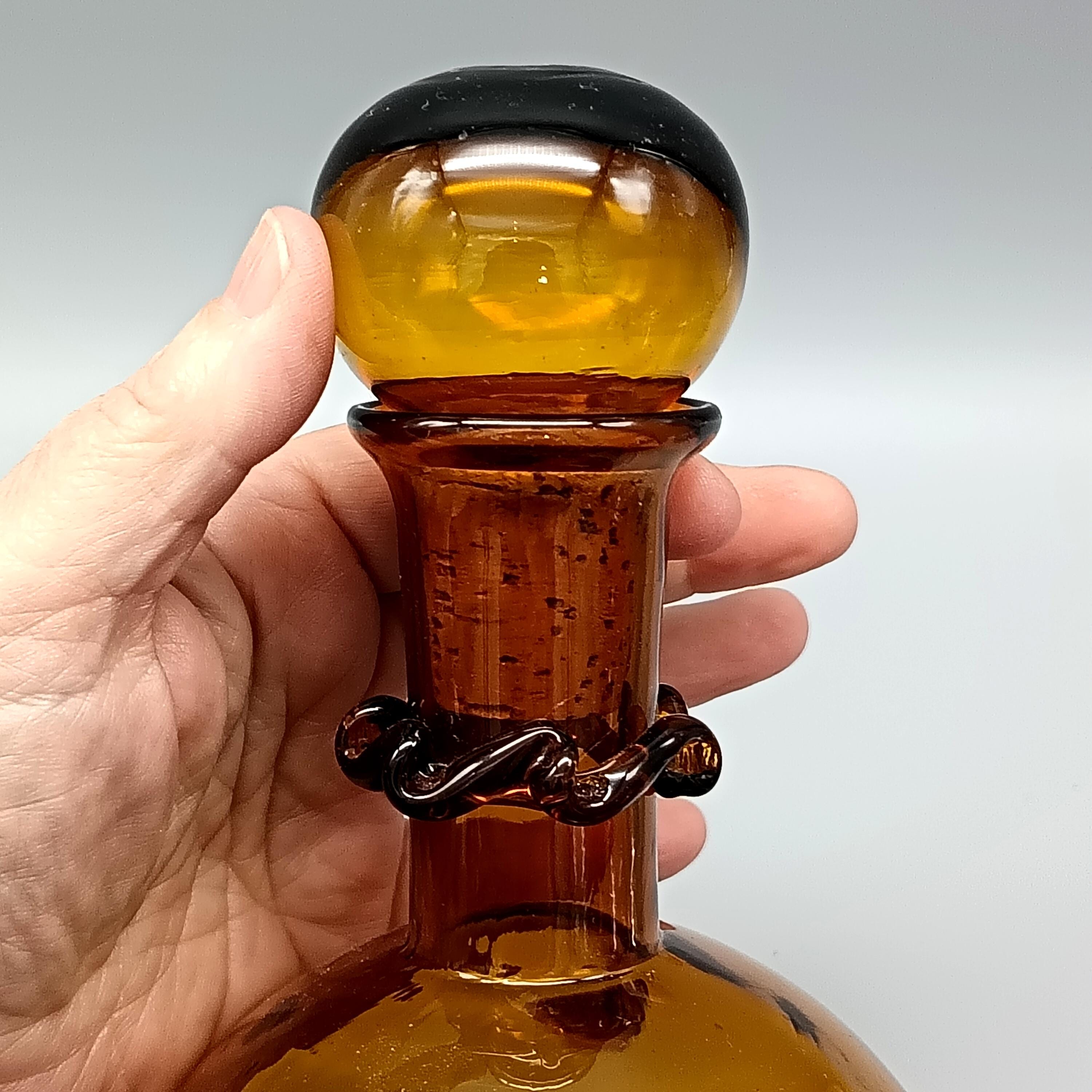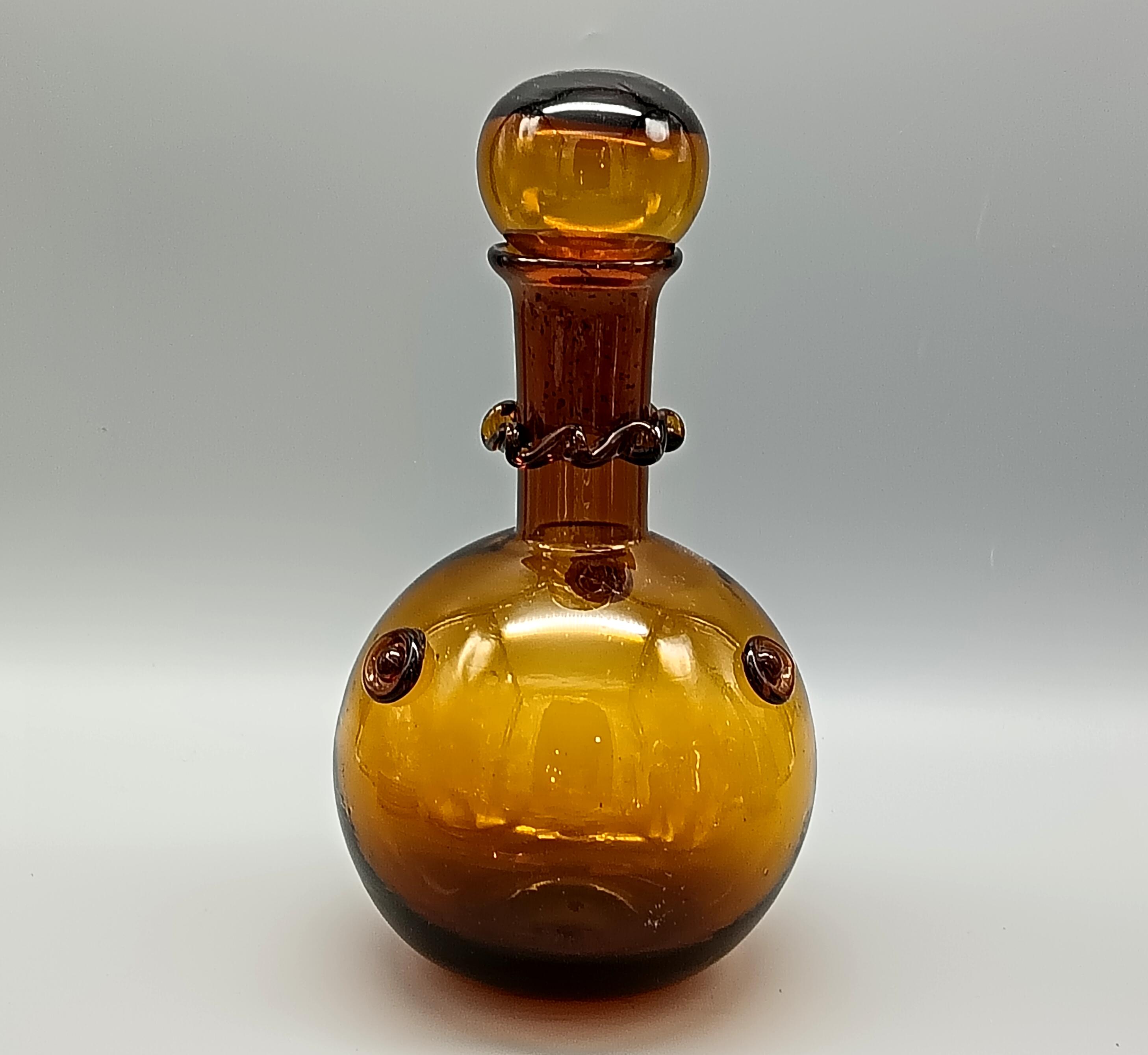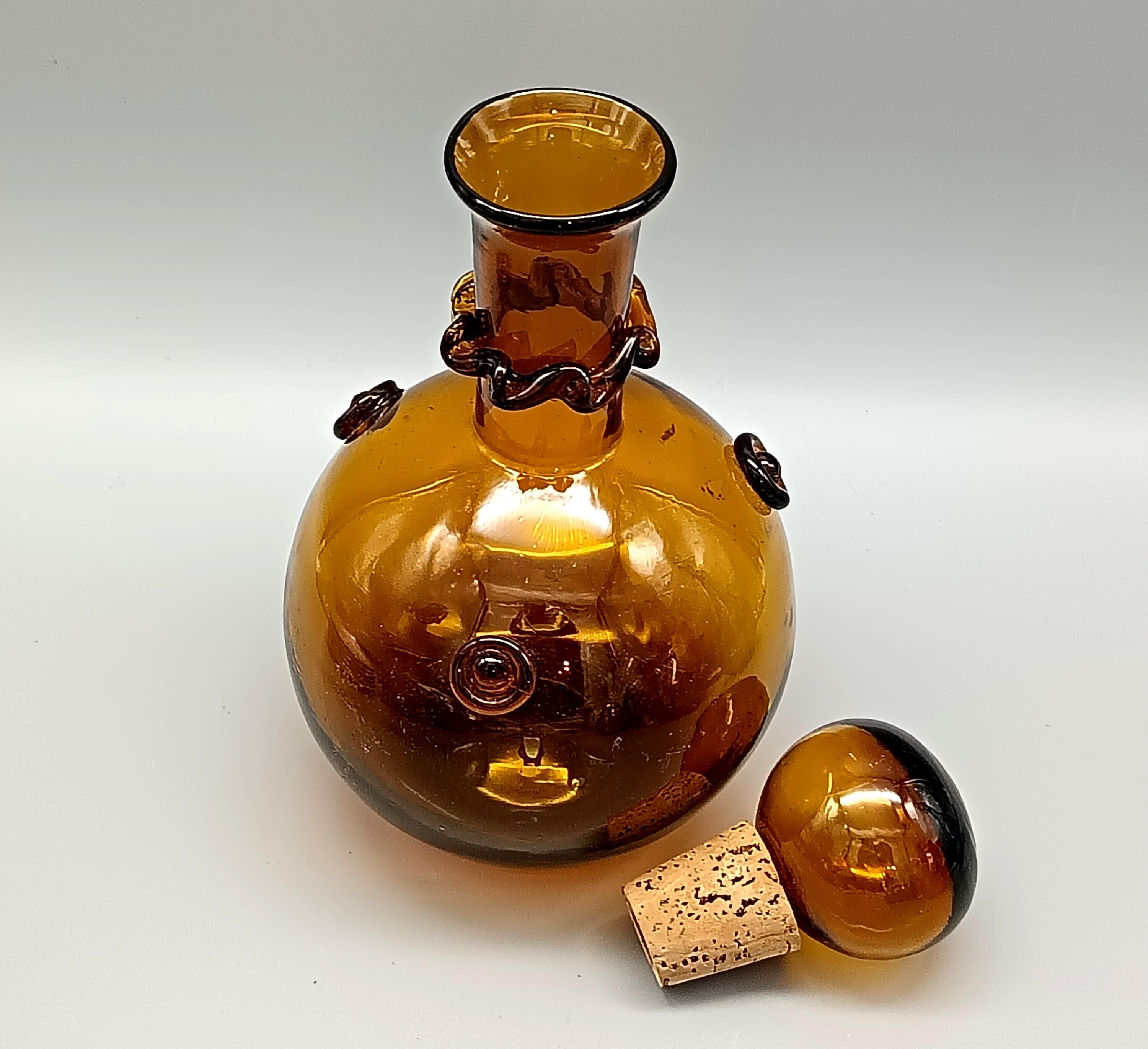 A very pretty hand-blown glass carafe in a lovely brown color. It's charming with its ball-shaped stopper, a small collar in the middle of the neck, and little discs around the rim.