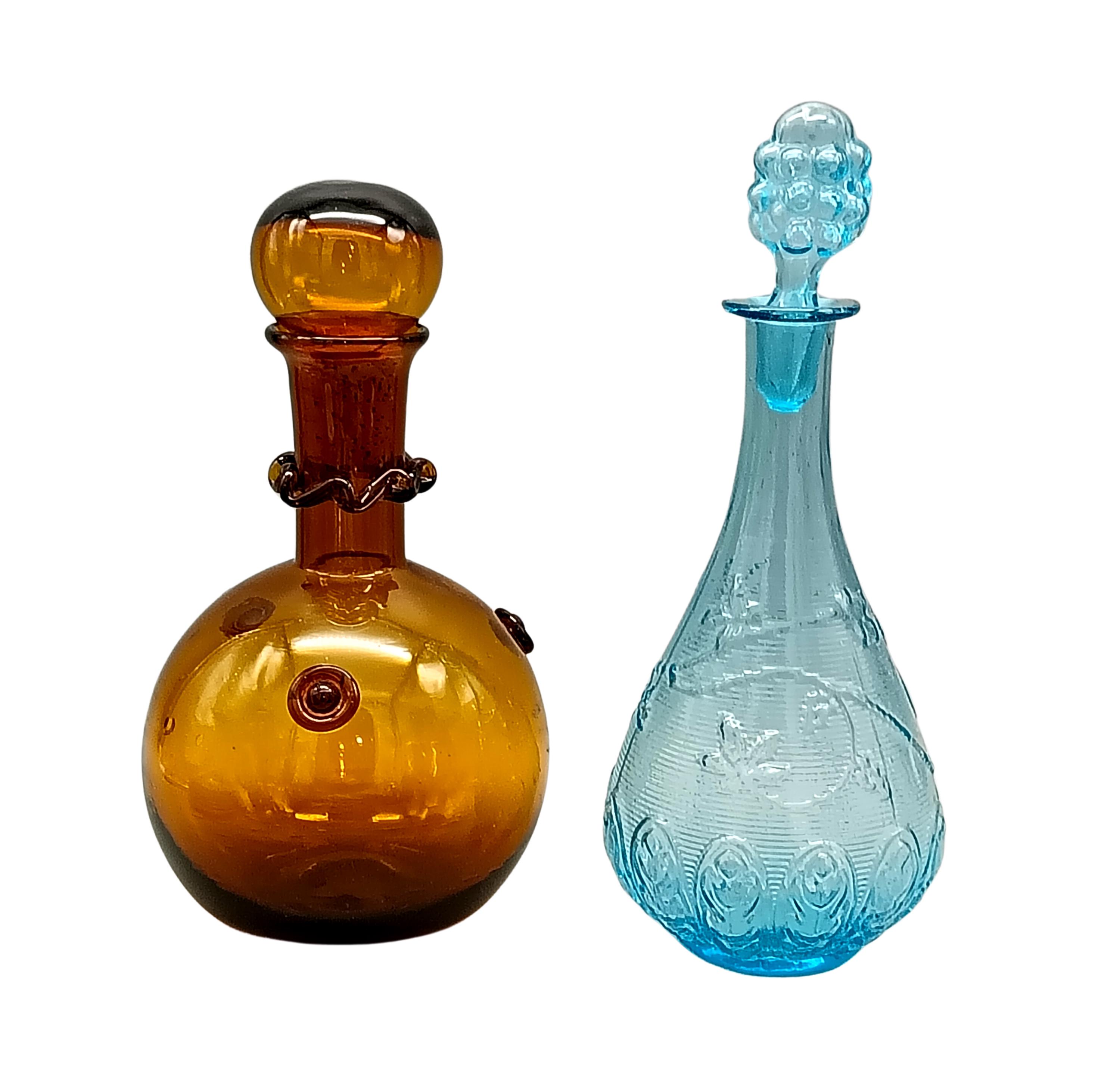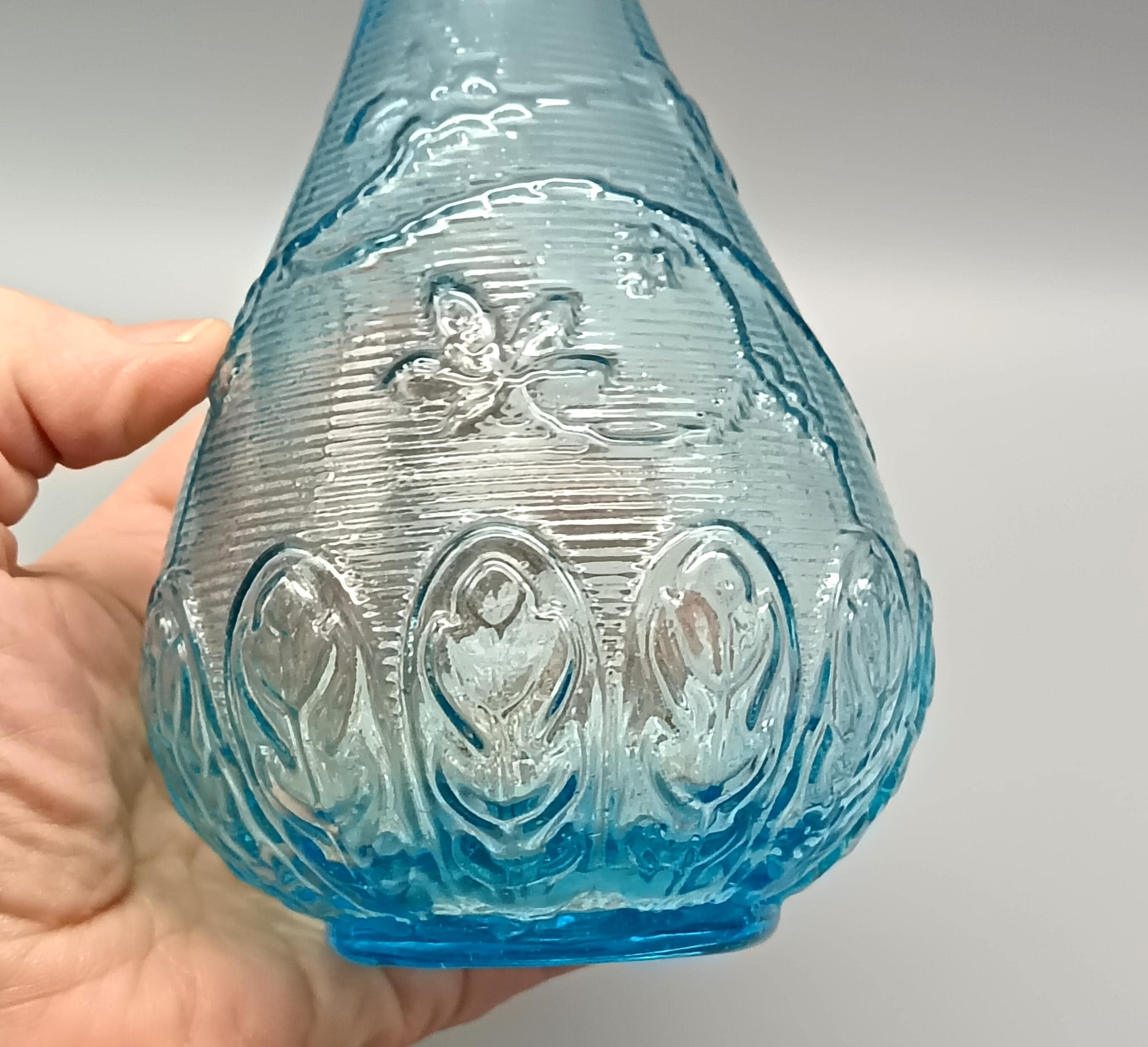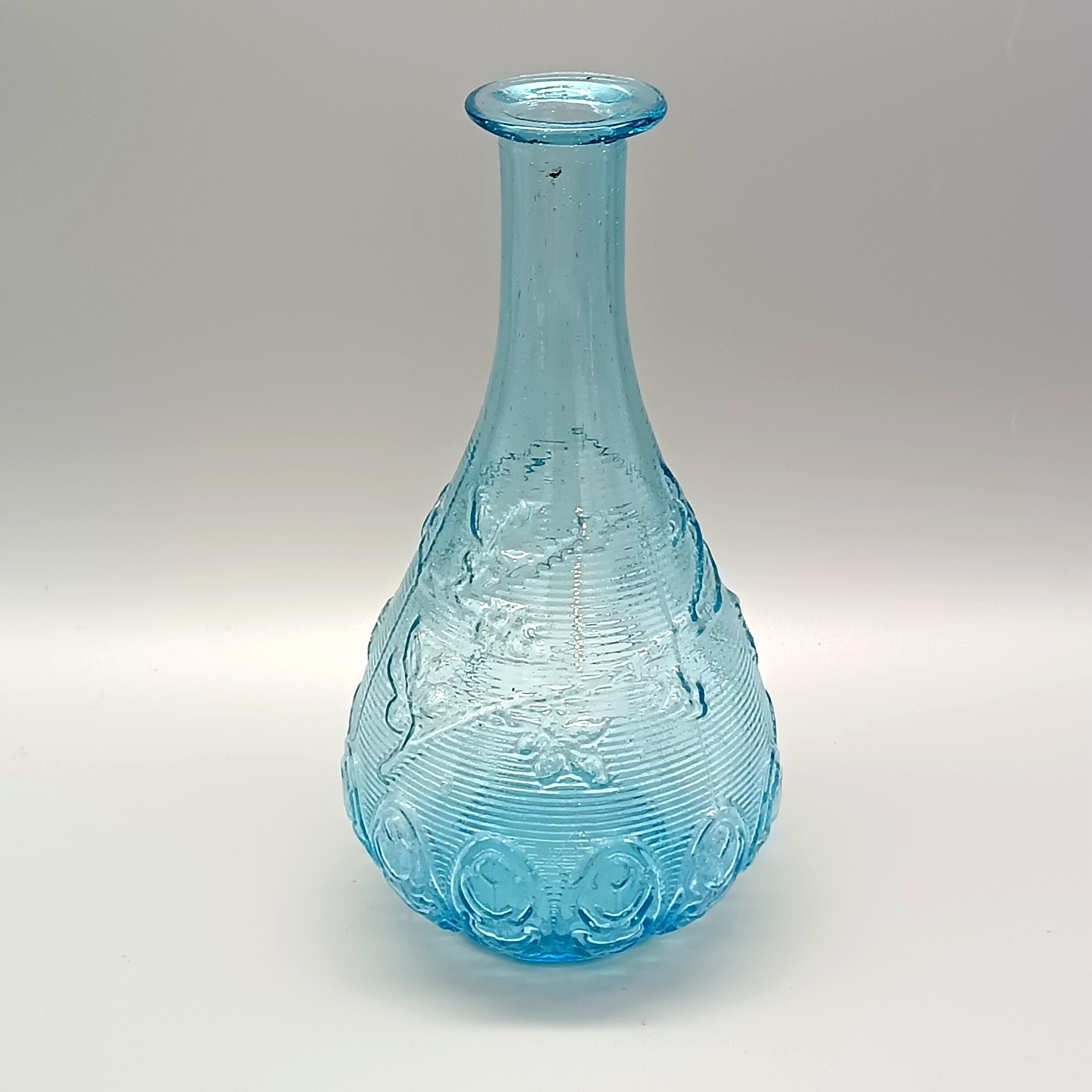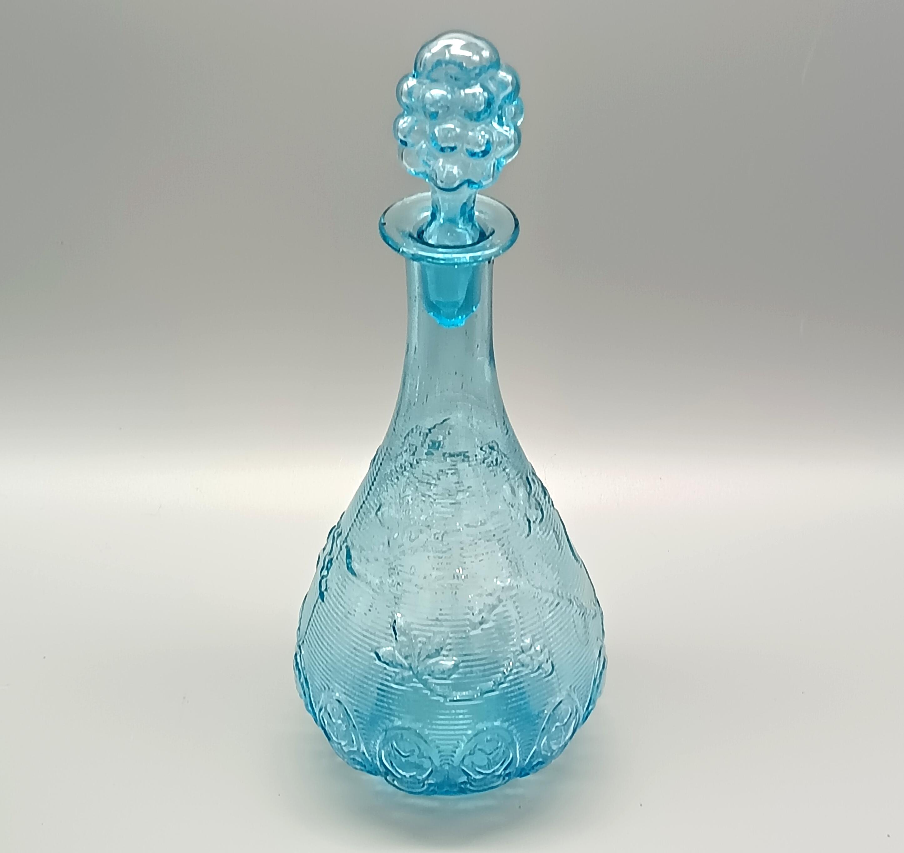 A pretty little molded pressed glass carafe dating from the 1960s. It has charming patterns around the rim and a beautiful blown glass stopper.