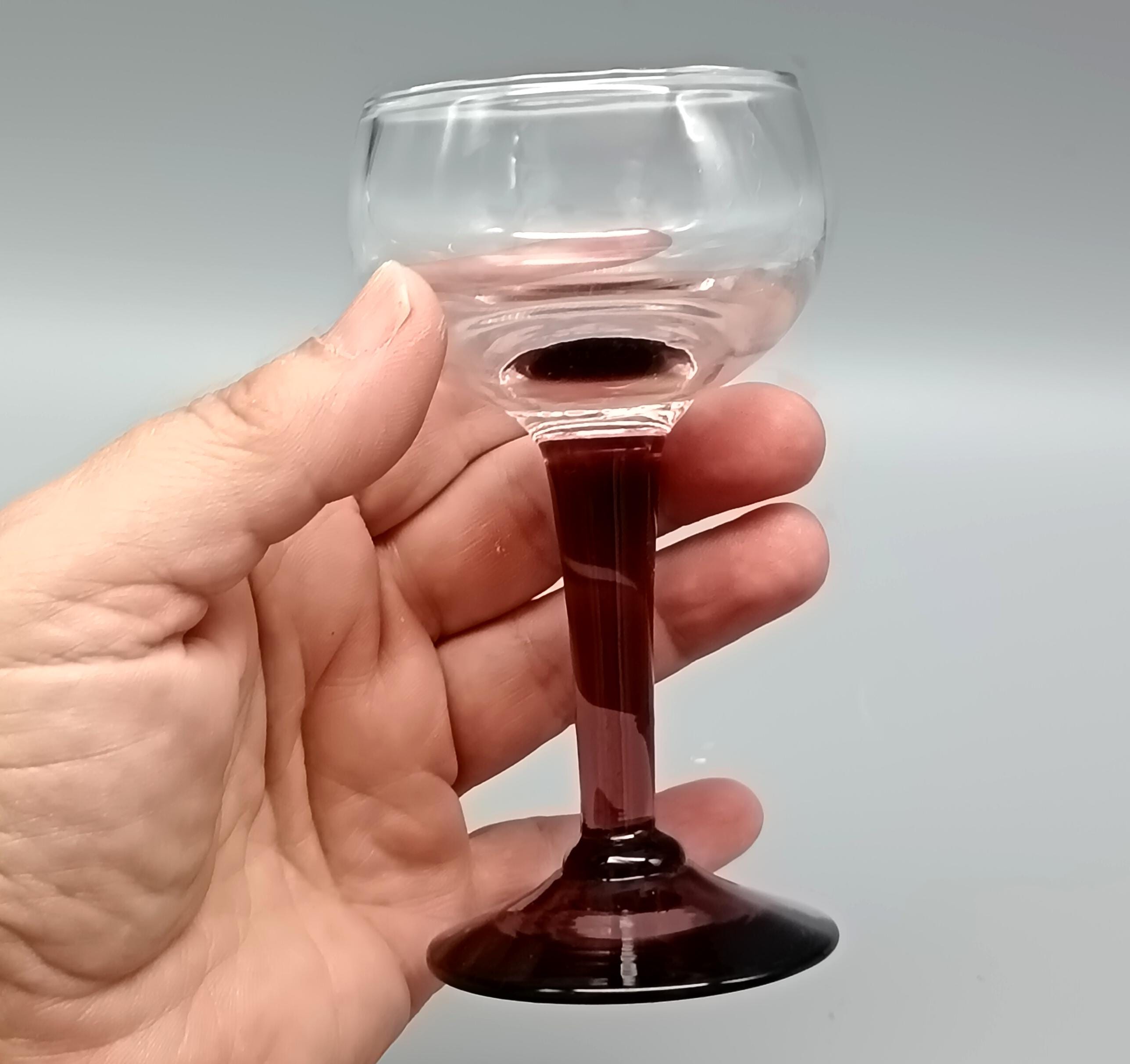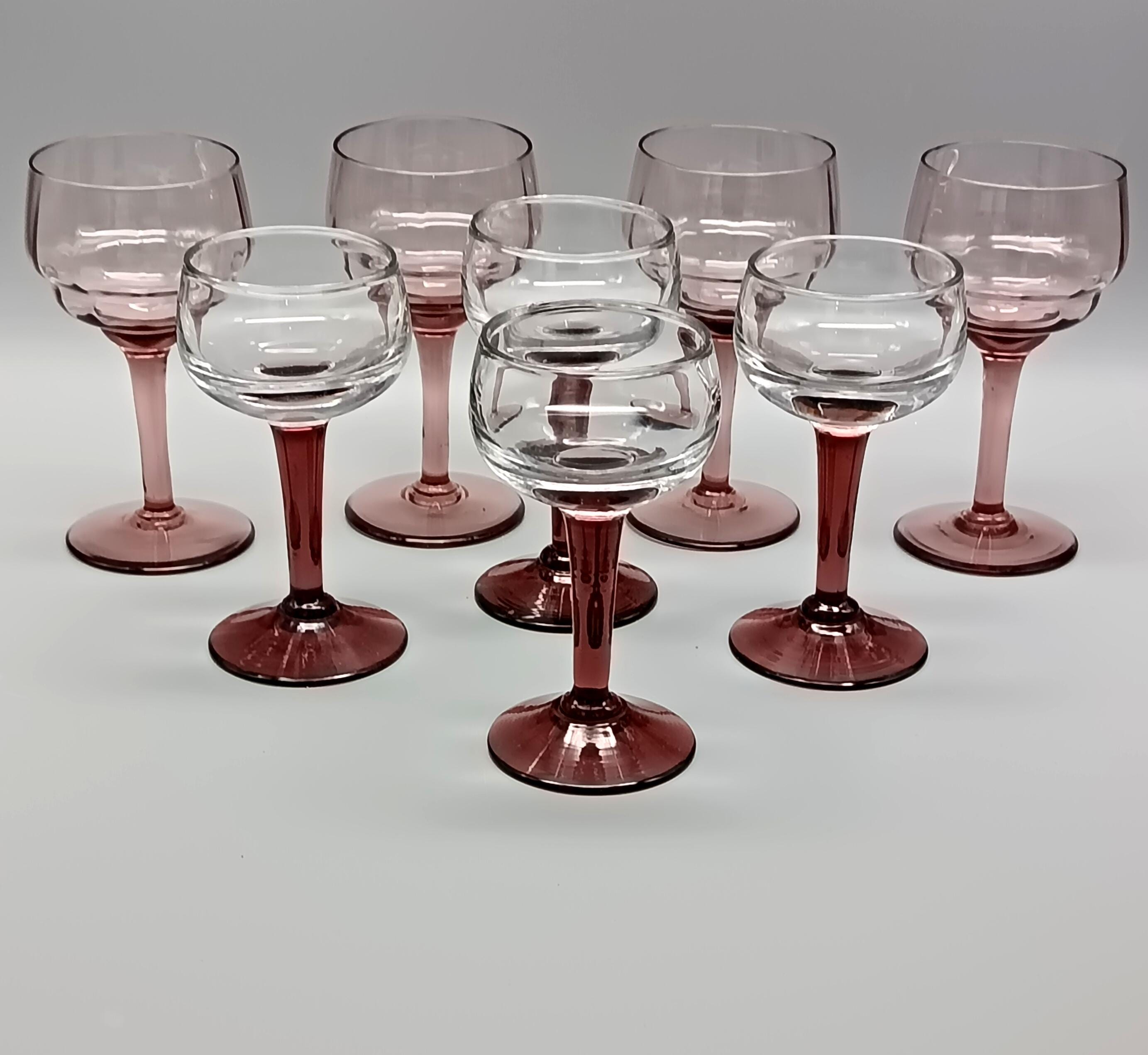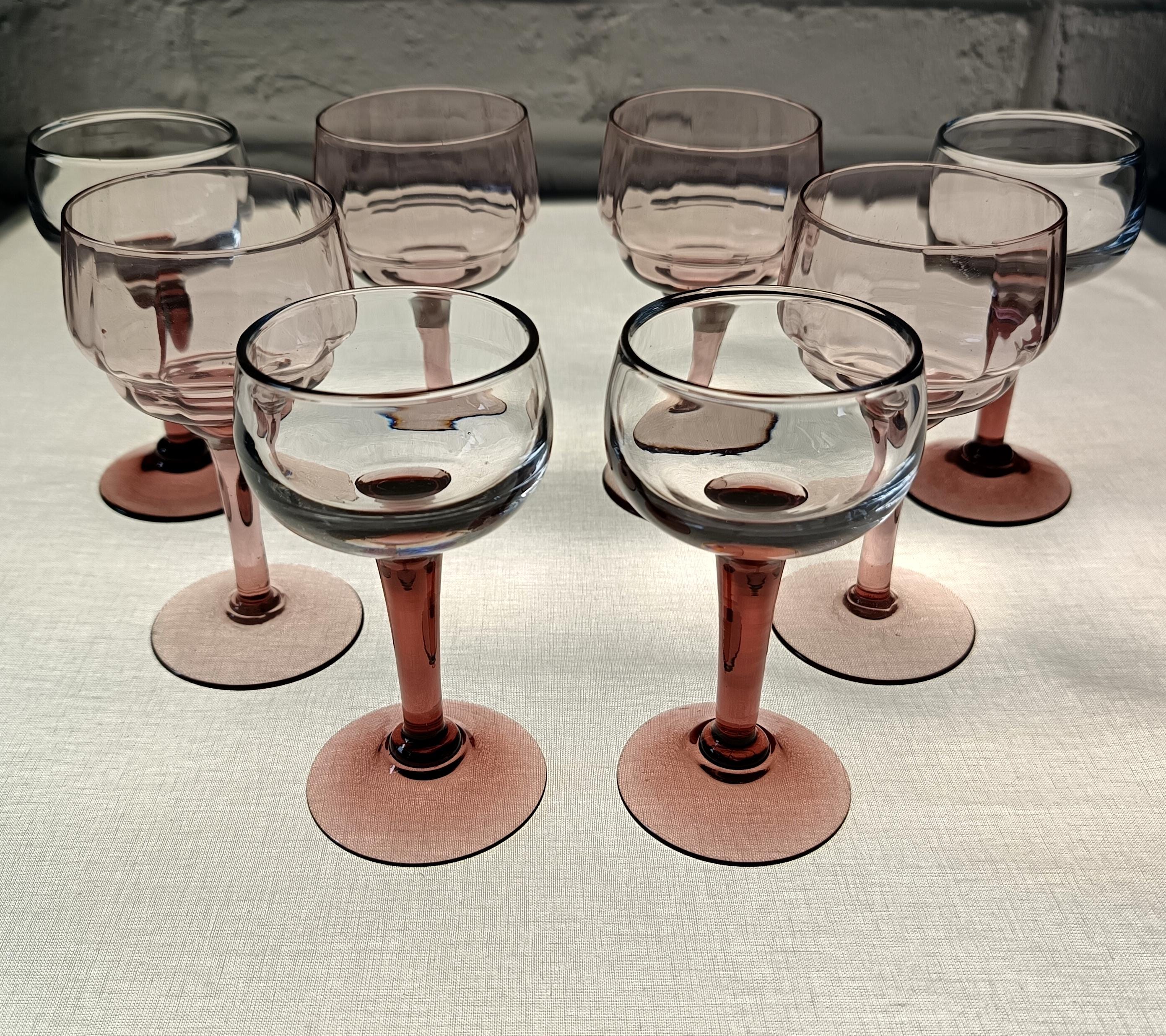 The first four have a foot and stem in a pretty plum color with a thick glass chalice. The other four are also plum colored, with a chalice of an original shape. They will look magnificent on a white tablecloth.