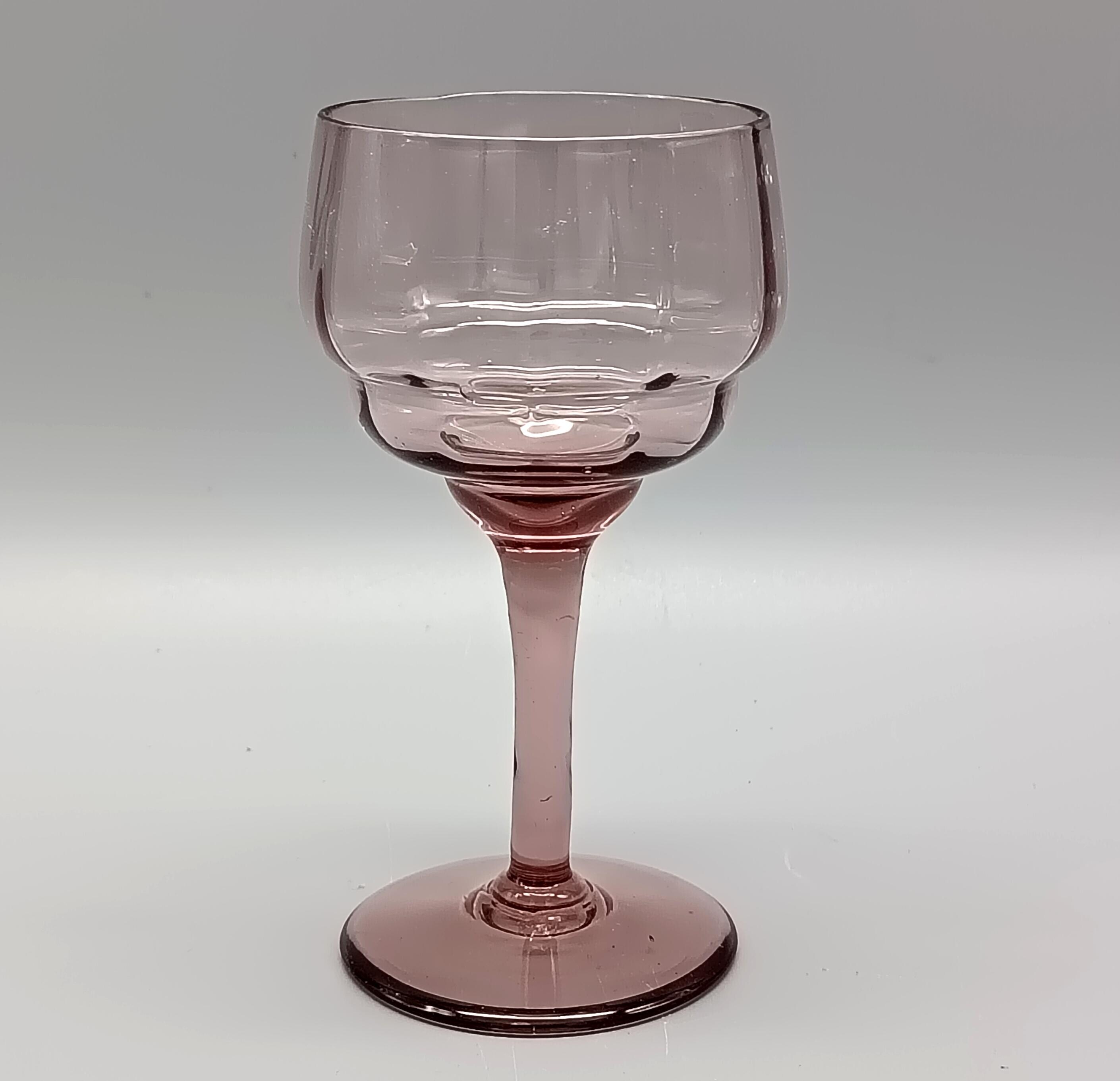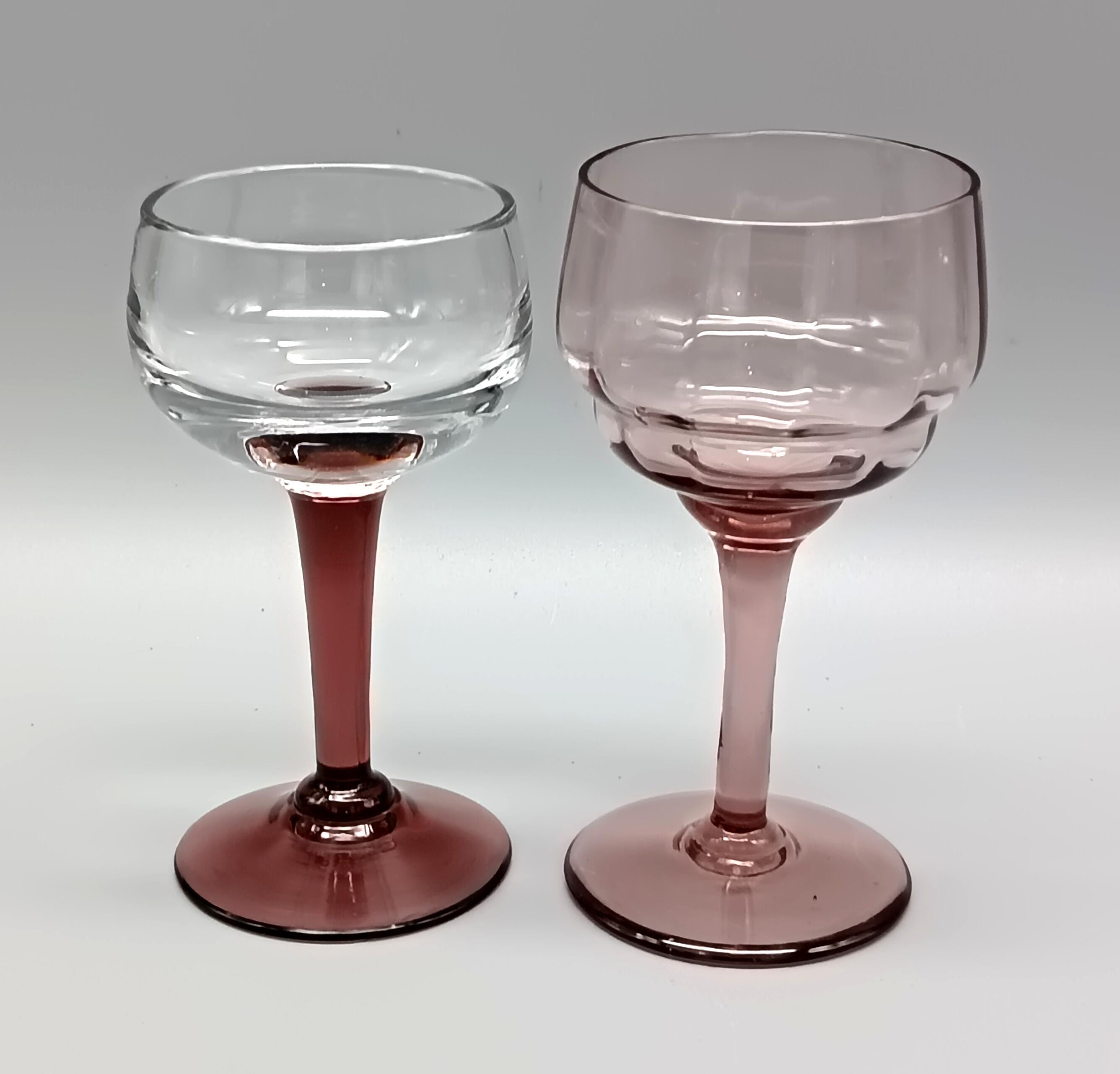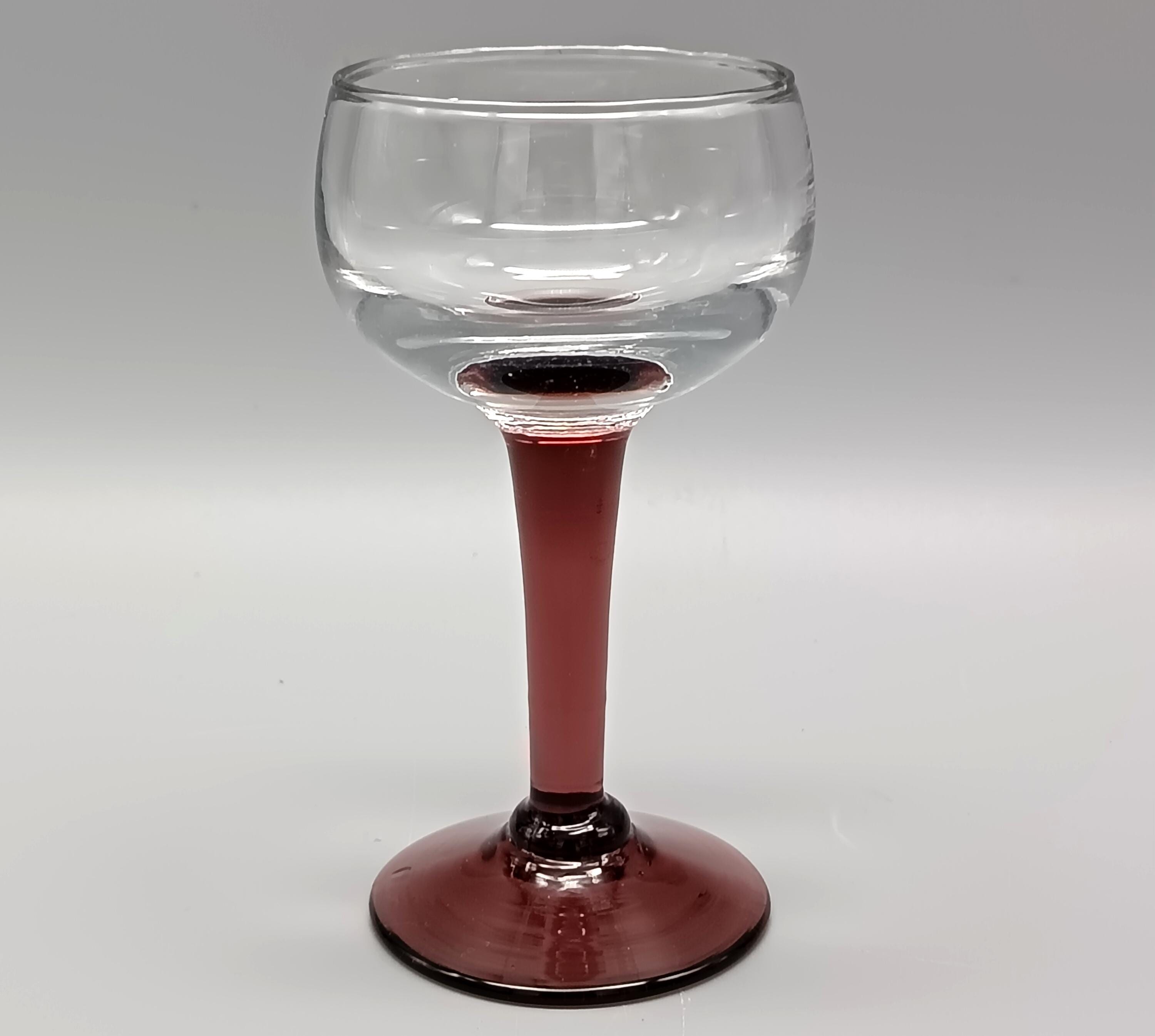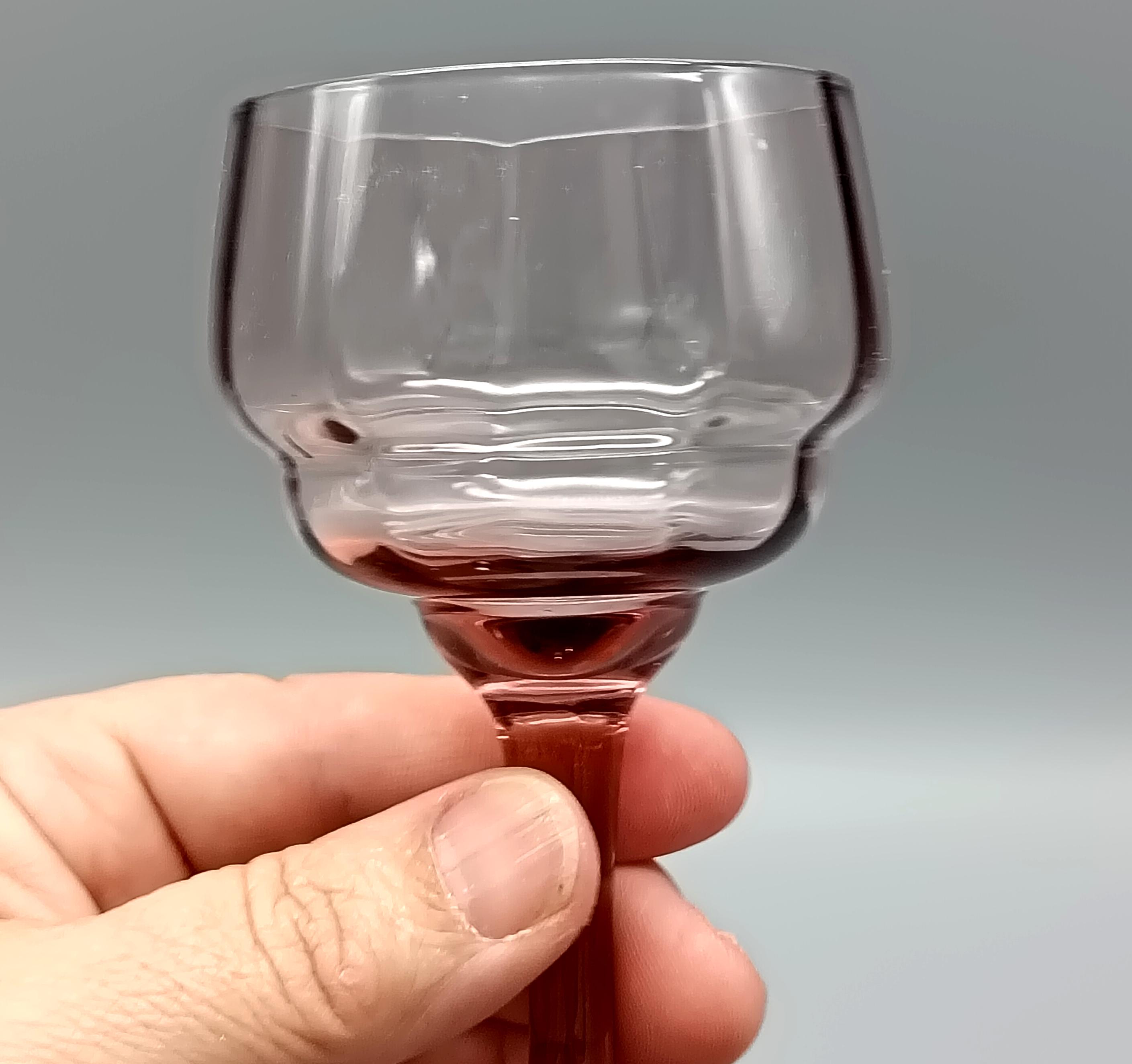 The first four have a foot and stem in a pretty plum color with a thick glass chalice. The other four are also plum colored, with a chalice of an original shape. They will look magnificent on a white tablecloth.