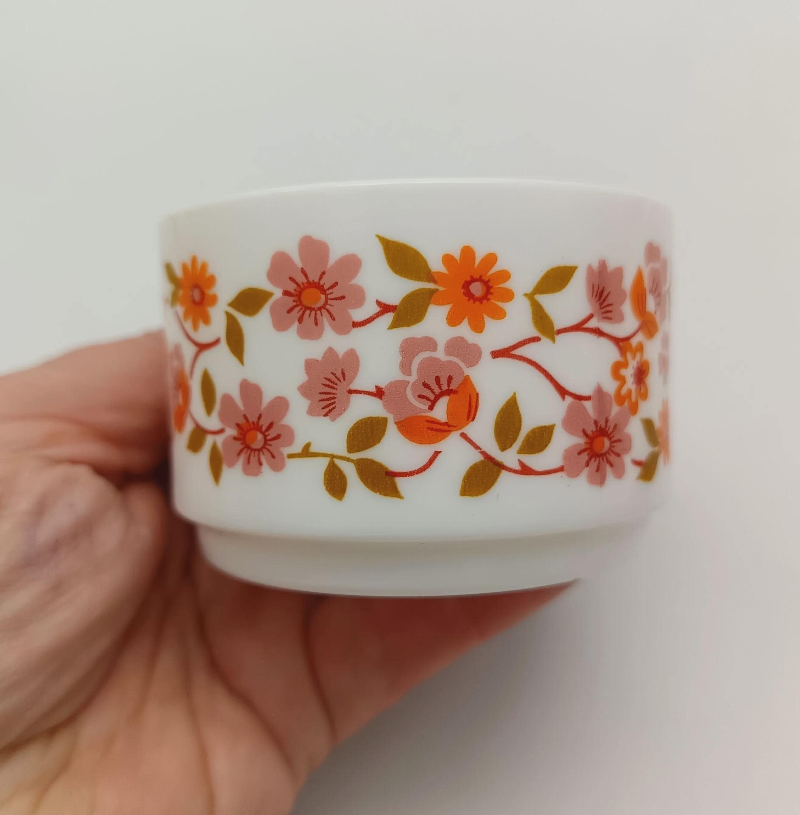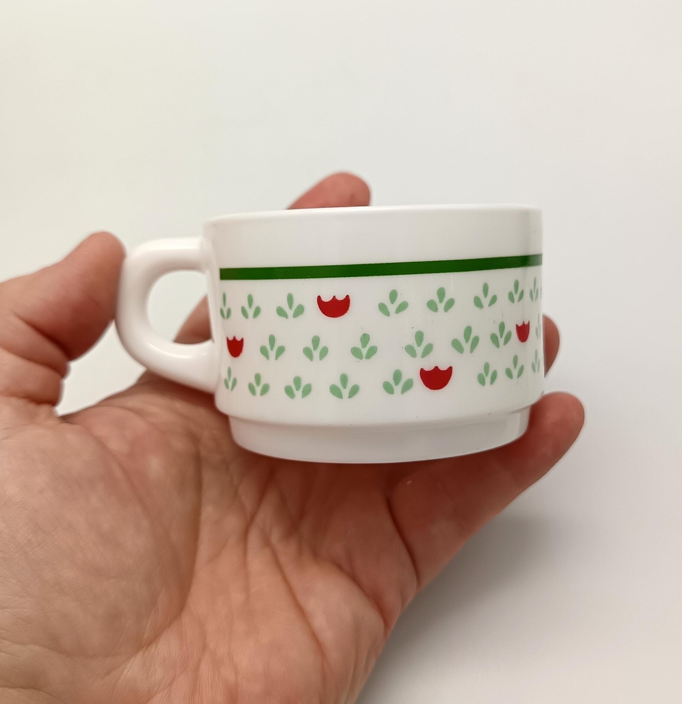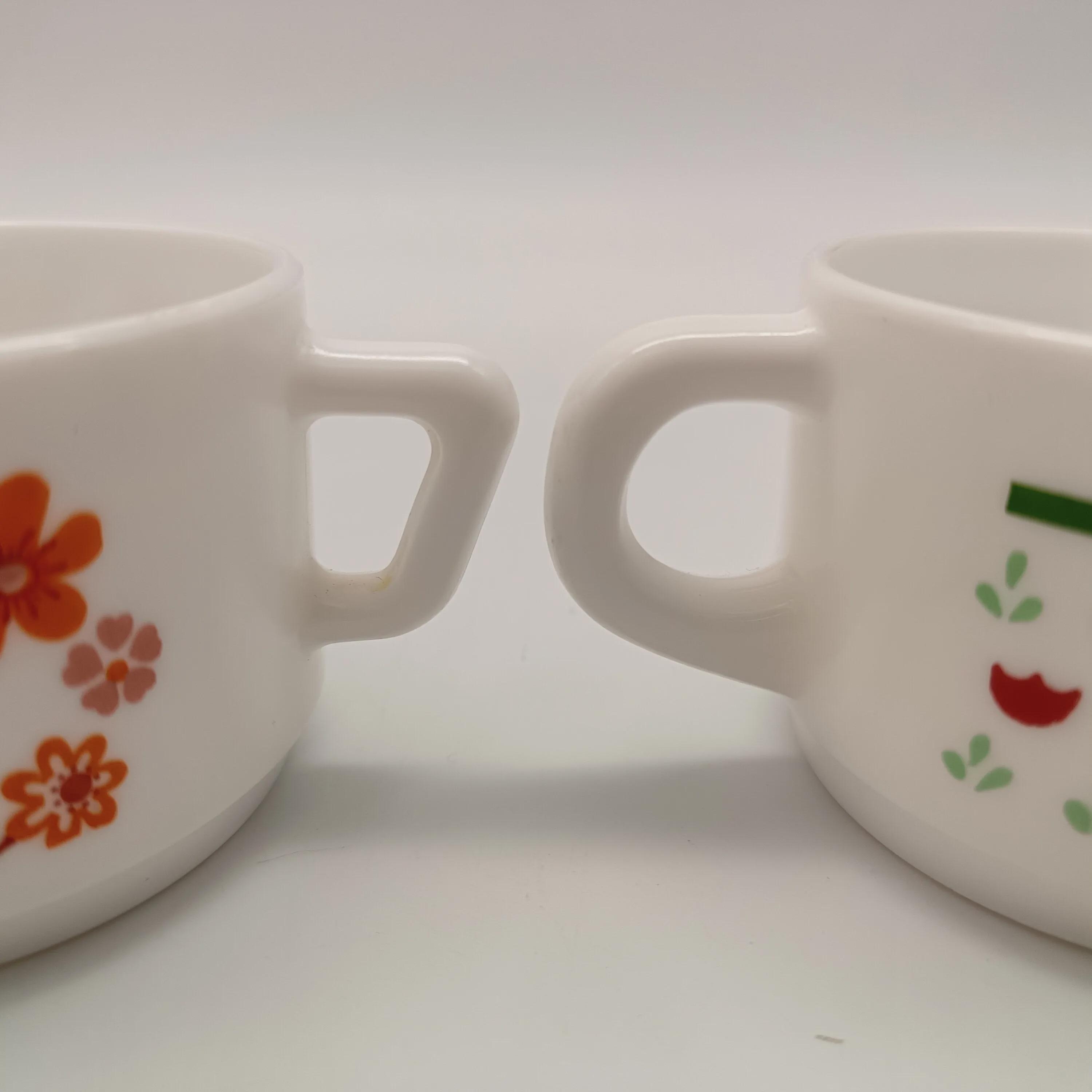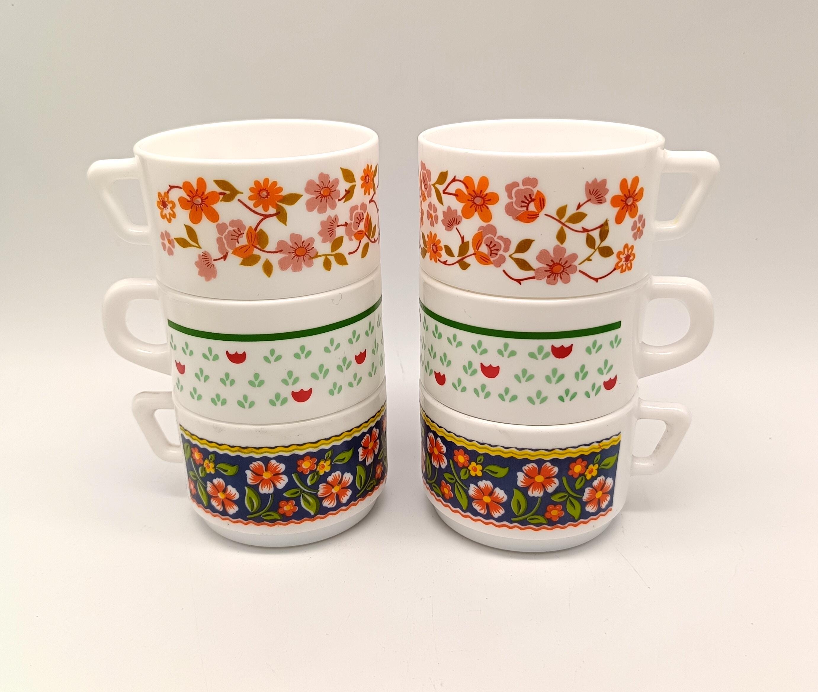 Set of 6 beautiful vintage opaline mugs. The 3 matching designs were made by Luminarc France in the 1970s.