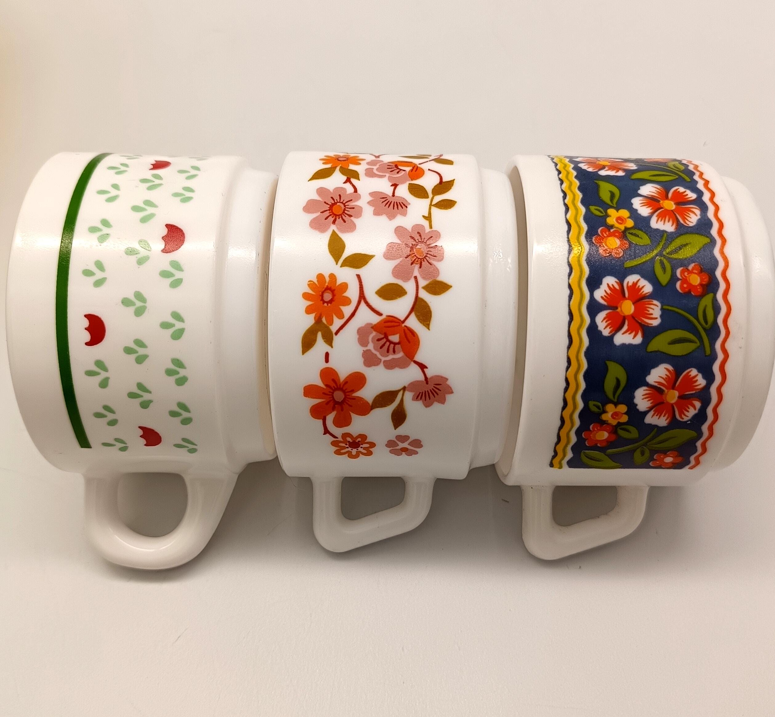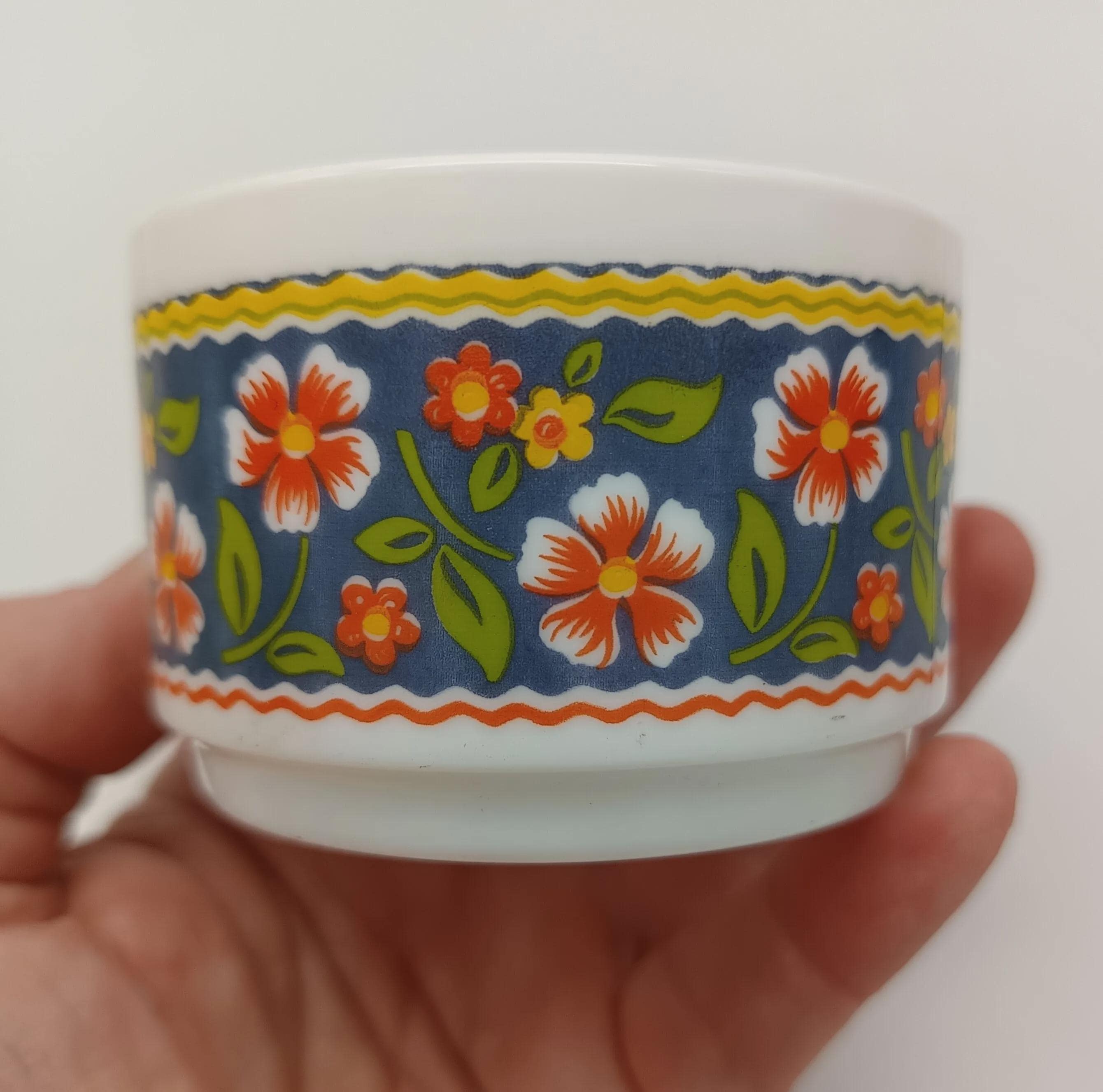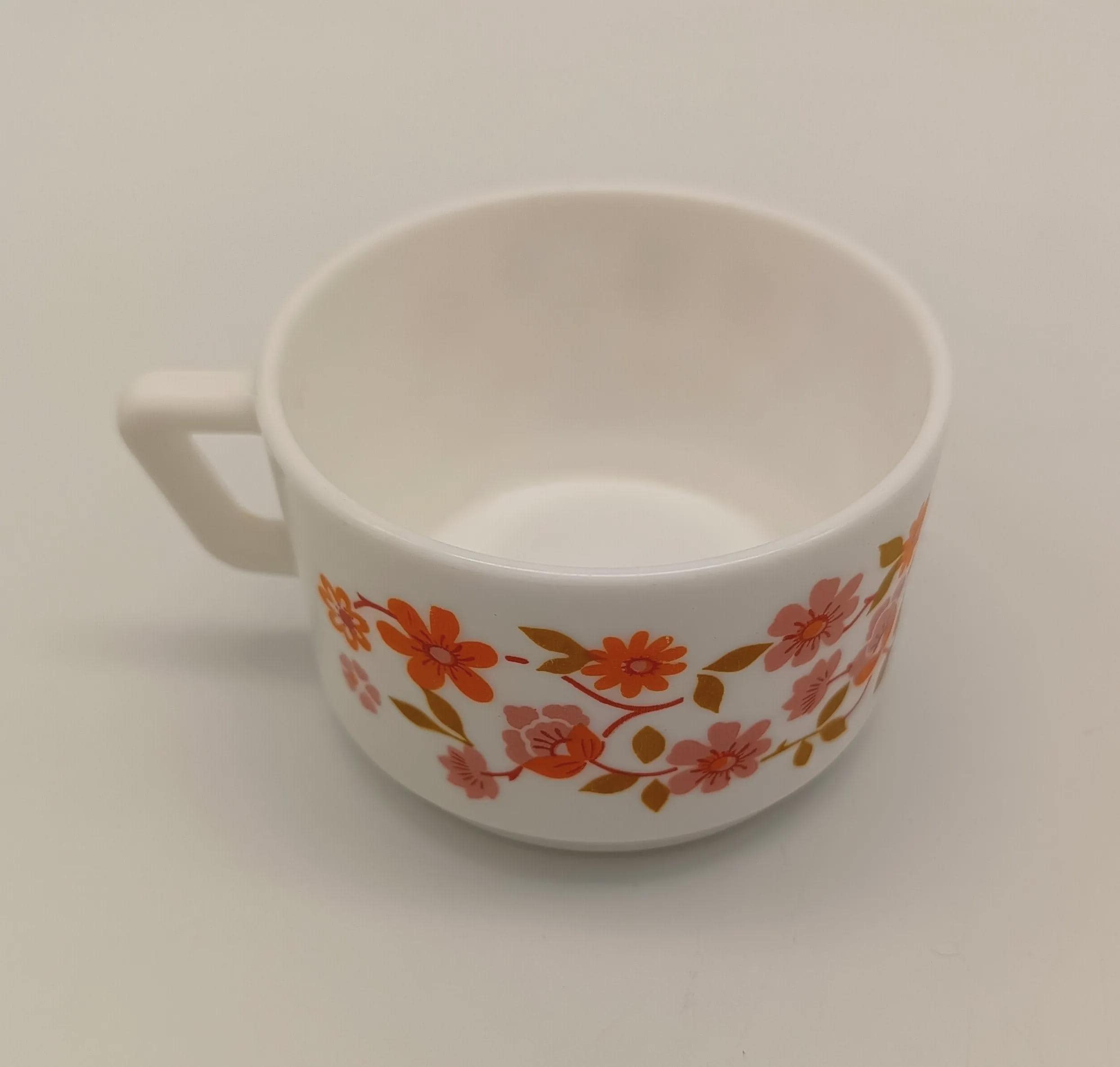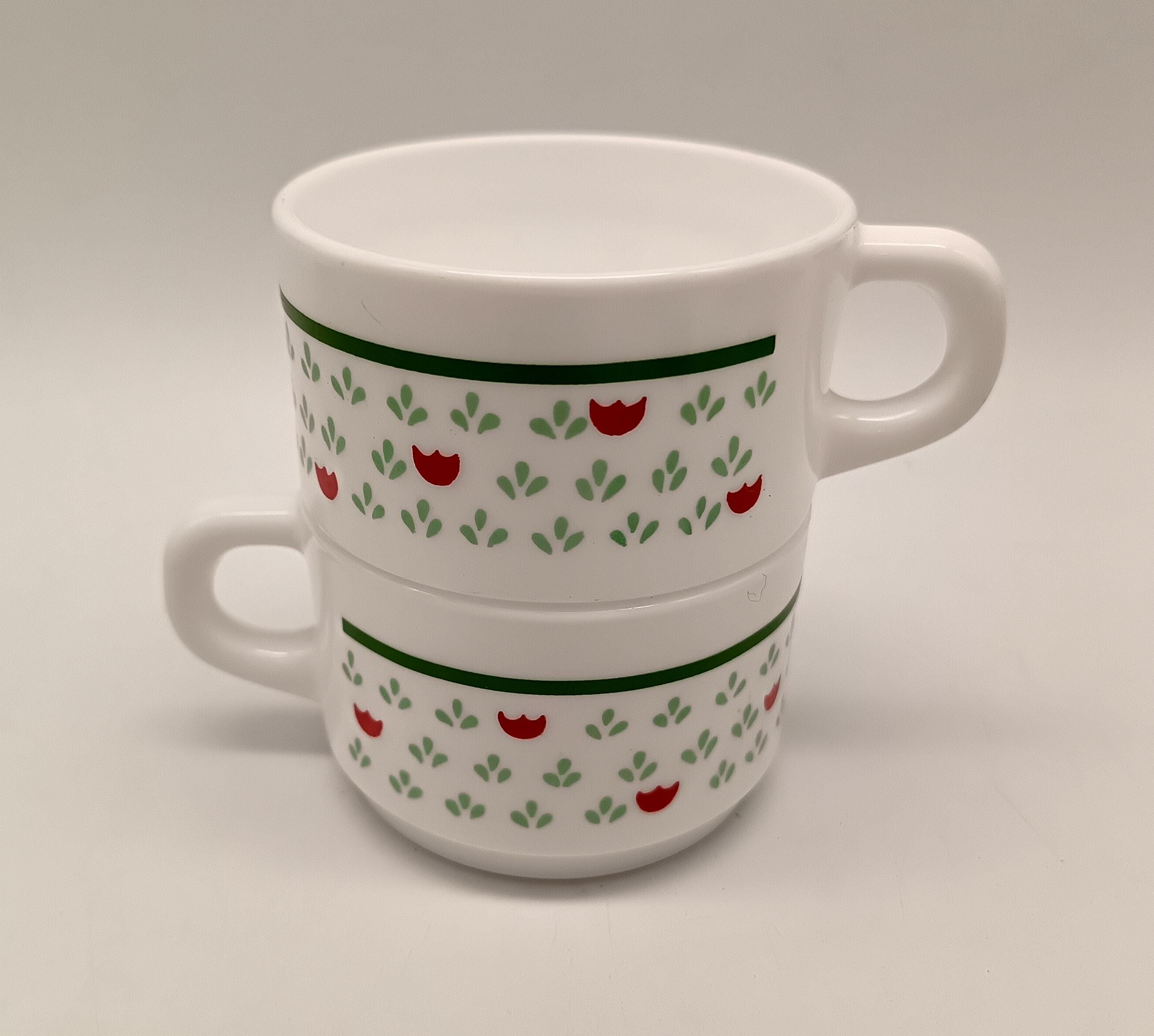 Set of 6 beautiful vintage opaline mugs. The 3 matching designs were made by Luminarc France in the 1970s.