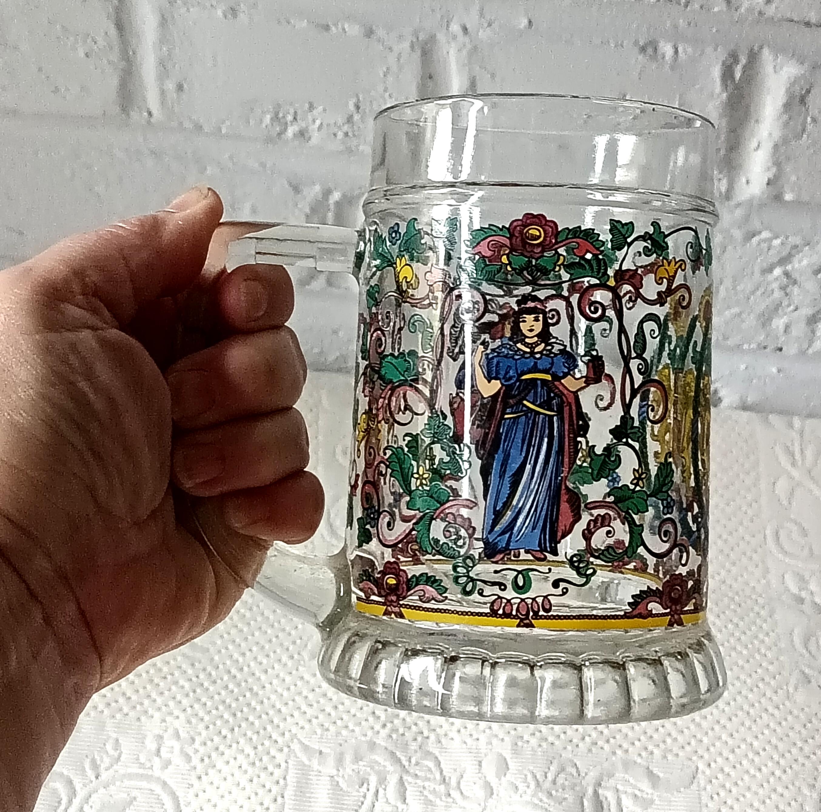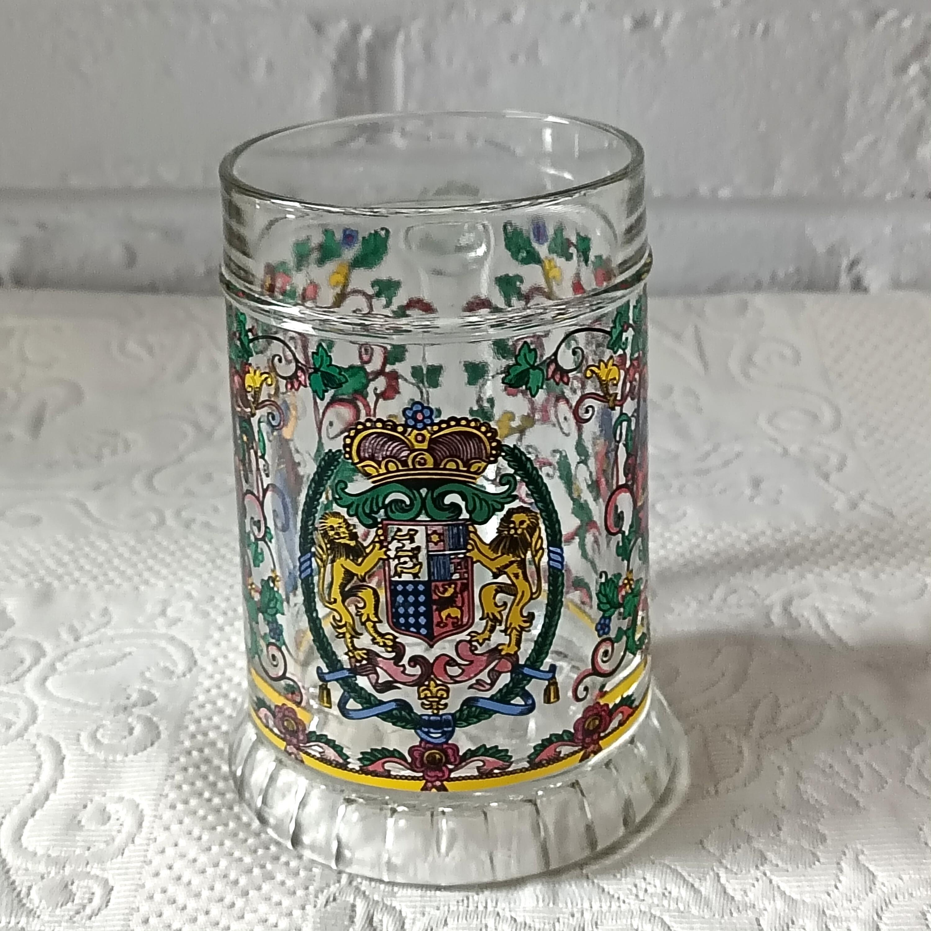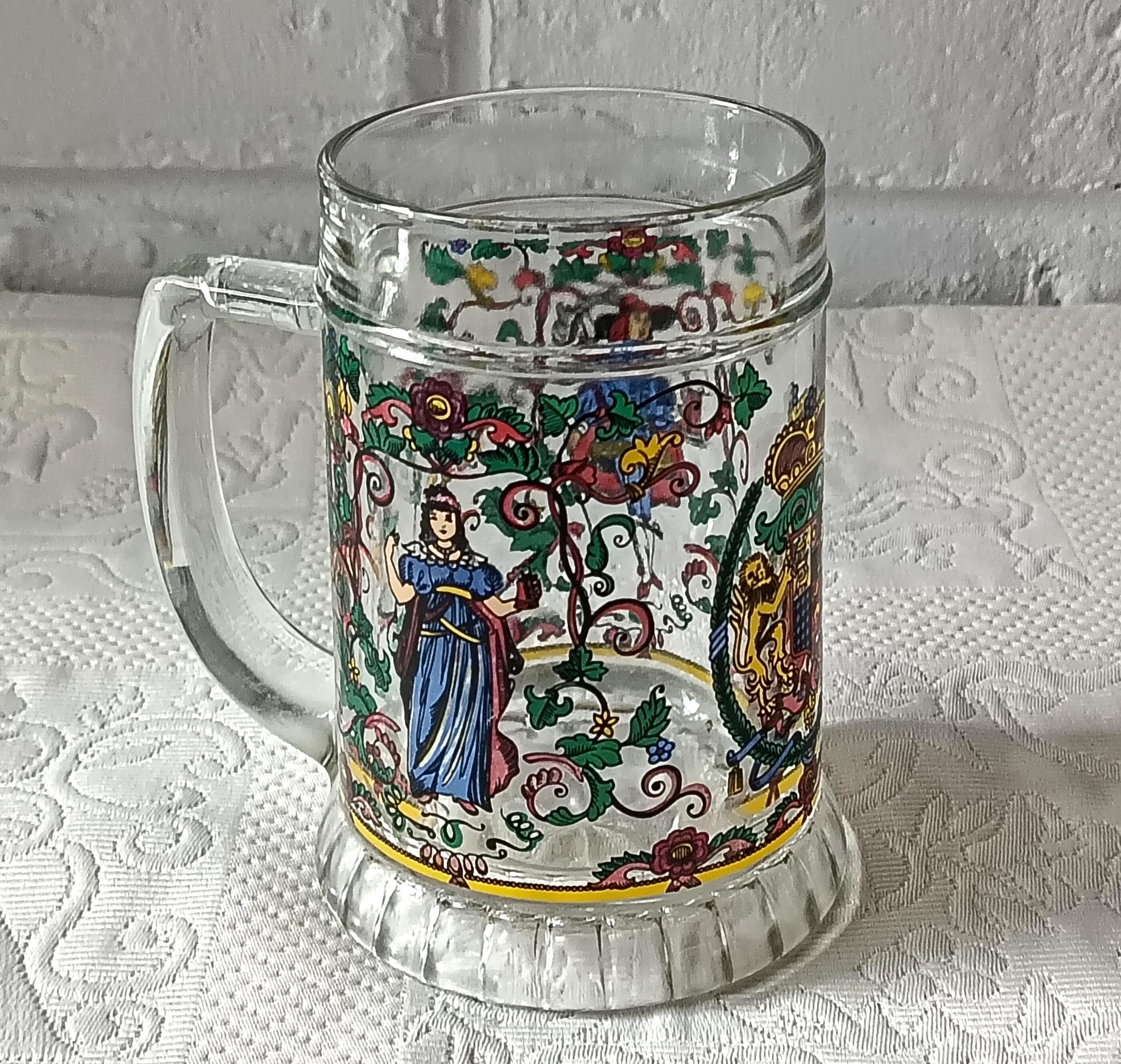 This glass beer mug has a beautiful colorful pattern. On one side, a woman in a blue dress with a mug in her hand, on the other a man in blue clothes and on the front a coat of arms surrounded by lions and topped with a crown.