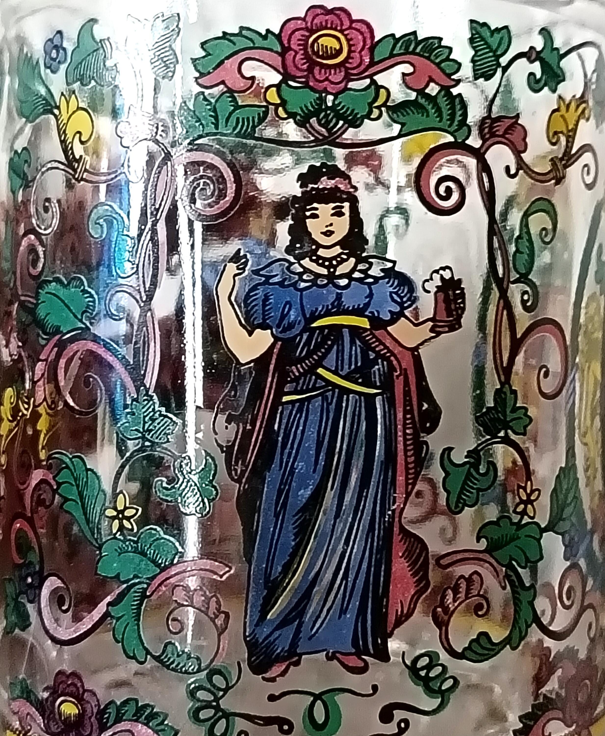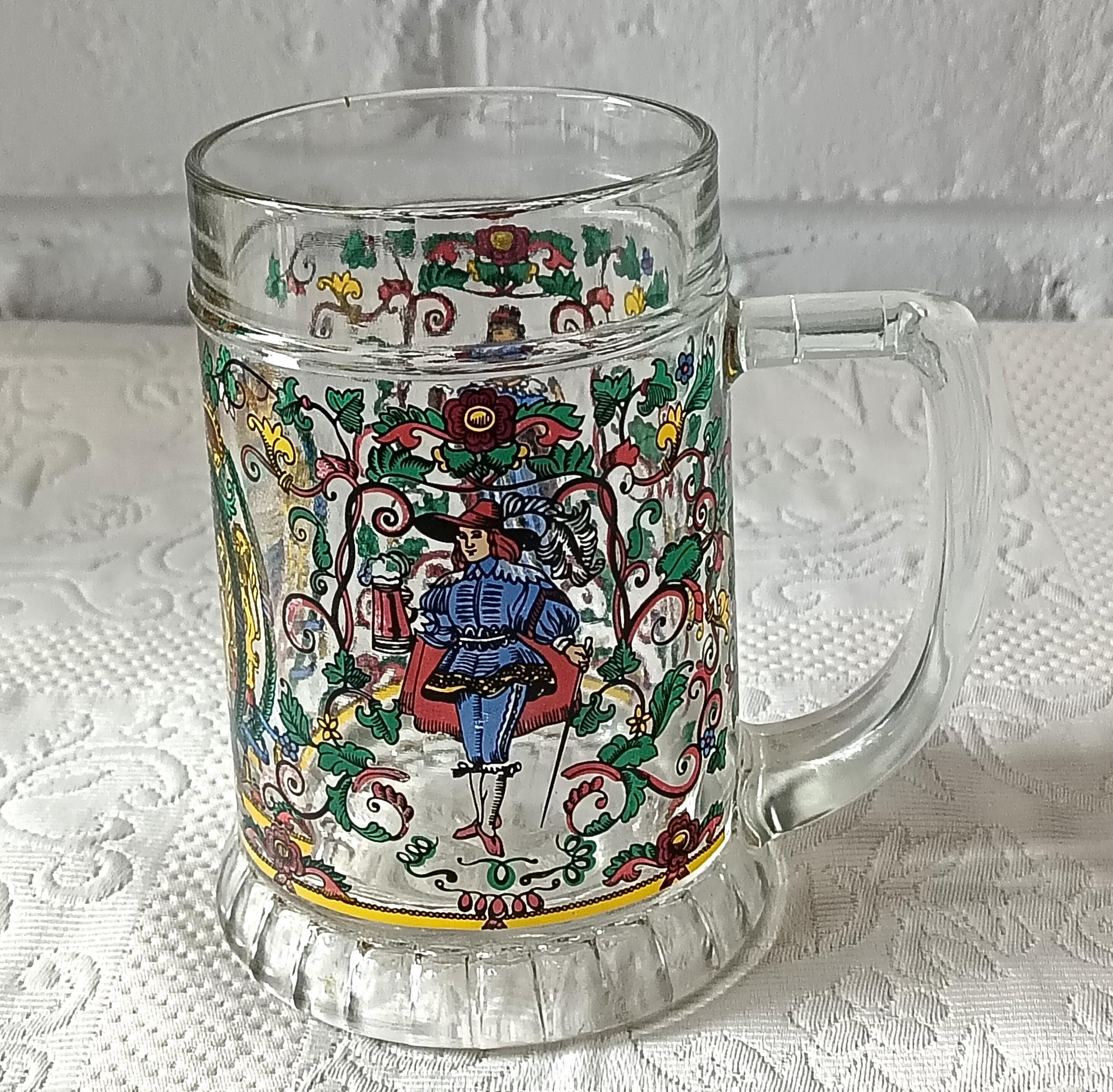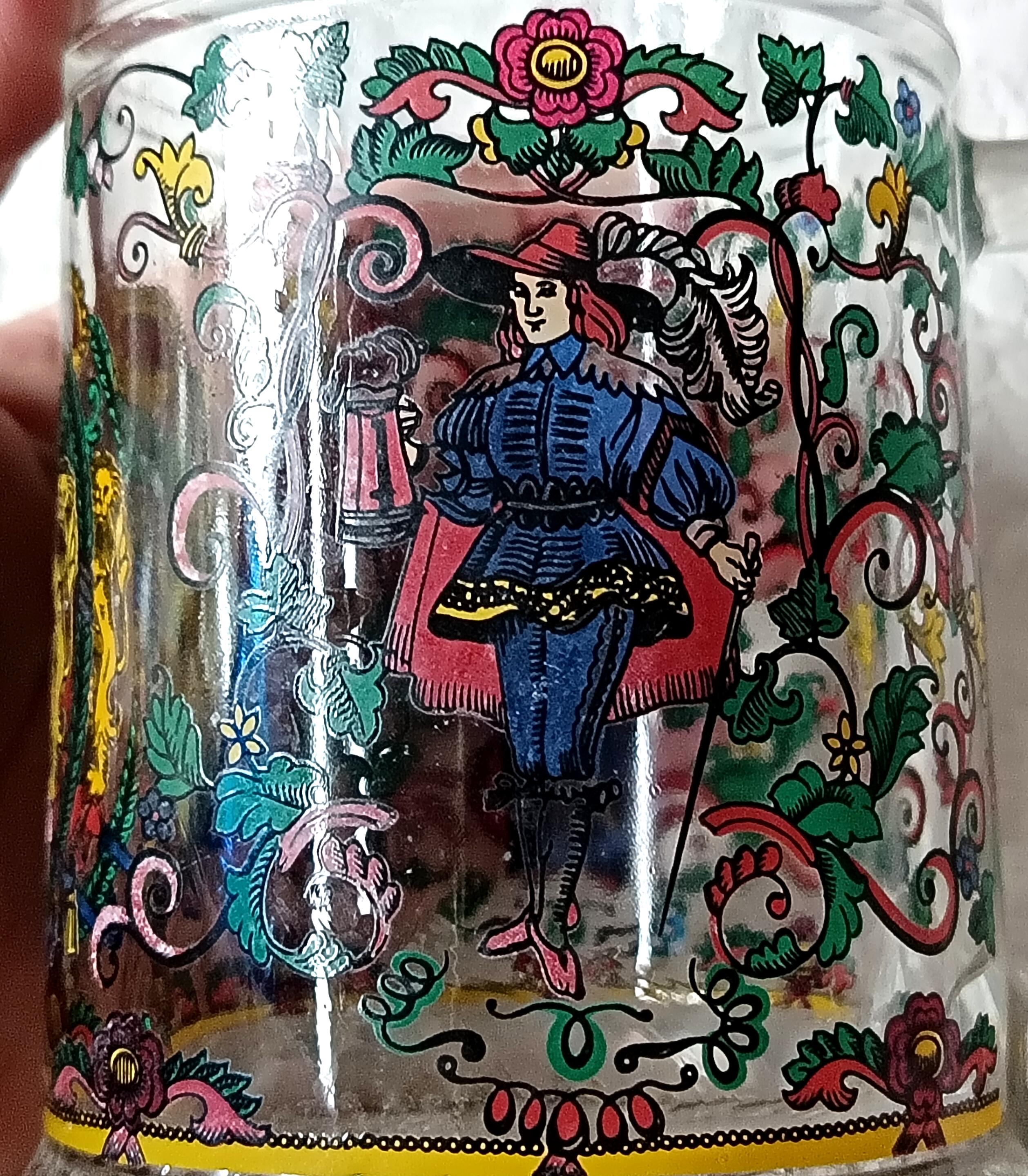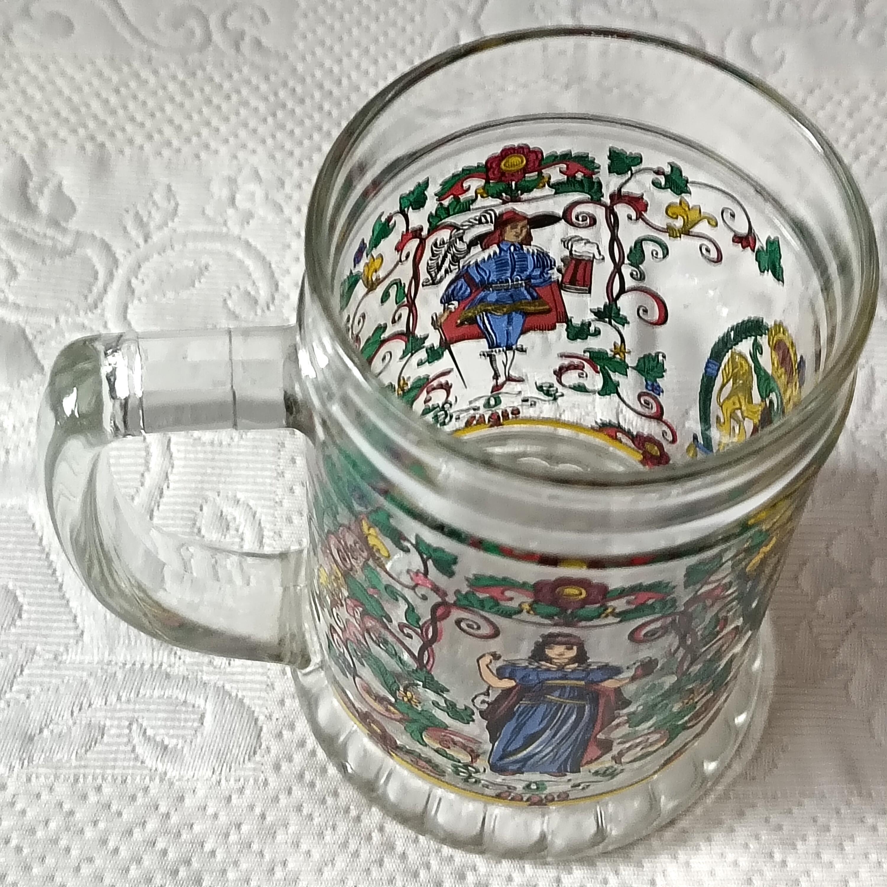 This glass beer mug has a beautiful colorful pattern. On one side, a woman in a blue dress with a mug in her hand, on the other a man in blue clothes and on the front a coat of arms surrounded by lions and topped with a crown.