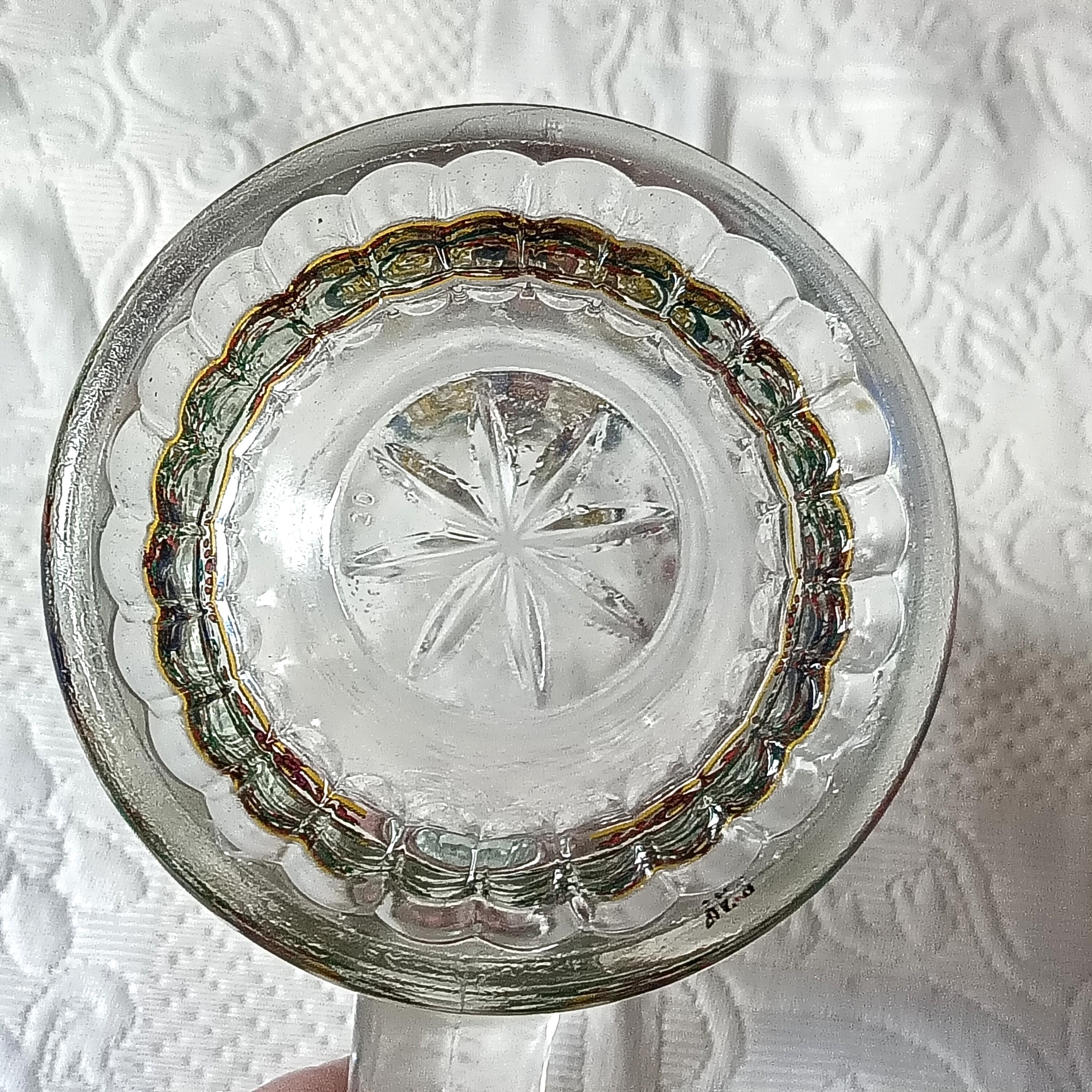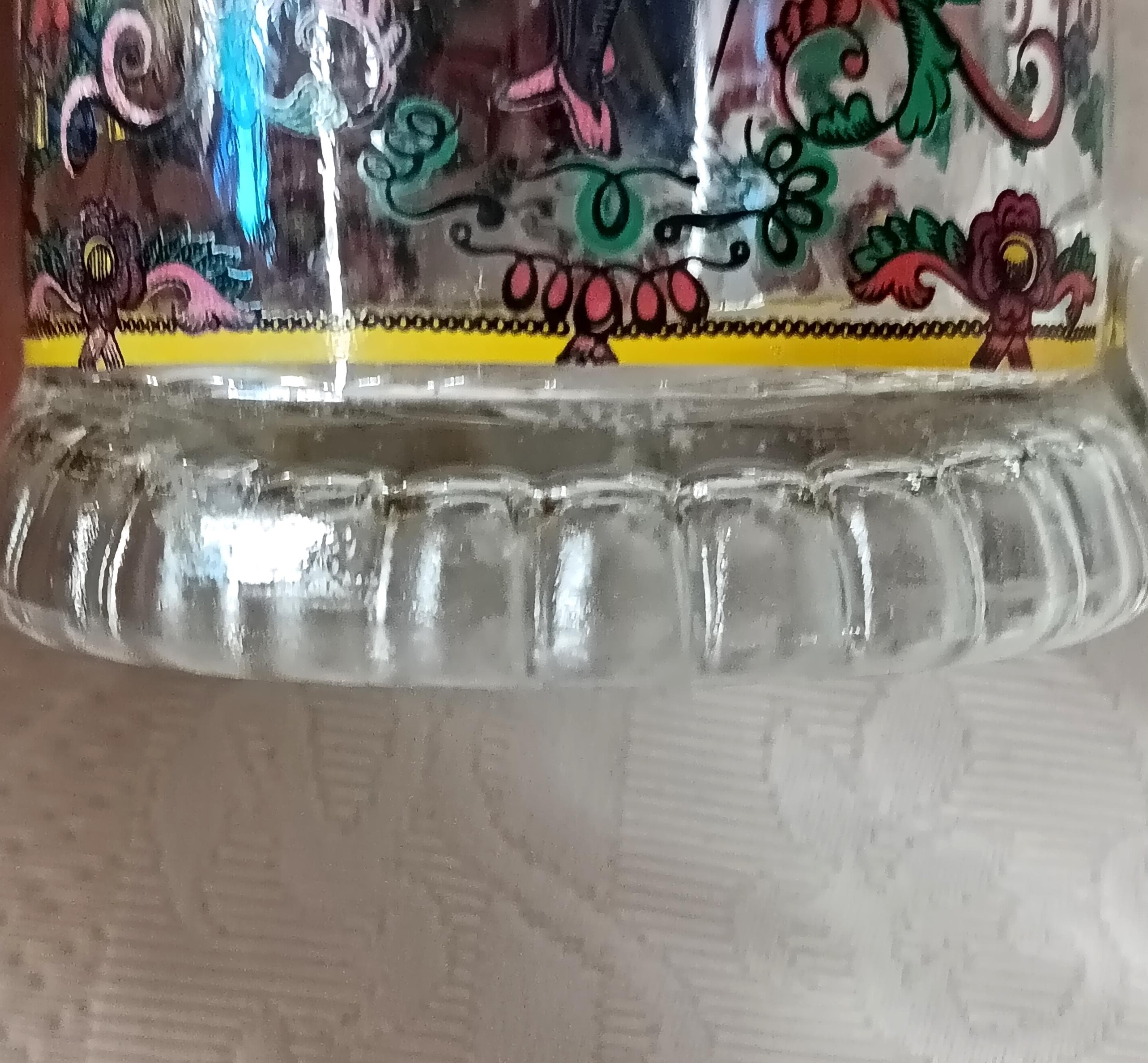 This very attractive vintage German beer mug was made by "BMF", as evidenced by the triangular logo molded into the bottom. It is heavy, made of clear glass covered with colorful decorations.