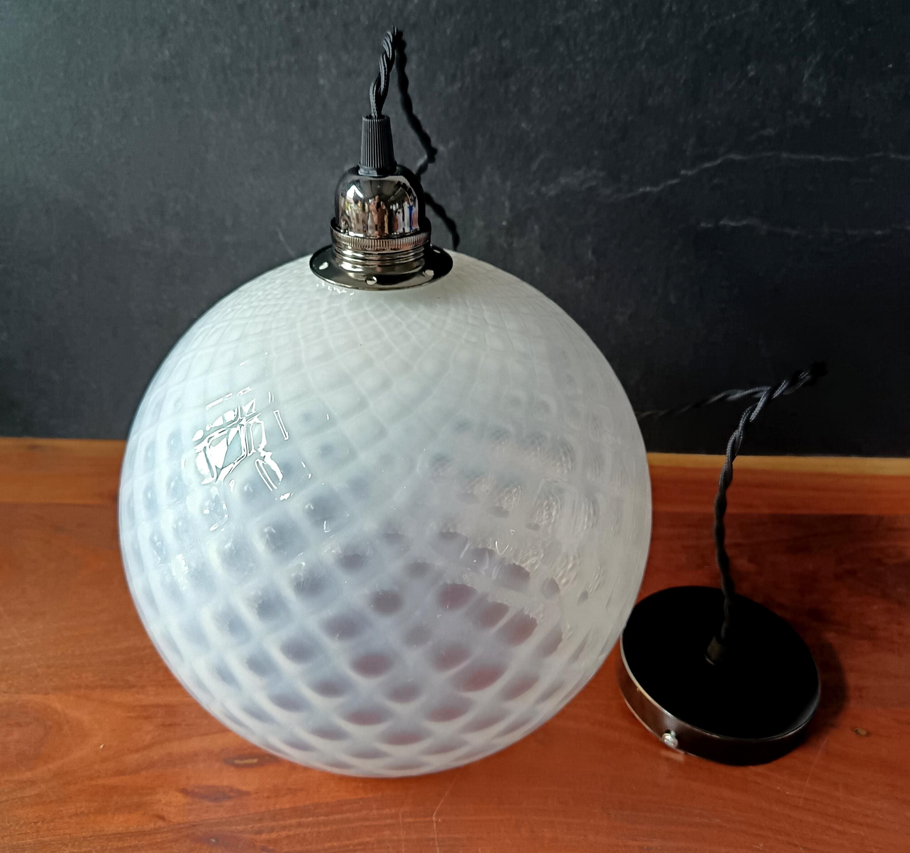 Beautiful white opaline pendant light with a lovely ball-shaped design and geometric patterns around the edge. The grid makes the glass more or less thick and diffuses the light very beautifully.