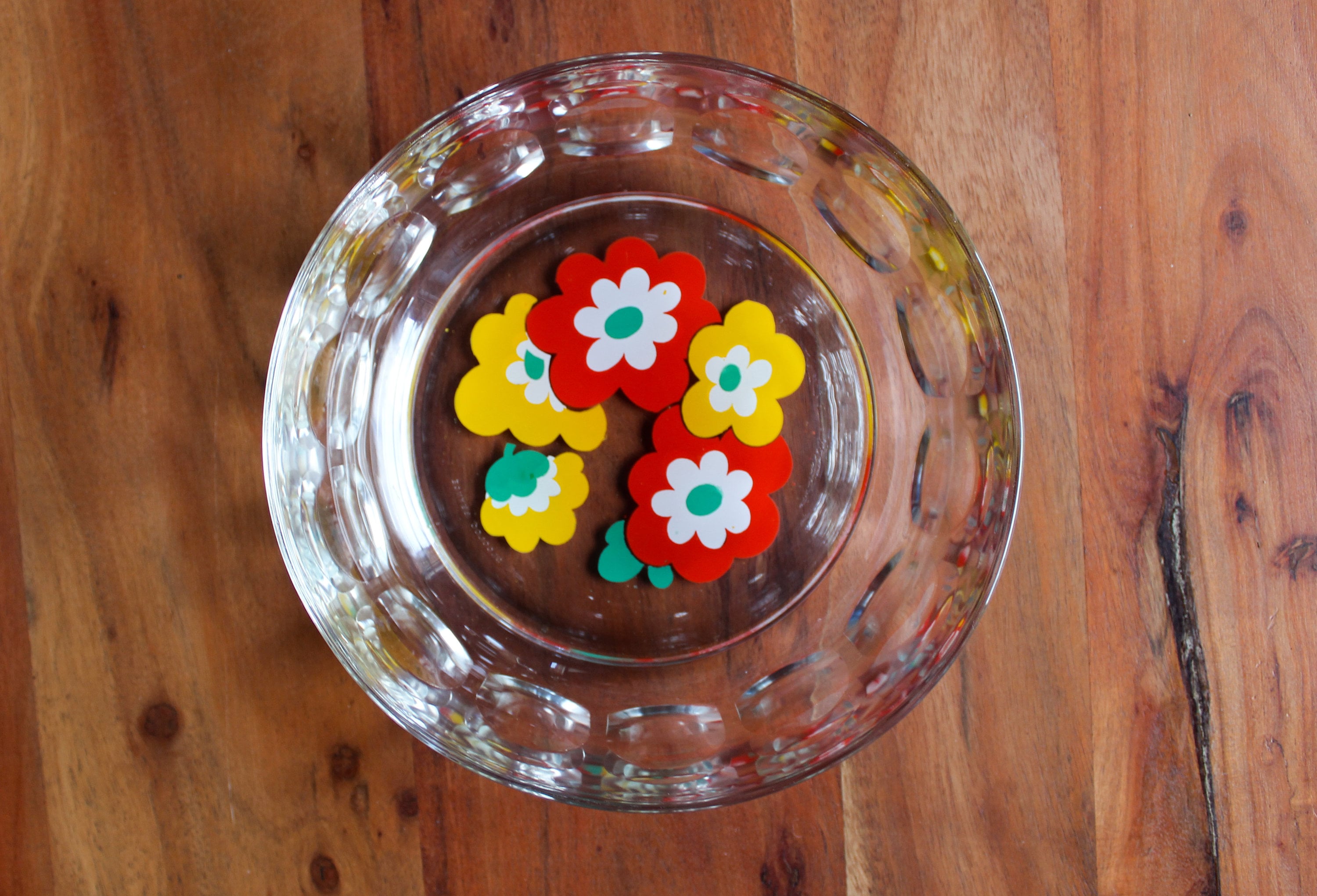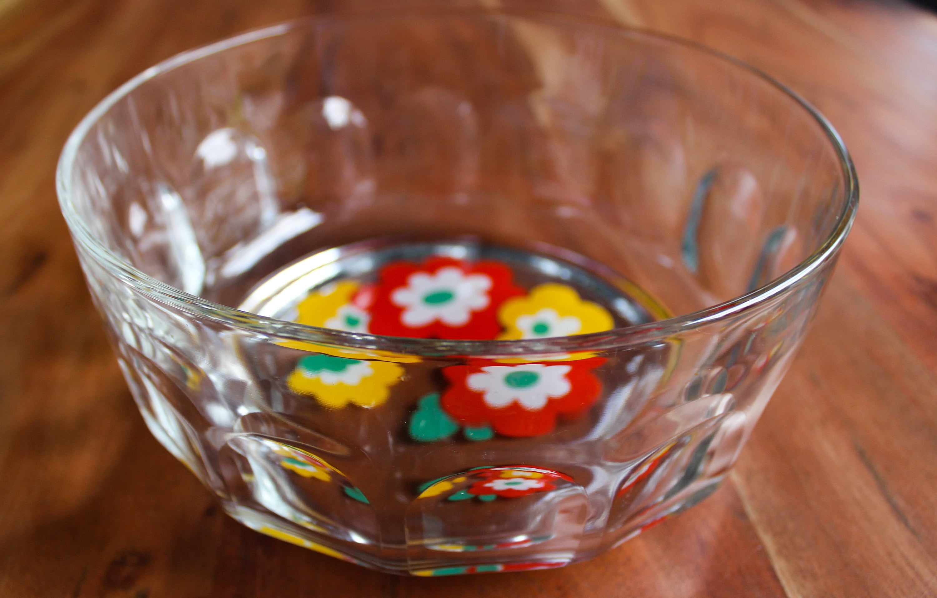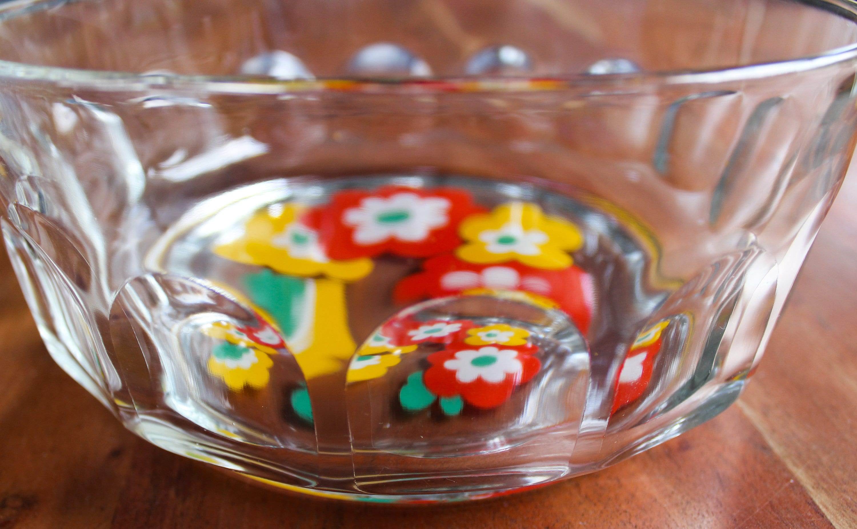 Round glass salad bowl beautifully decorated with a very seventies-style background of large, colorful flowers, Lotus pattern by Arcoroc.