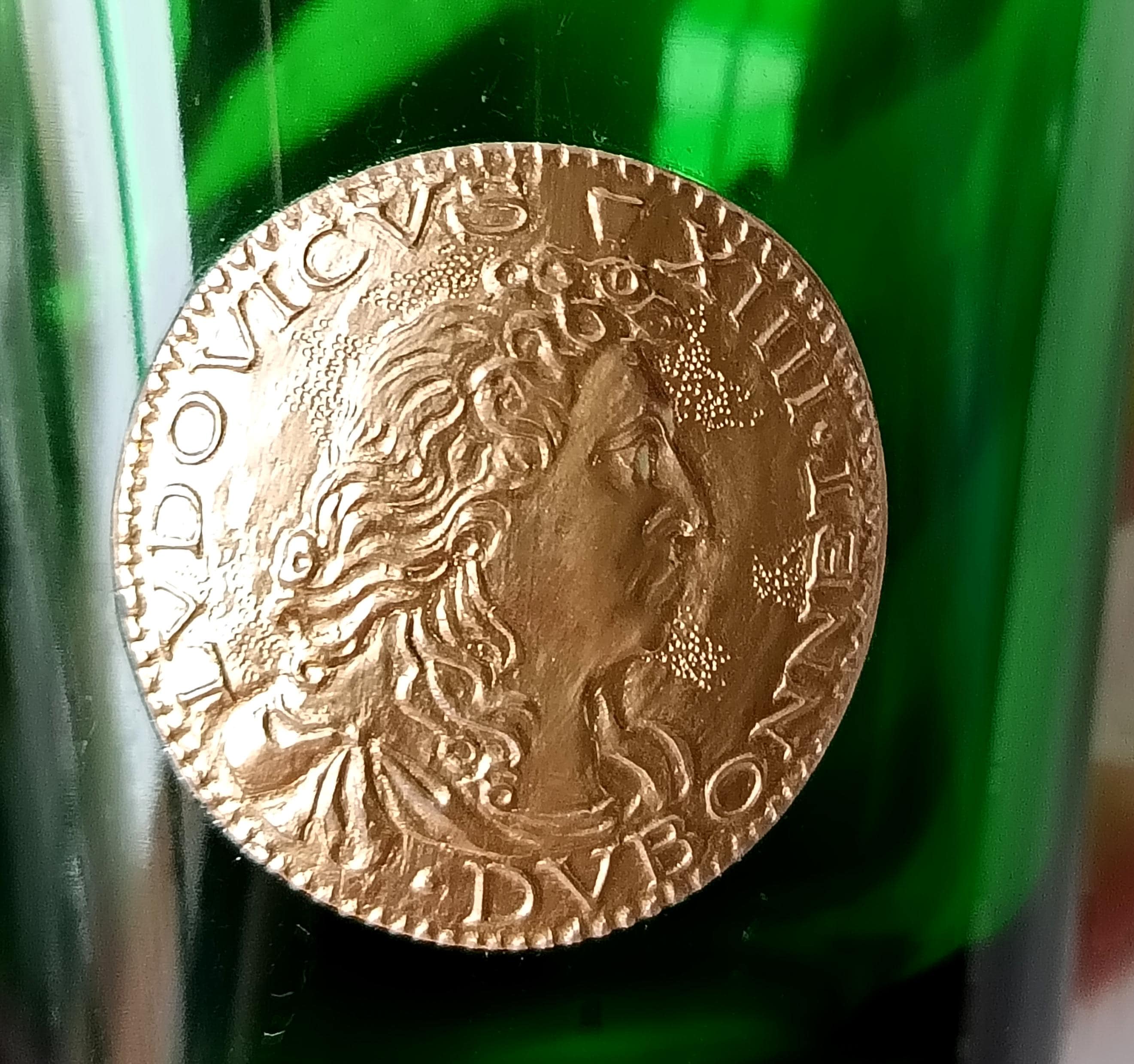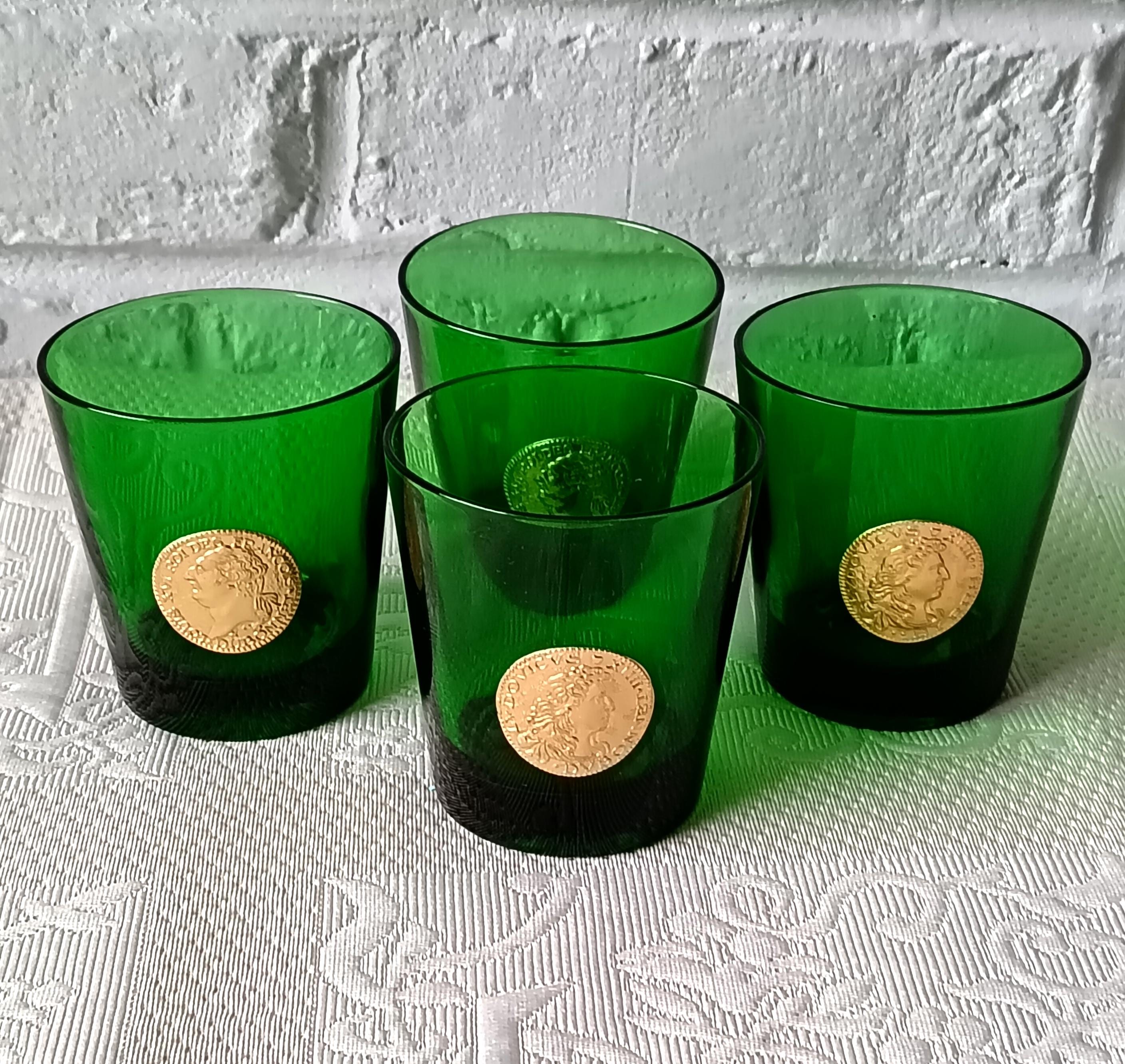 Set of 4 green DUBONNET glasses. Each glass is adorned with a gold medallion depicting the French kings, Louis XVI and Louis XIV. These glasses were designed by DUBONNET, a French aperitif brand, and manufactured for their advertising. Indeed, to boost sales, DUBONNET created promotional items, and these glasses are among them.
