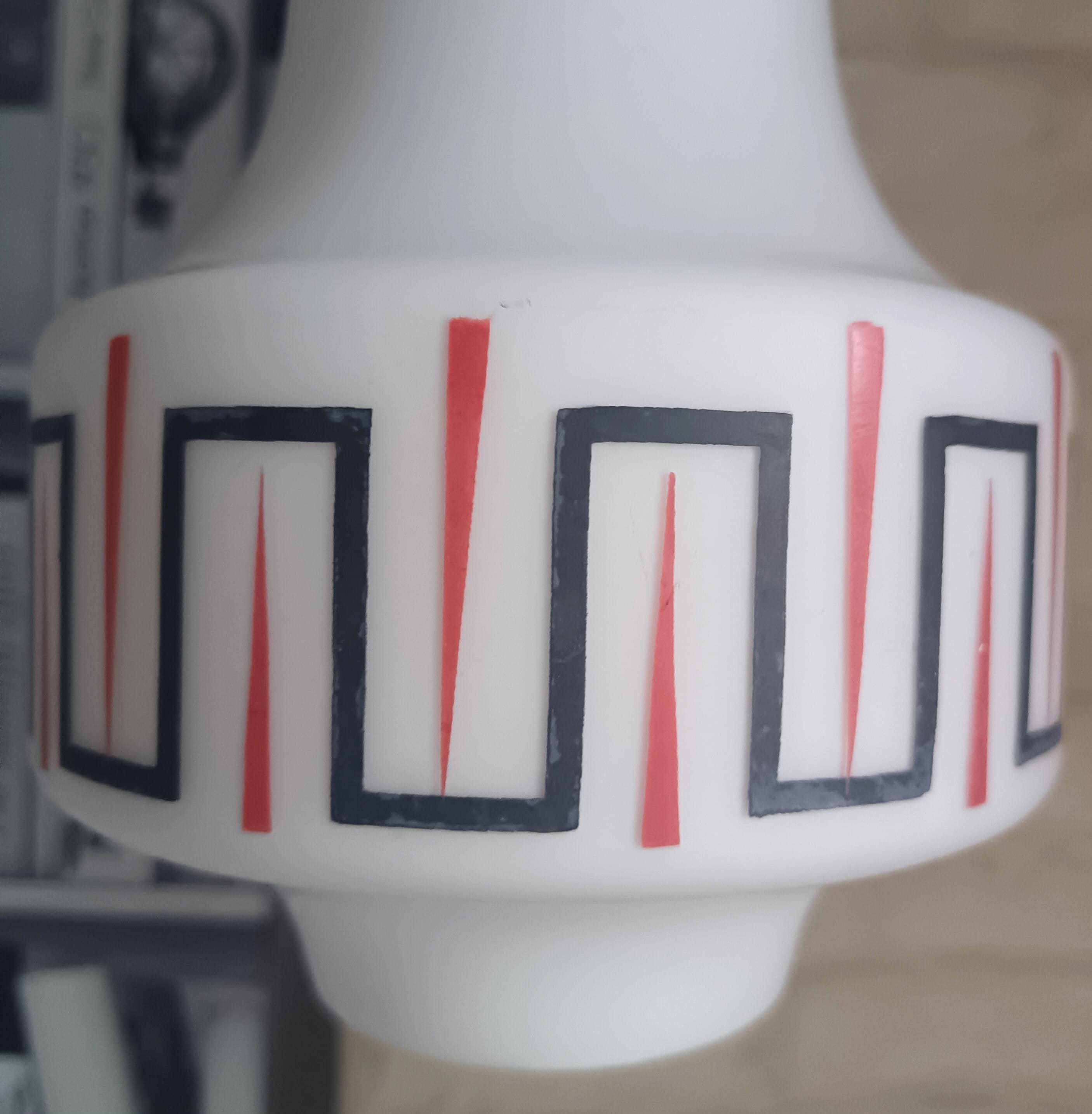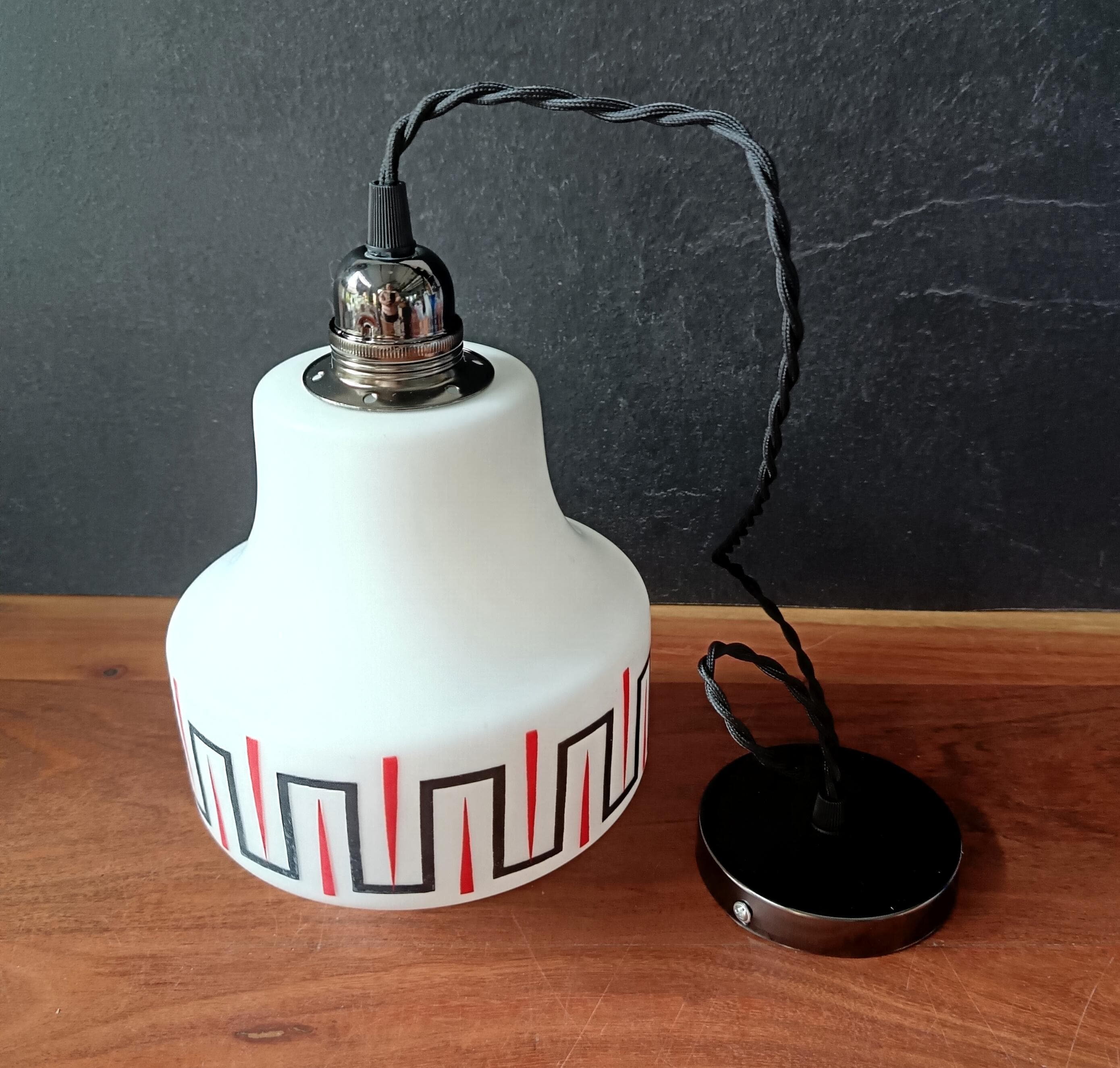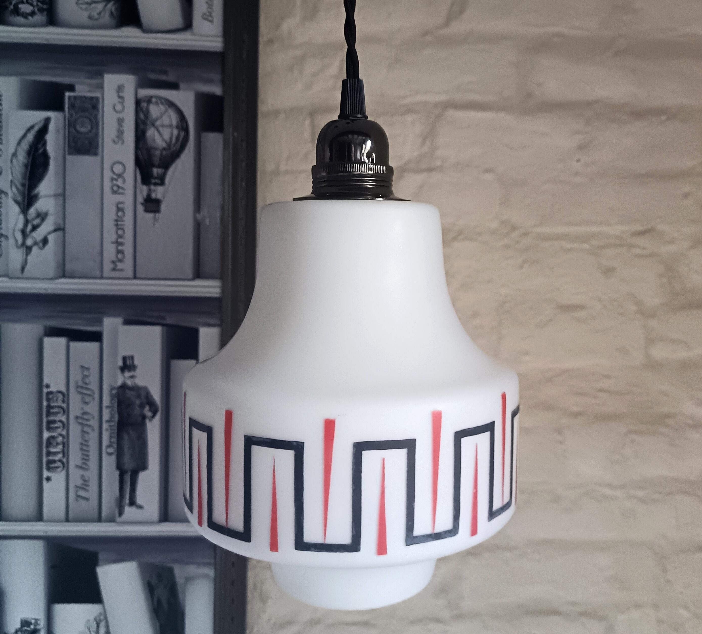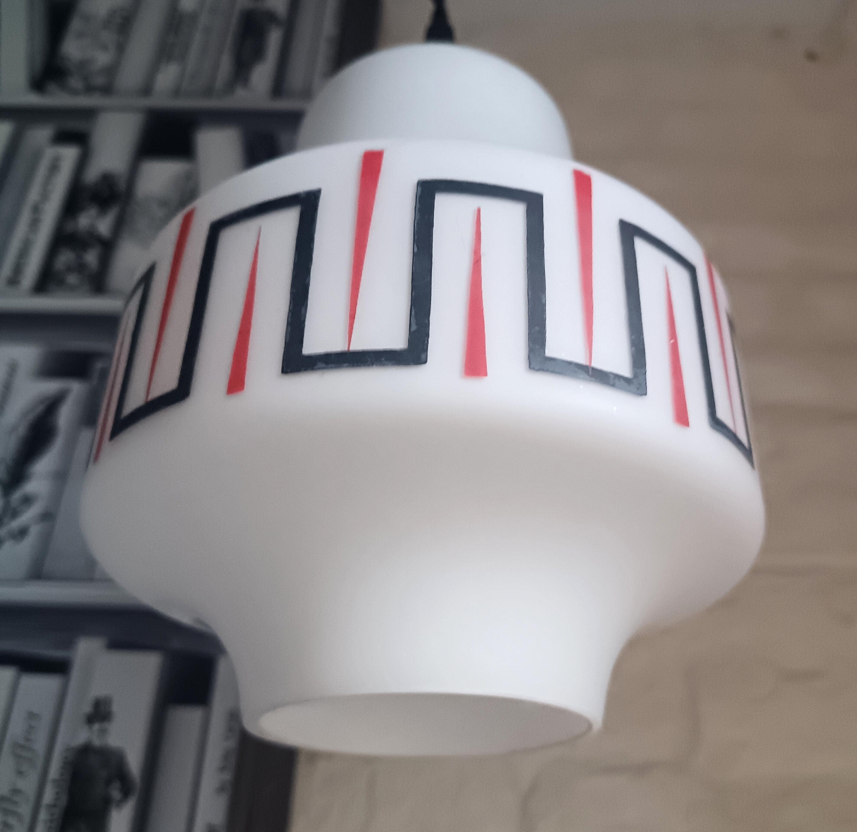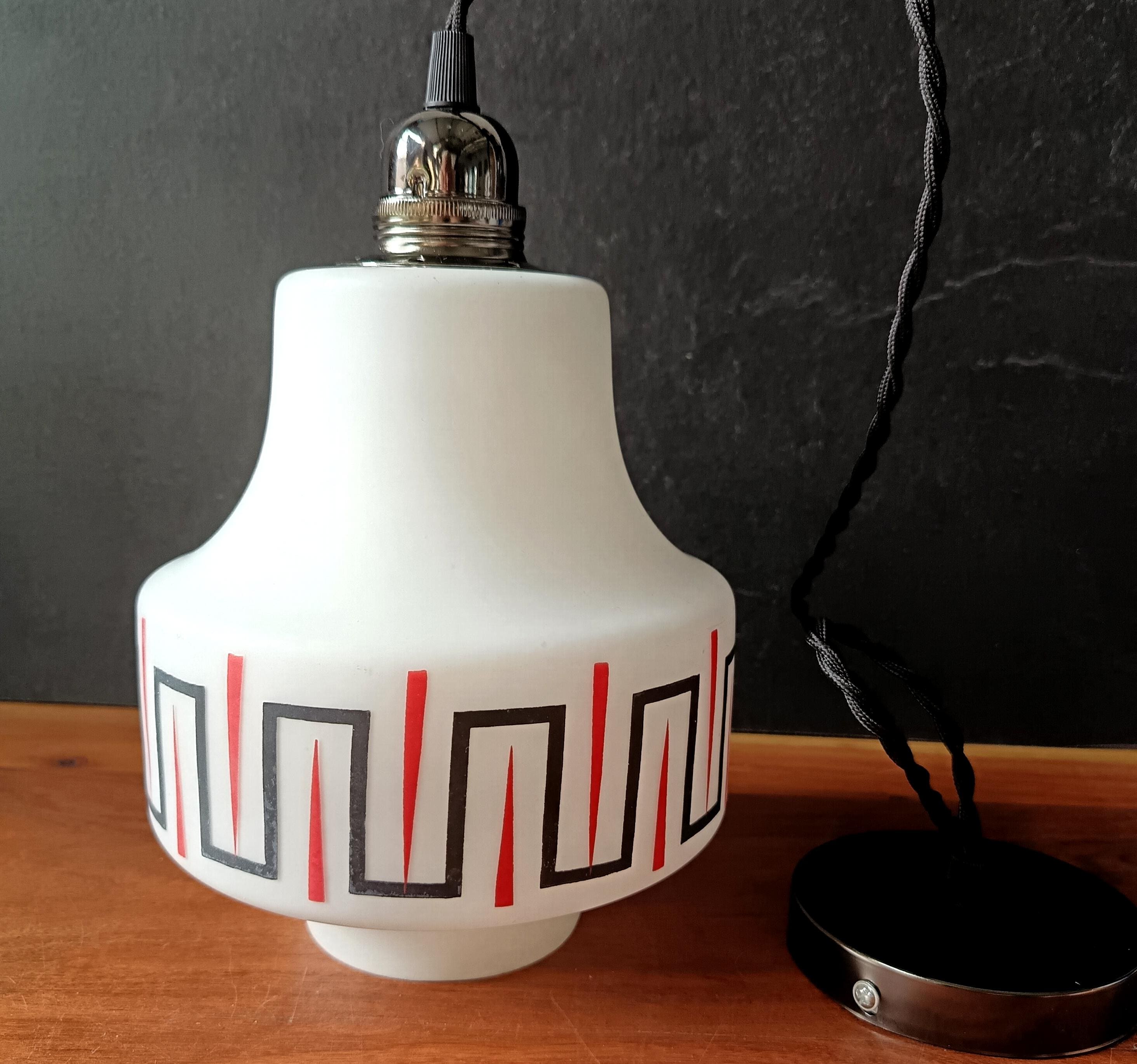 White frosted glass pendant light with a pretty design and red and black geometric patterns around the perimeter.