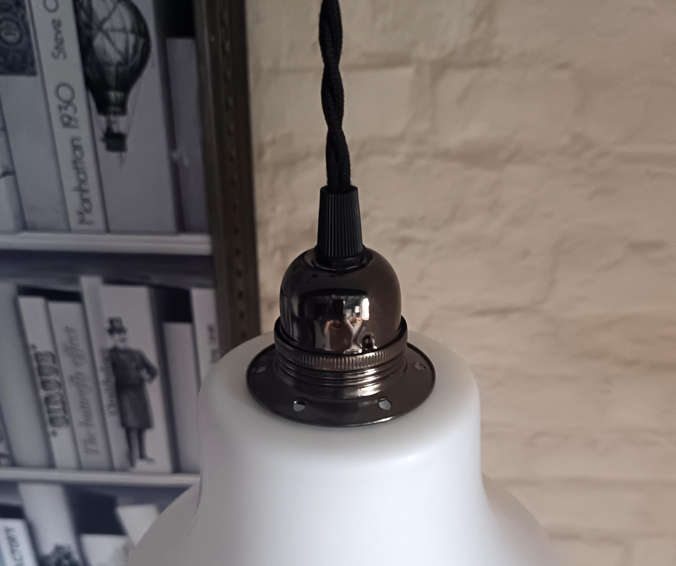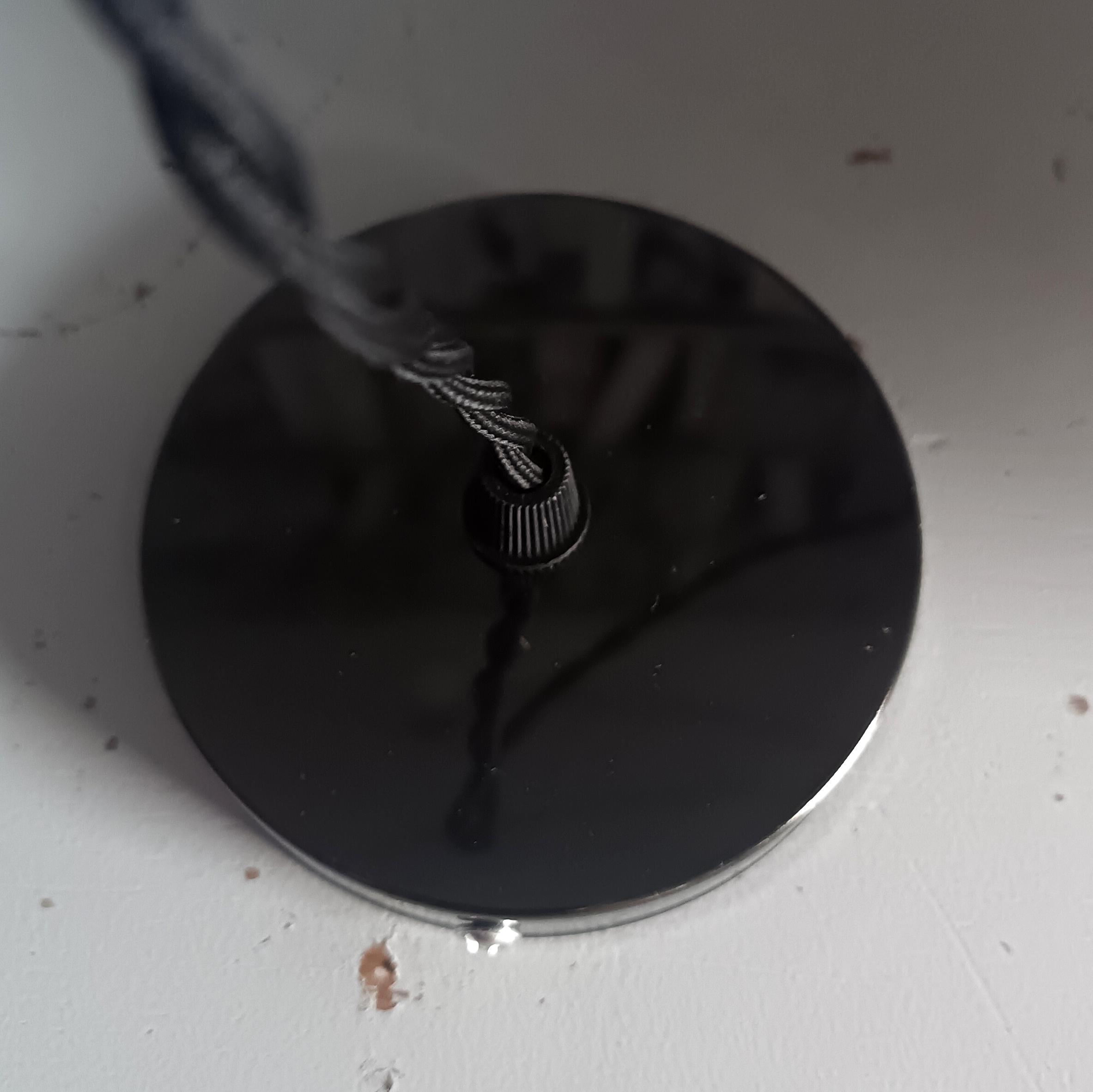 It is newly electrified with a black textile-covered twisted wire. The ceiling rose is made of pearly black metal, as is the socket (requires an e27 screw bulb, not supplied).